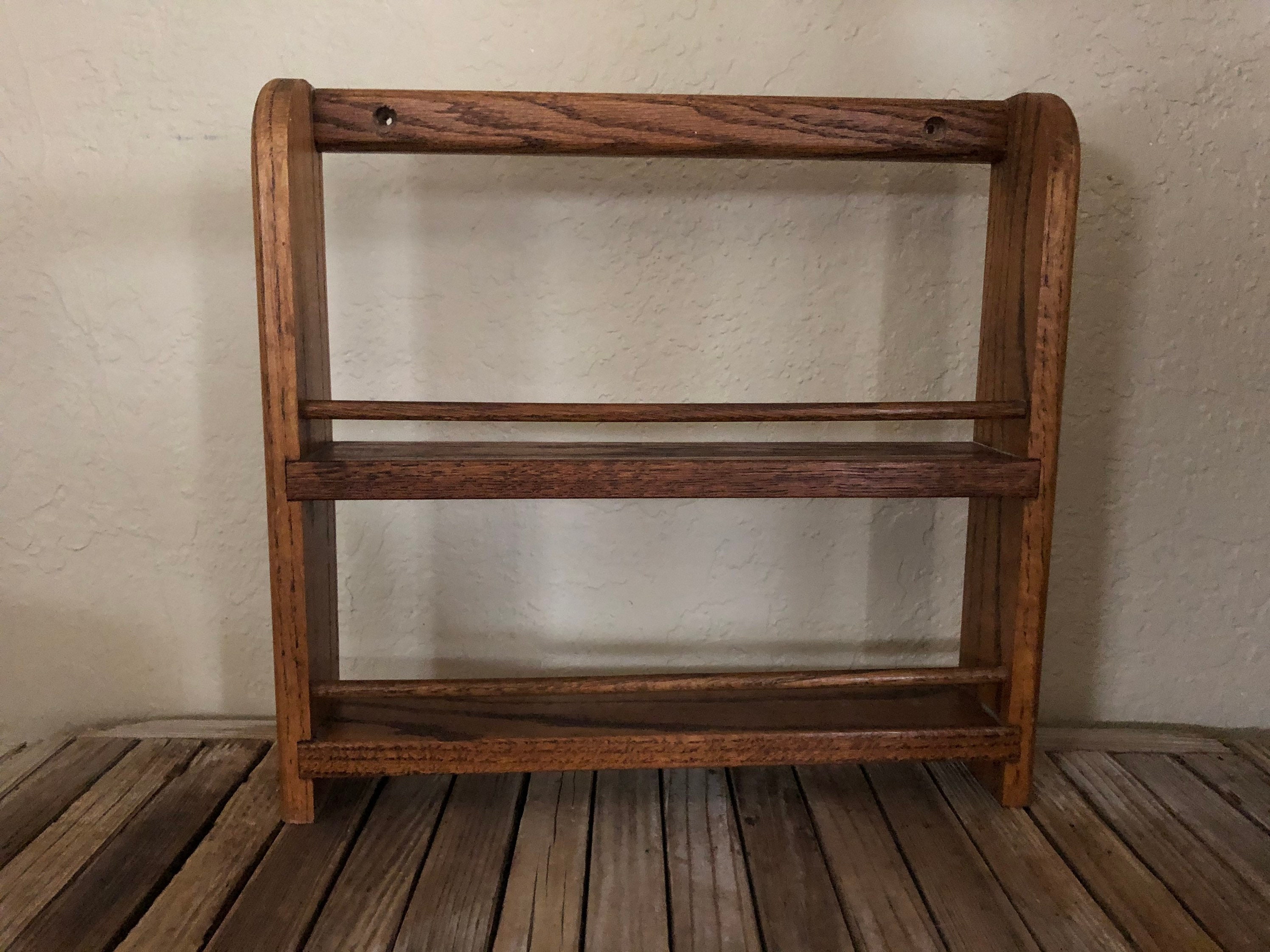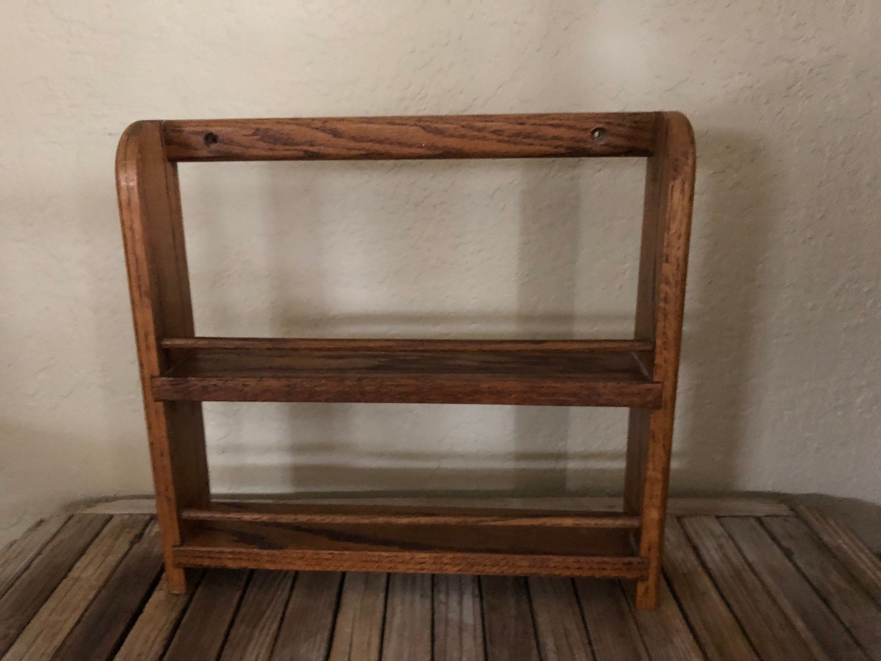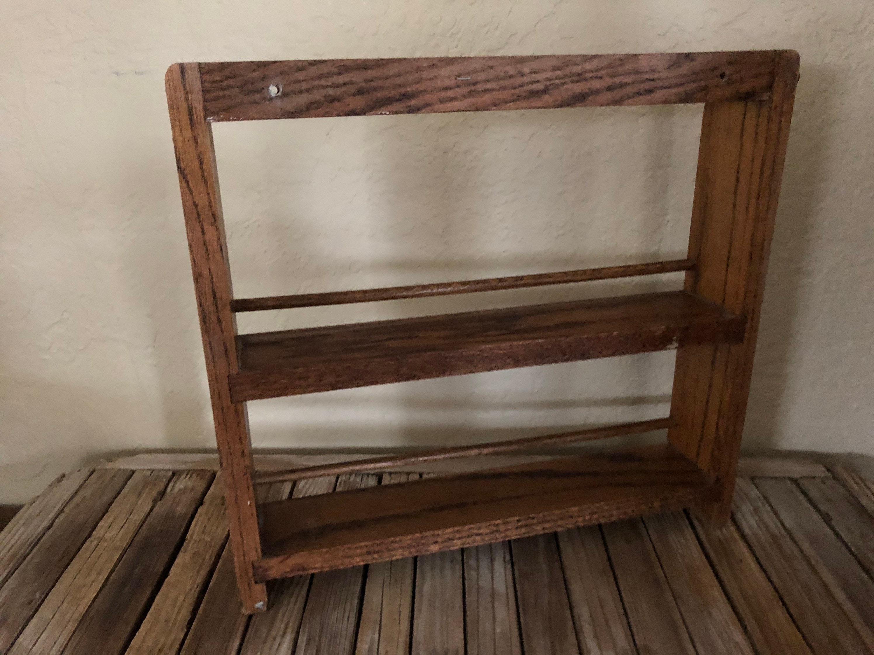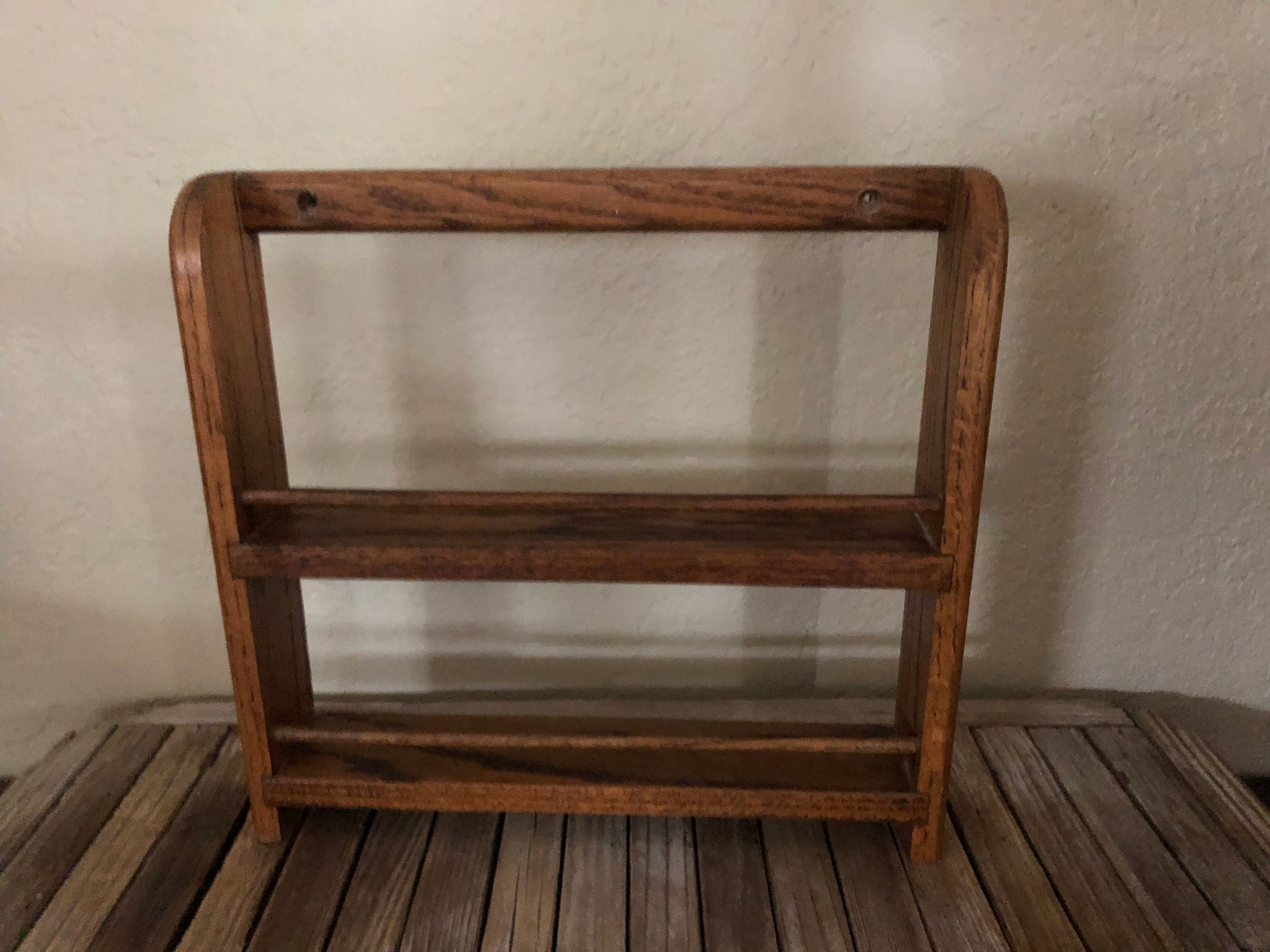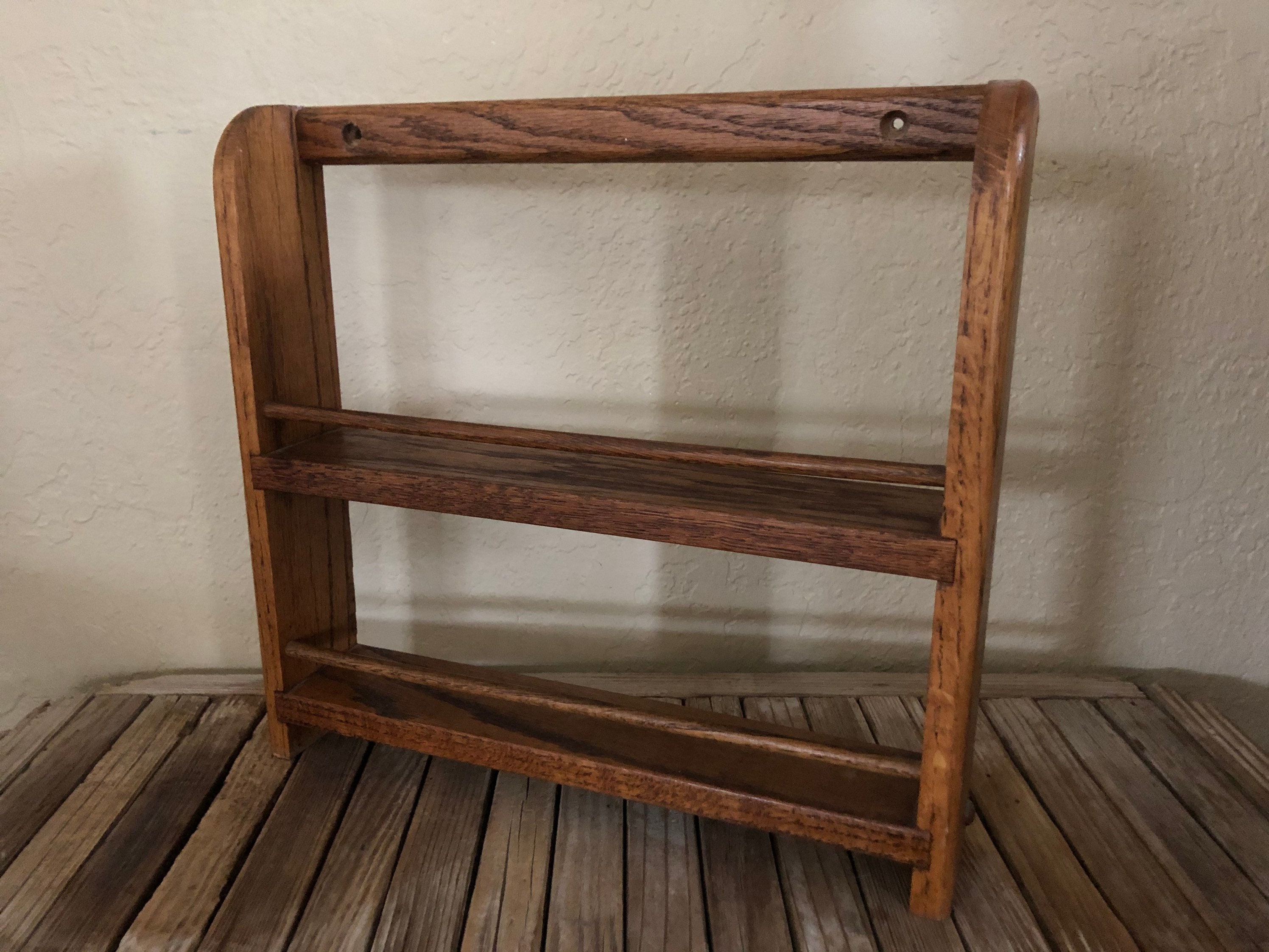 Vintage wood shelf. In good vintage condition, normal wear due to age and use. There are surface dings, scrapes and markings to the finish, please see pictures. A cool, unique shelf to add special items, spices or many other items.