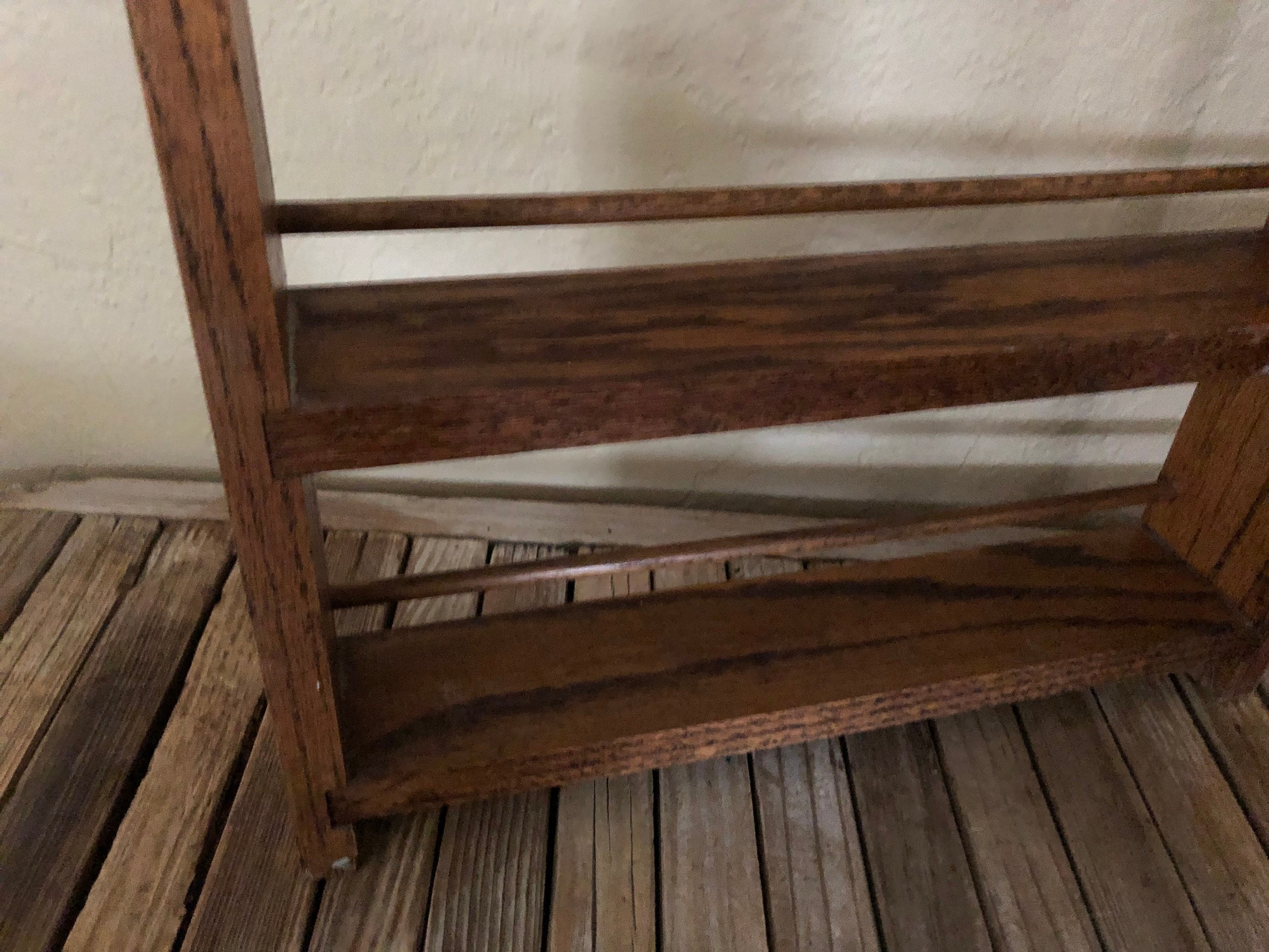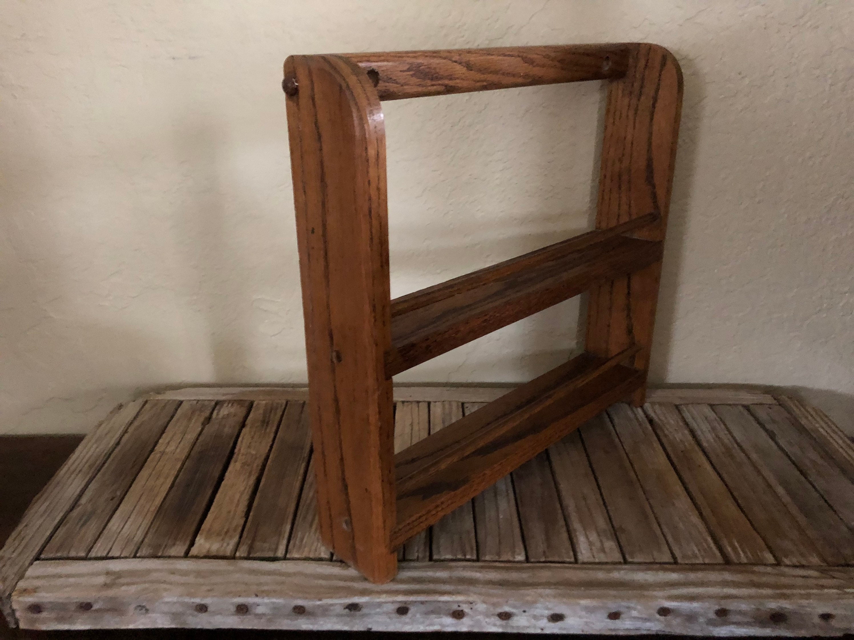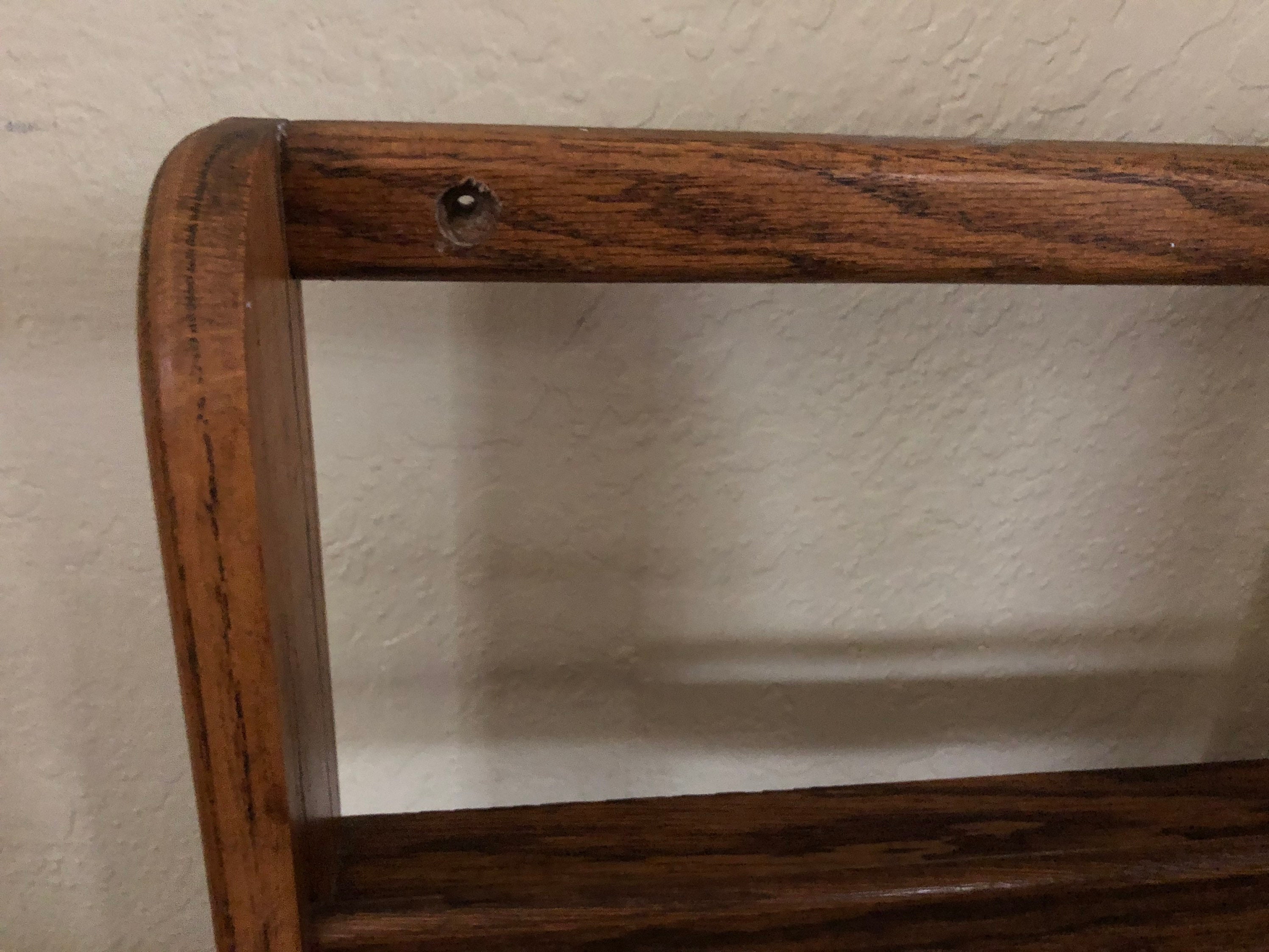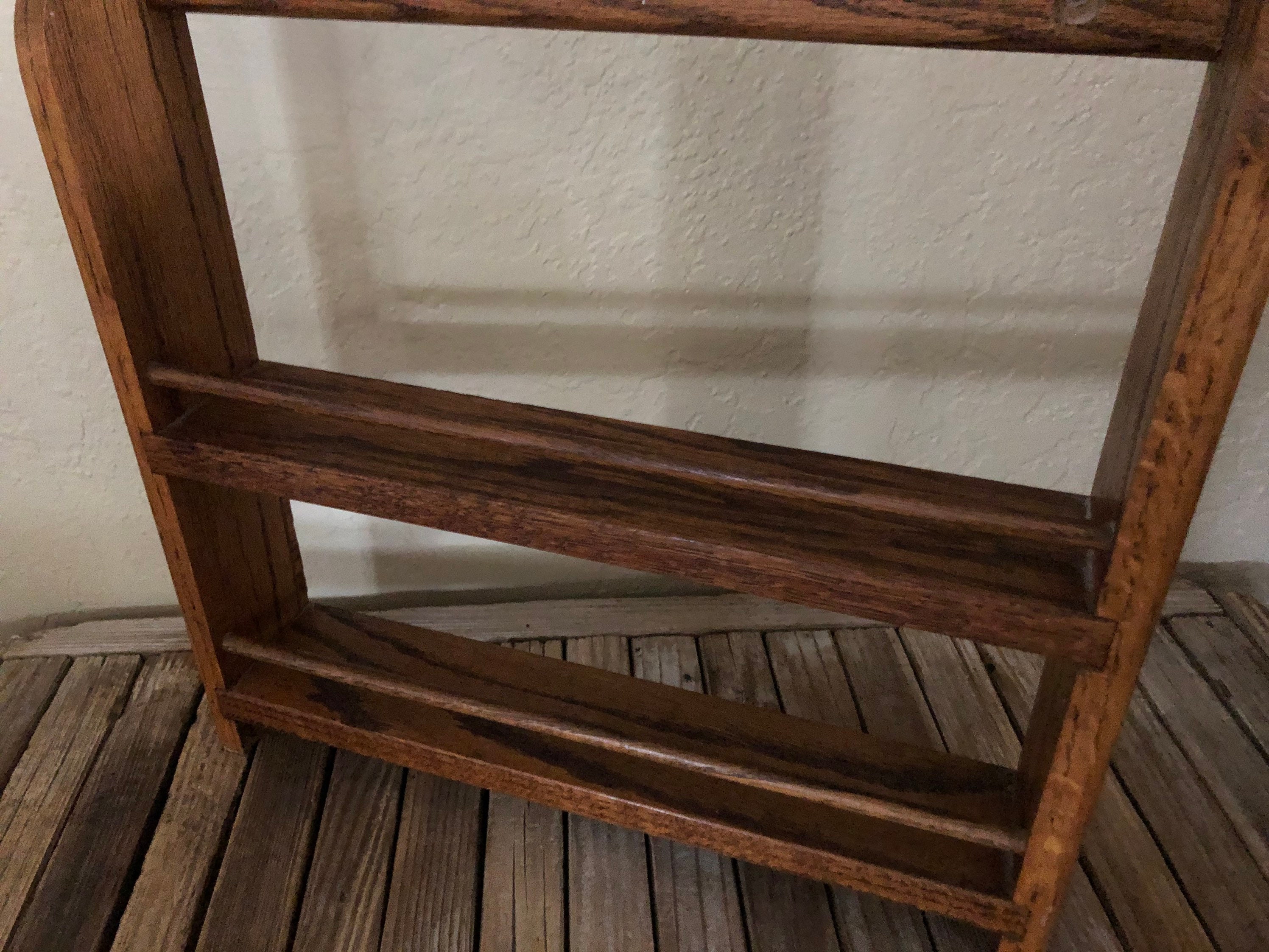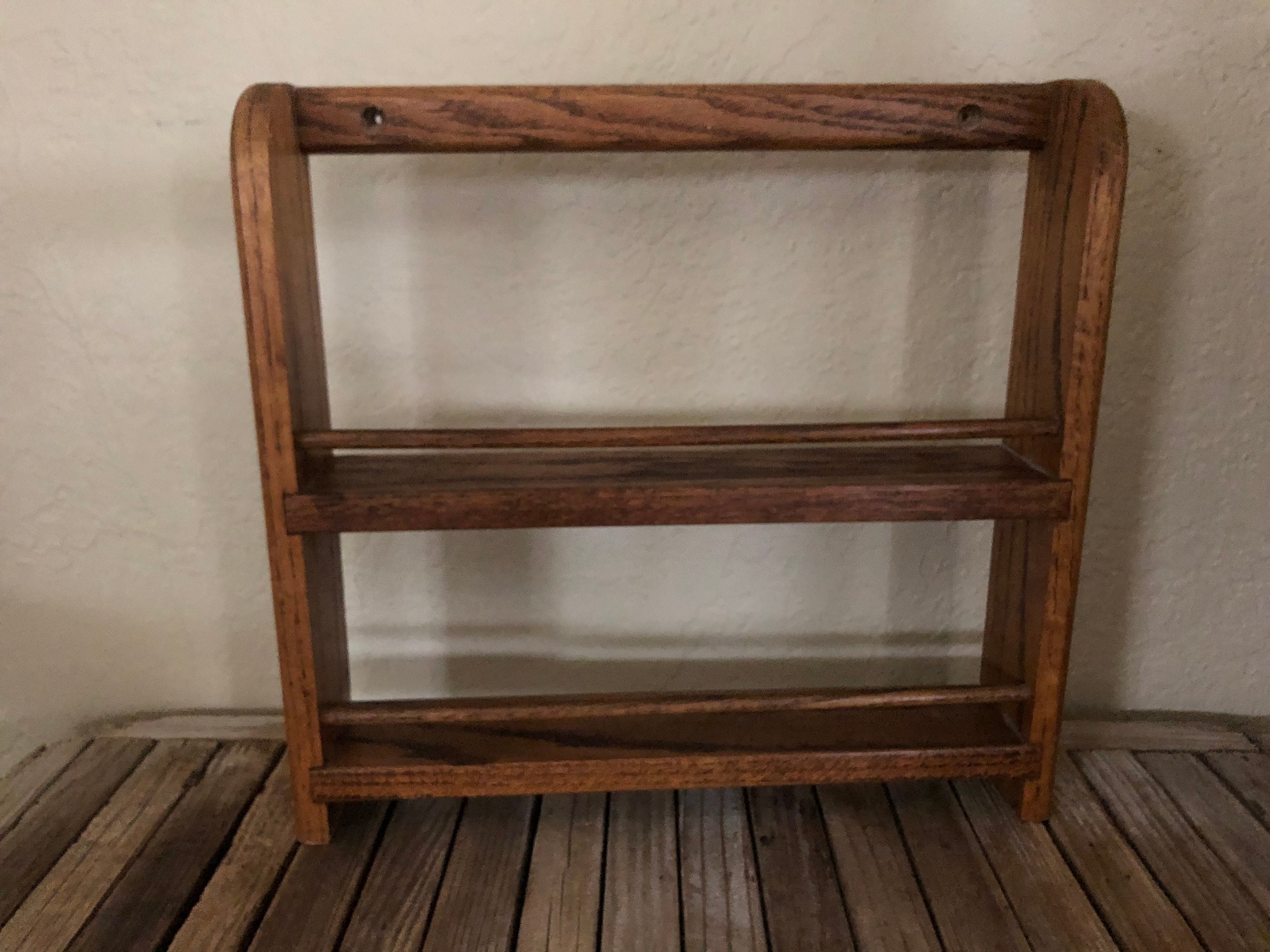 Vintage wood shelf. In good vintage condition, normal wear due to age and use. There are surface dings, scrapes and markings to the finish, please see pictures. A cool, unique shelf to add special items, spices or many other items.