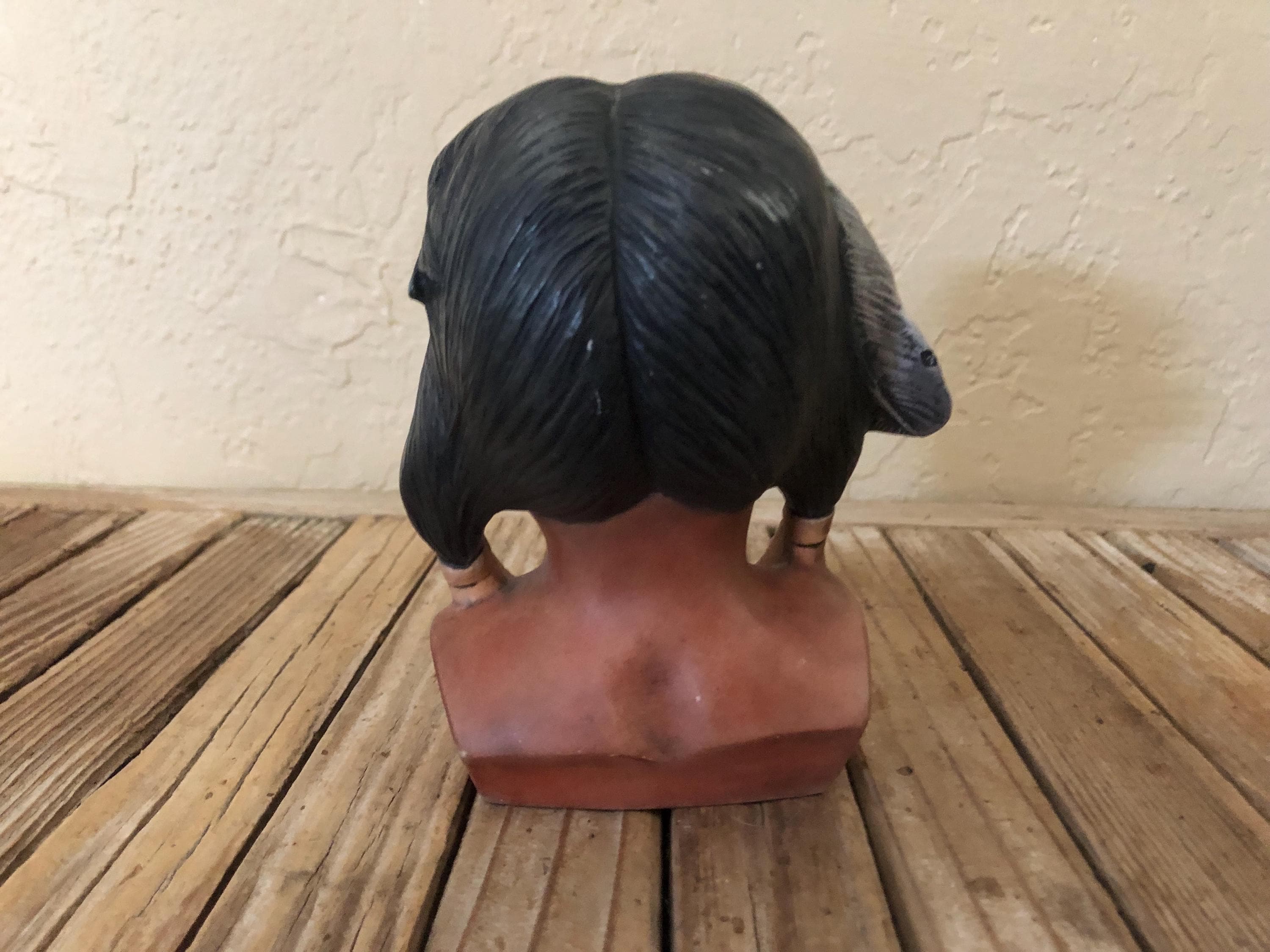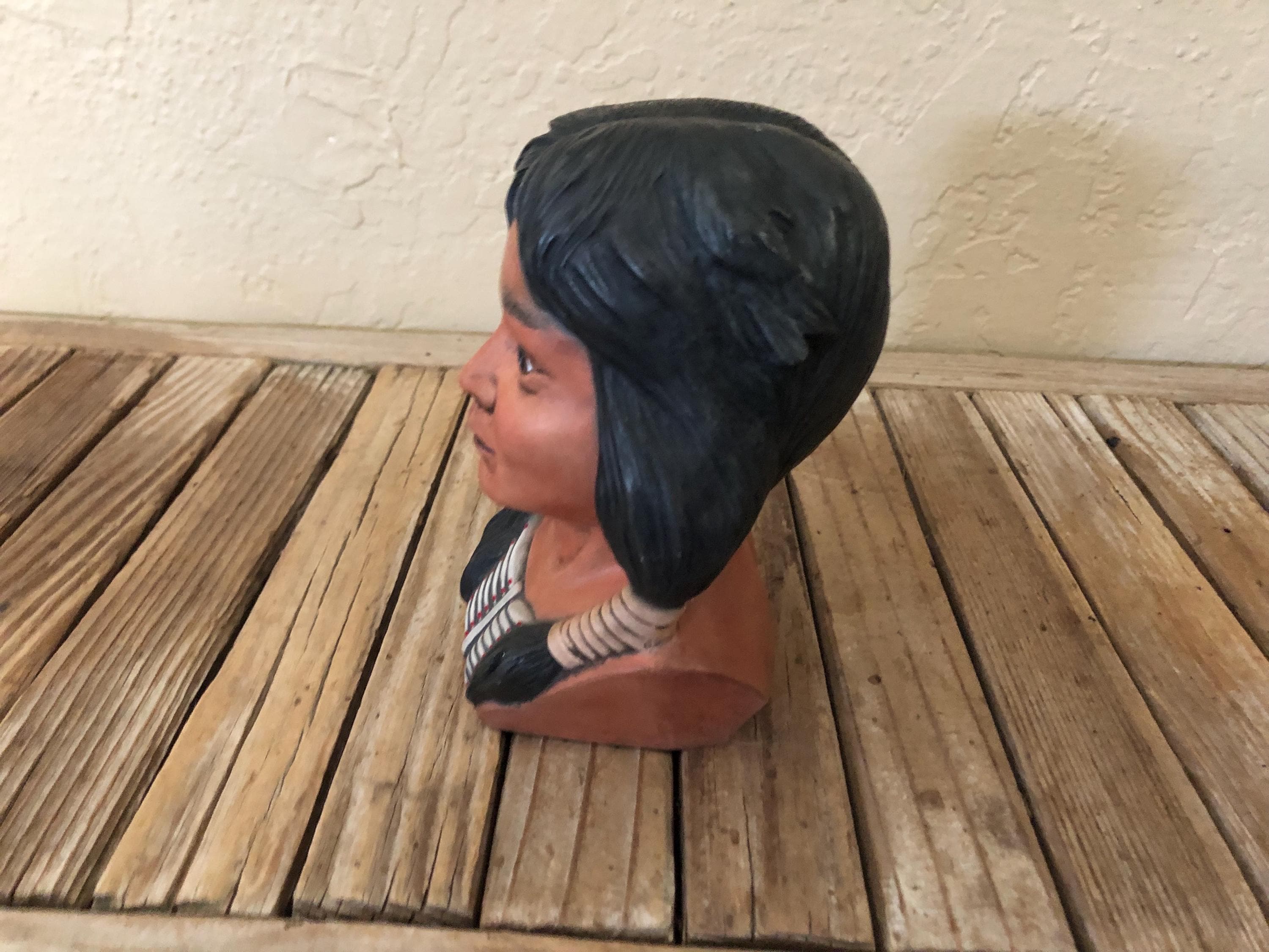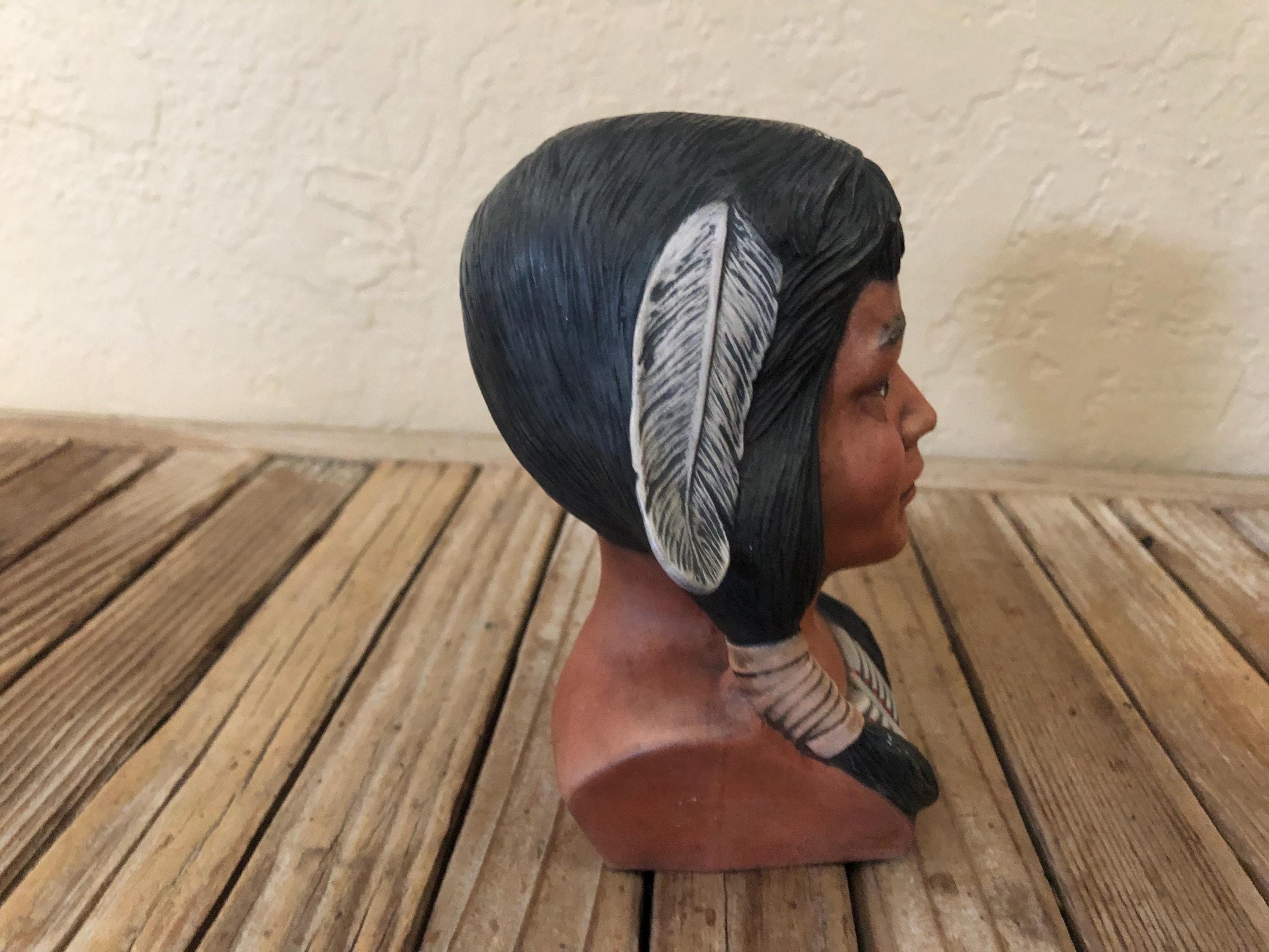 Vintage Indian statue figurine. In great condition, normal wear due to age and use. There is some scrapes to the painted finish, along the hair and the feathers in the front, please see pictures. A beautiful, unique piece to add to a collection or to give as a gift.