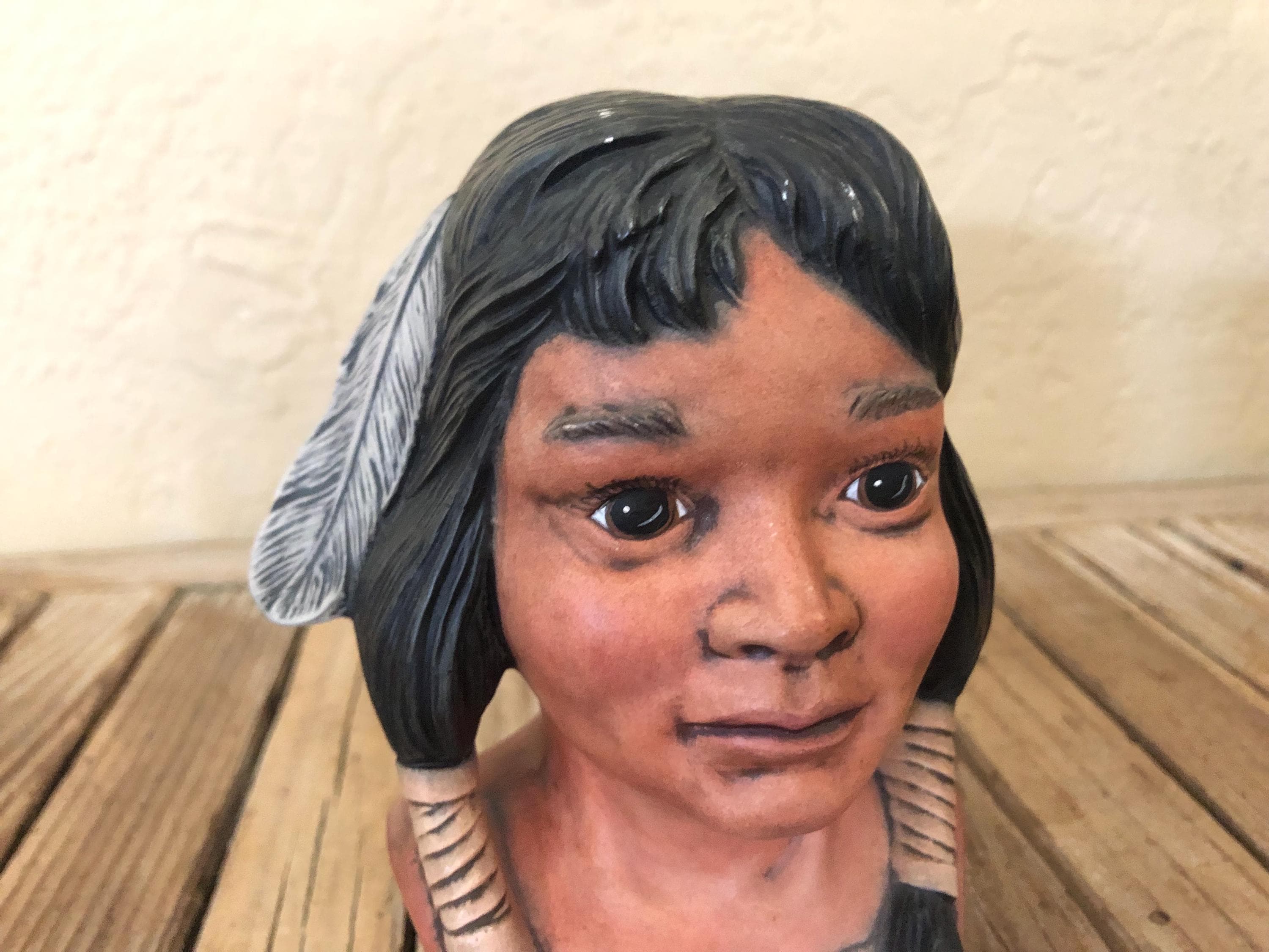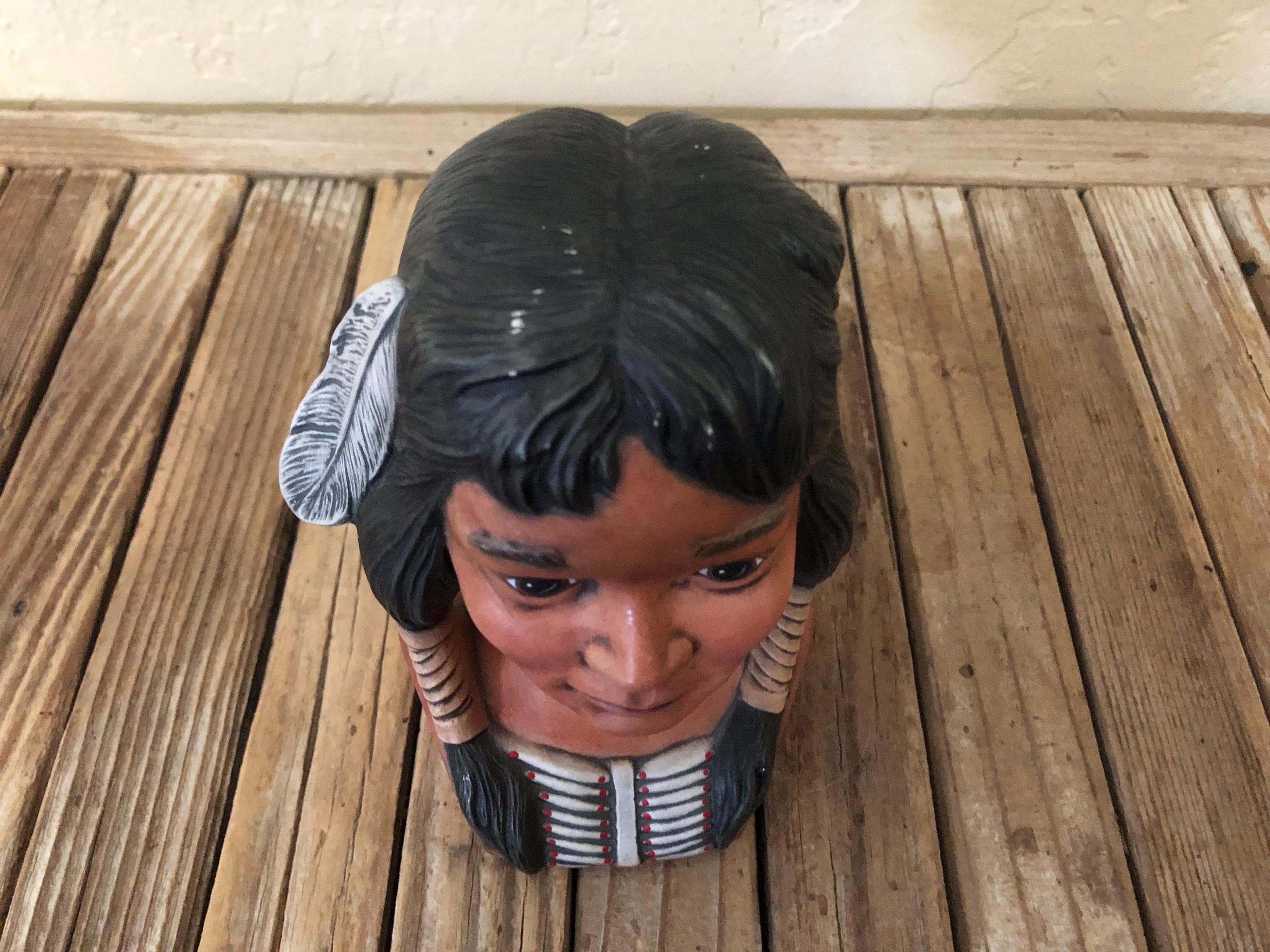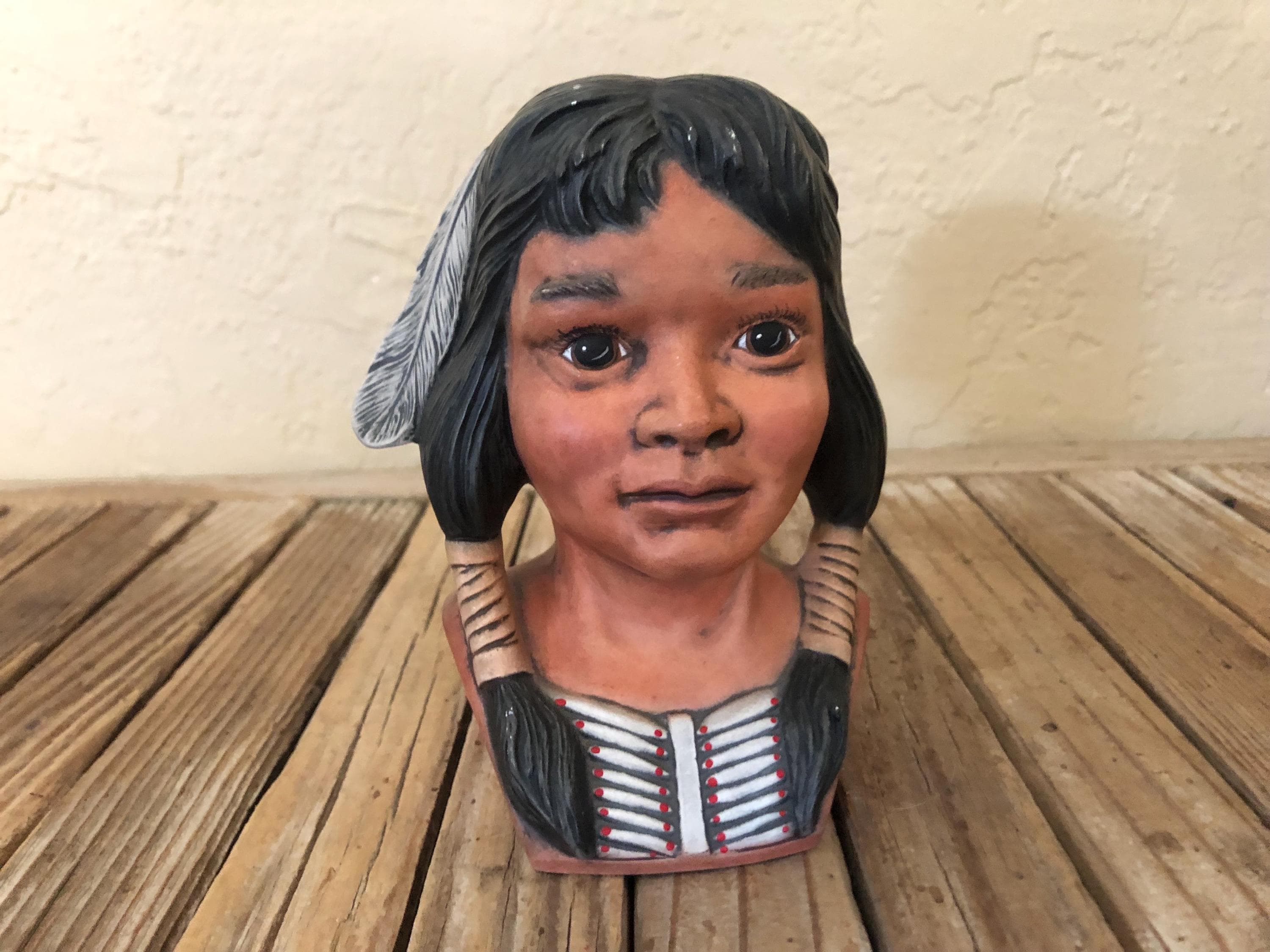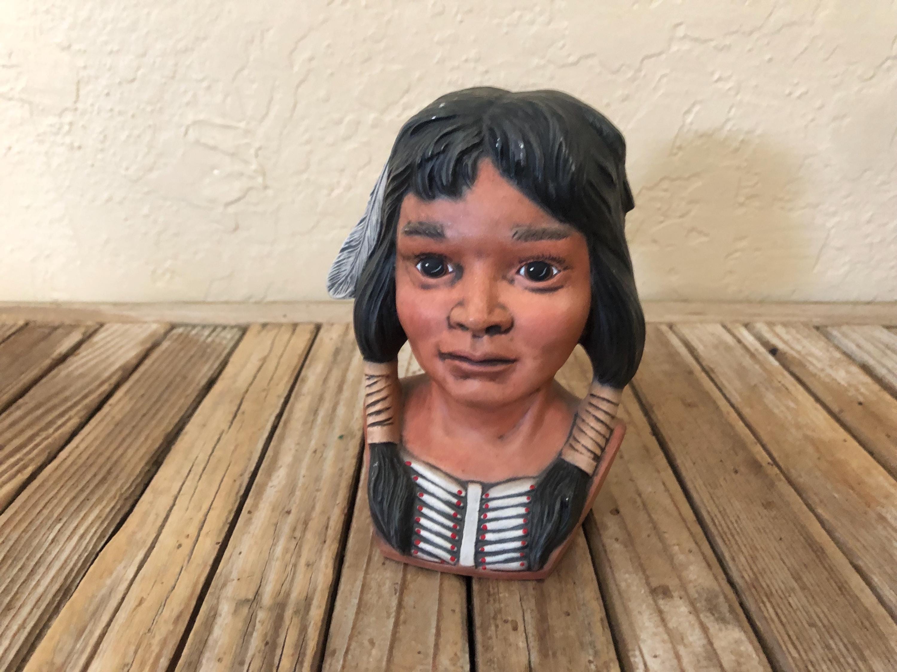 Vintage Indian statue figurine. In great condition, normal wear due to age and use. There is some scrapes to the painted finish, along the hair and the feathers in the front, please see pictures. A beautiful, unique piece to add to a collection or to give as a gift.
