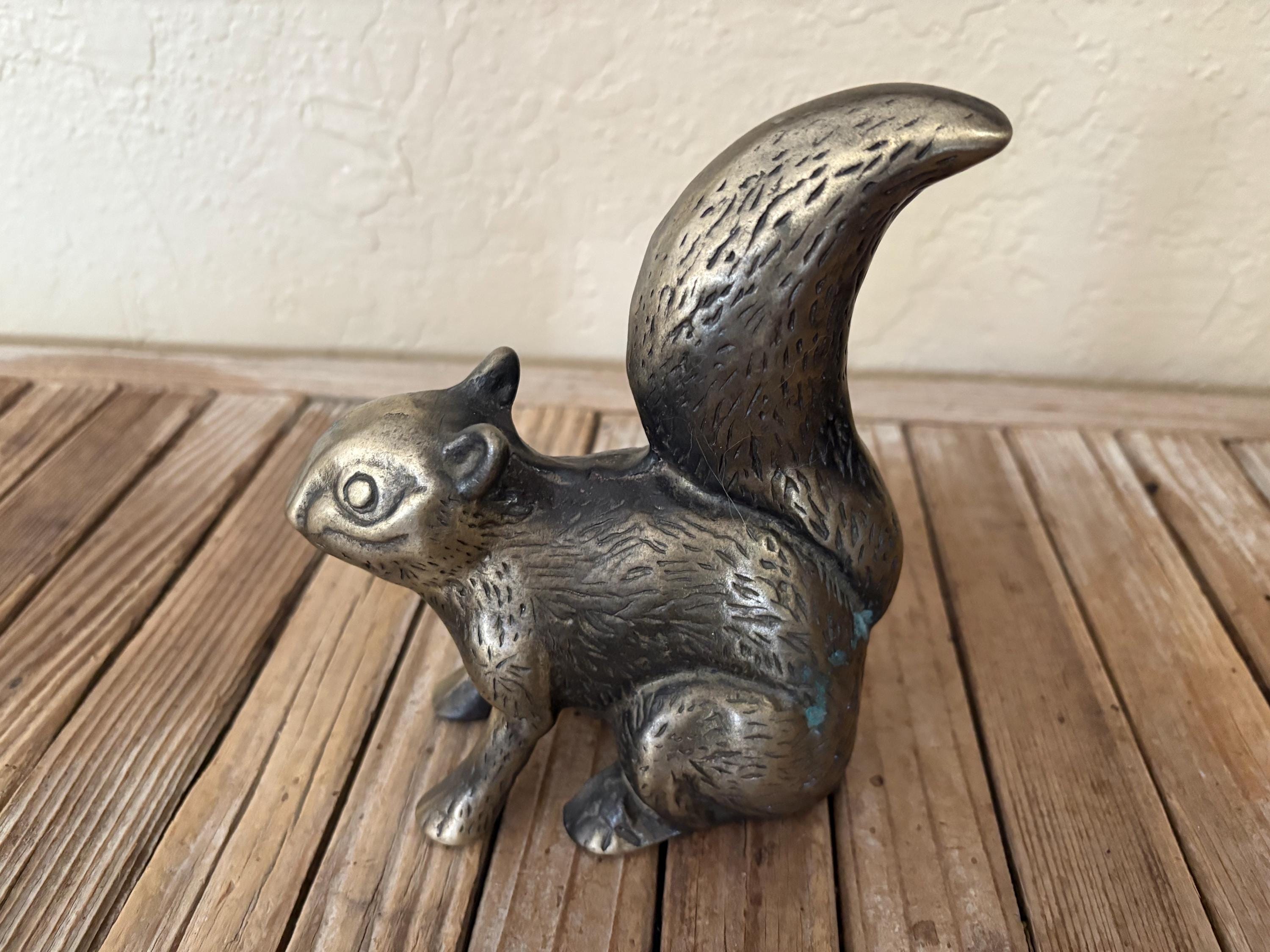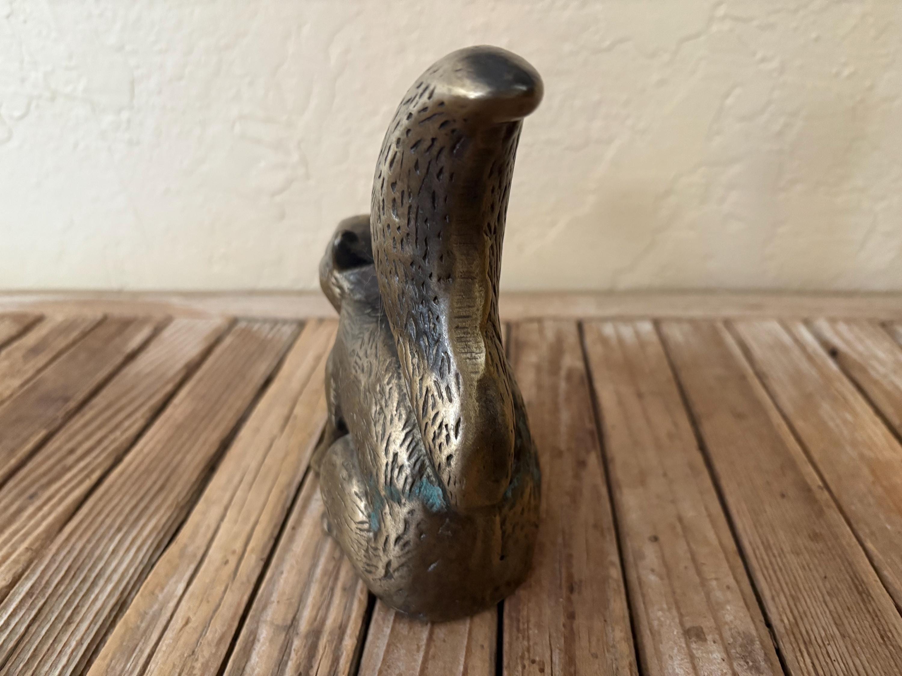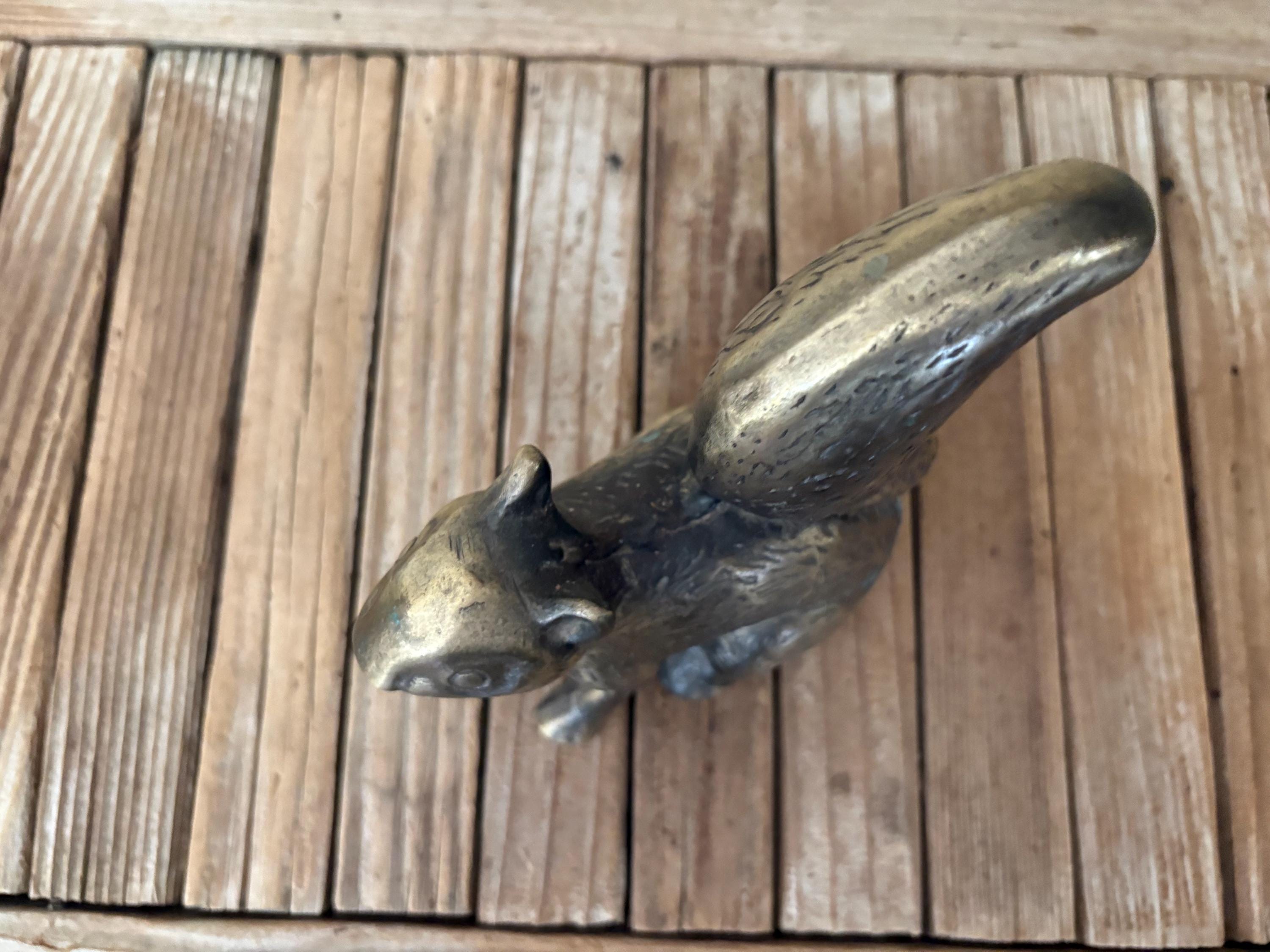 Vintage brass squirrel. In great worn condition, normal wear due to age and use. The brass has some surface imperfections and scrapes, as well as some oxidation, please see pictures. A very cool piece to use as a decorative piece or bookend.