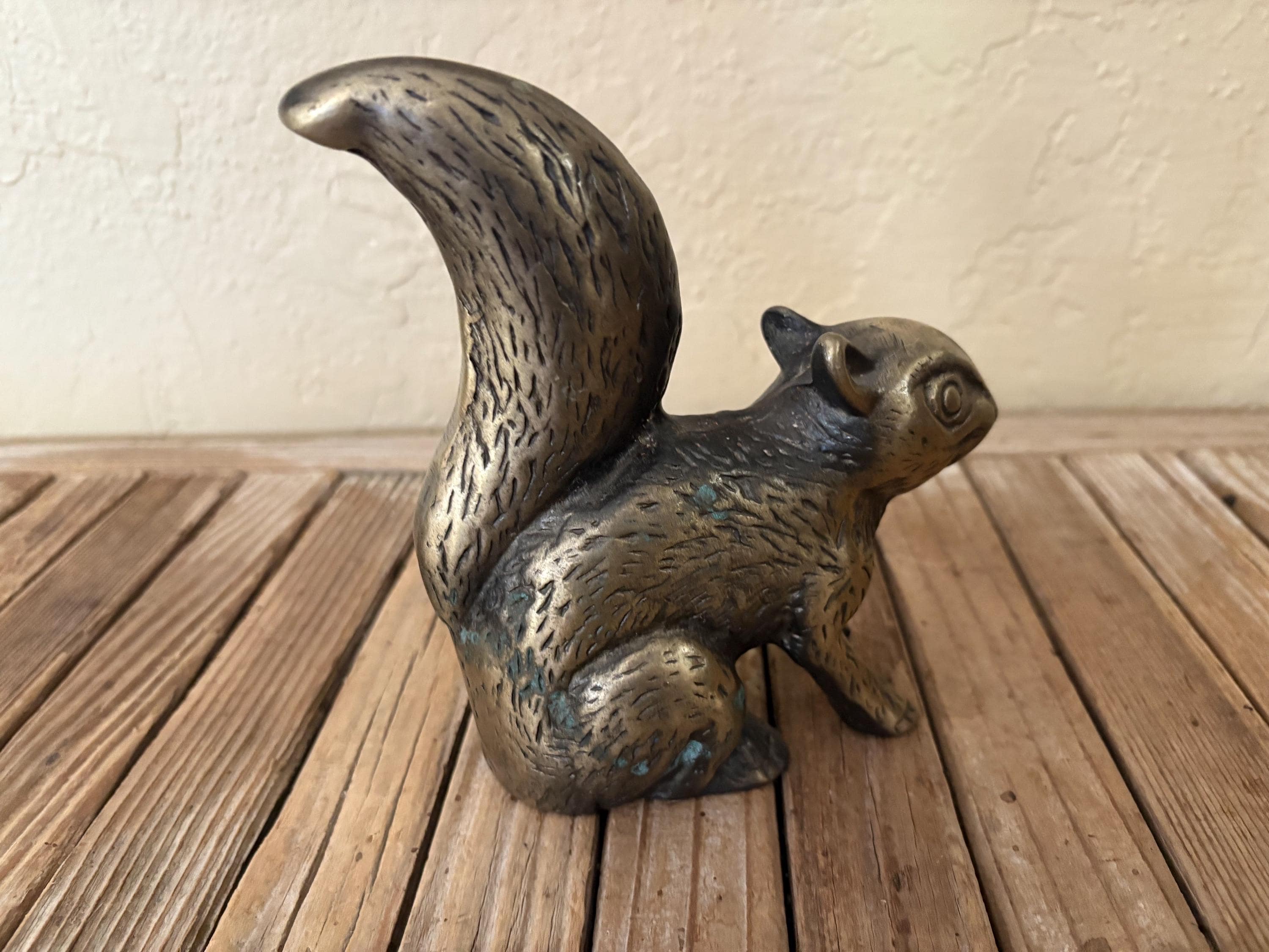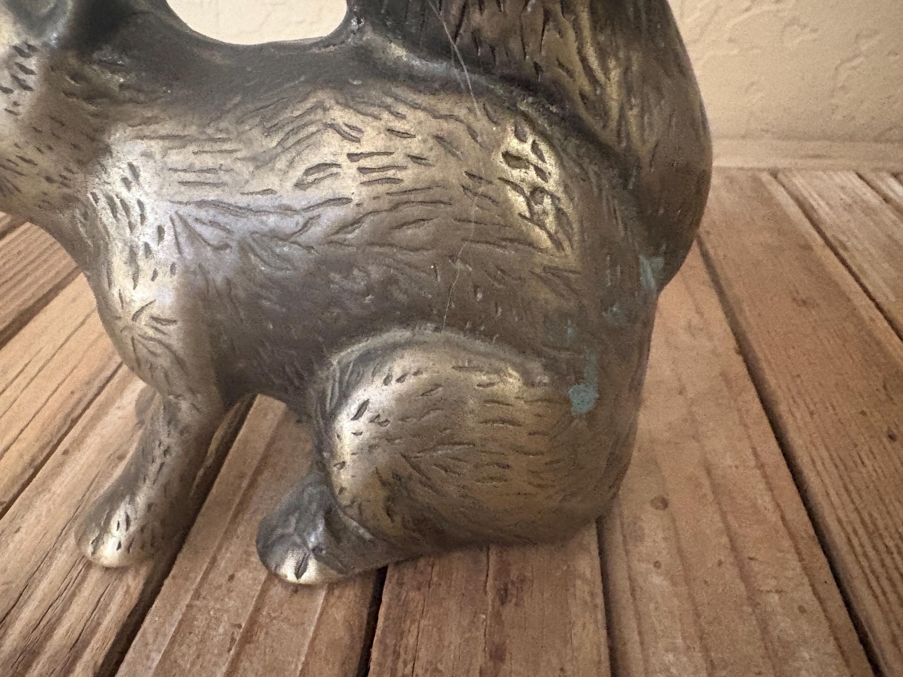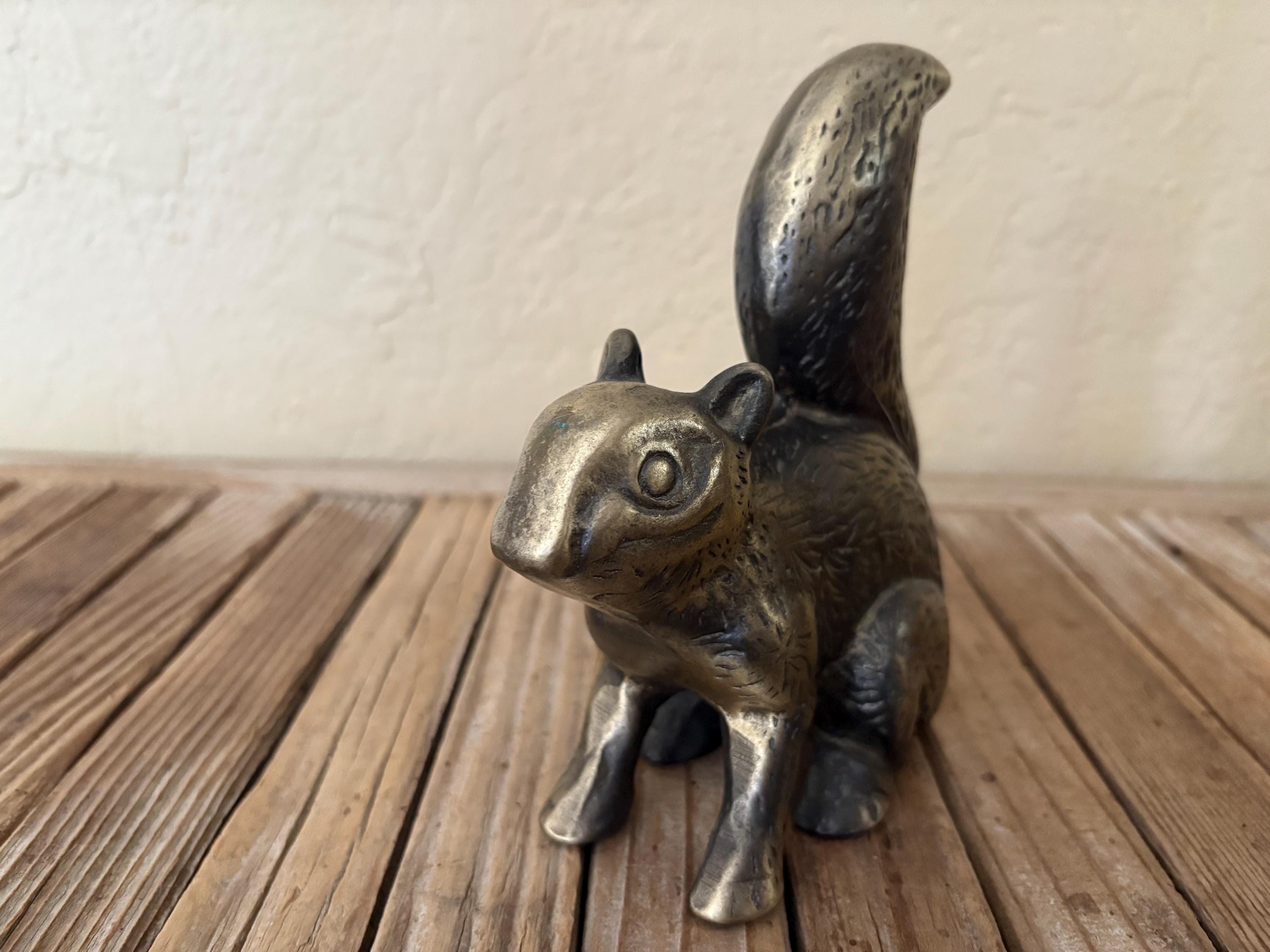 Vintage brass squirrel. In great worn condition, normal wear due to age and use. The brass has some surface imperfections and scrapes, as well as some oxidation, please see pictures. A very cool piece to use as a decorative piece or bookend.