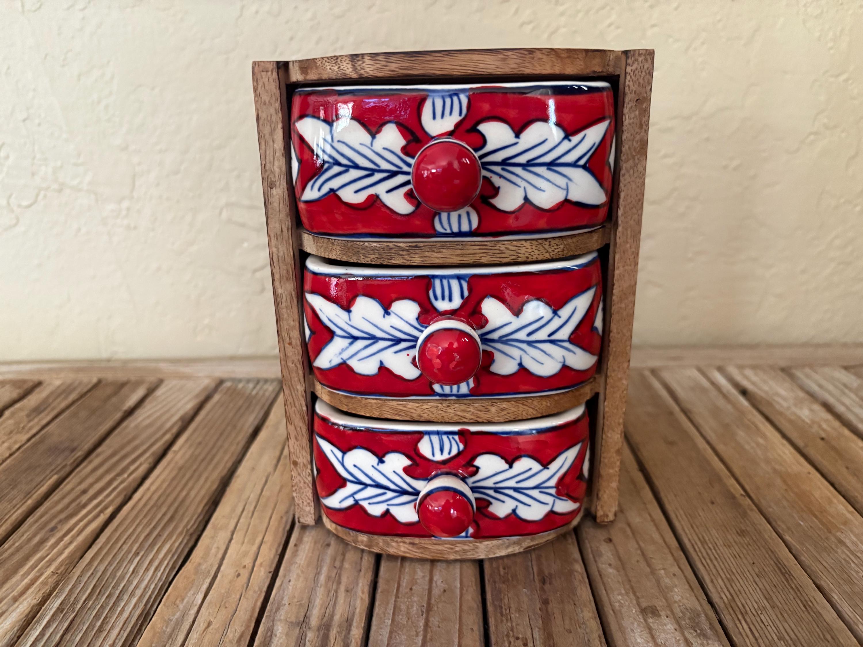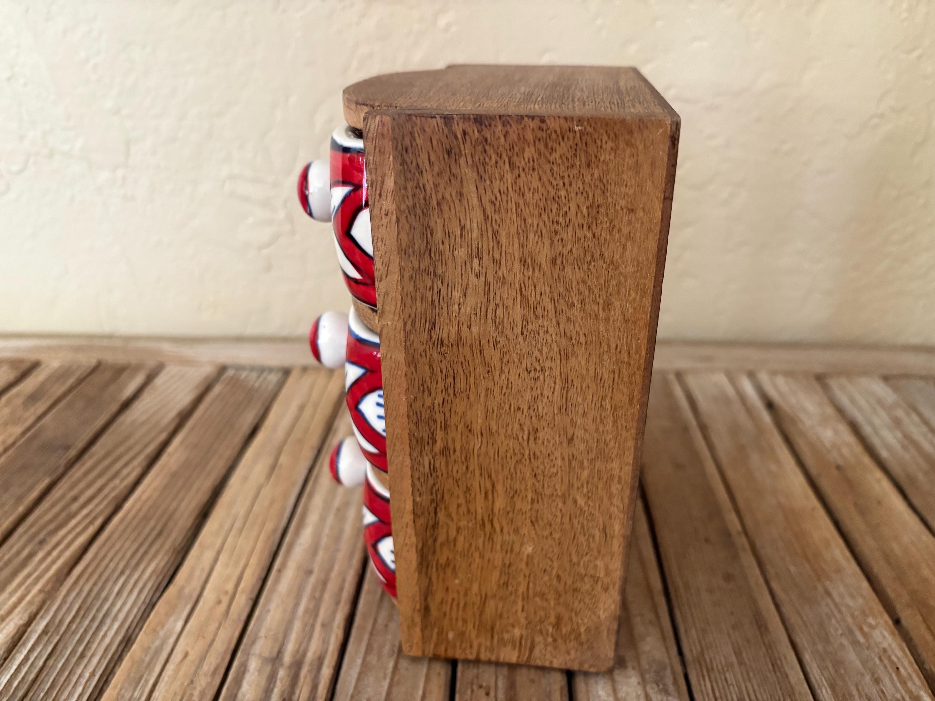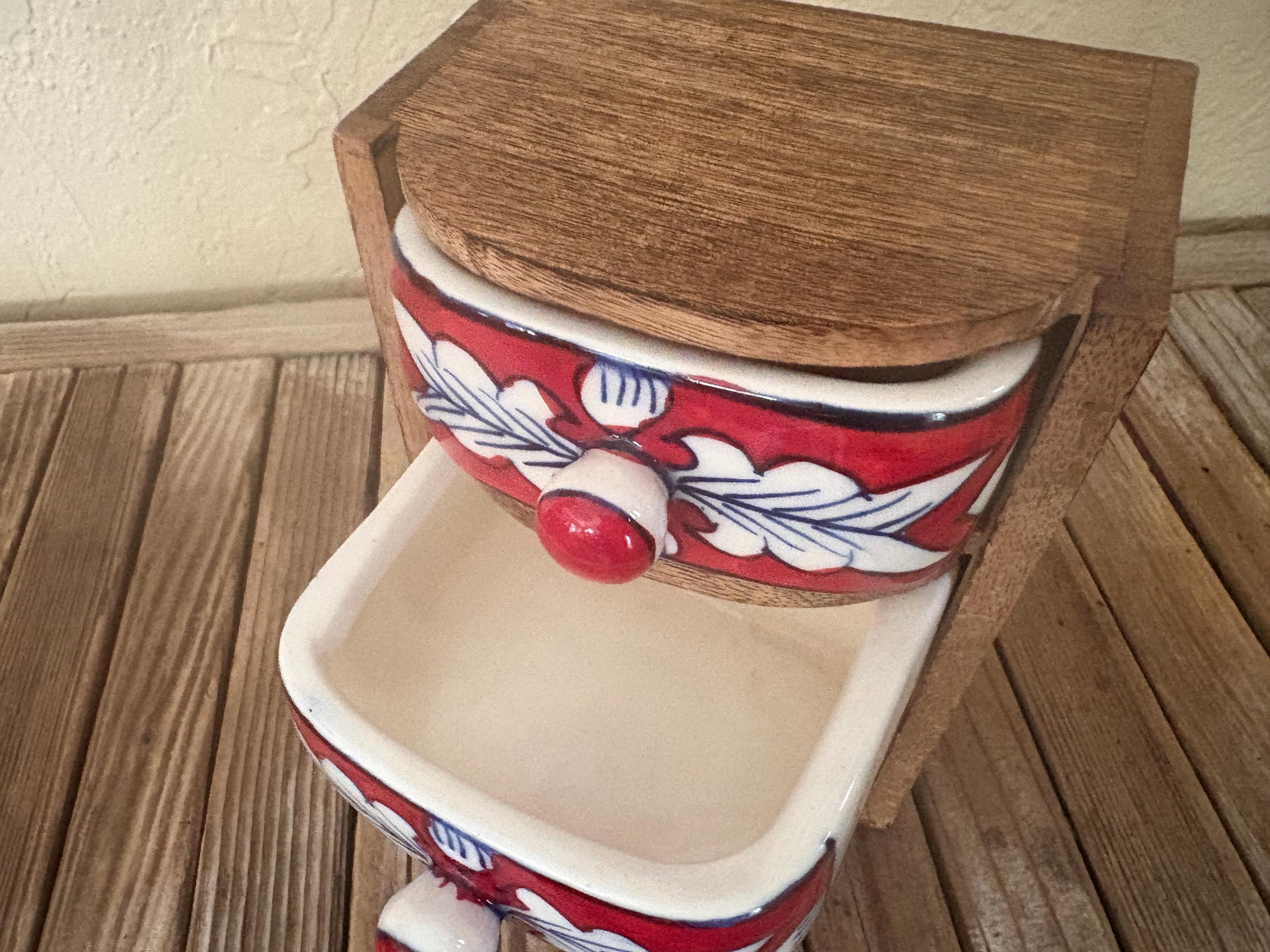 Vintage wood ceramic spice or jewelry storage. In great vintage condition, normal wear due to age and use. The piece has surface scrapes markings, with no chips or cracks, please see pictures. A cool piece to add to your wall for spices or for jewelry storage.