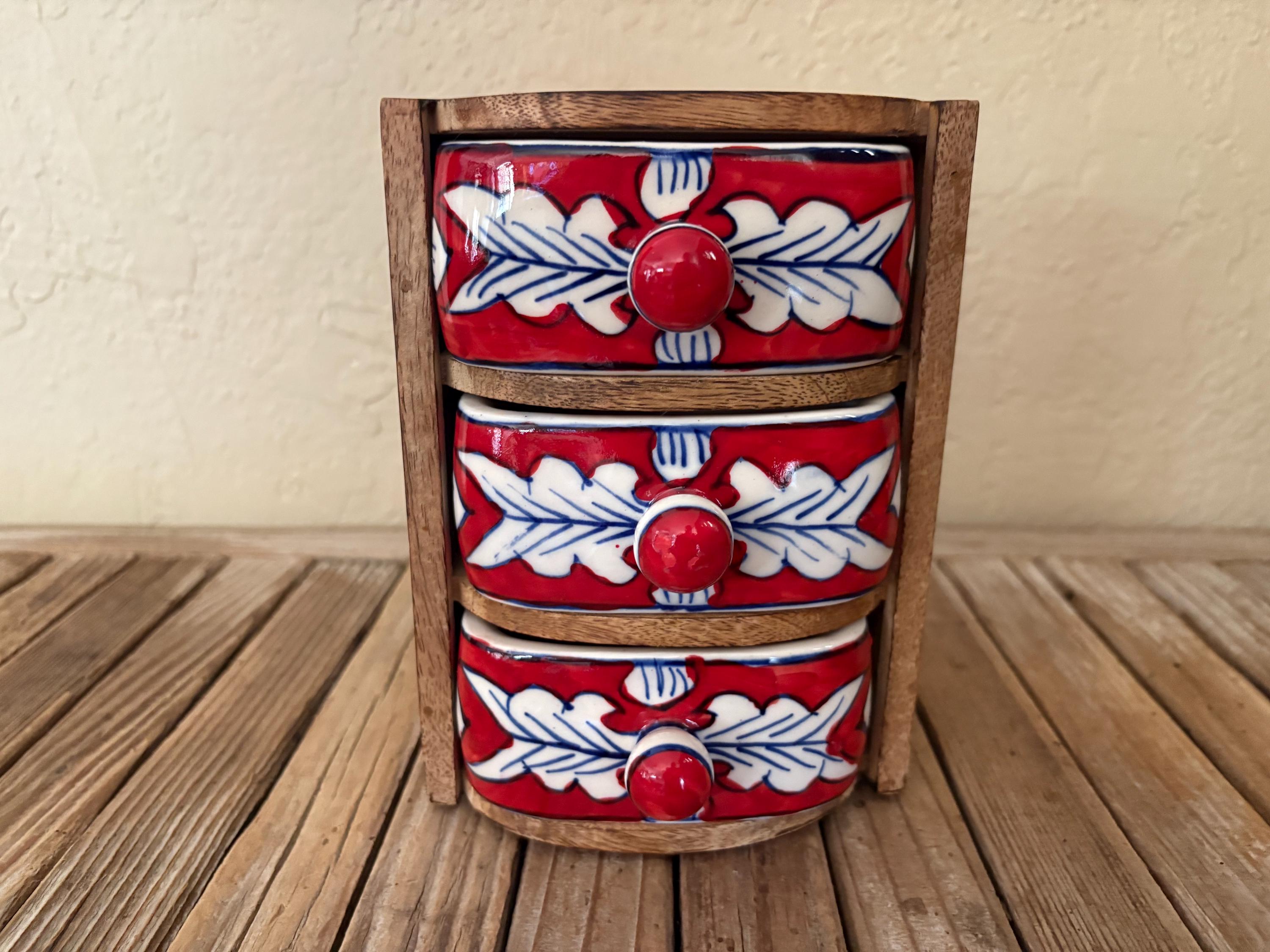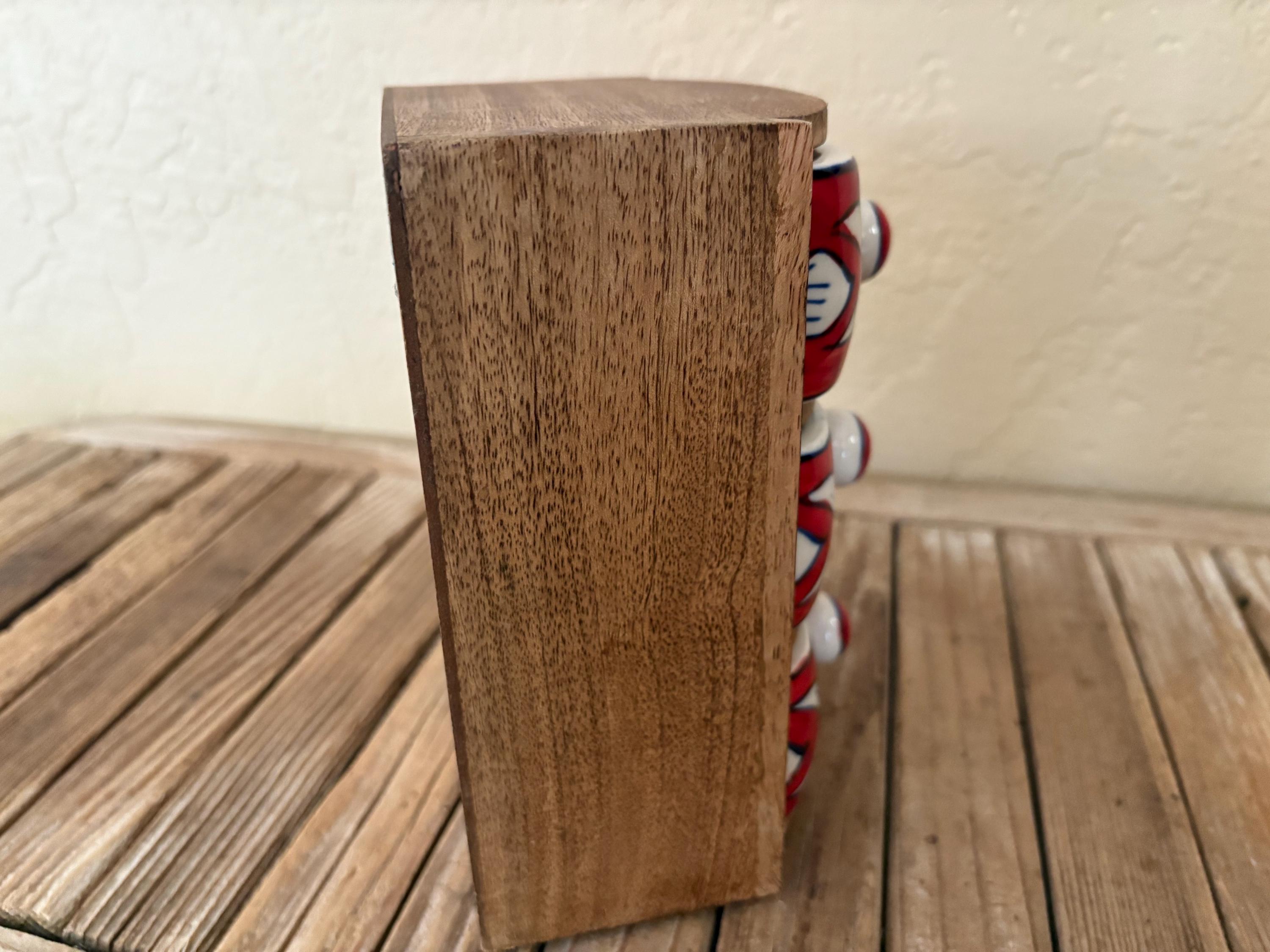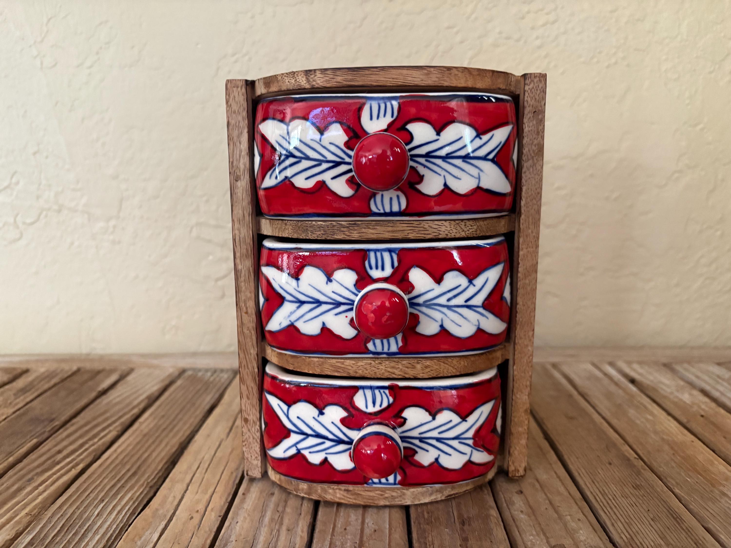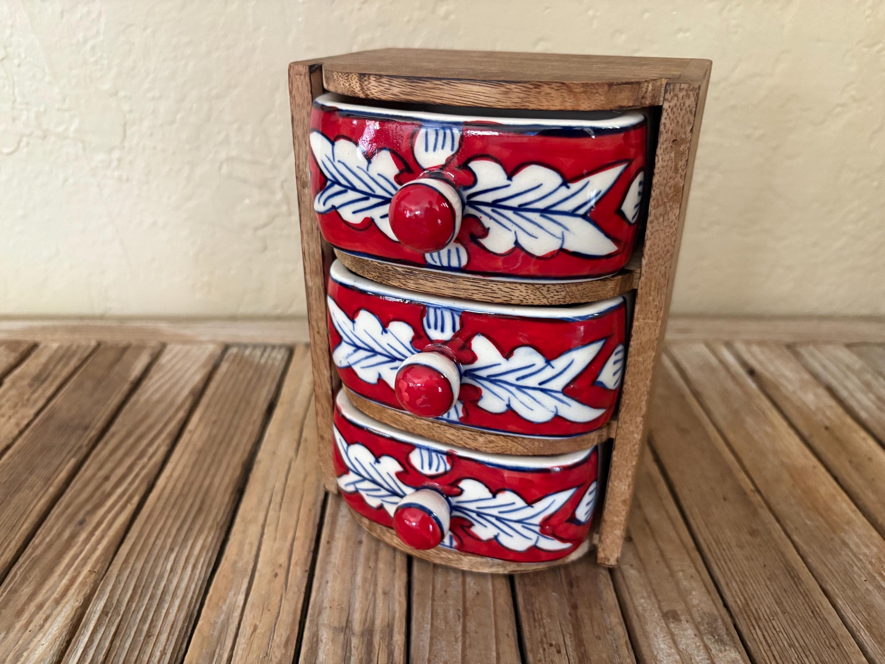 Vintage wood ceramic spice or jewelry storage. In great vintage condition, normal wear due to age and use. The piece has surface scrapes markings, with no chips or cracks, please see pictures. A cool piece to add to your wall for spices or for jewelry storage.
