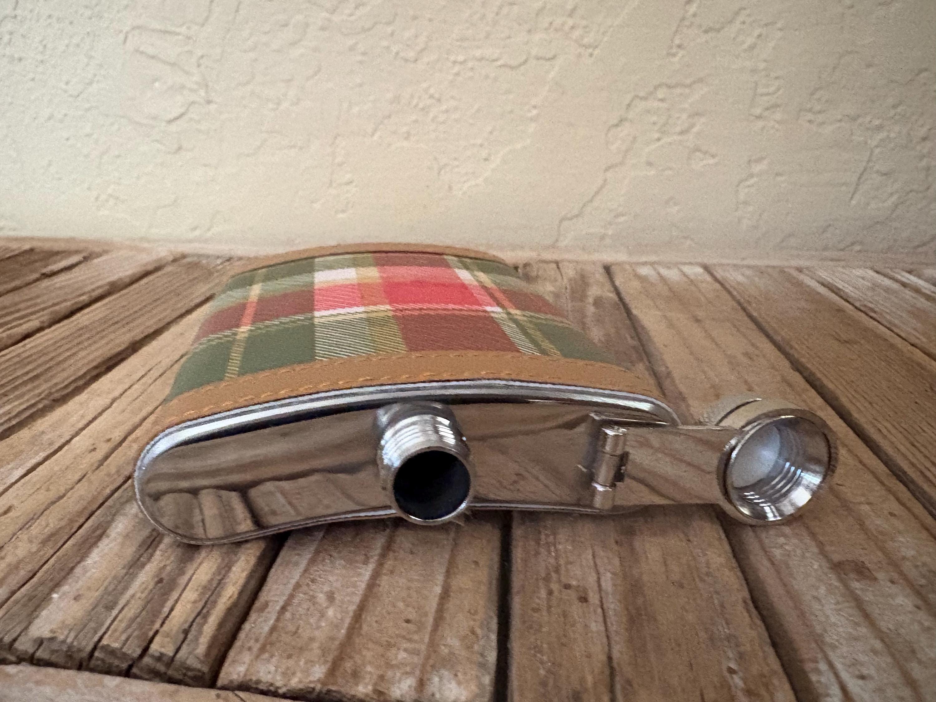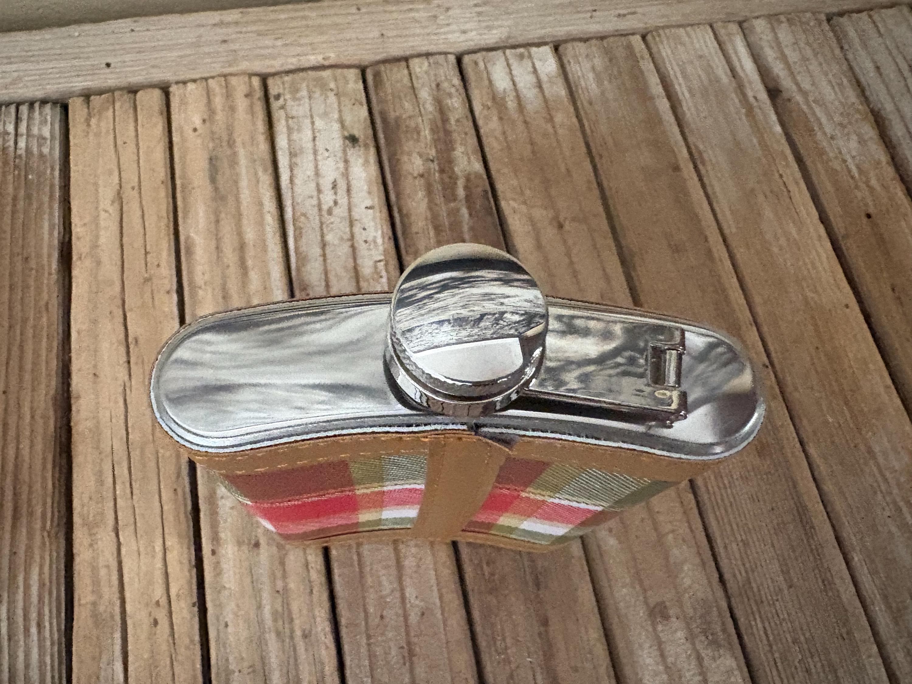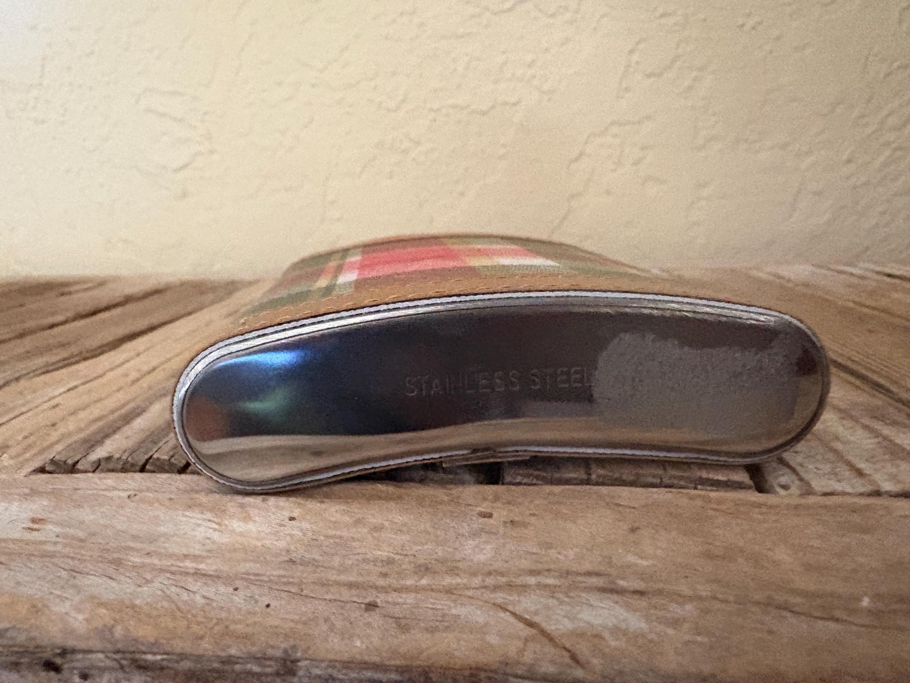 Vintage plaid stainless steel flask. In great vintage condition, normal wear due to age use. The plaid cover has surface scrapes and markings, along with remnant sticker film on the base, please see pictures. A great, unique piece to keep for yourself or to give as a gift.