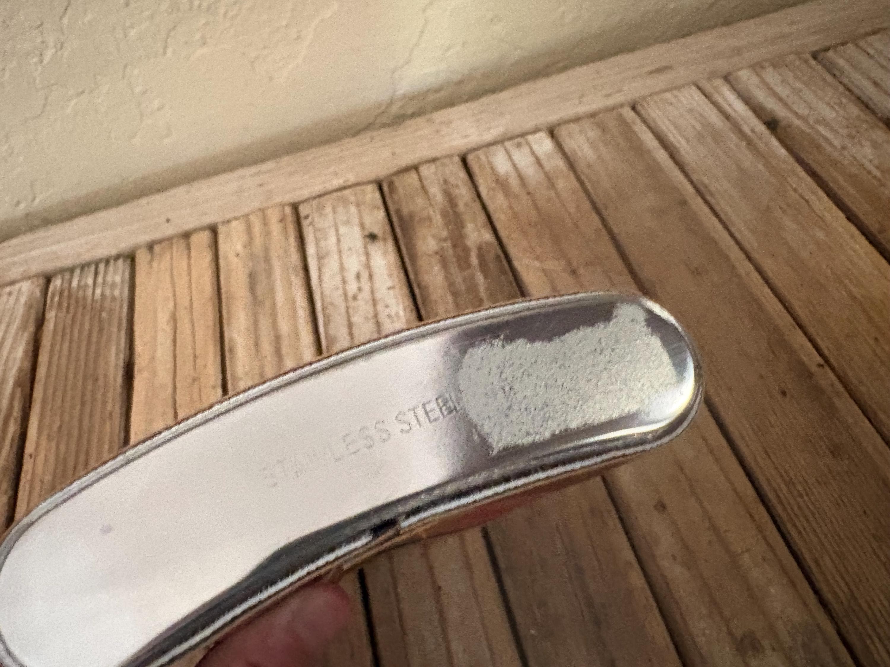 This piece is stamped Stainless Steel. I believe the plaid cover is a faux leather or some kind of material.