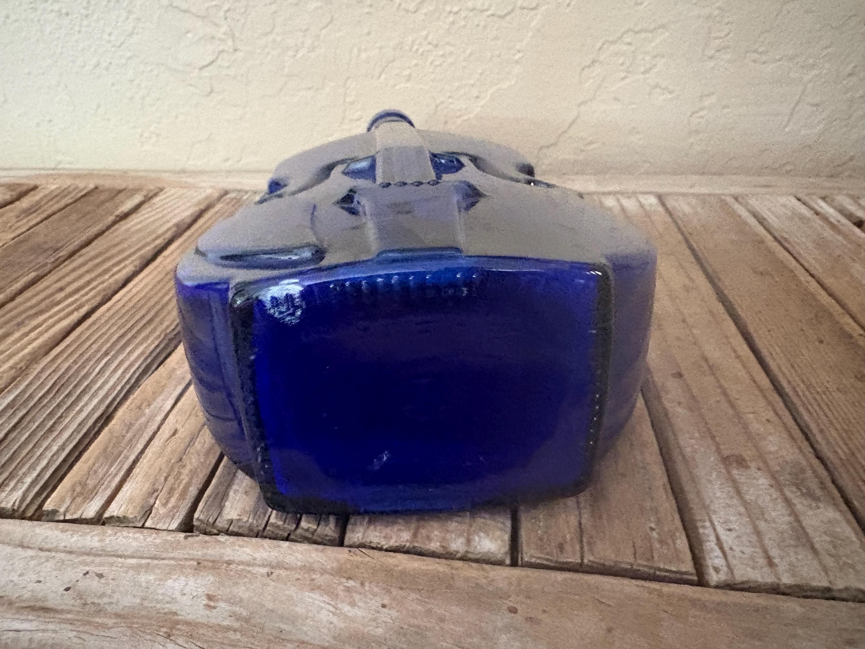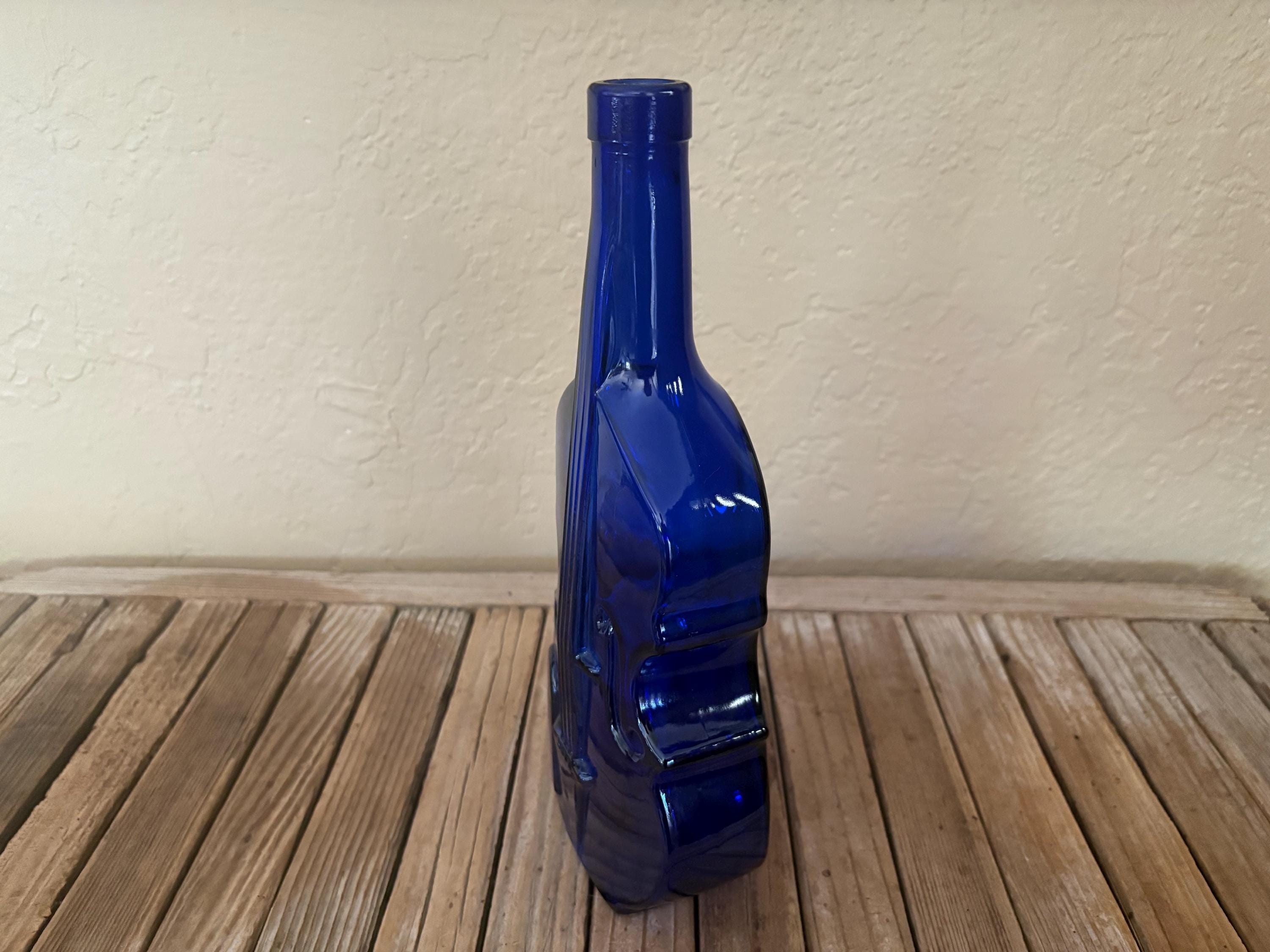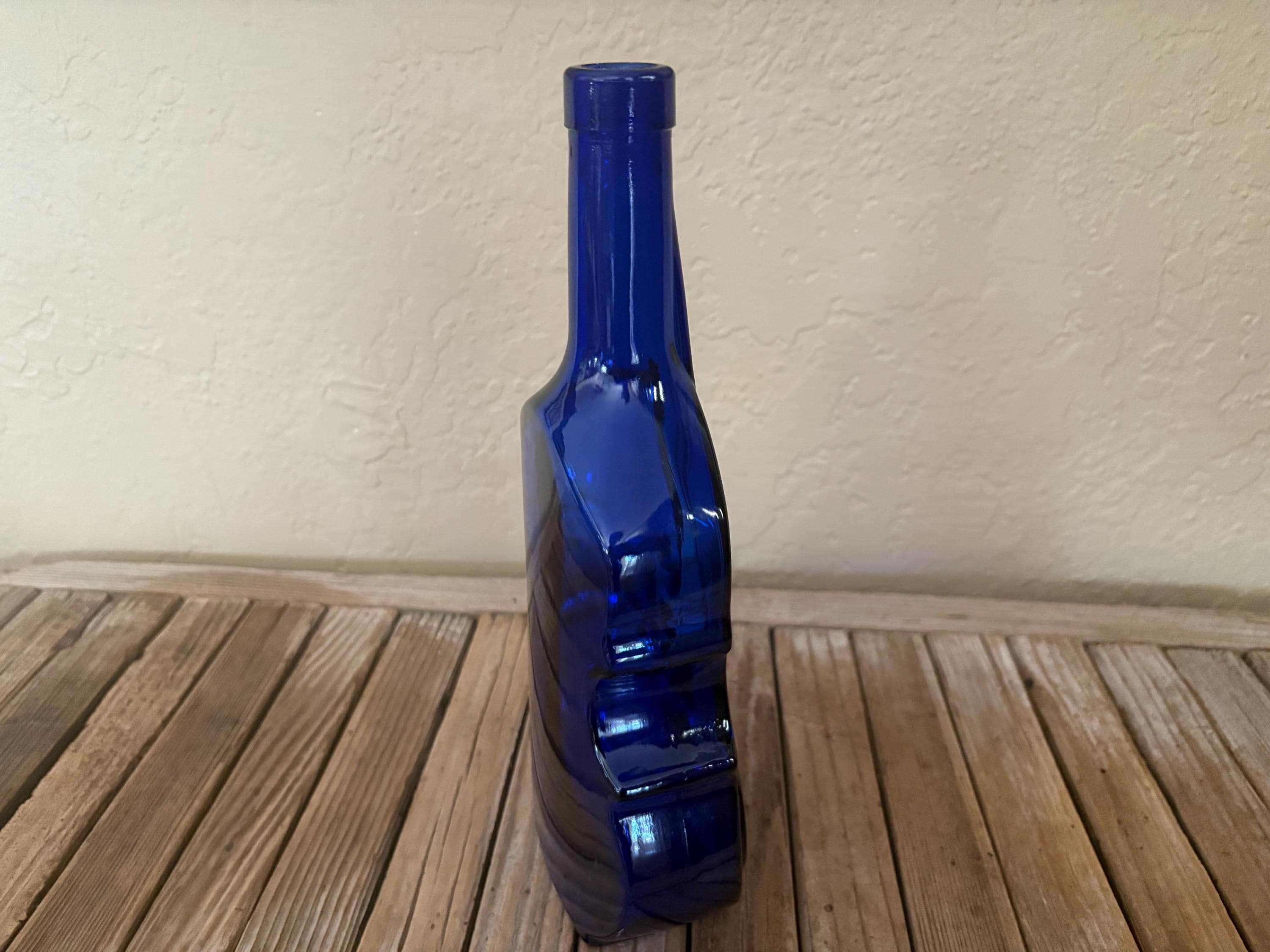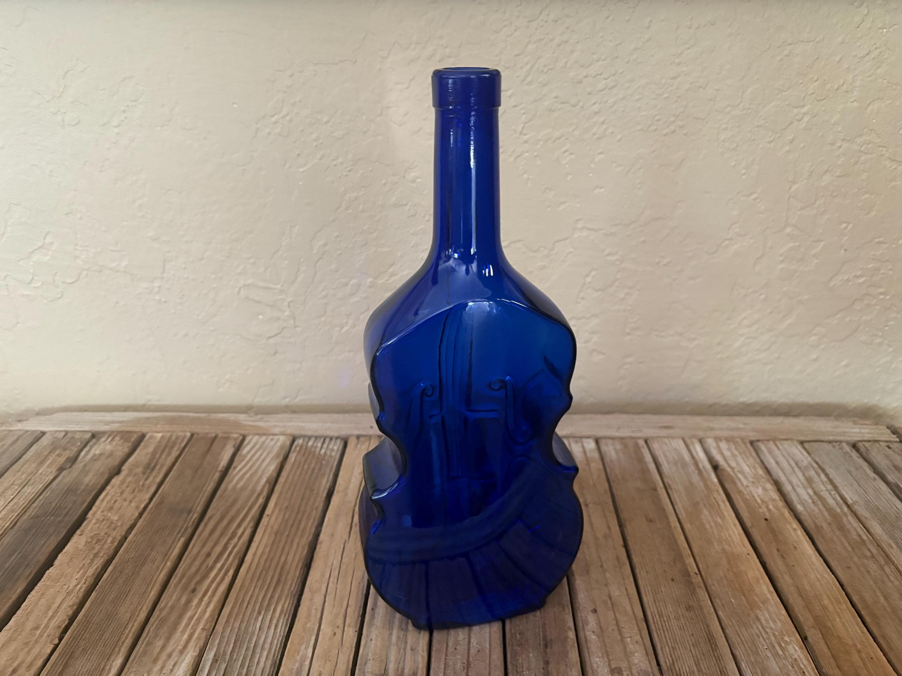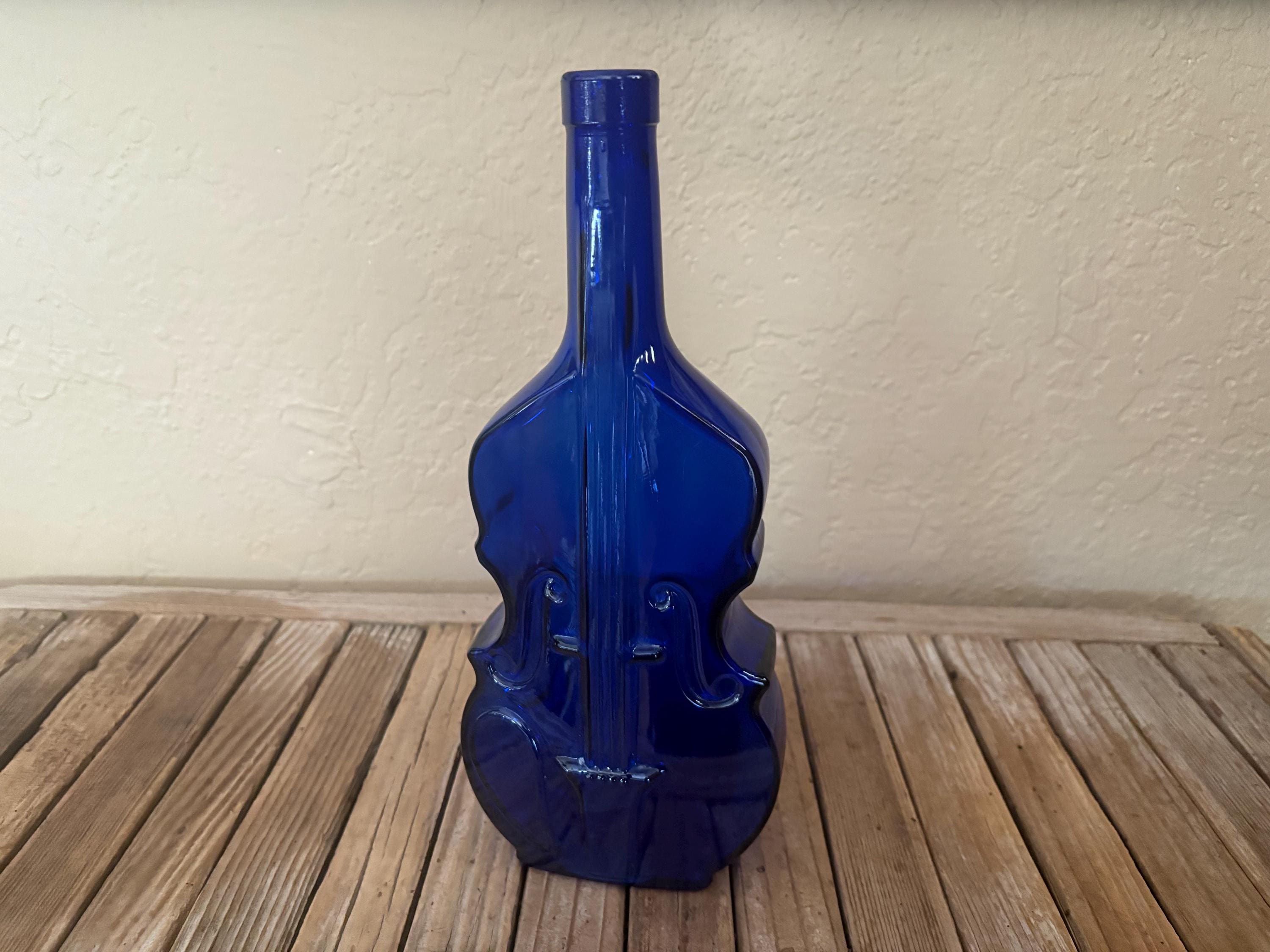 Vintage cobalt blue musical instrument bottle. In great condition, normal wear due to age and use. Some slight scrapes and markings to the bottle and the bottle has no lid, please see pictures. A cool bottle with great color and detail to add to your home. or to give as a gift.