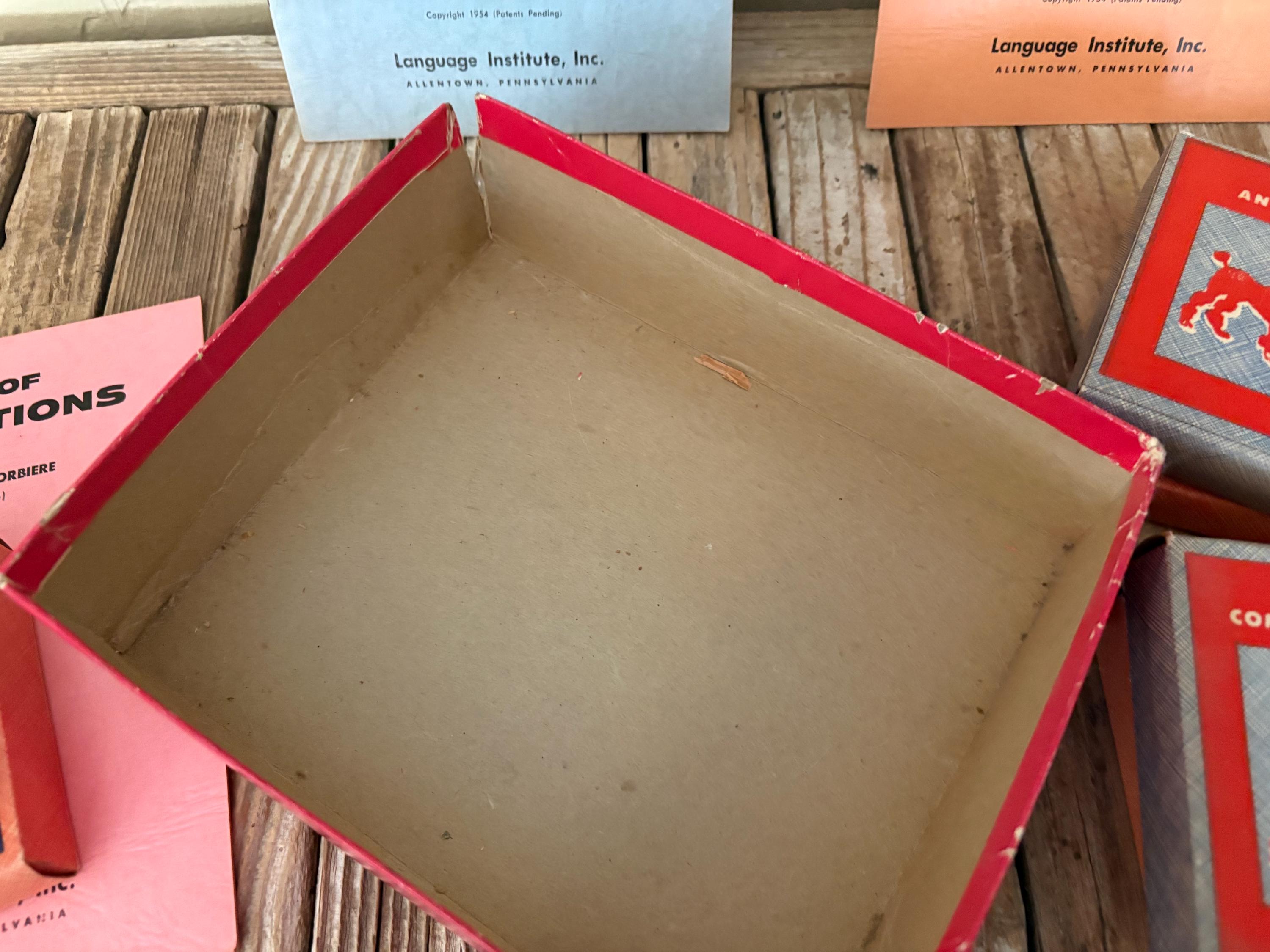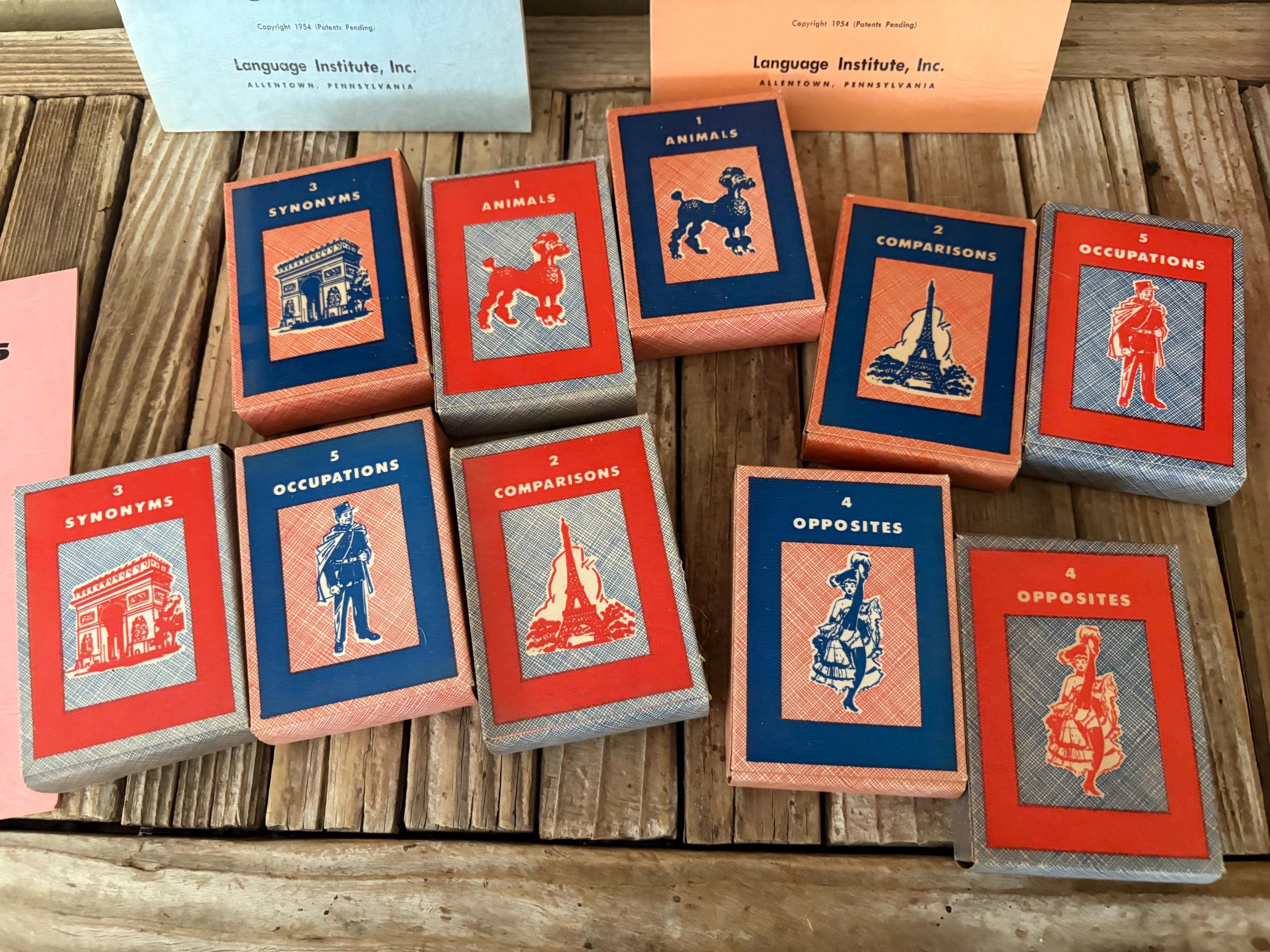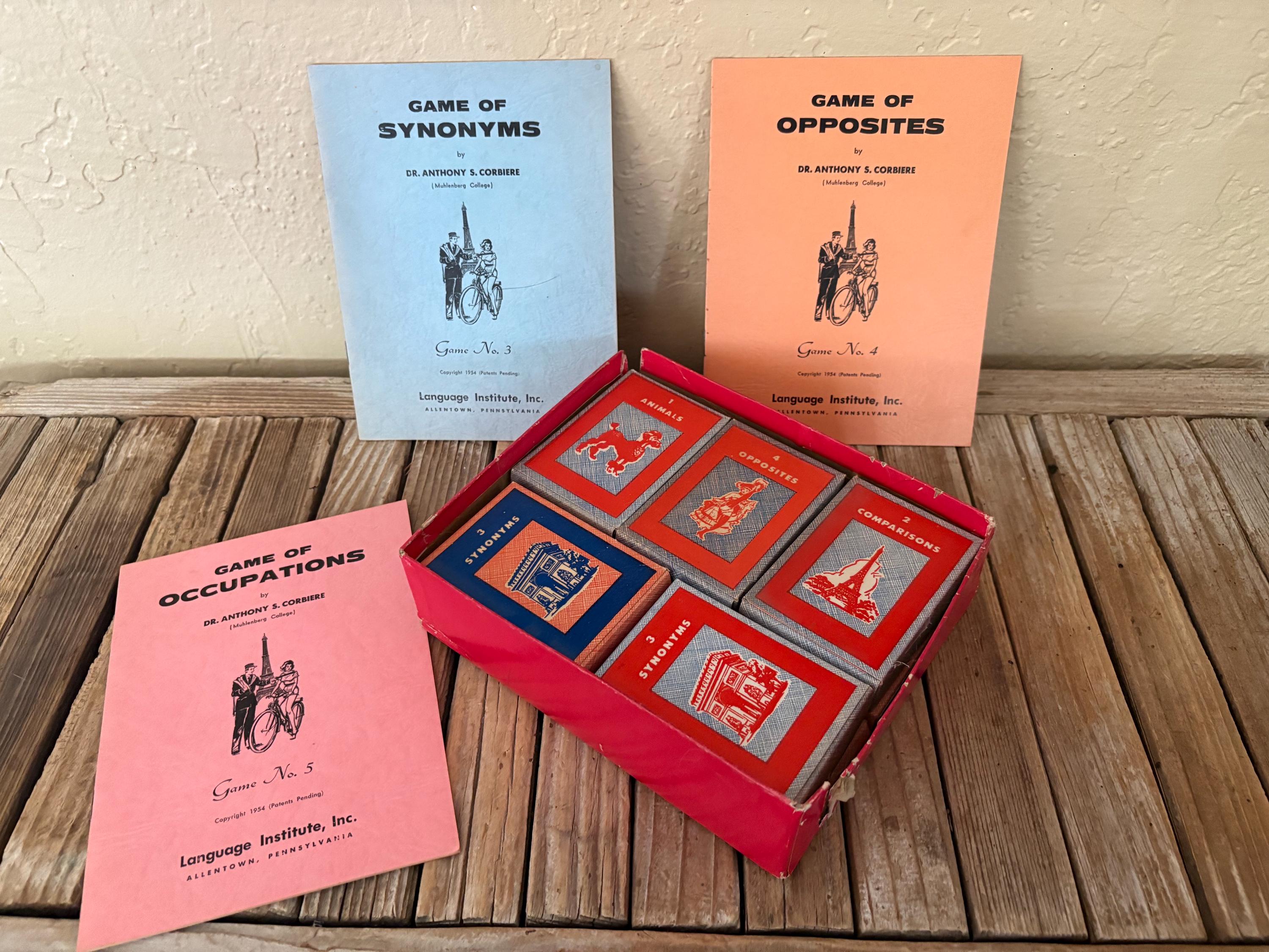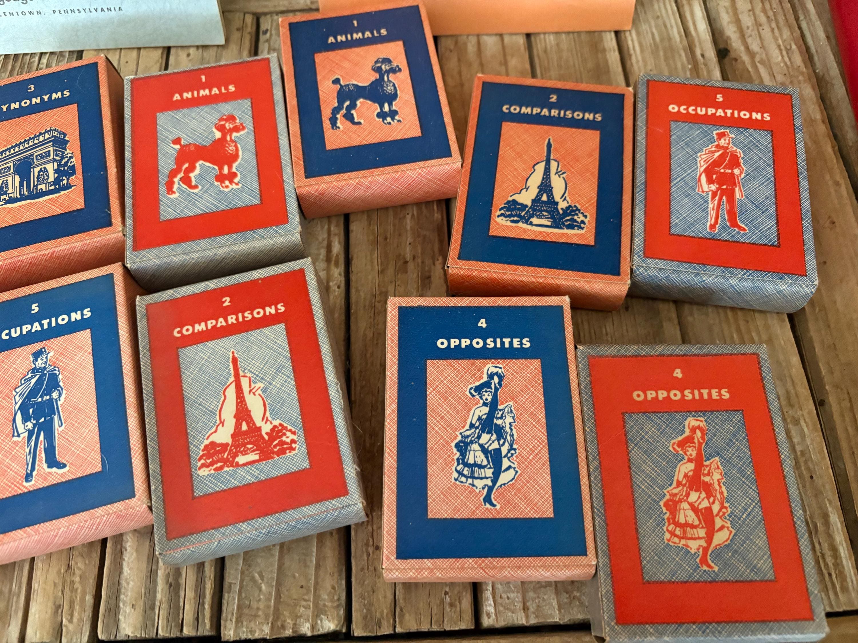 Vintage Mid Century French Language Institute Game of Opposites, Synonyms, Occupations, Animals and Comparisons. In good vintage condition, normal wear due to age and use. The red box is tattered and ripped. The cards and books are in good condition, please see see pictures. A great set to ad to your home, home school or to give as a gift.