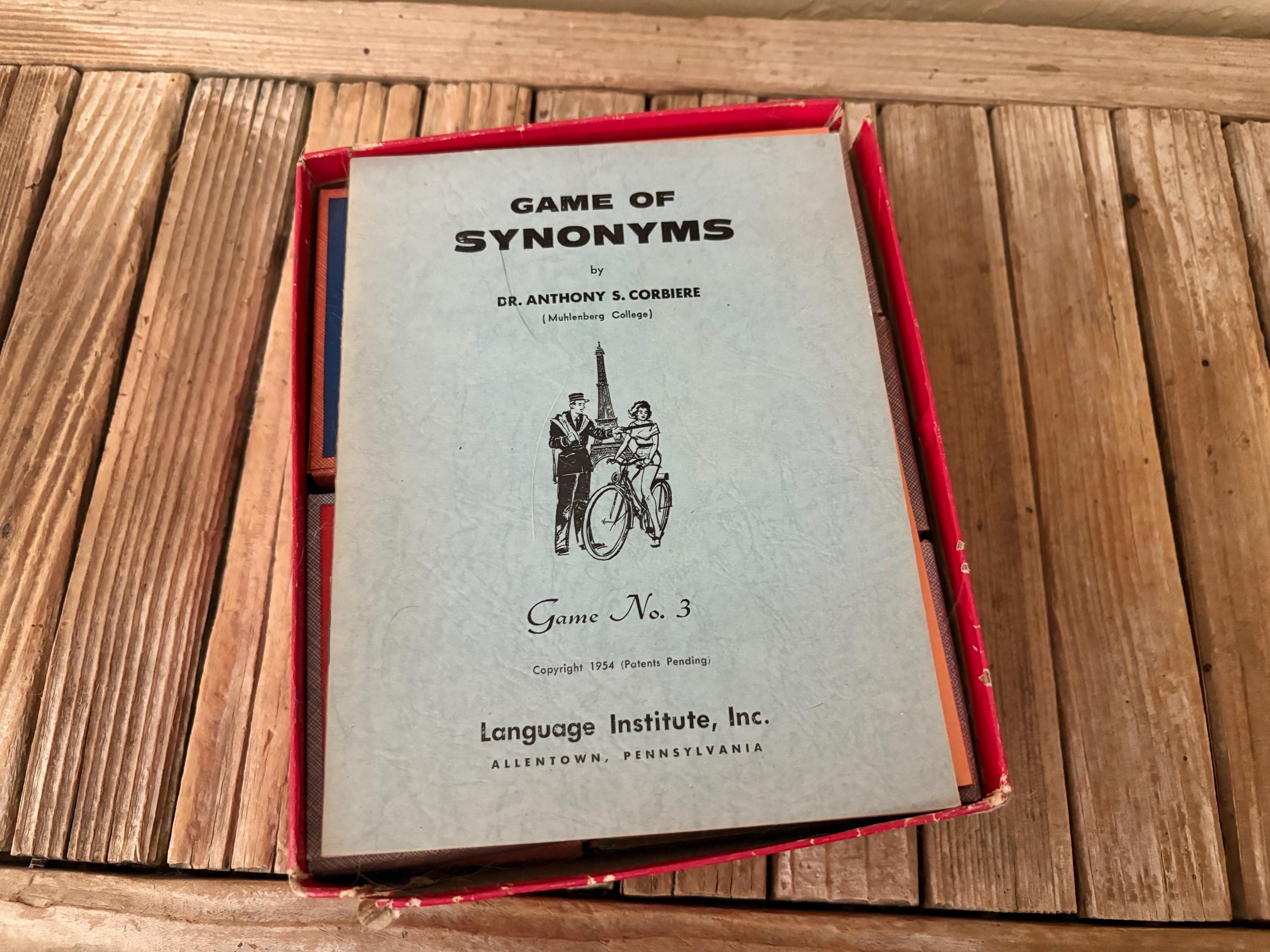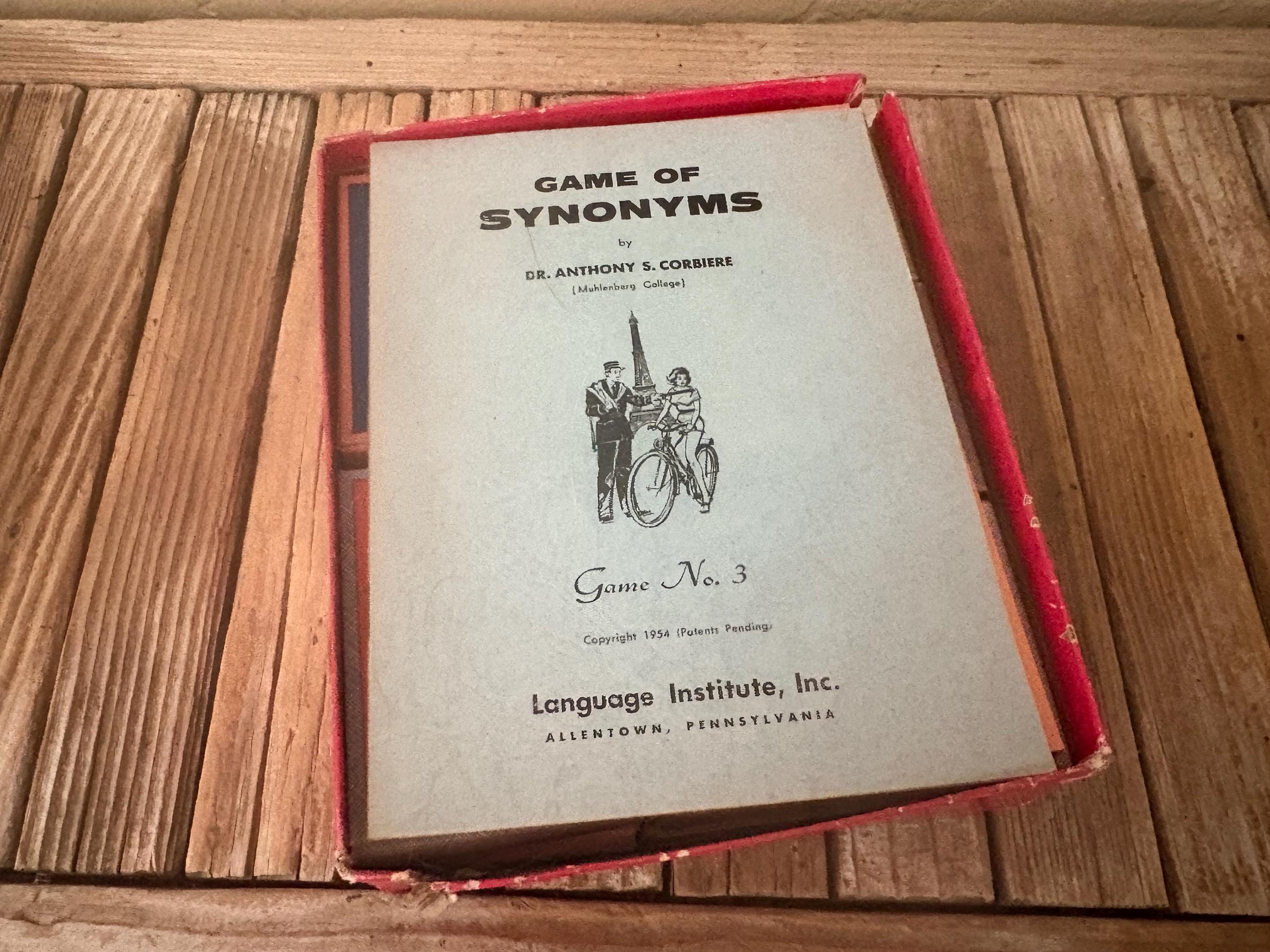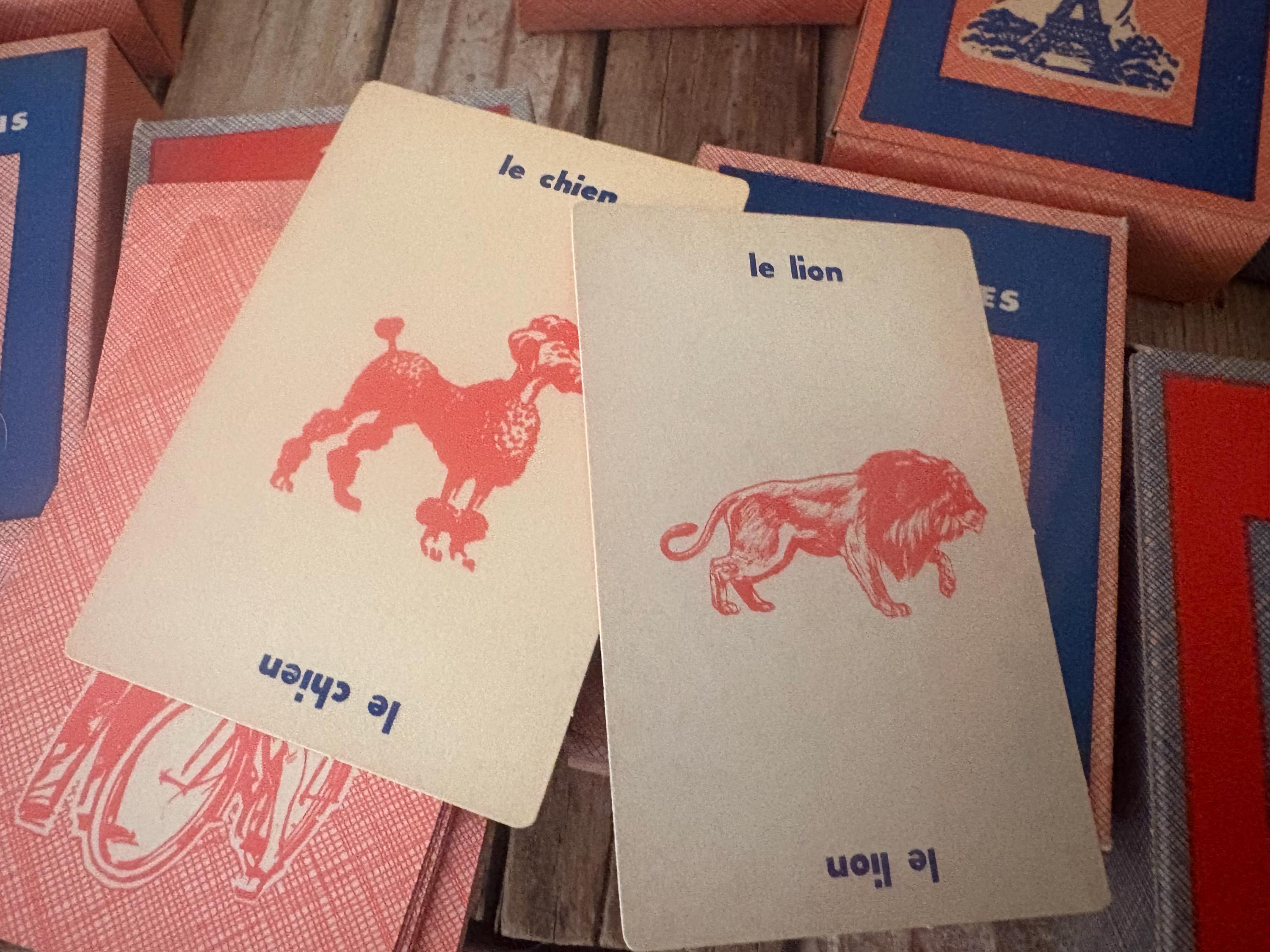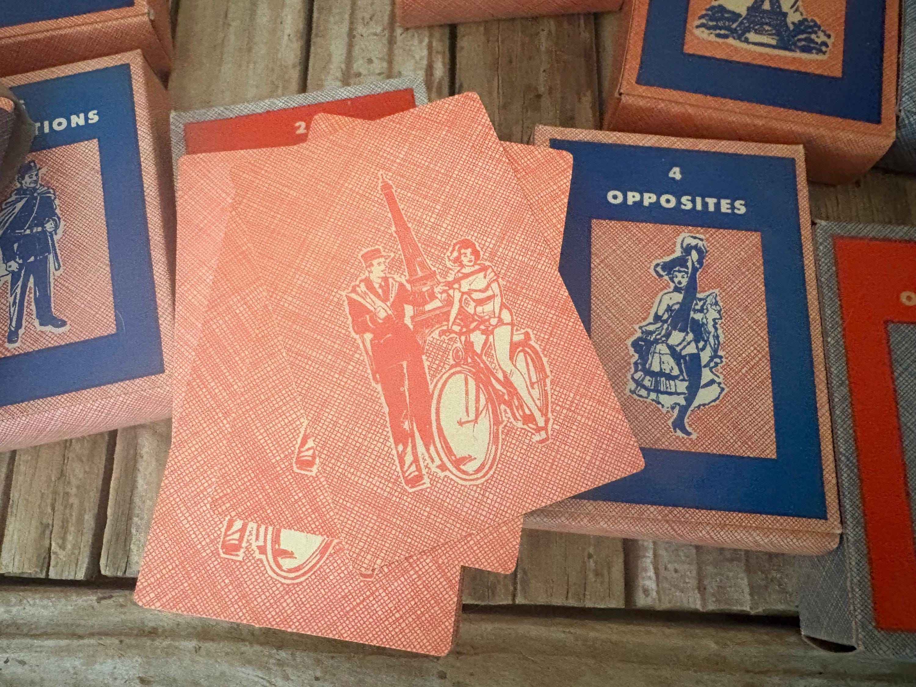 Vintage Mid Century French Language Institute Game of Opposites, Synonyms, Occupations, Animals and Comparisons. In good vintage condition, normal wear due to age and use. The red box is tattered and ripped. The cards and books are in good condition, please see see pictures. A great set to ad to your home, home school or to give as a gift.