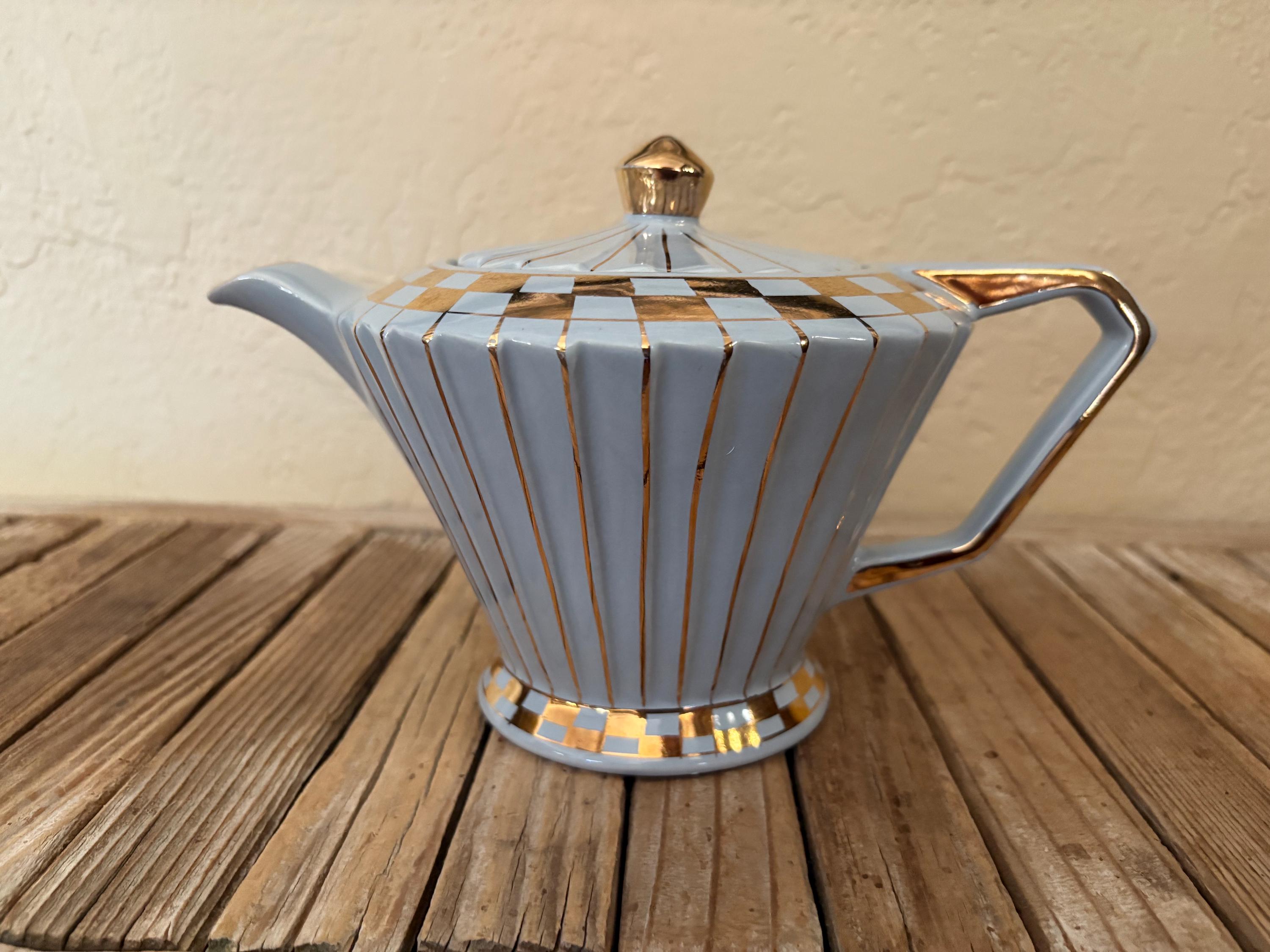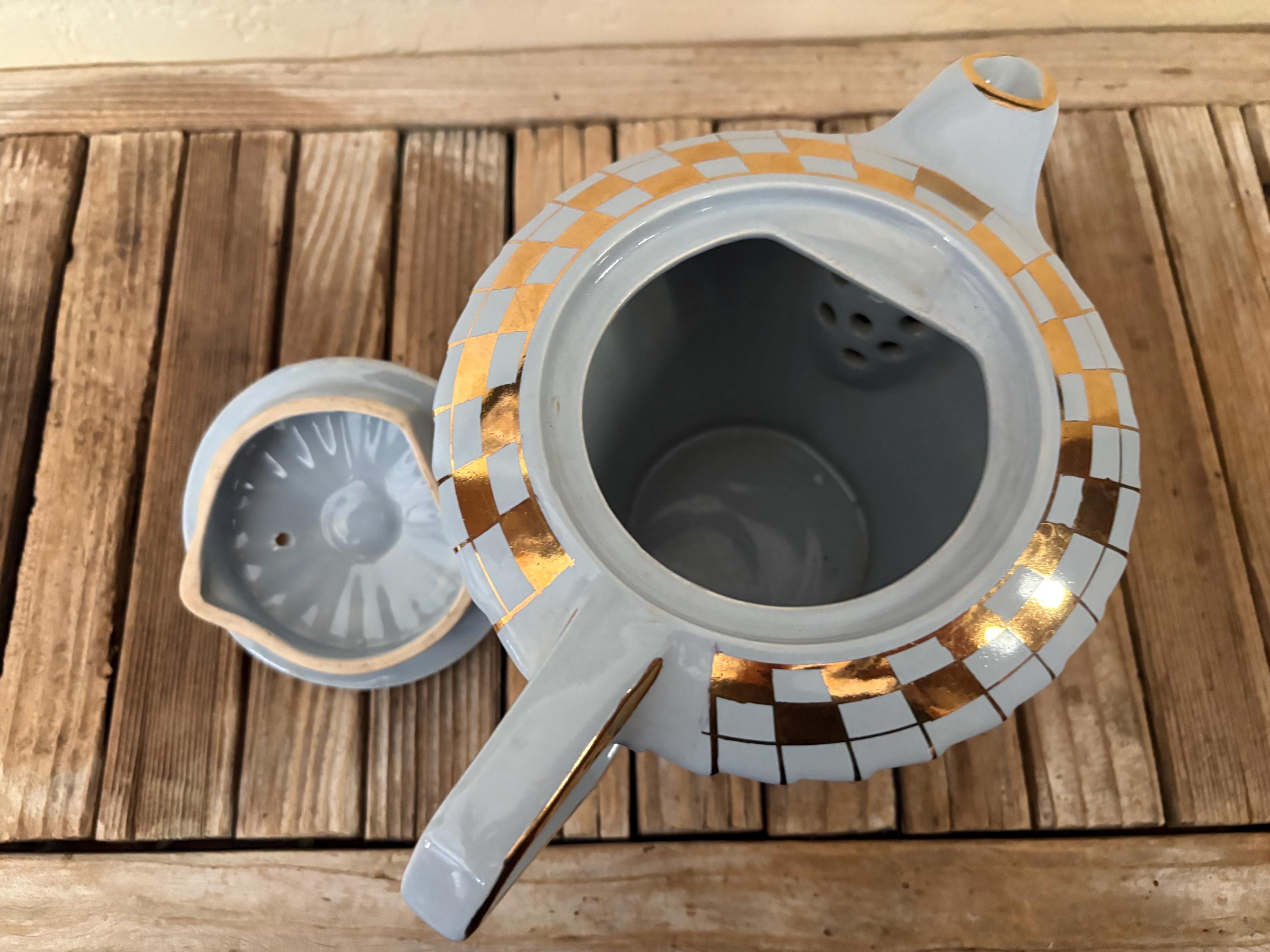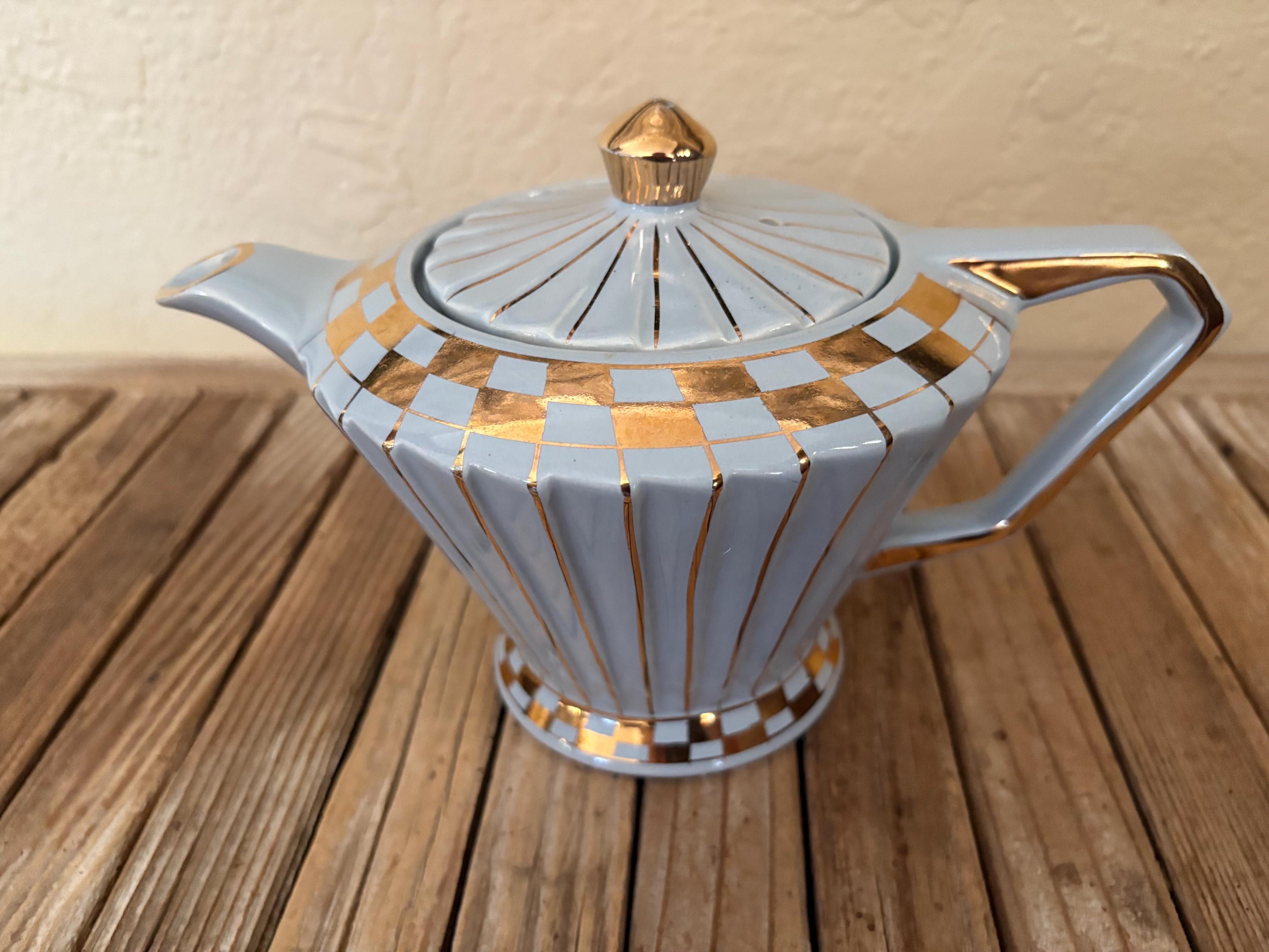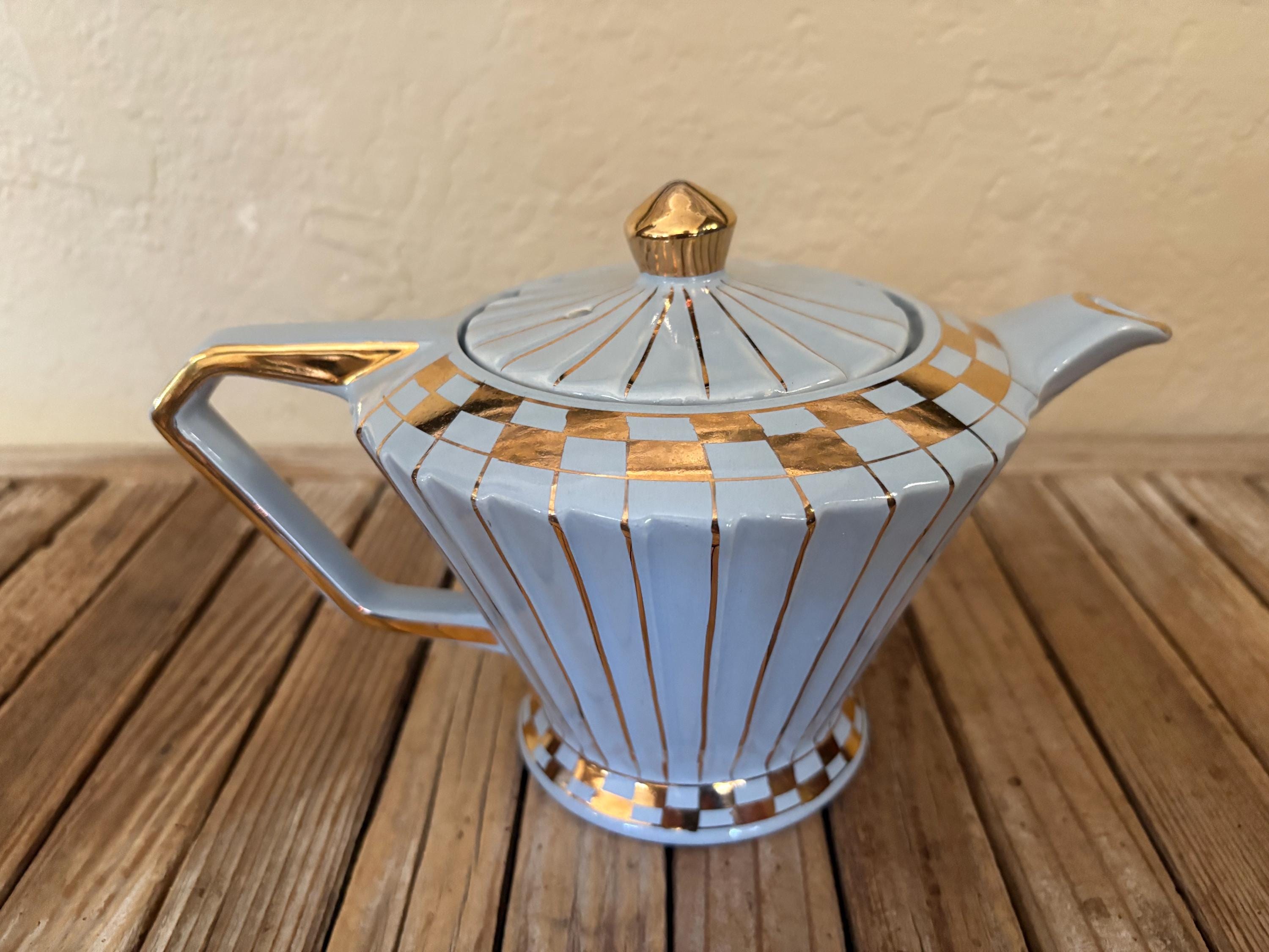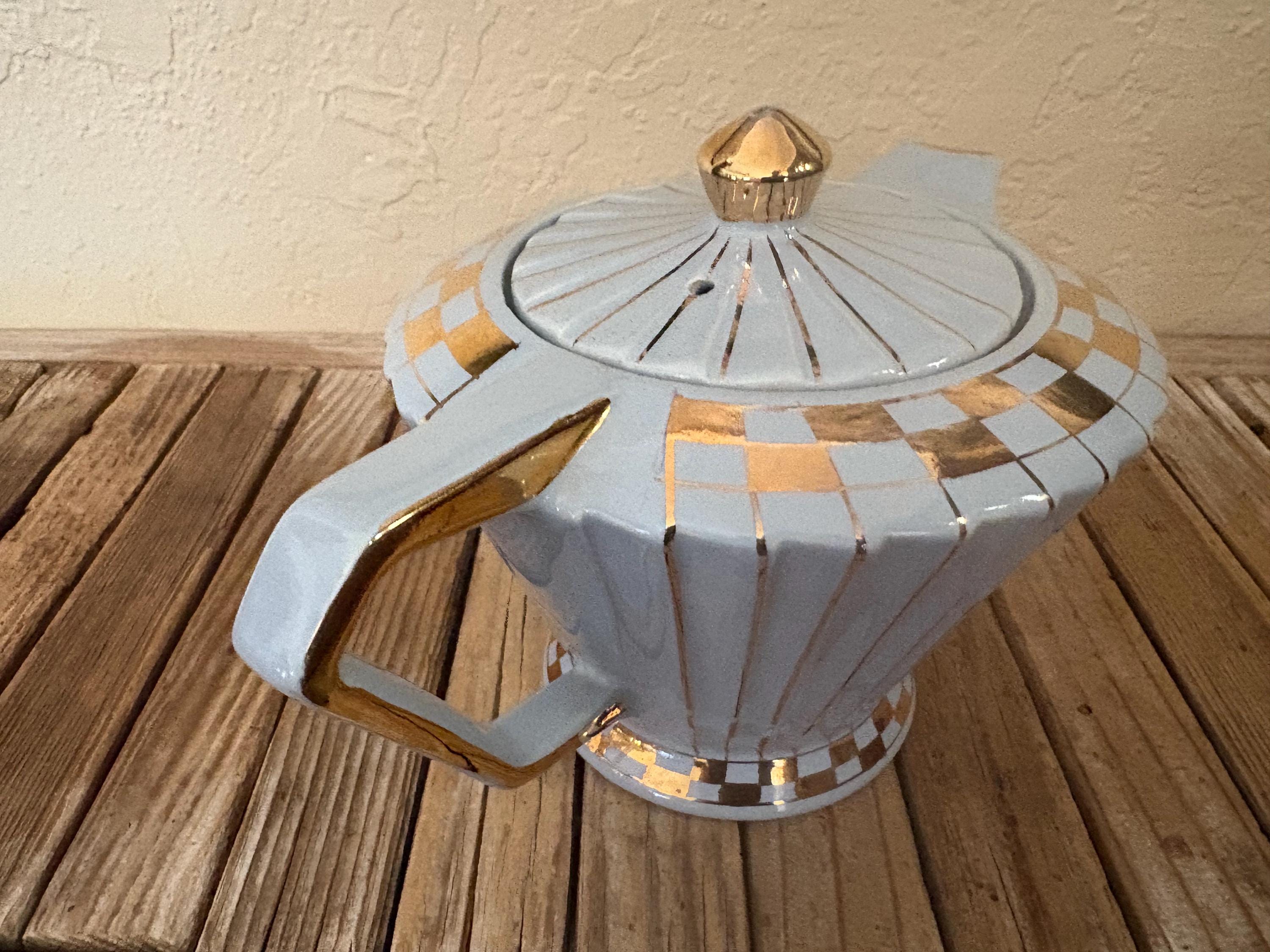 Antique white blue and gold teapot. The teapot is in great condition, normal wear due to age and use. It has a few scrapes and markings to it. There are no chips or cracks, please see pictures. A beautiful piece to add to a collection, home or to give as a gift.