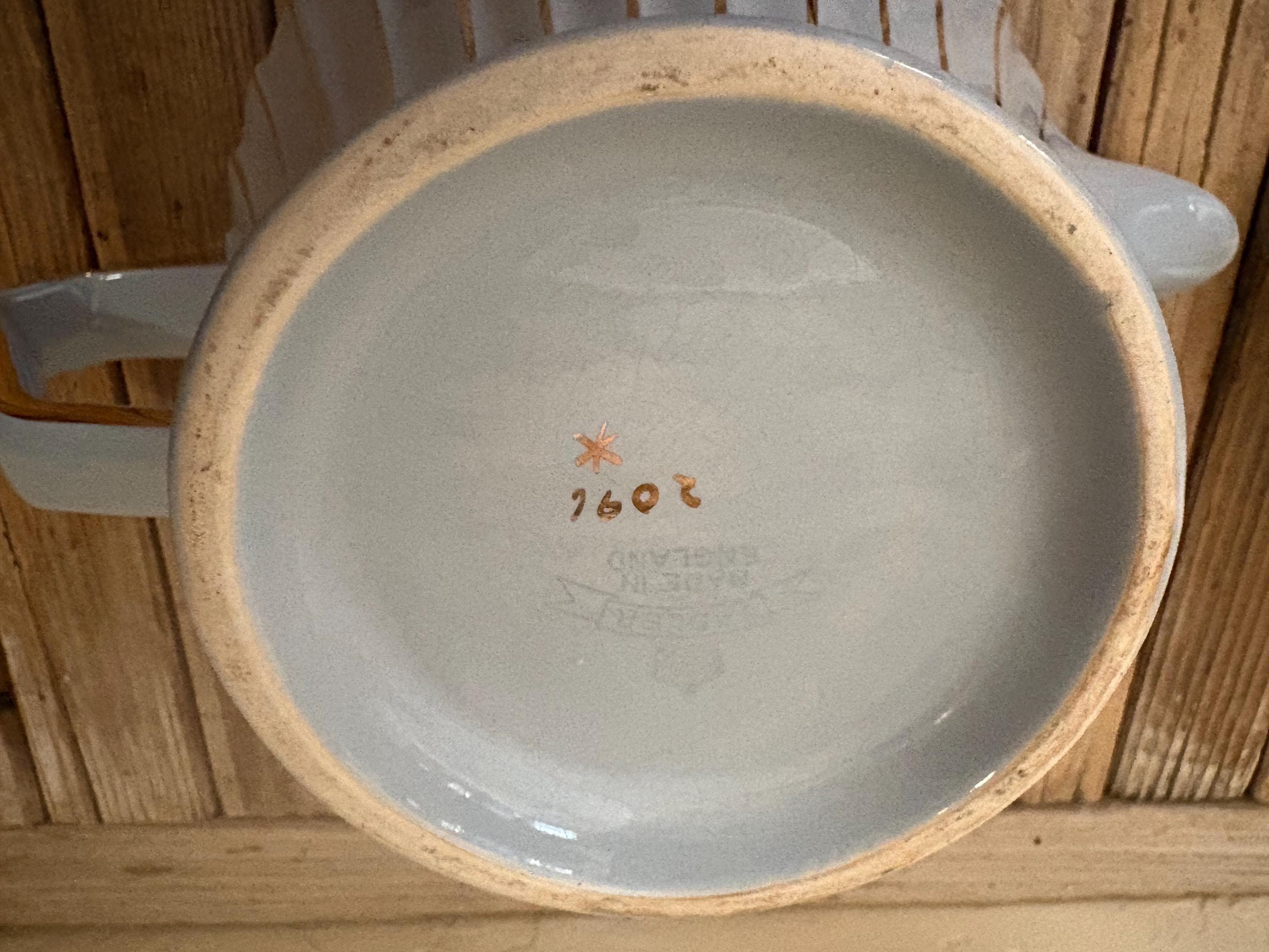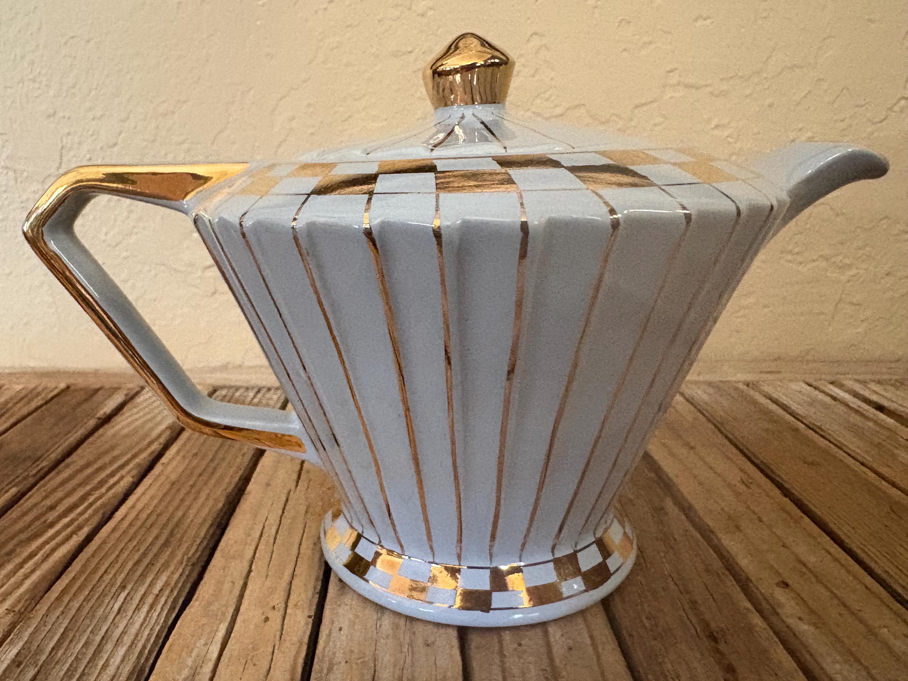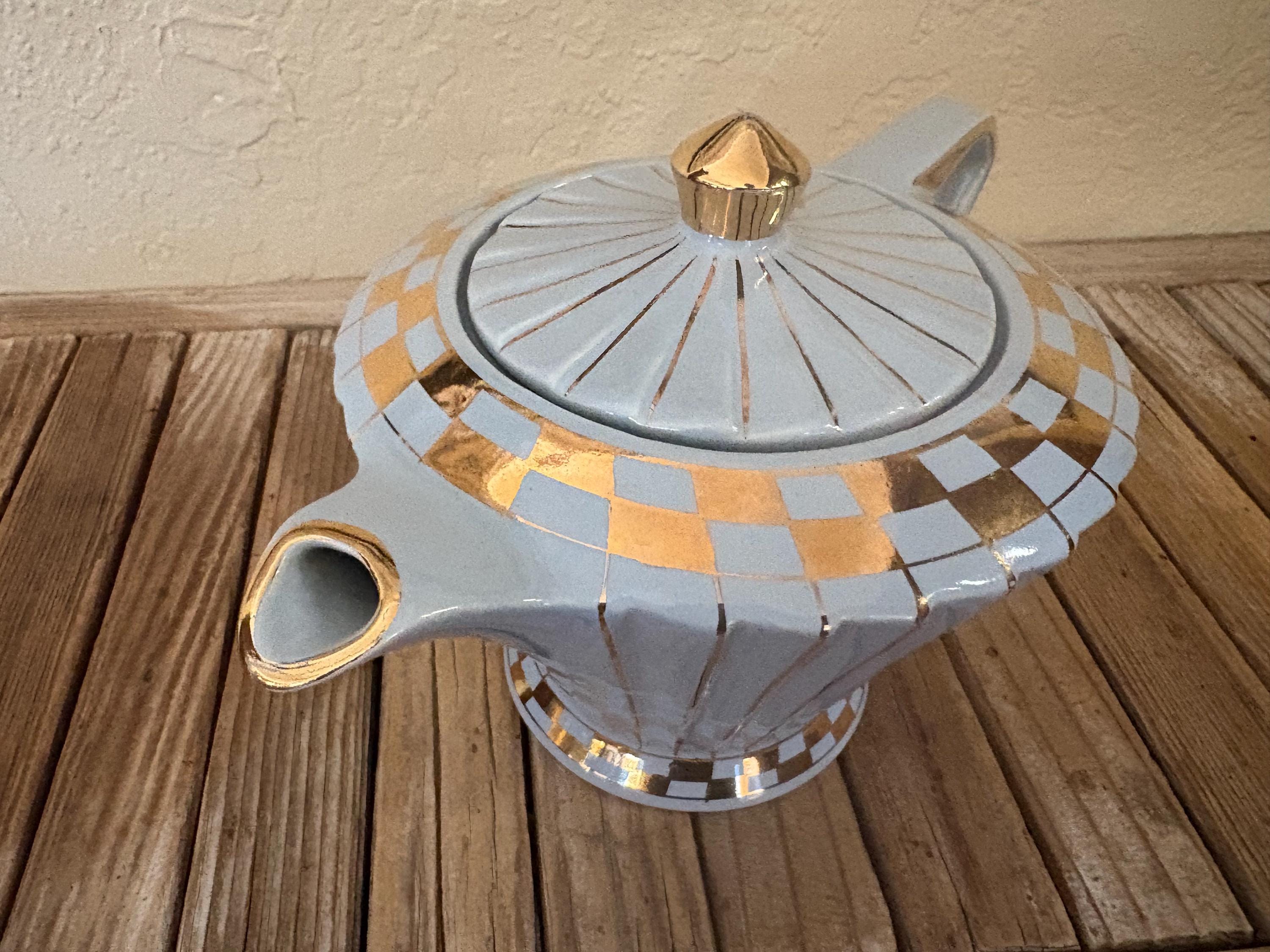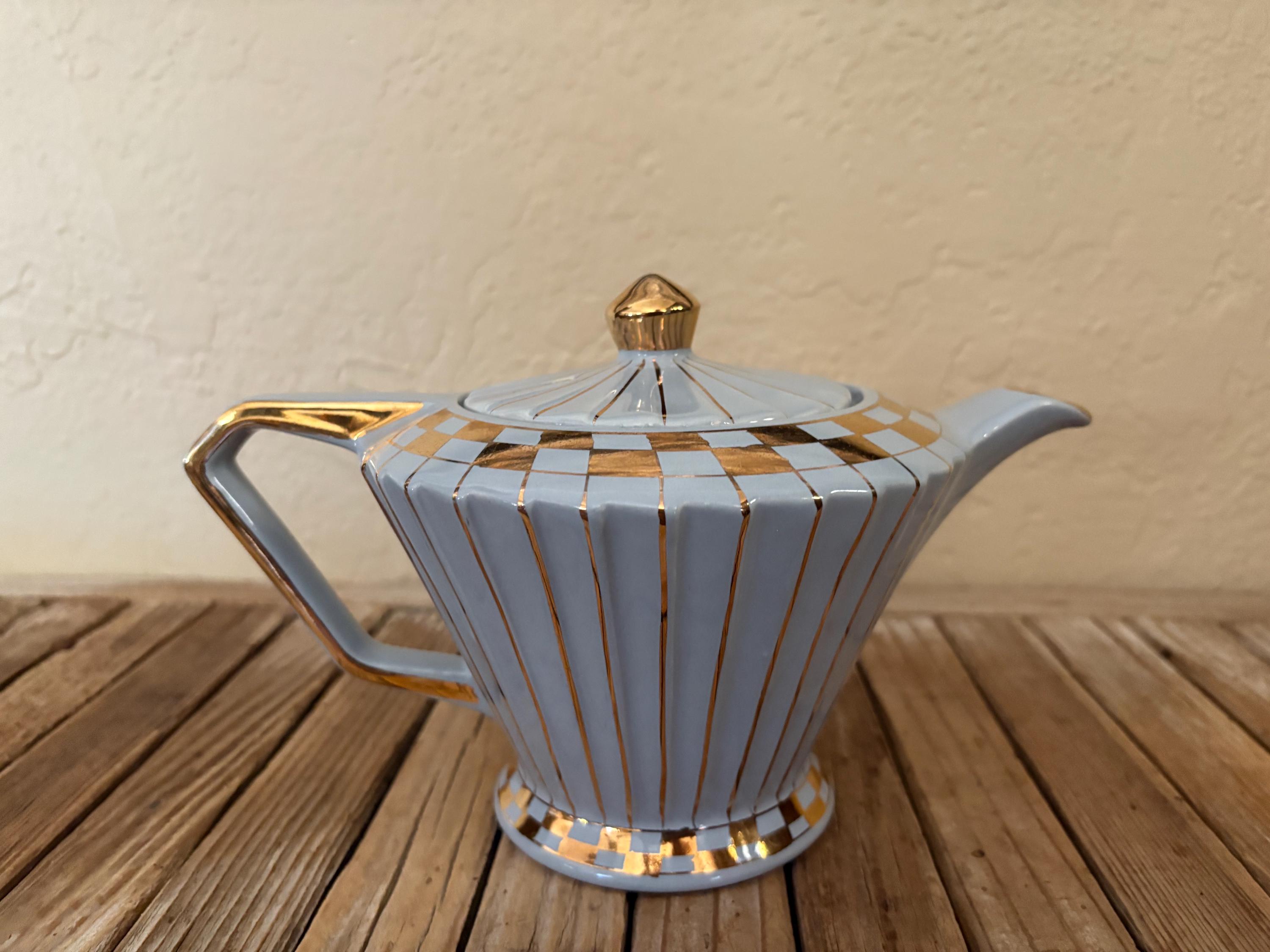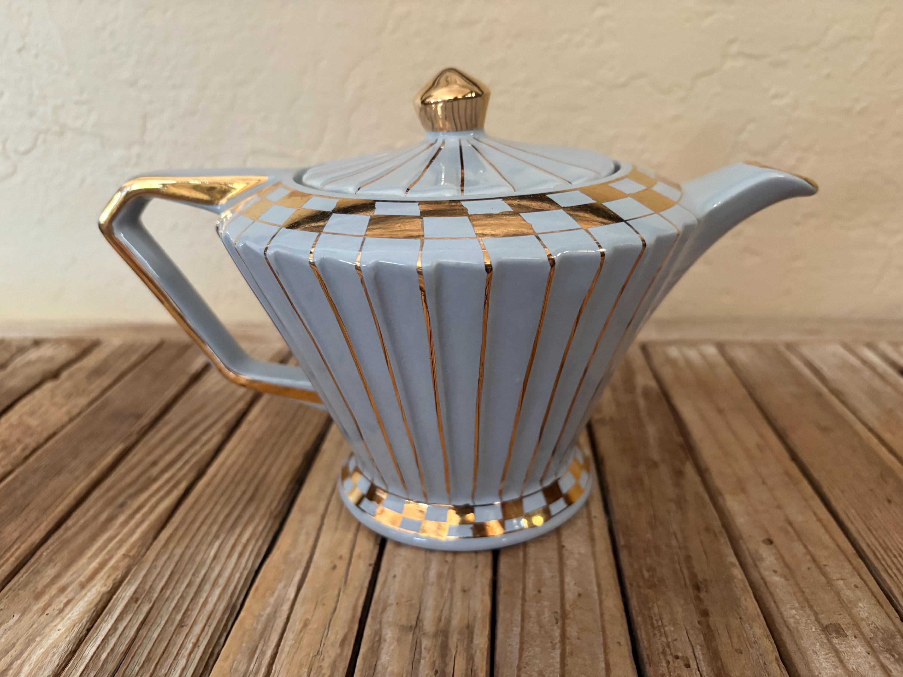 Antique white blue and gold teapot. The teapot is in great condition, normal wear due to age and use. It has a few scrapes and markings to it. There are no chips or cracks, please see pictures. A beautiful piece to add to a collection, home or to give as a gift.