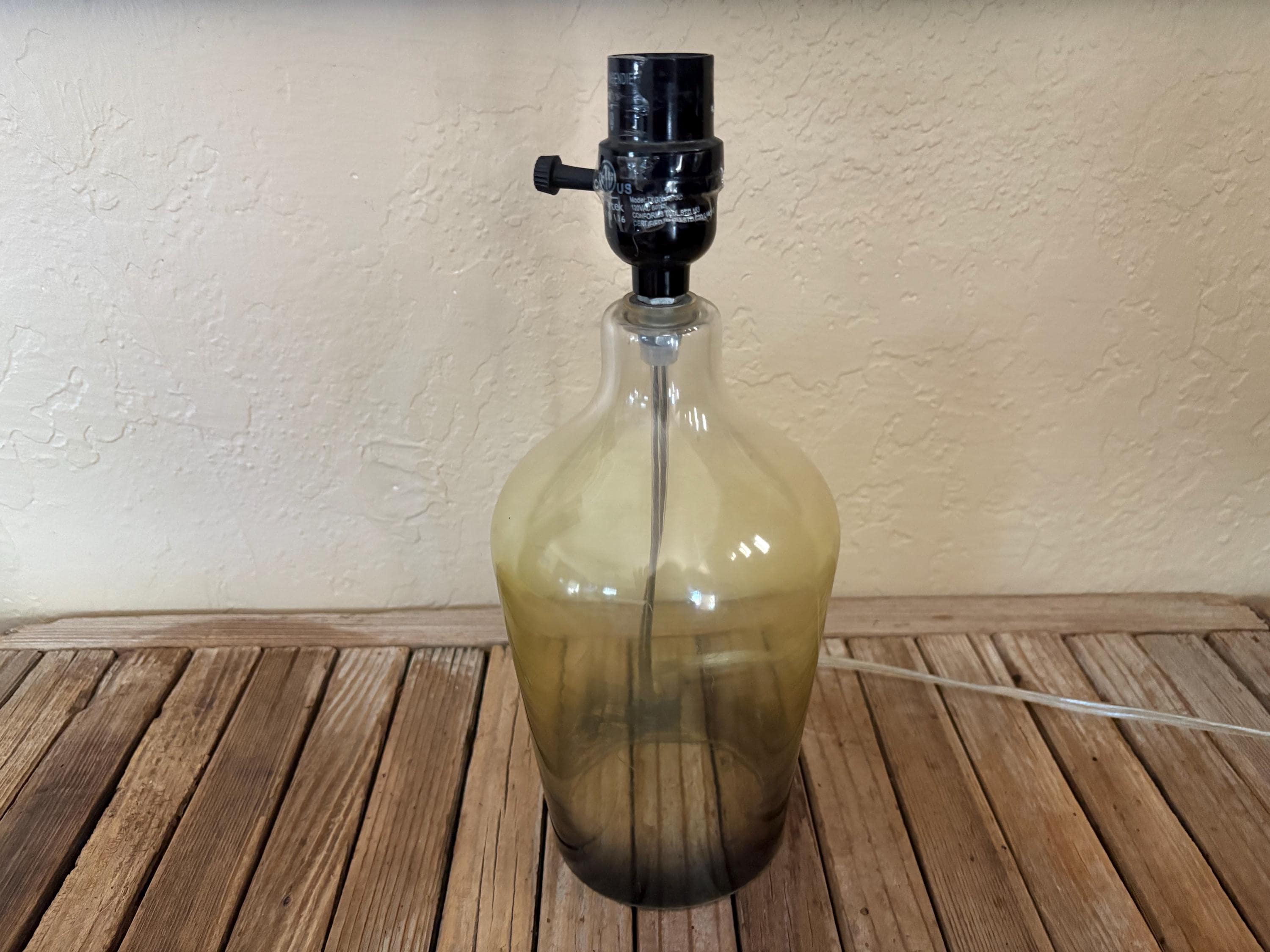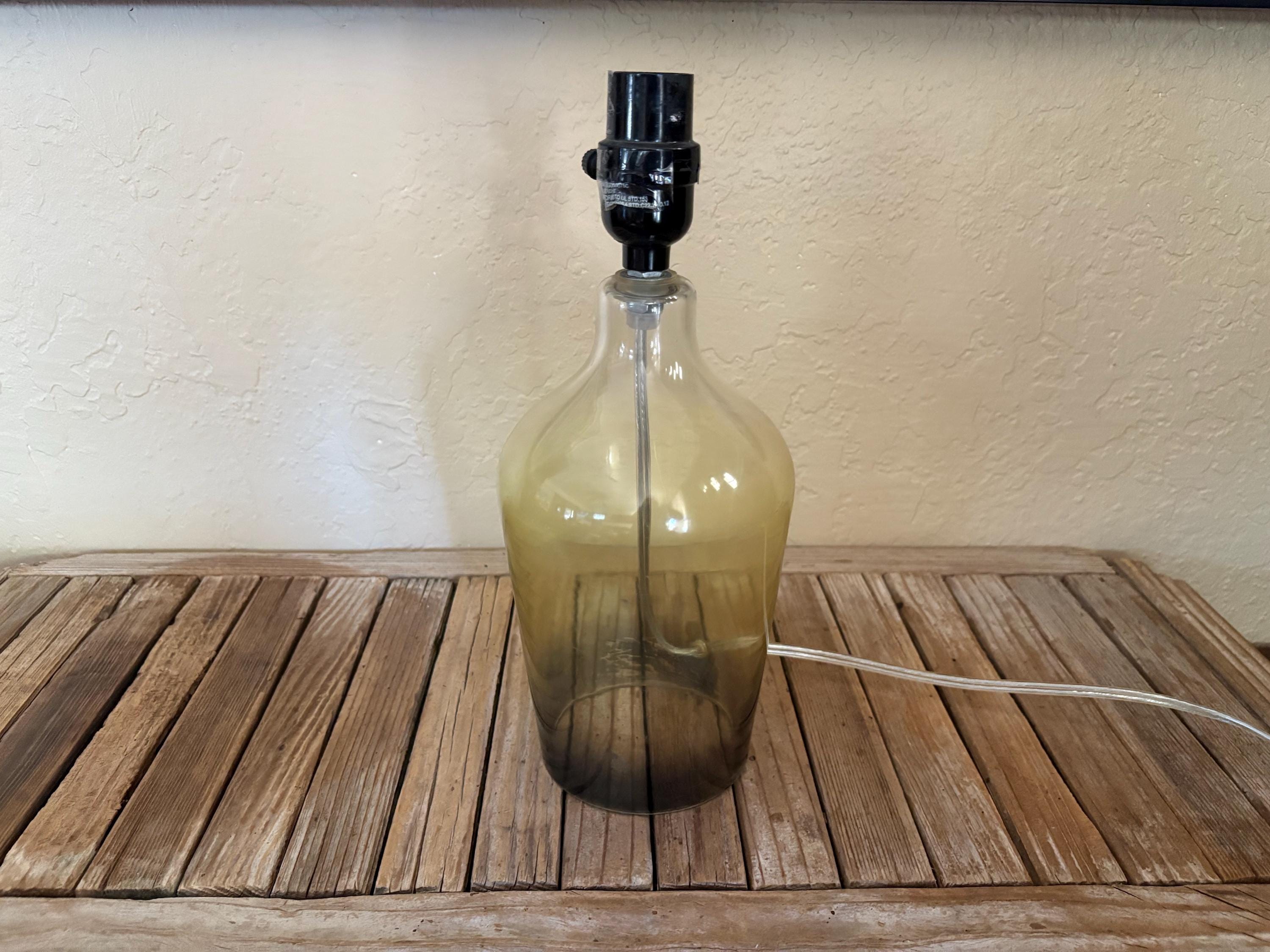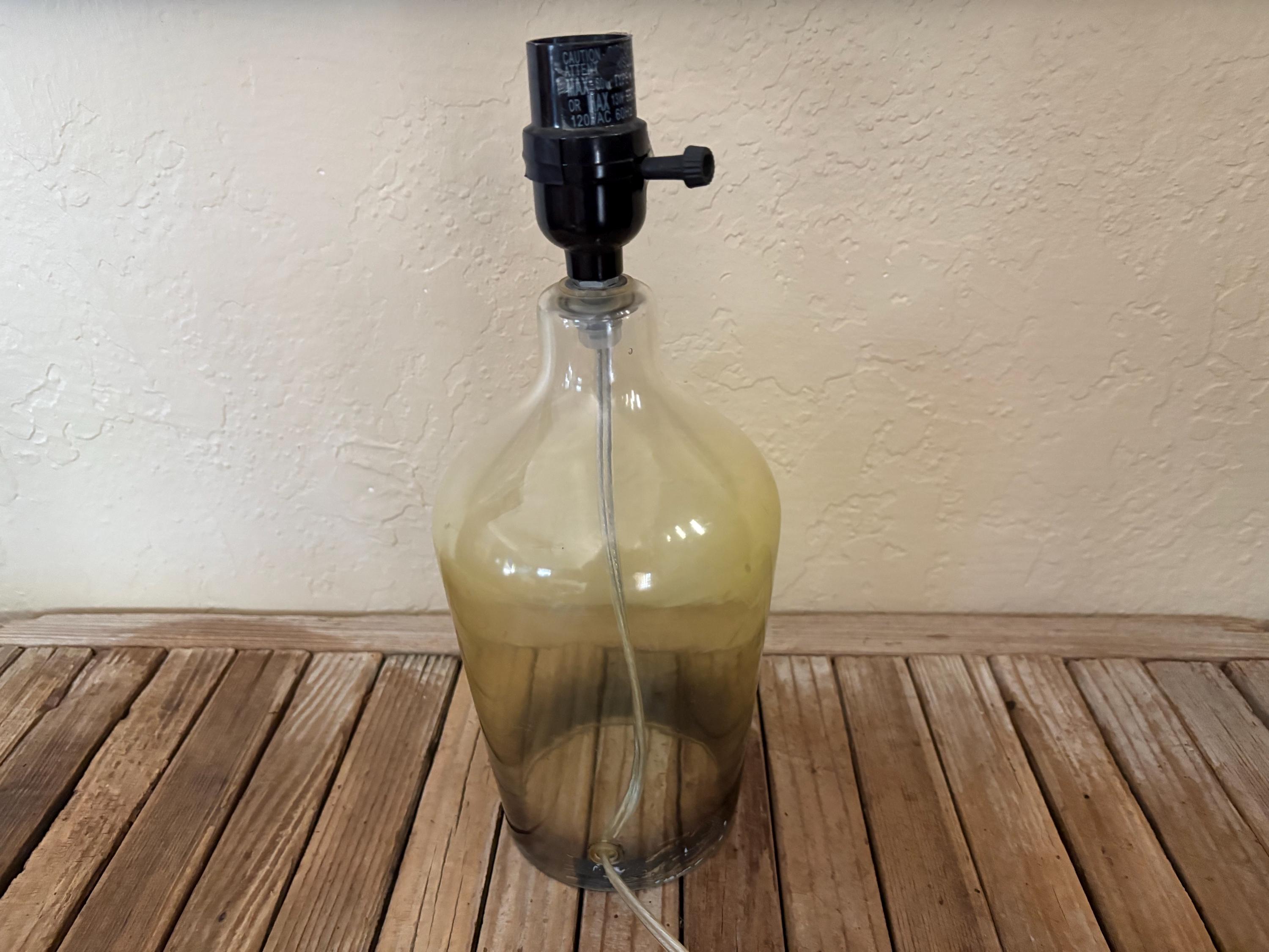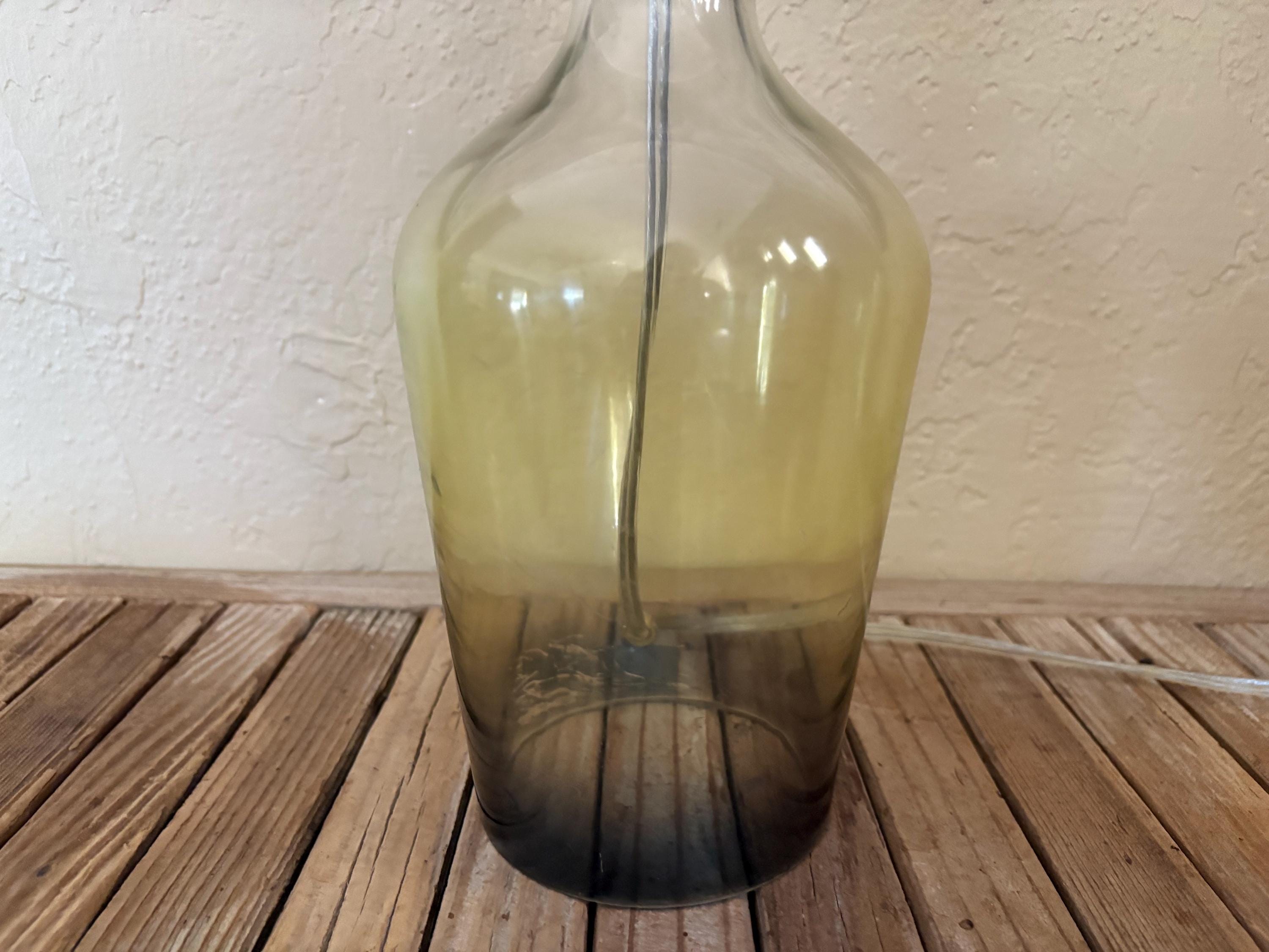 Vintage green demijohn bottle lamp. The bottle has surface scrapes, markings and discolorations throughout, please see pictures. In good working condition, cord intact and functional. A great, unique lamp to add to your home.