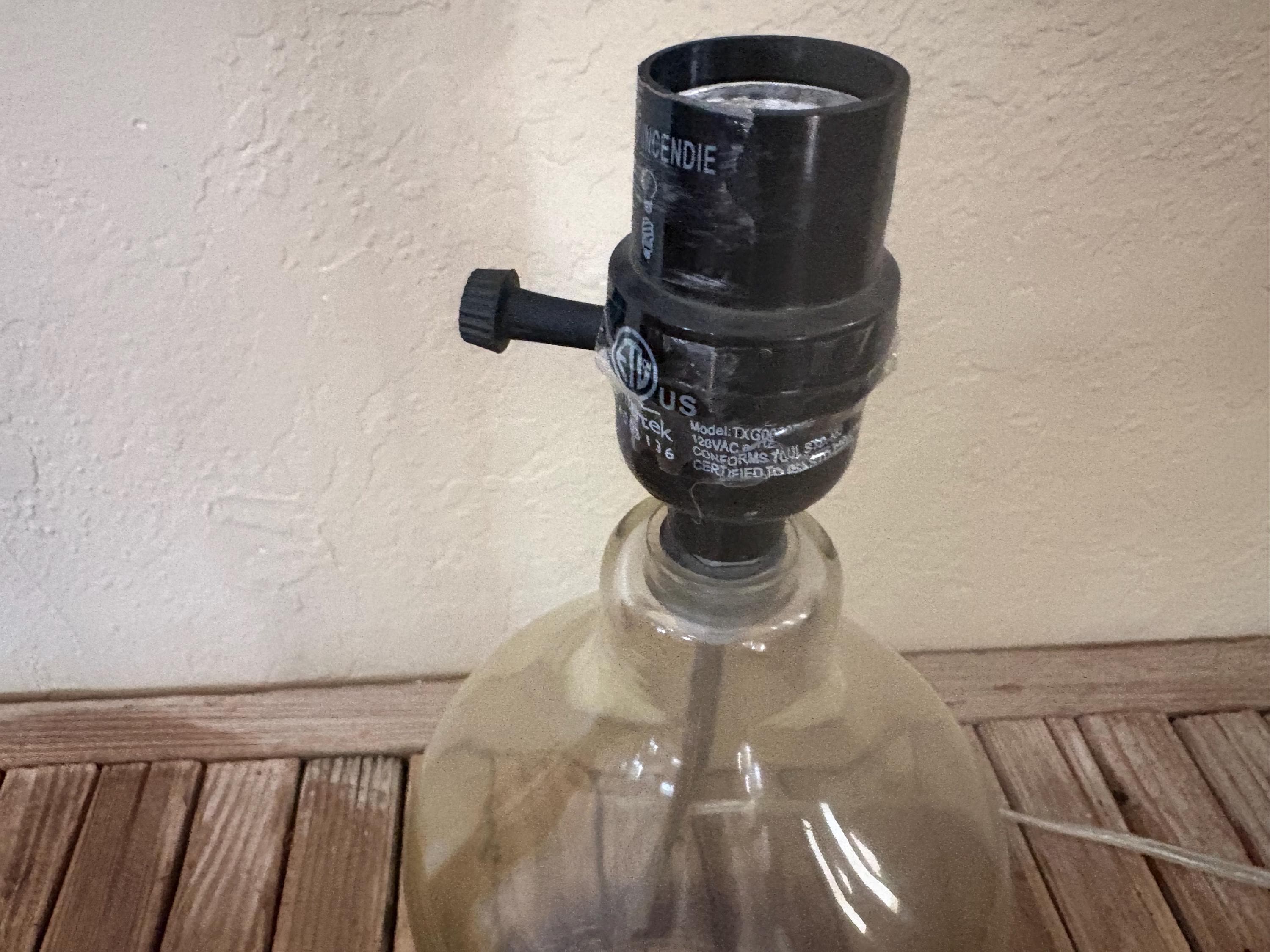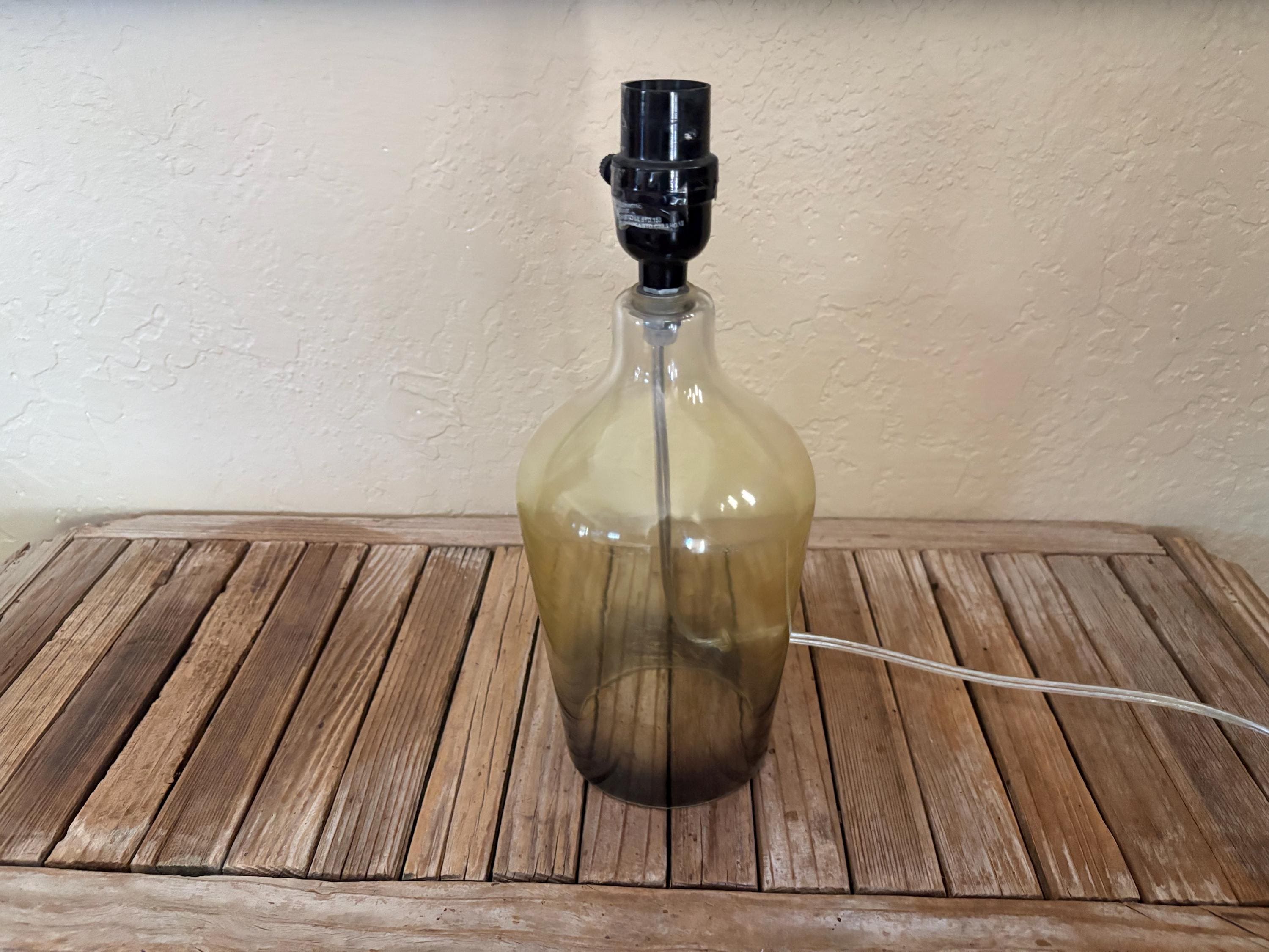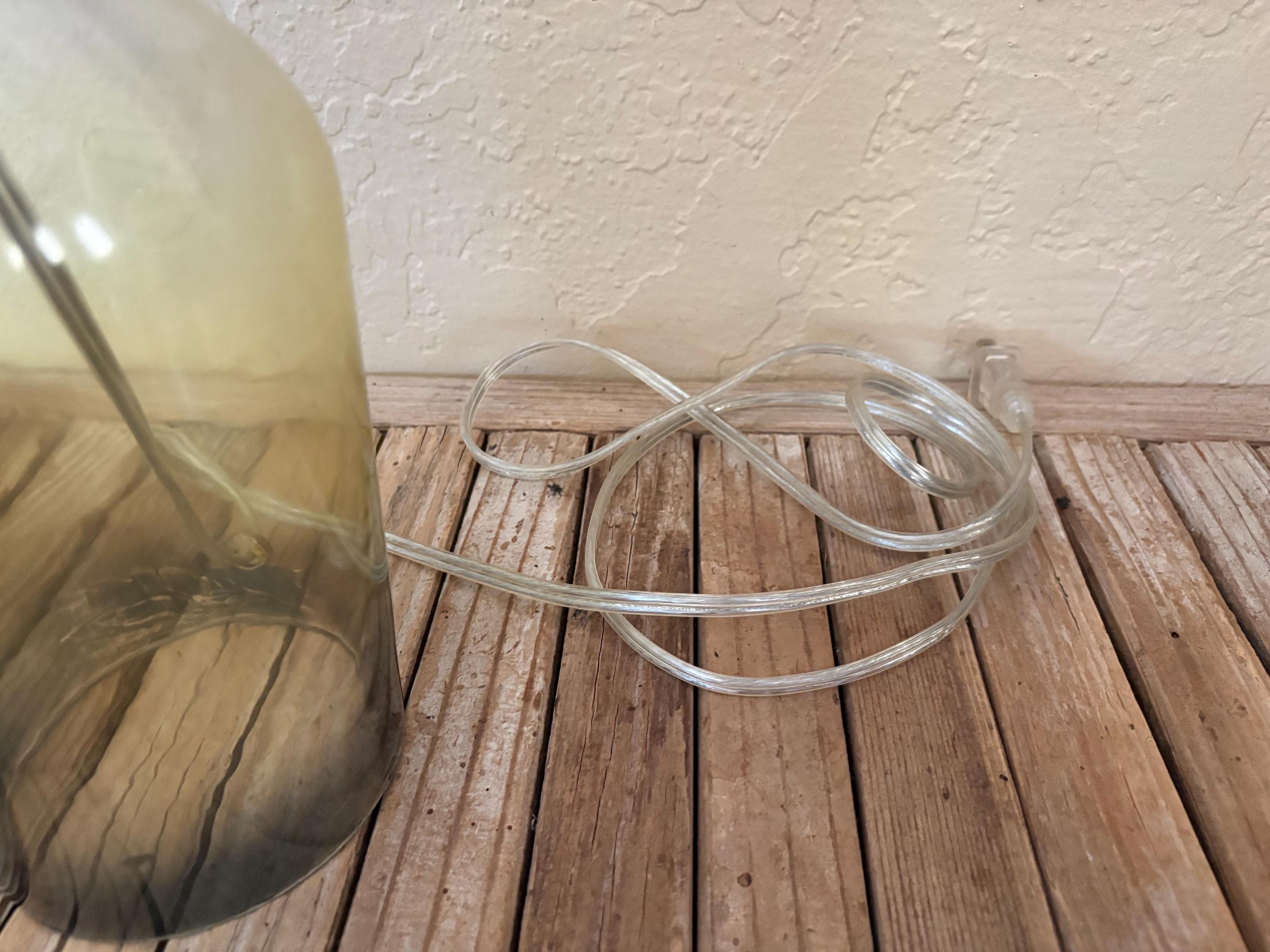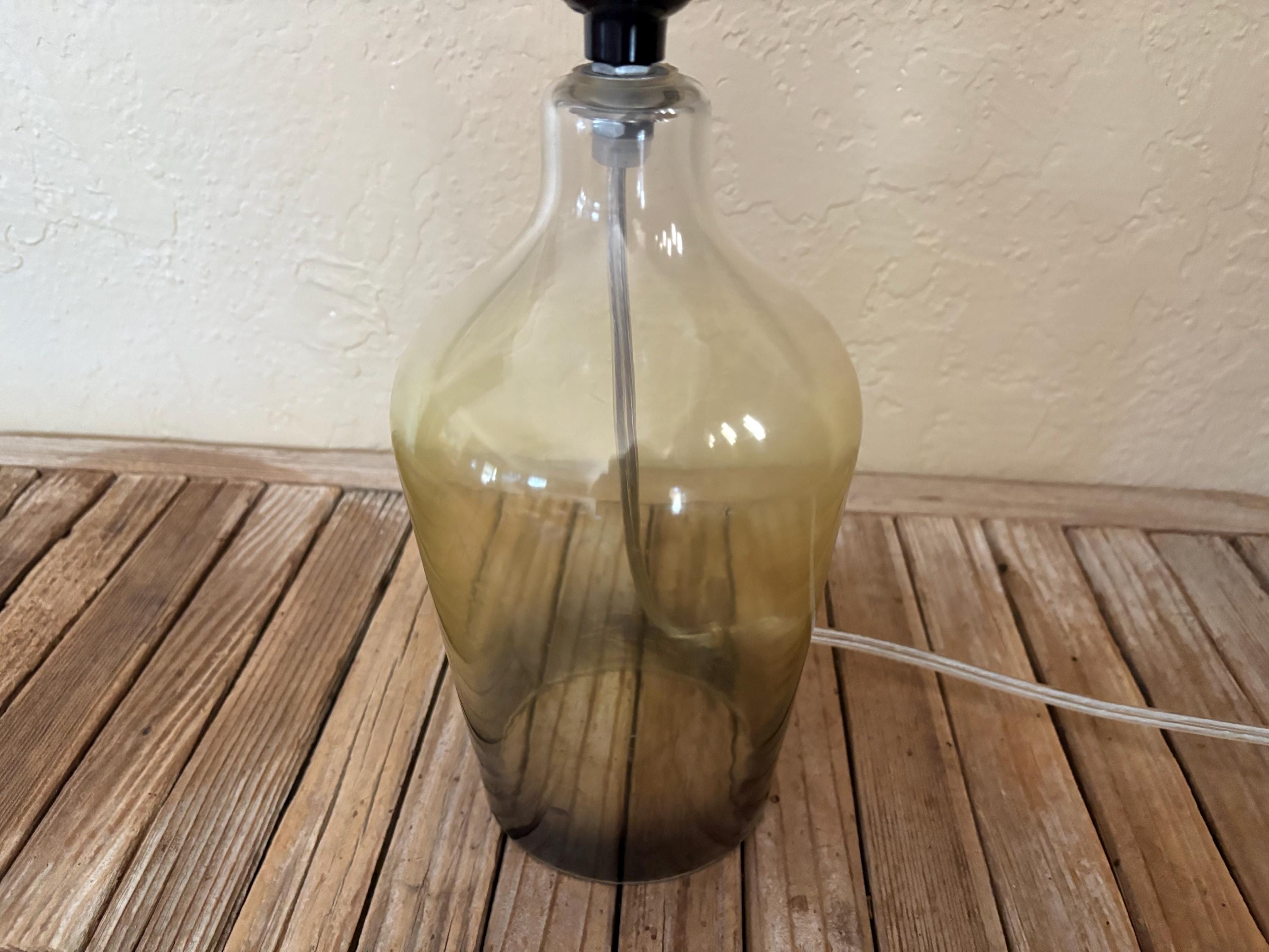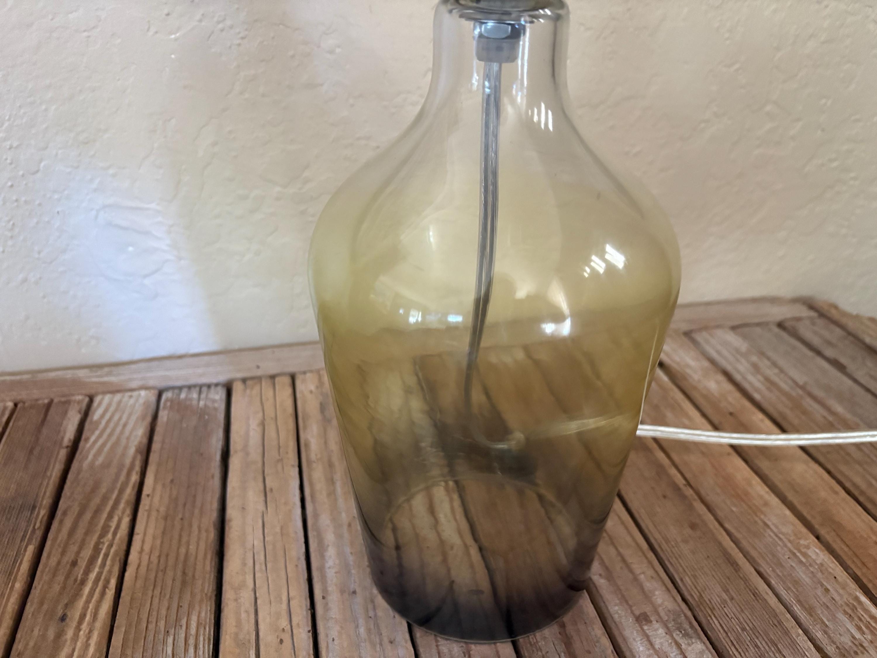 Vintage green demijohn bottle lamp. The bottle has surface scrapes, markings and discolorations throughout, please see pictures. In good working condition, cord intact and functional. A great, unique lamp to add to your home.