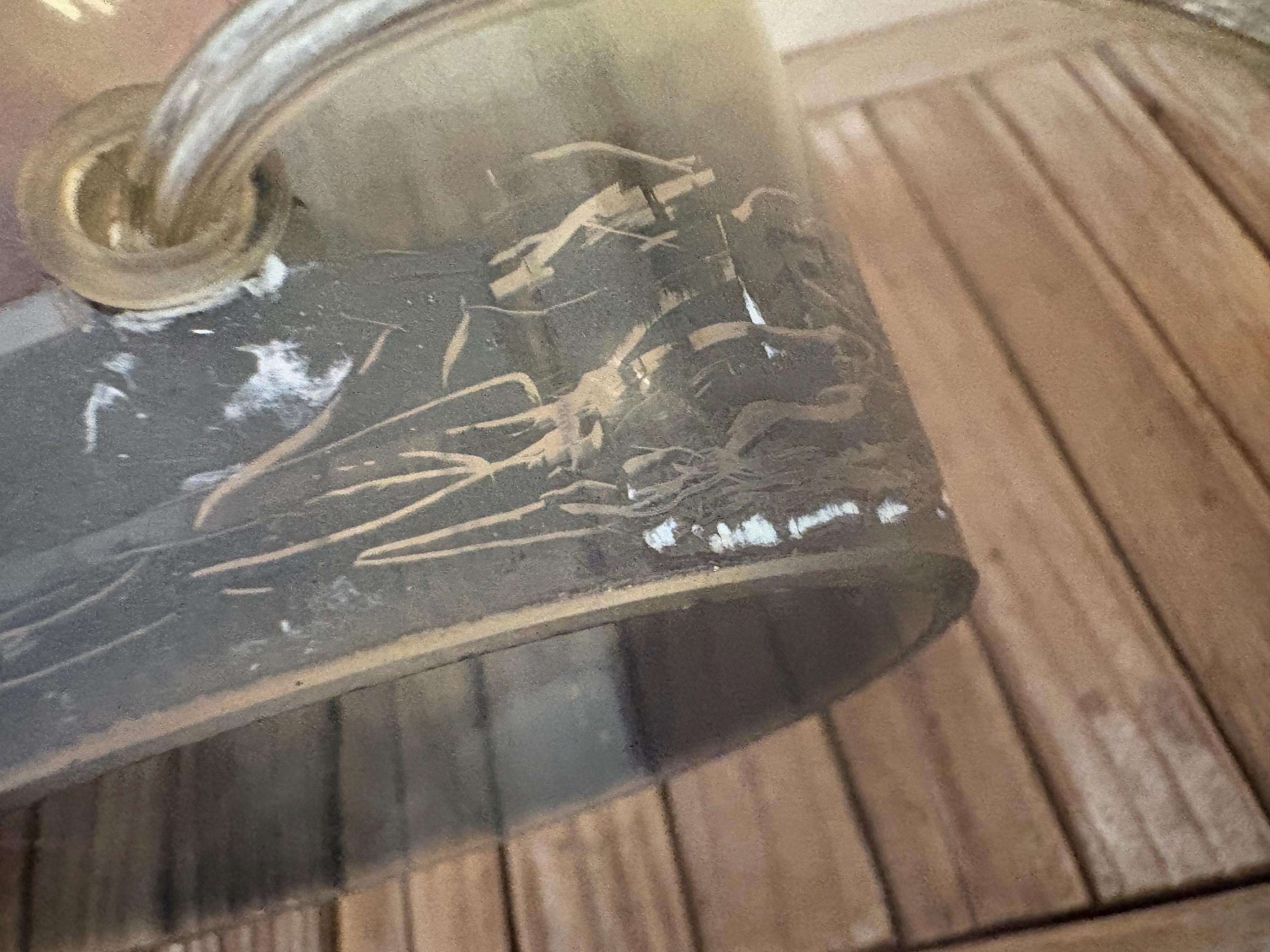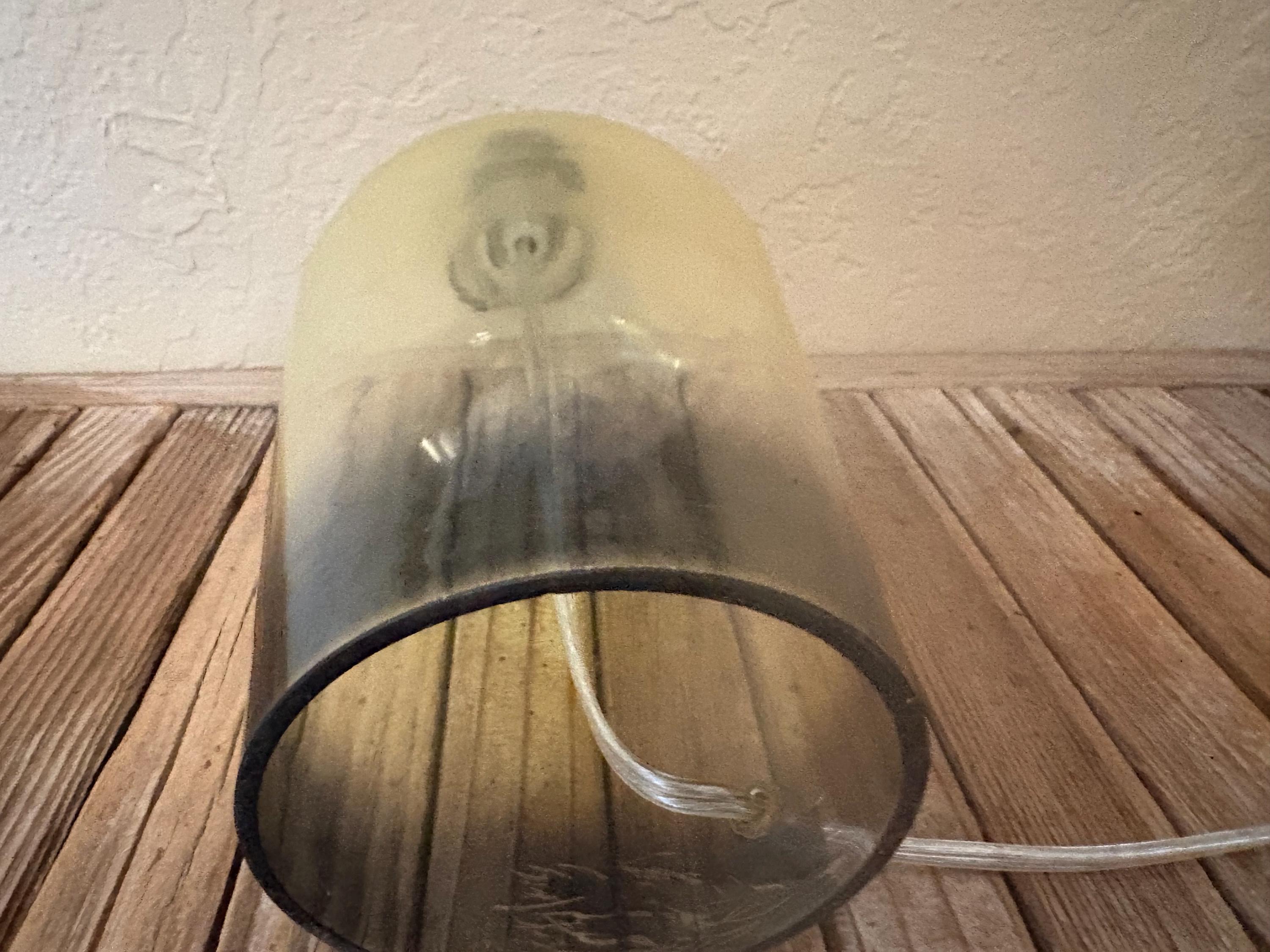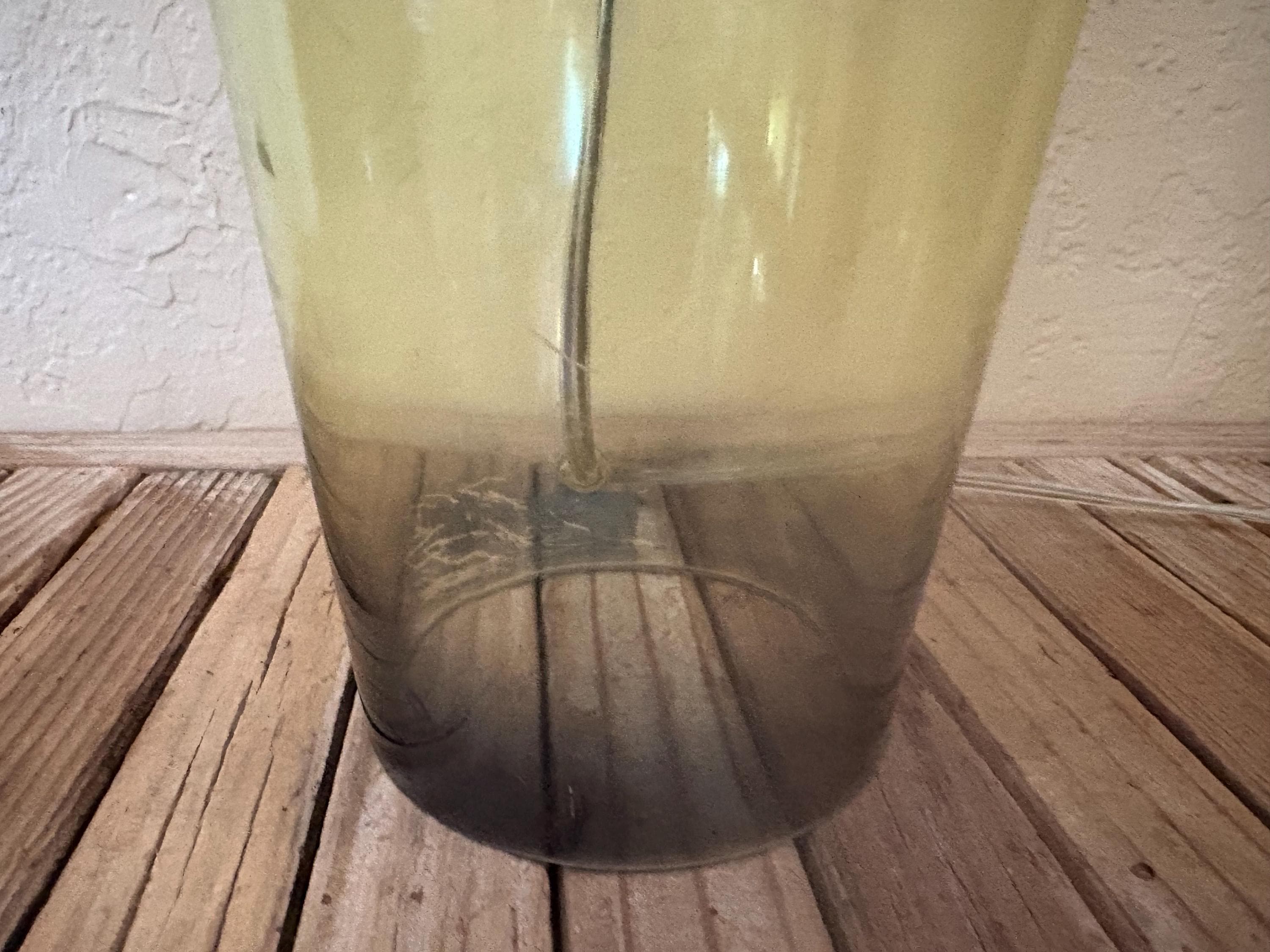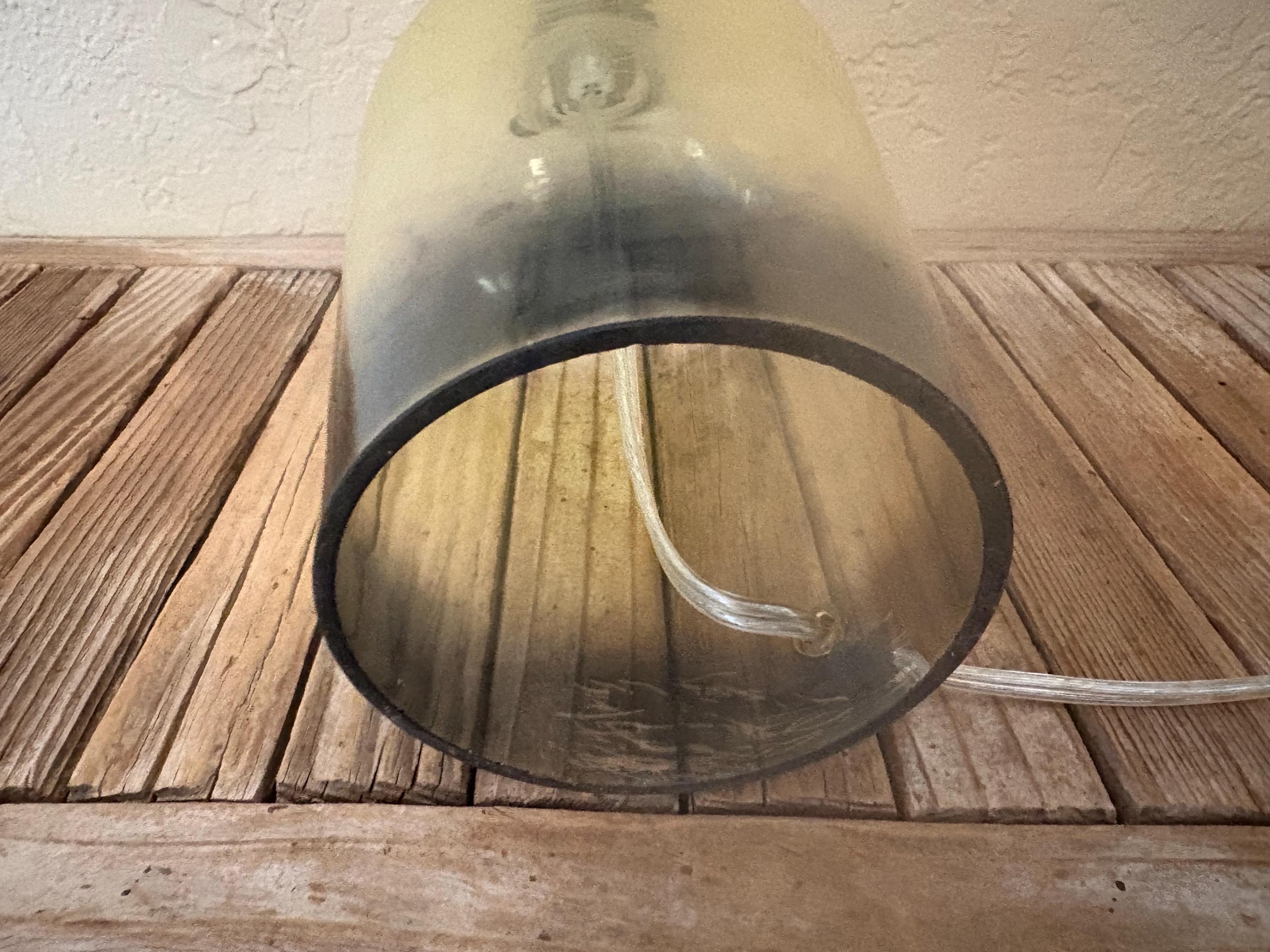 Vintage green demijohn bottle lamp. The bottle has surface scrapes, markings and discolorations throughout, please see pictures. In good working condition, cord intact and functional. A great, unique lamp to add to your home.