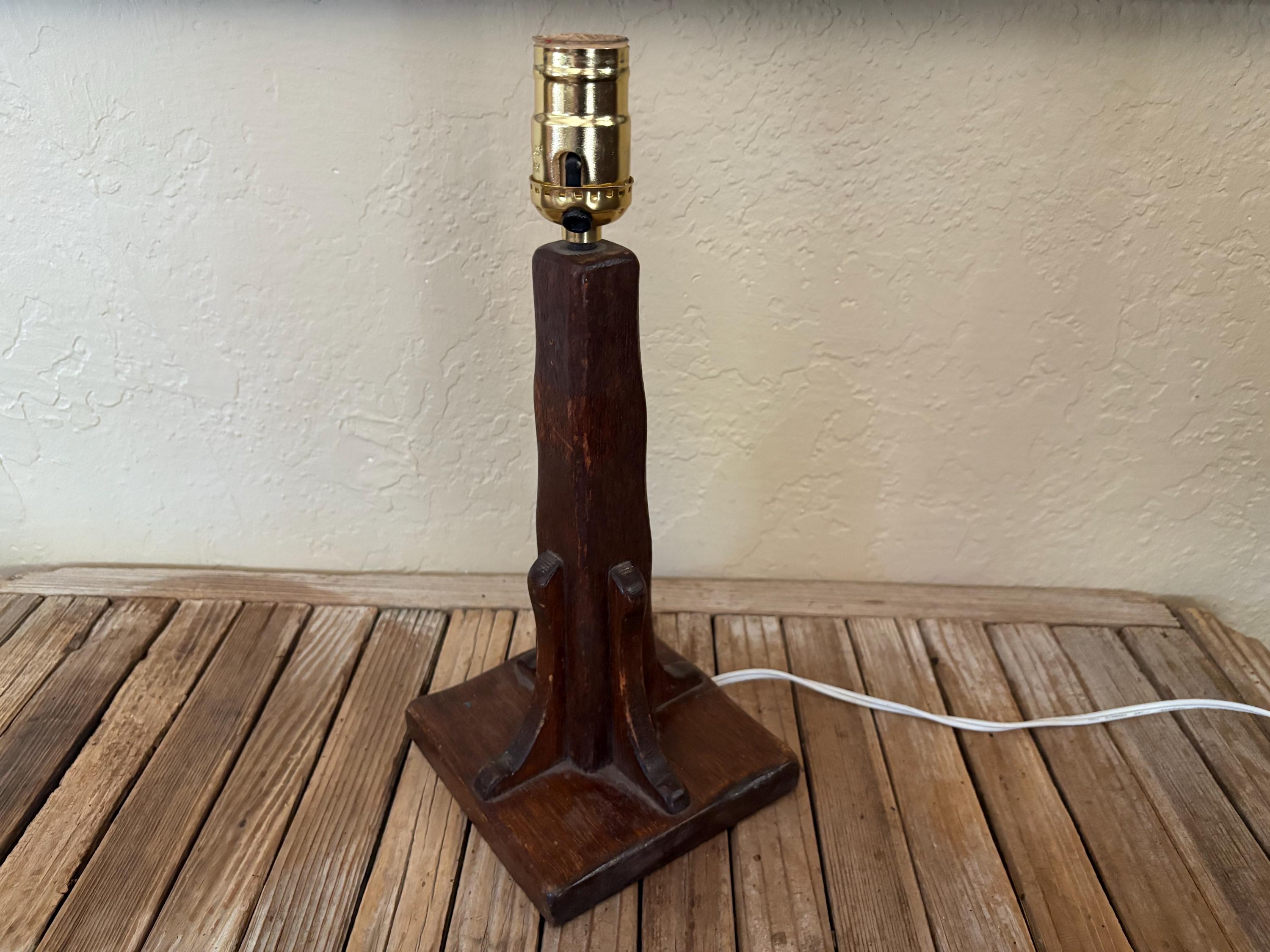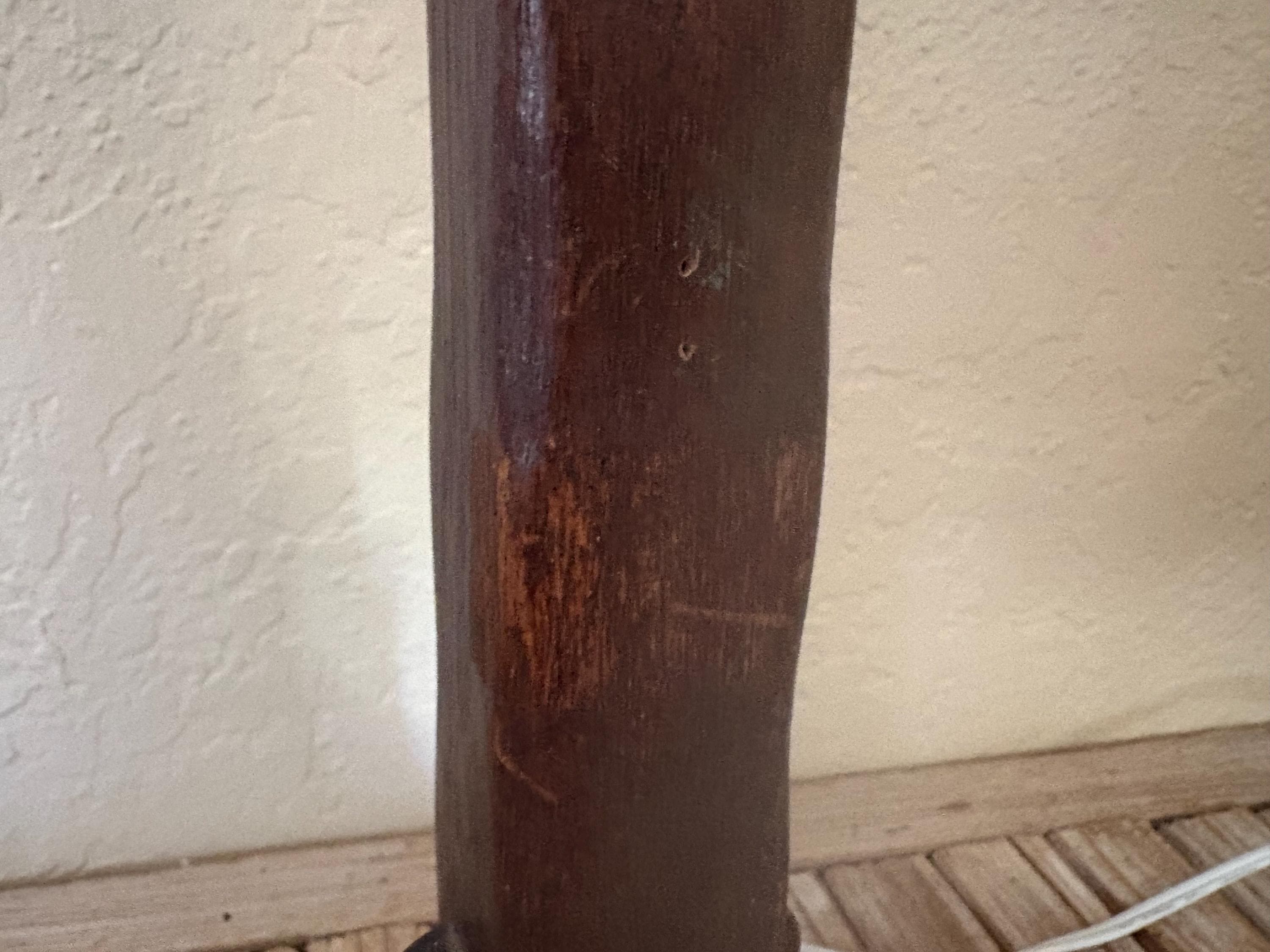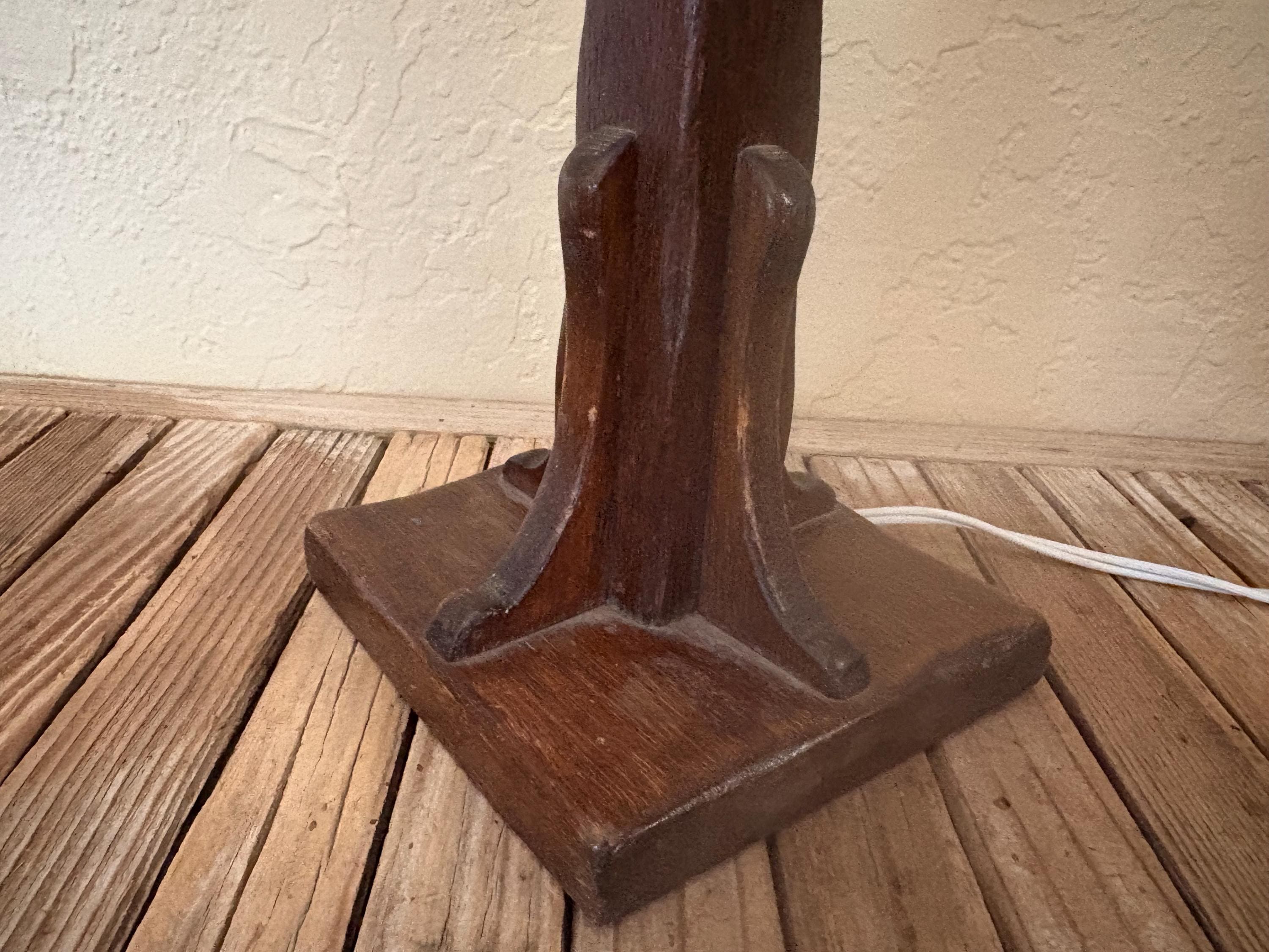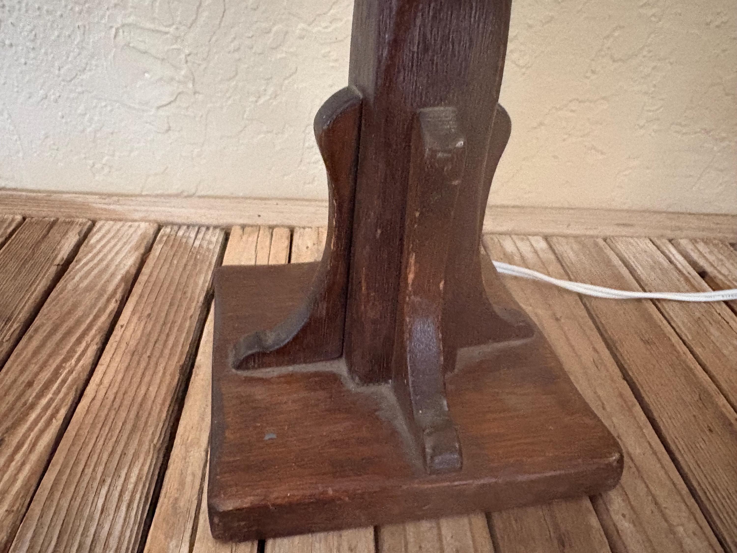 Vintage wood lamp. In good condition, normal wear due to age and use. The wood has some surface scrapes and markings to the wood, please see pictures. The lamp has been tested and it works. A beautiful piece to add to your home.