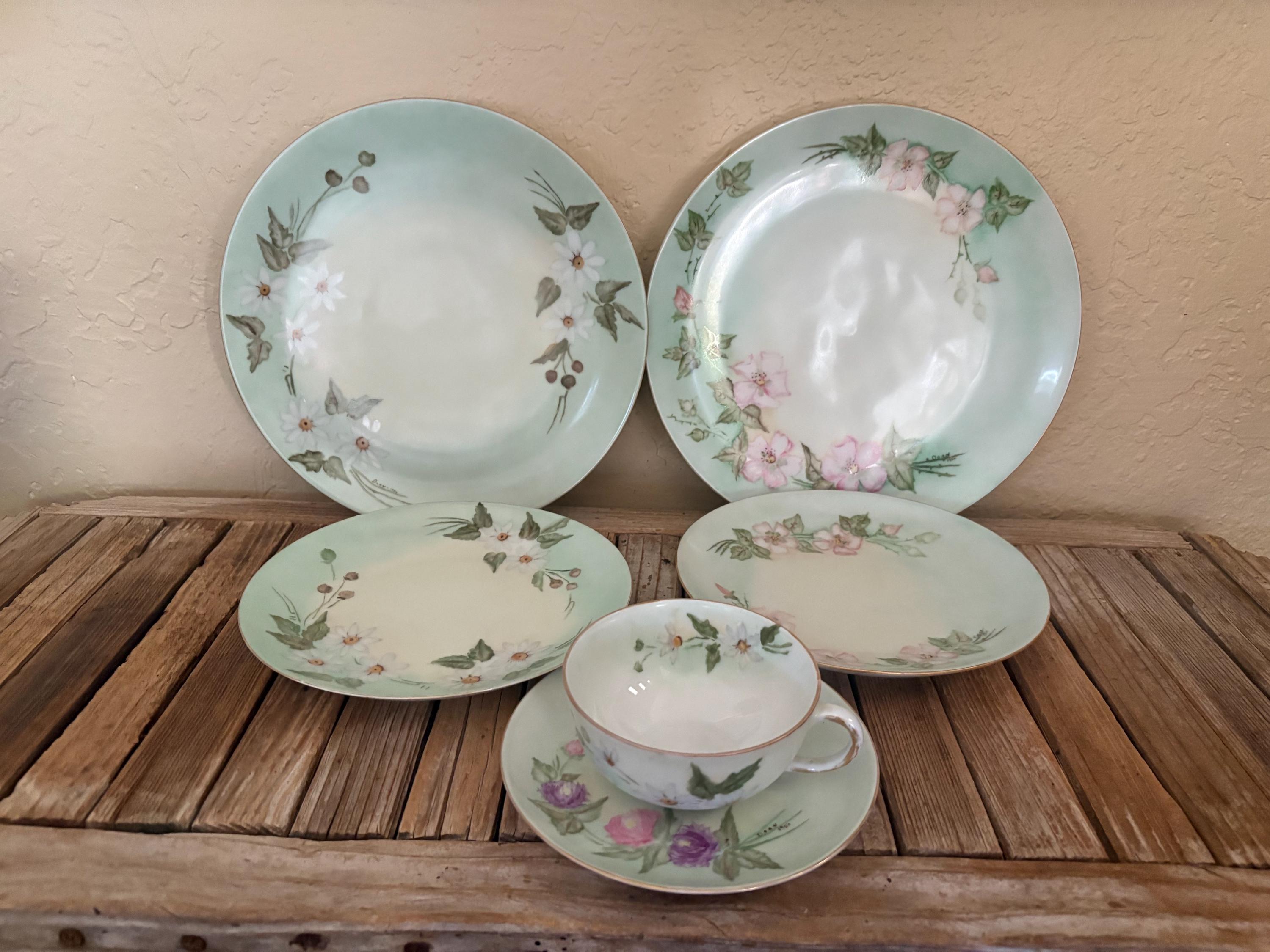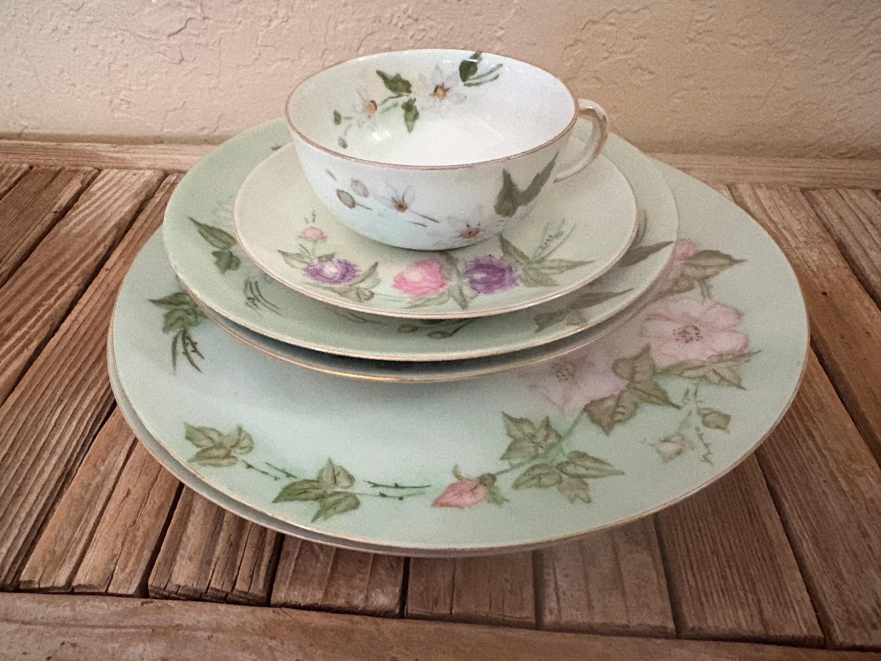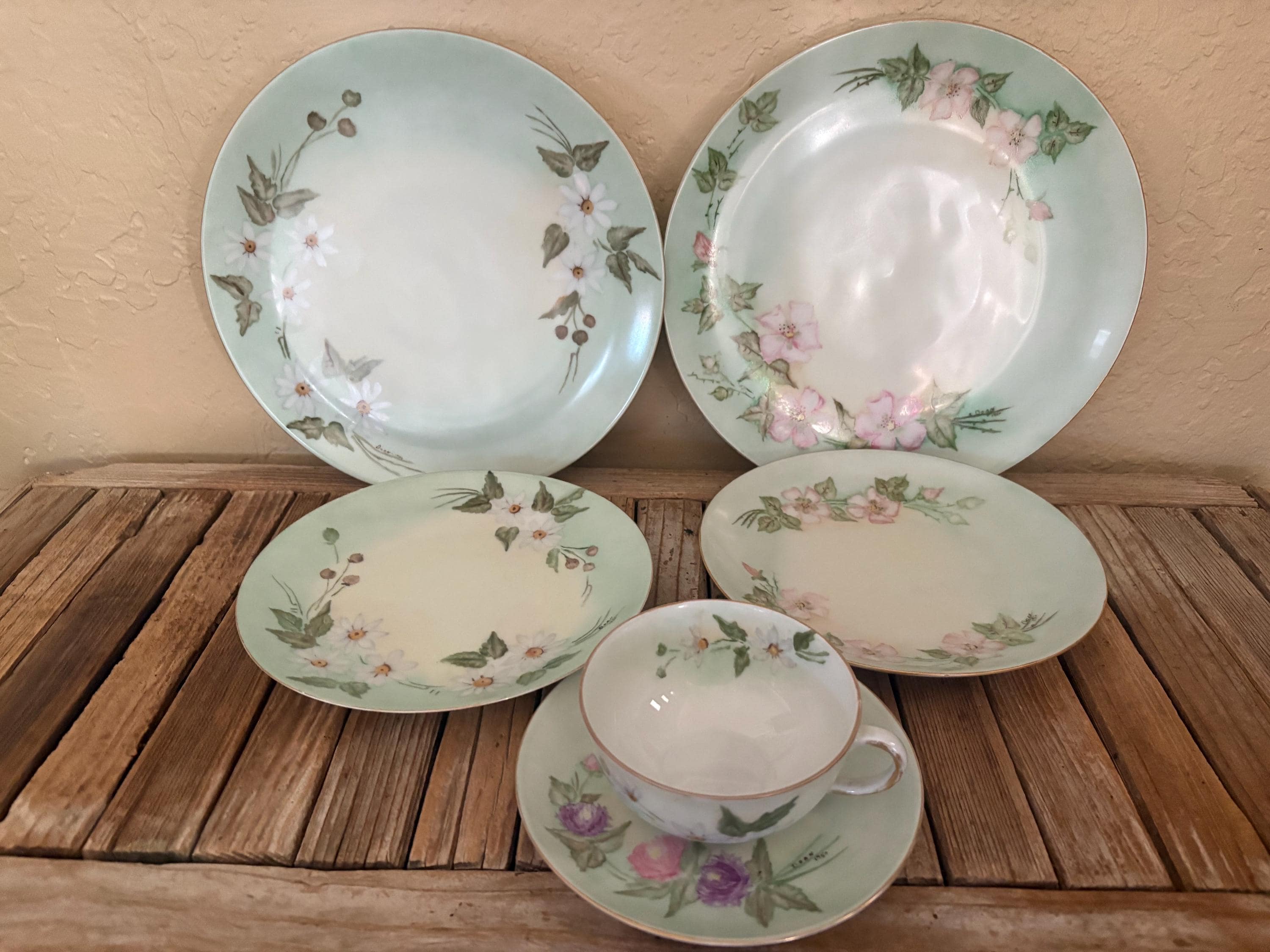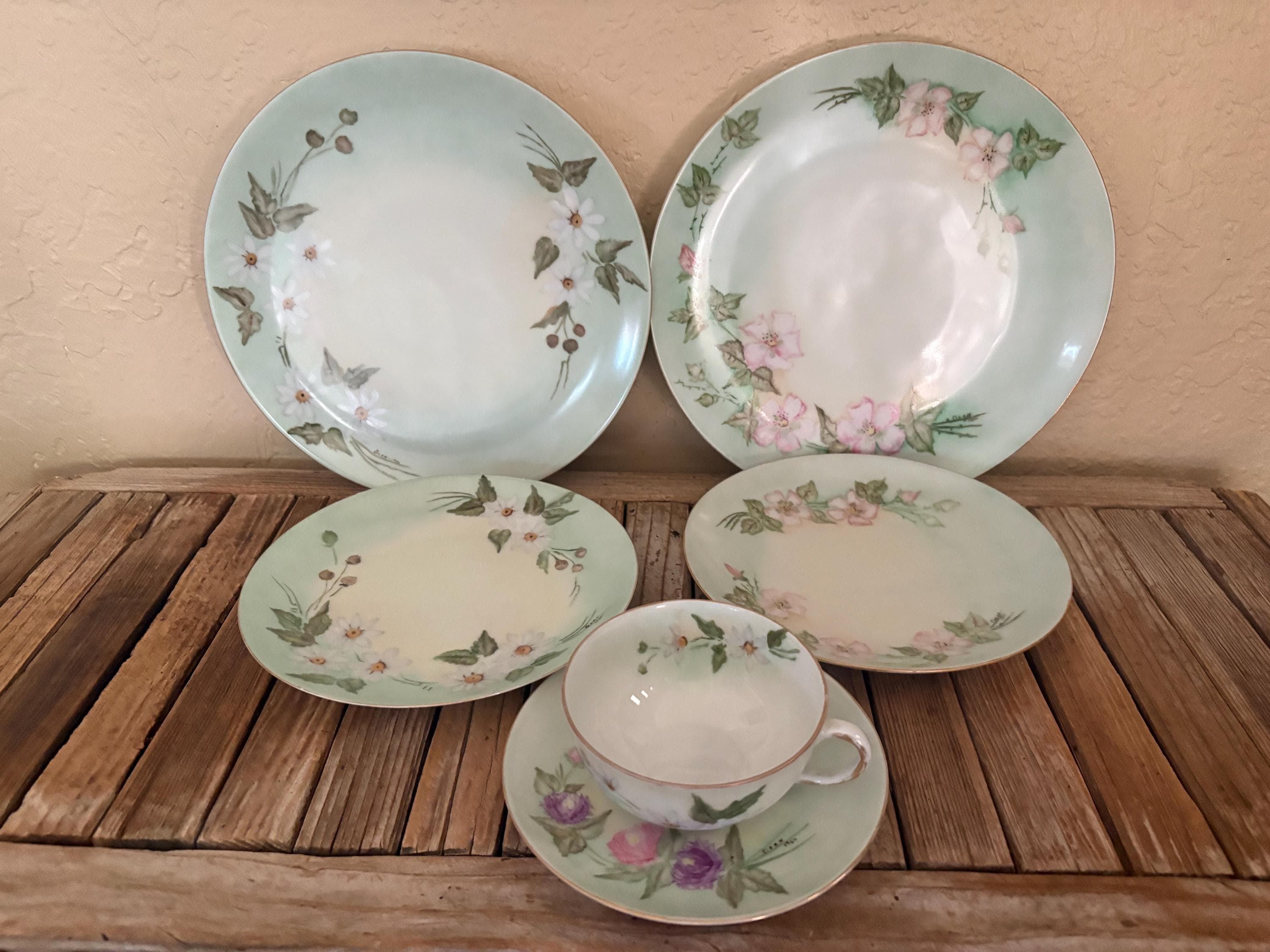 Antique set of German plates and teacup. In great condition, normal wear due to age and use. There are some surface scrapes with no chips of cracks, please see pictures. A beautiful set with unique detail to use everyday, to add to a collection or give as a gift.