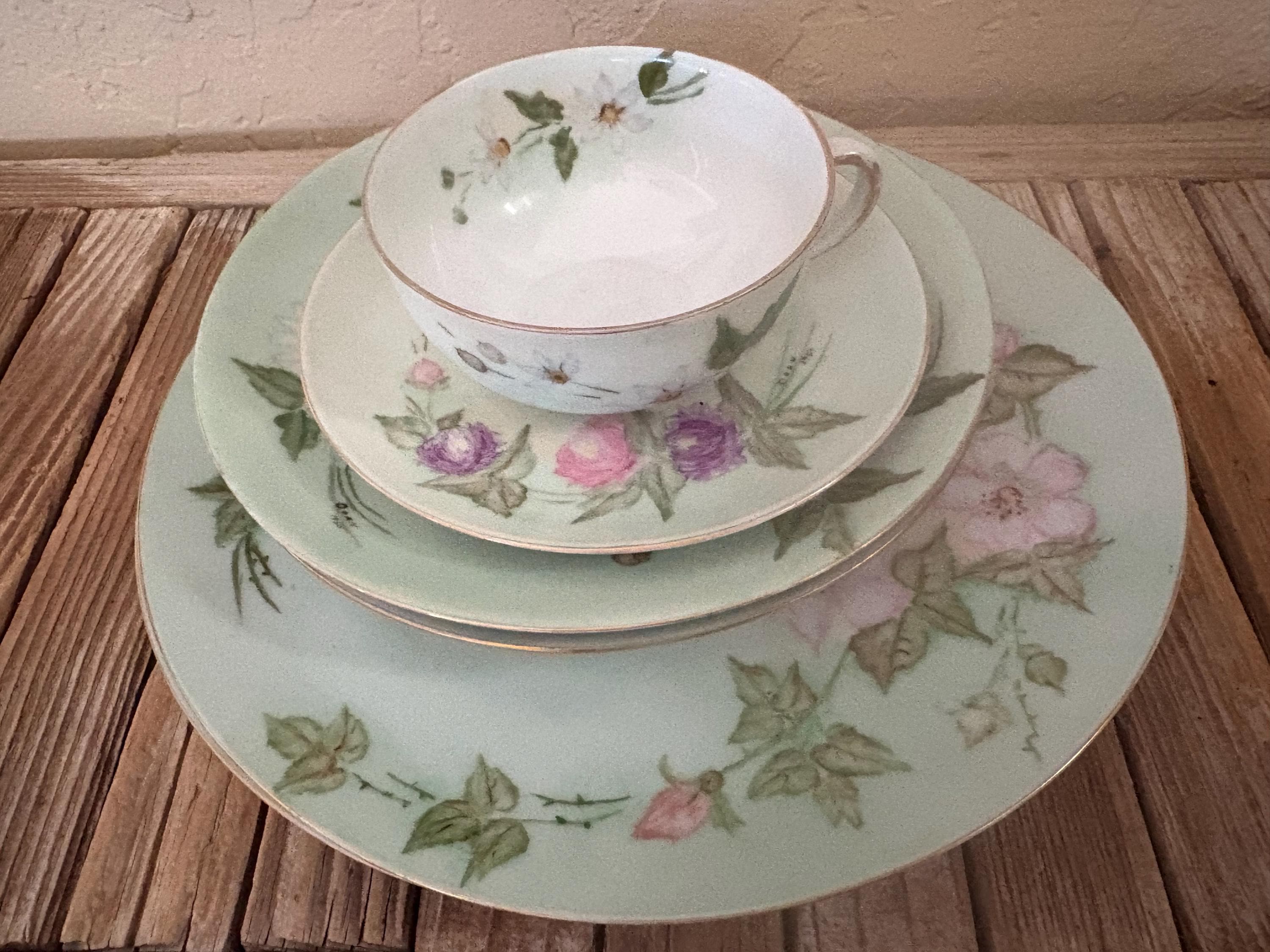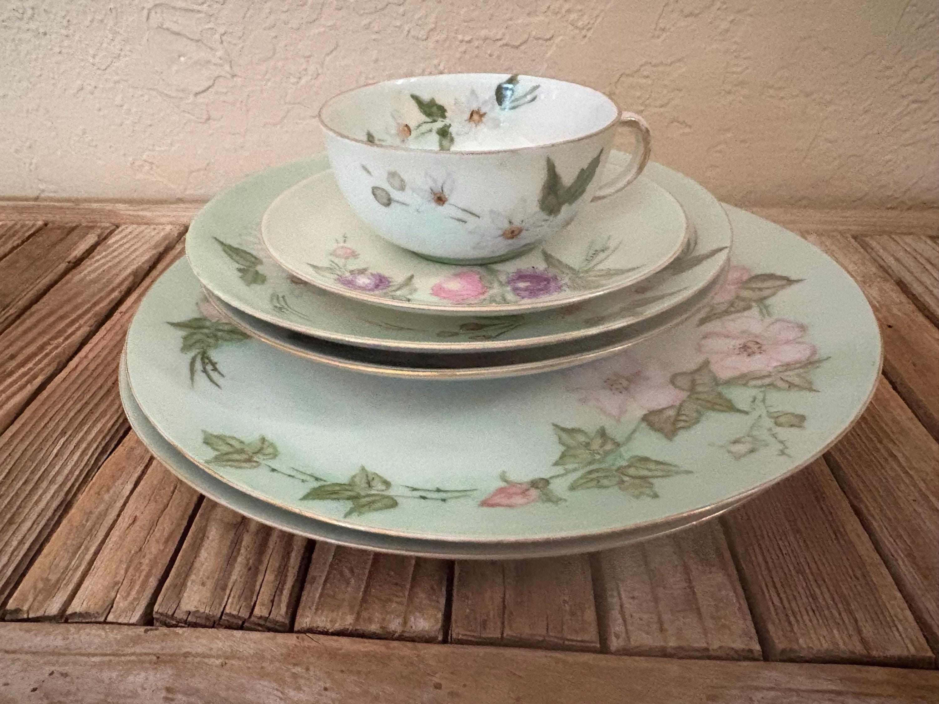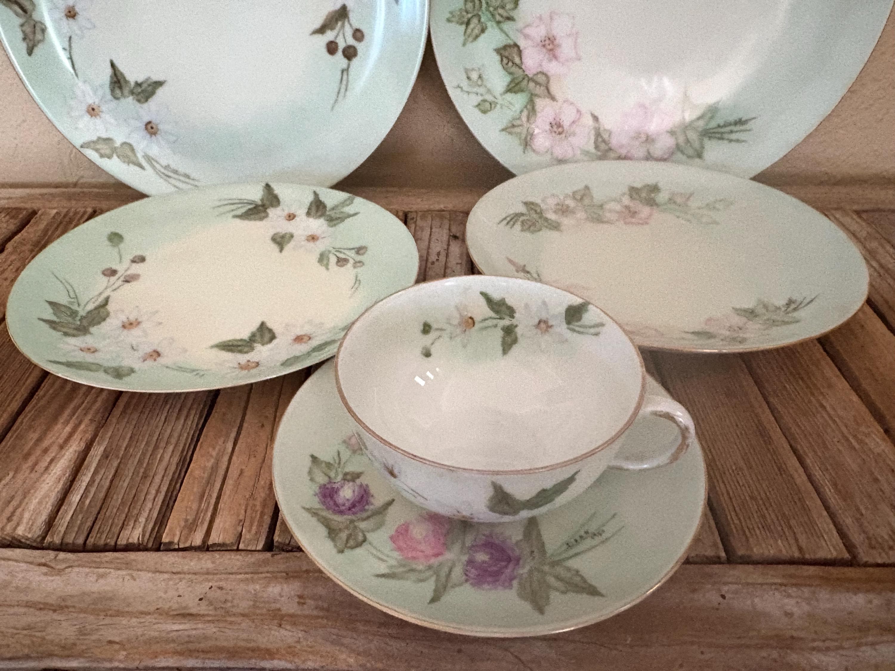 Antique set of German plates and teacup. In great condition, normal wear due to age and use. There are some surface scrapes with no chips of cracks, please see pictures. A beautiful set with unique detail to use everyday, to add to a collection or give as a gift.