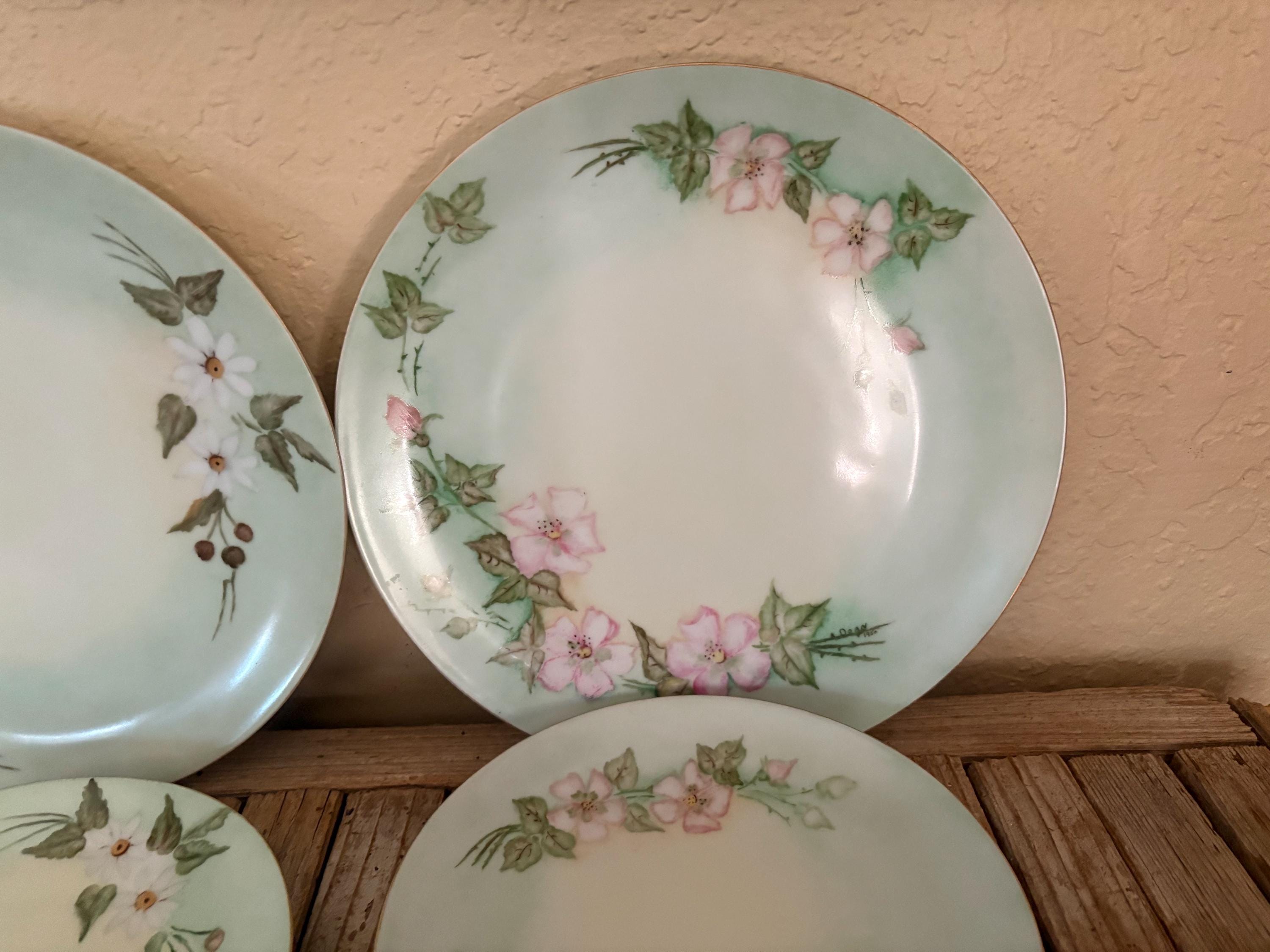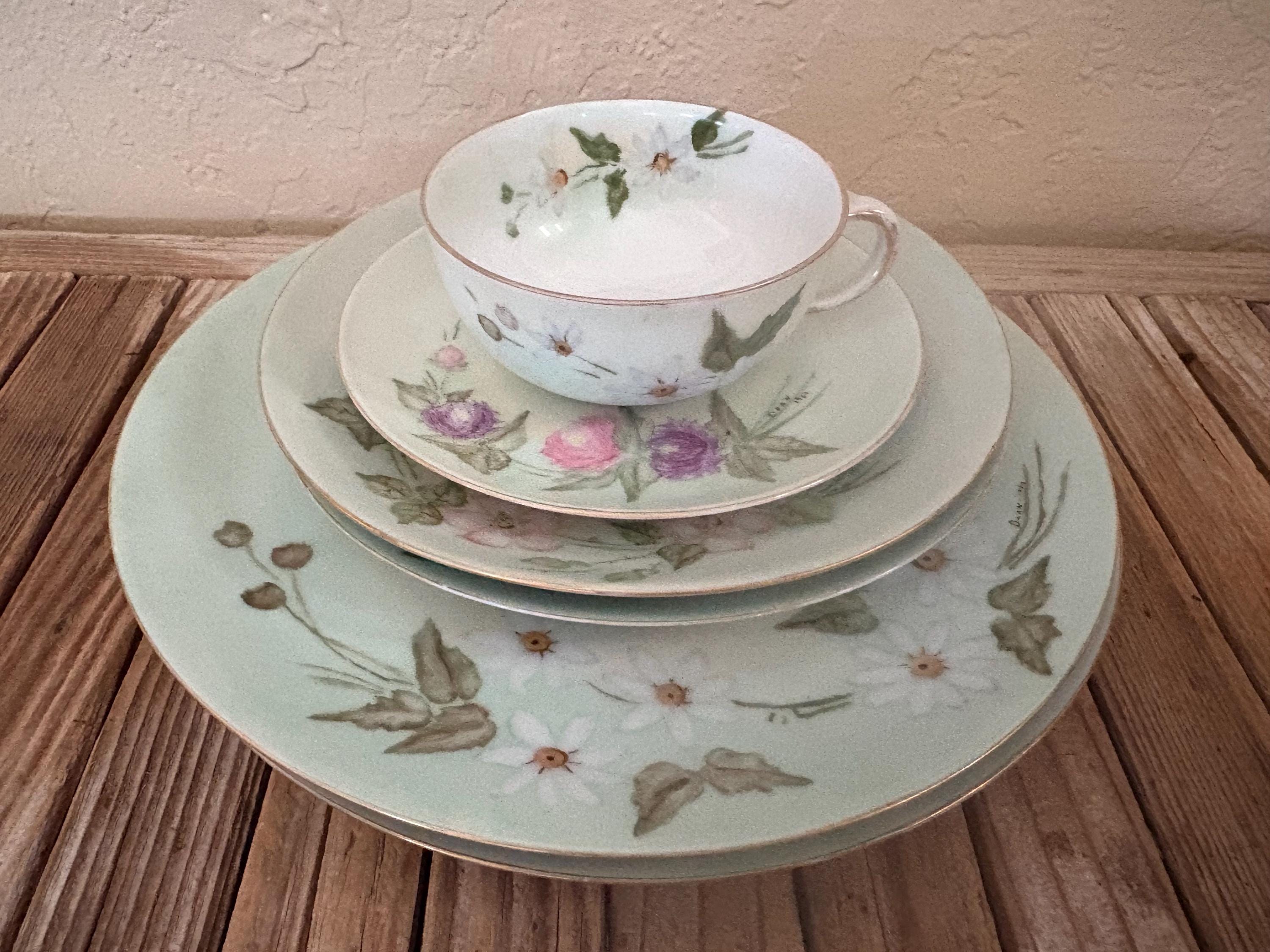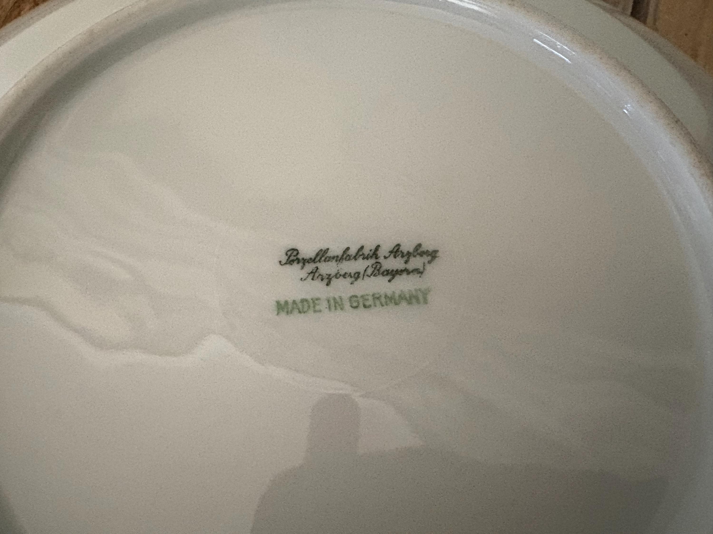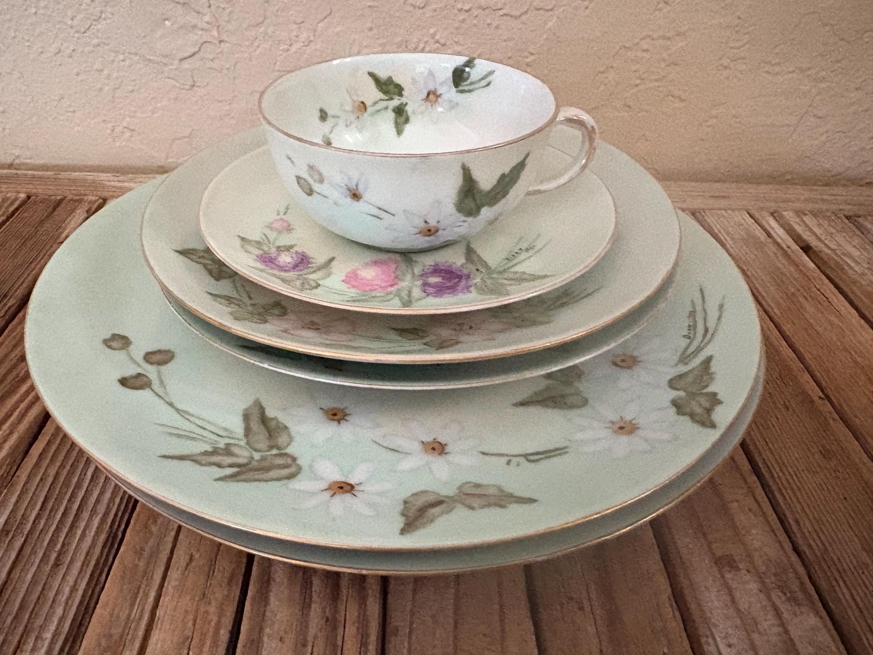 Antique set of German plates and teacup. In great condition, normal wear due to age and use. There are some surface scrapes with no chips of cracks, please see pictures. A beautiful set with unique detail to use everyday, to add to a collection or give as a gift.