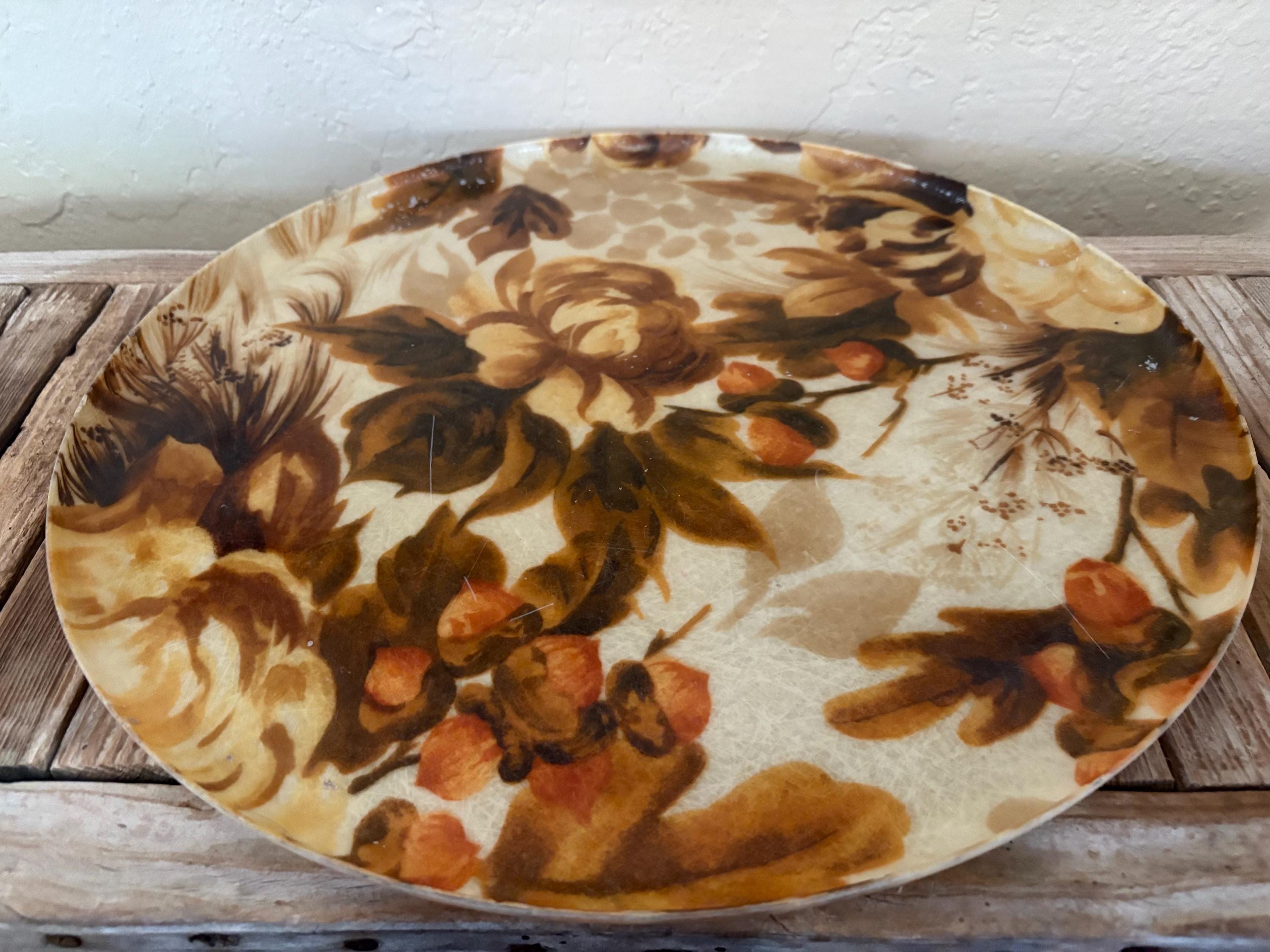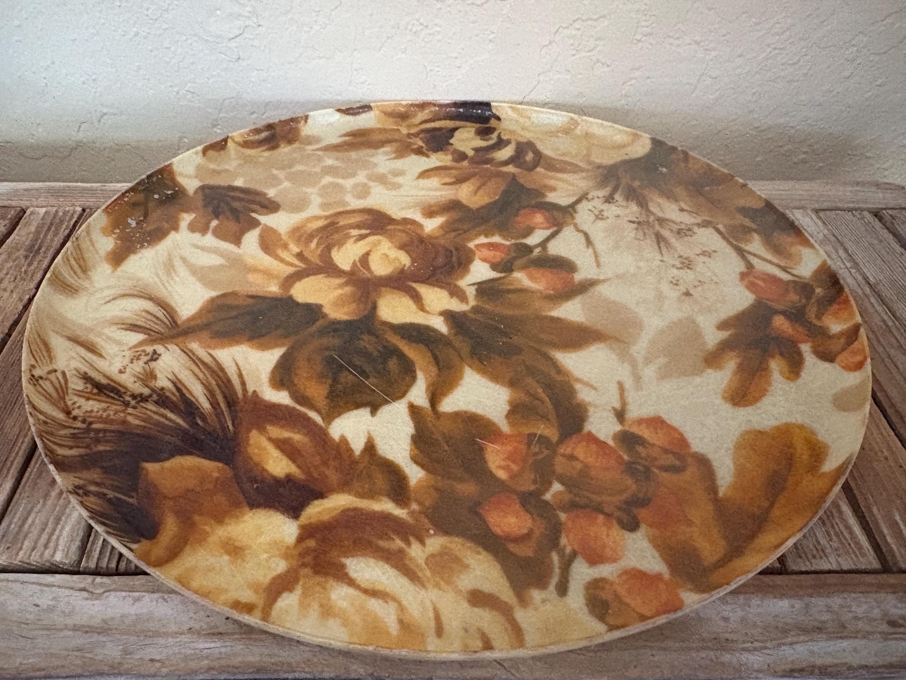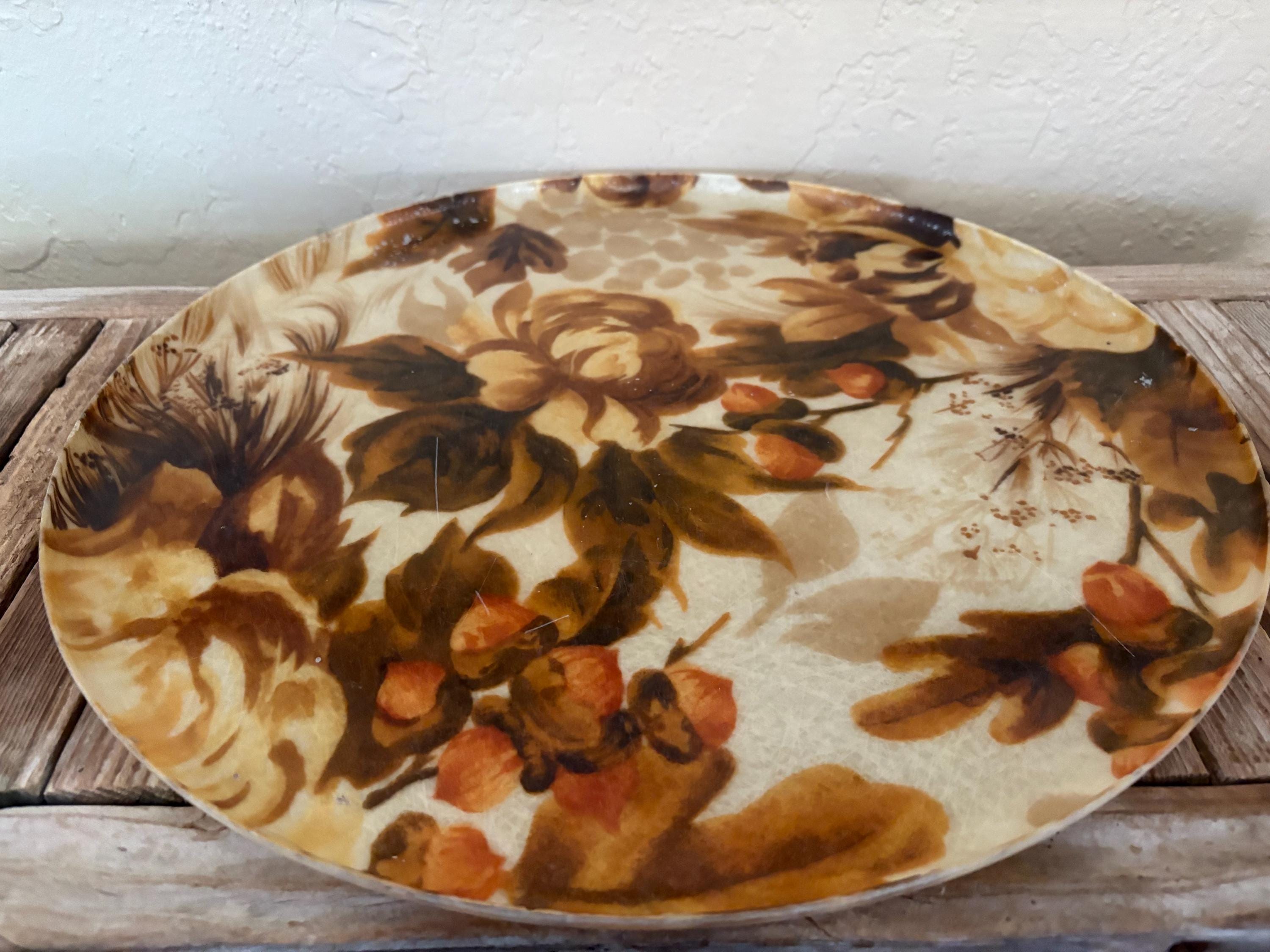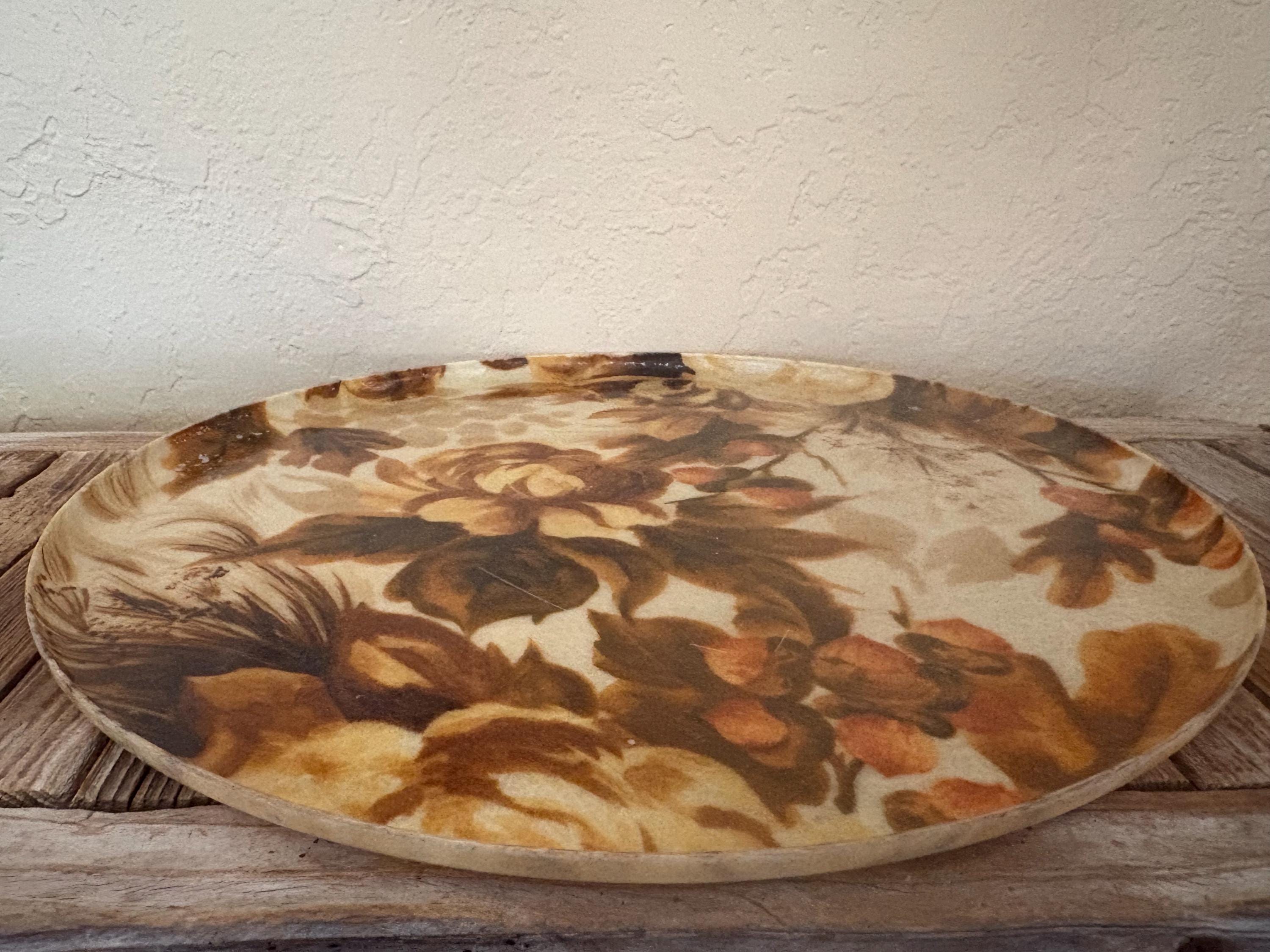 Mid Century Autumn floral fiberglass platter tray. In great used condition, normal wear due to age and use. The piece has surface scrapes and markings to the finish. A beautiful tray to add to your home, the upcoming holidays or as a gift.