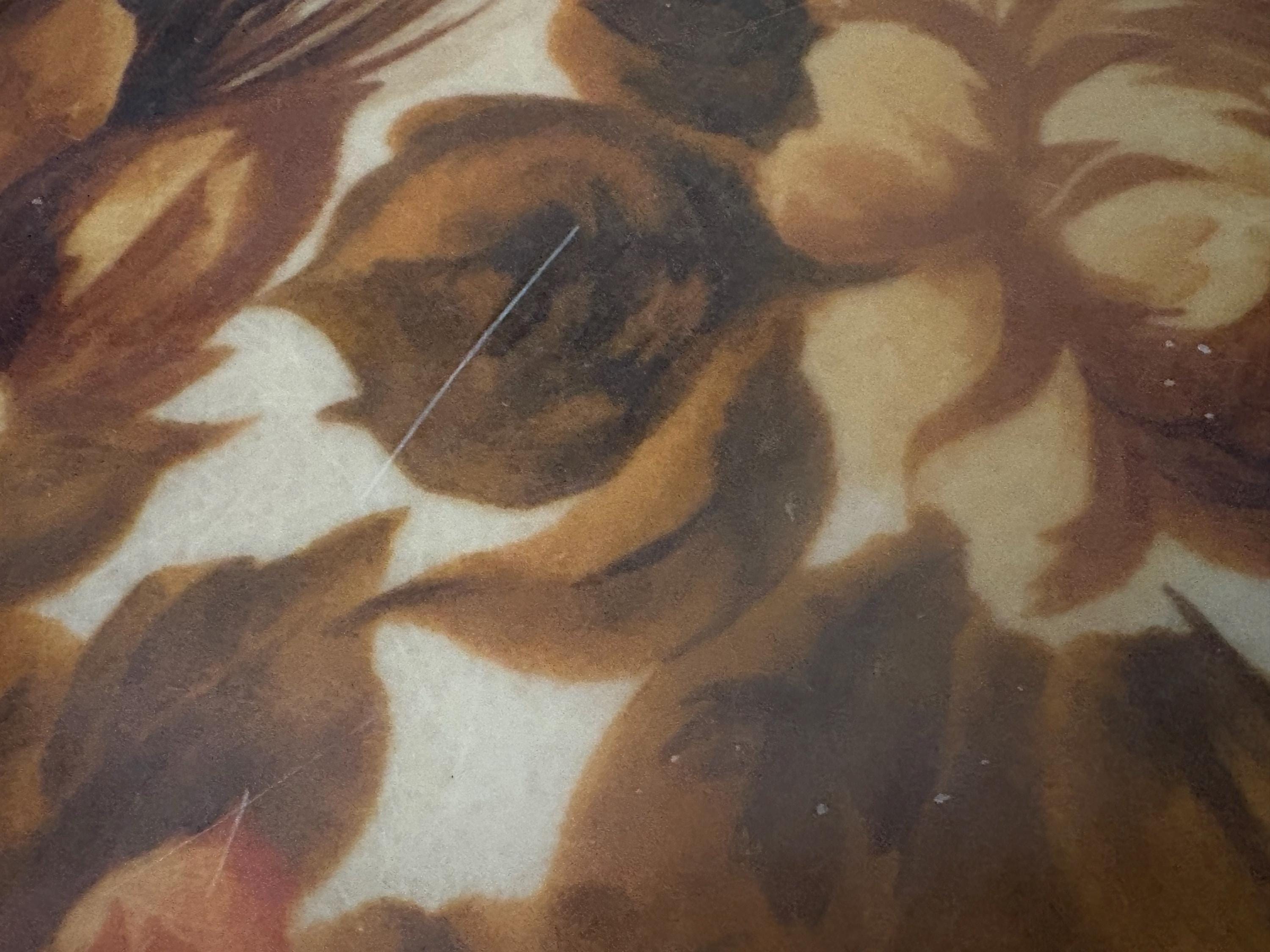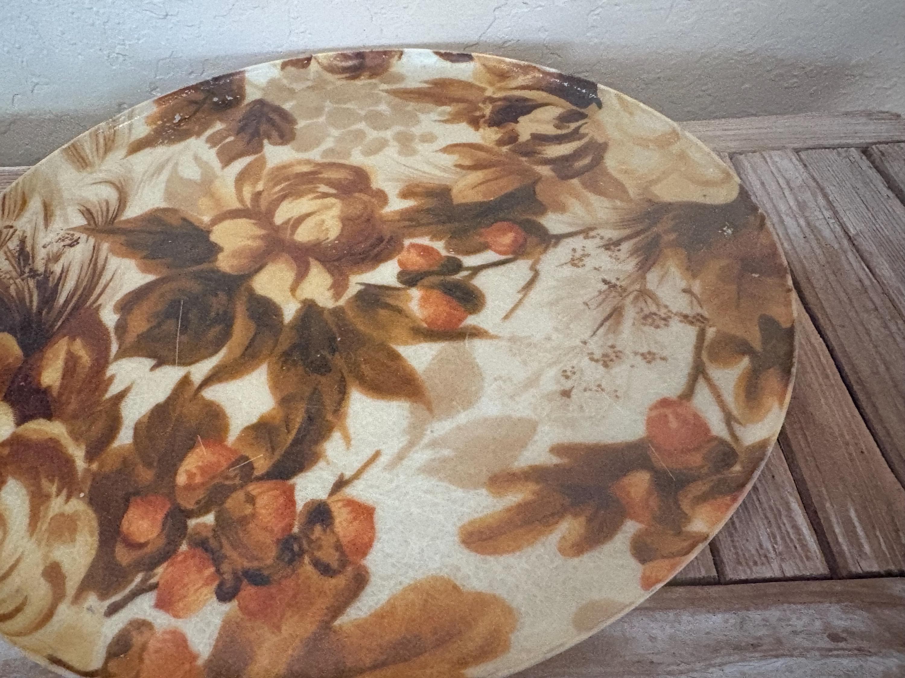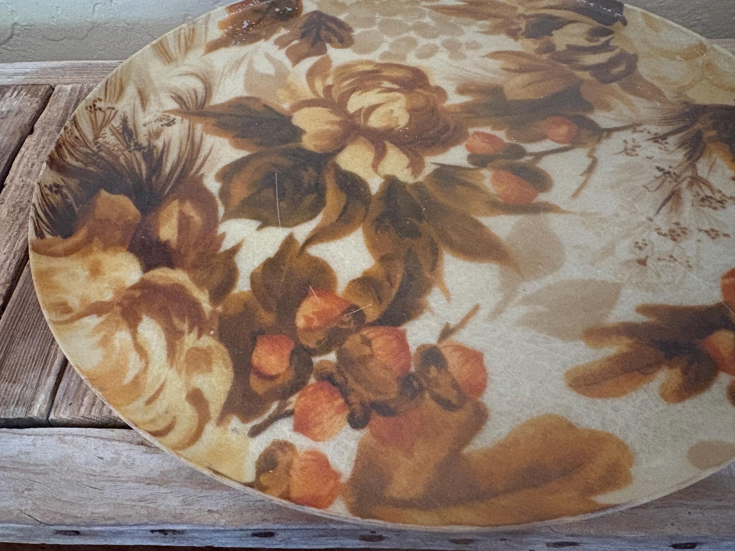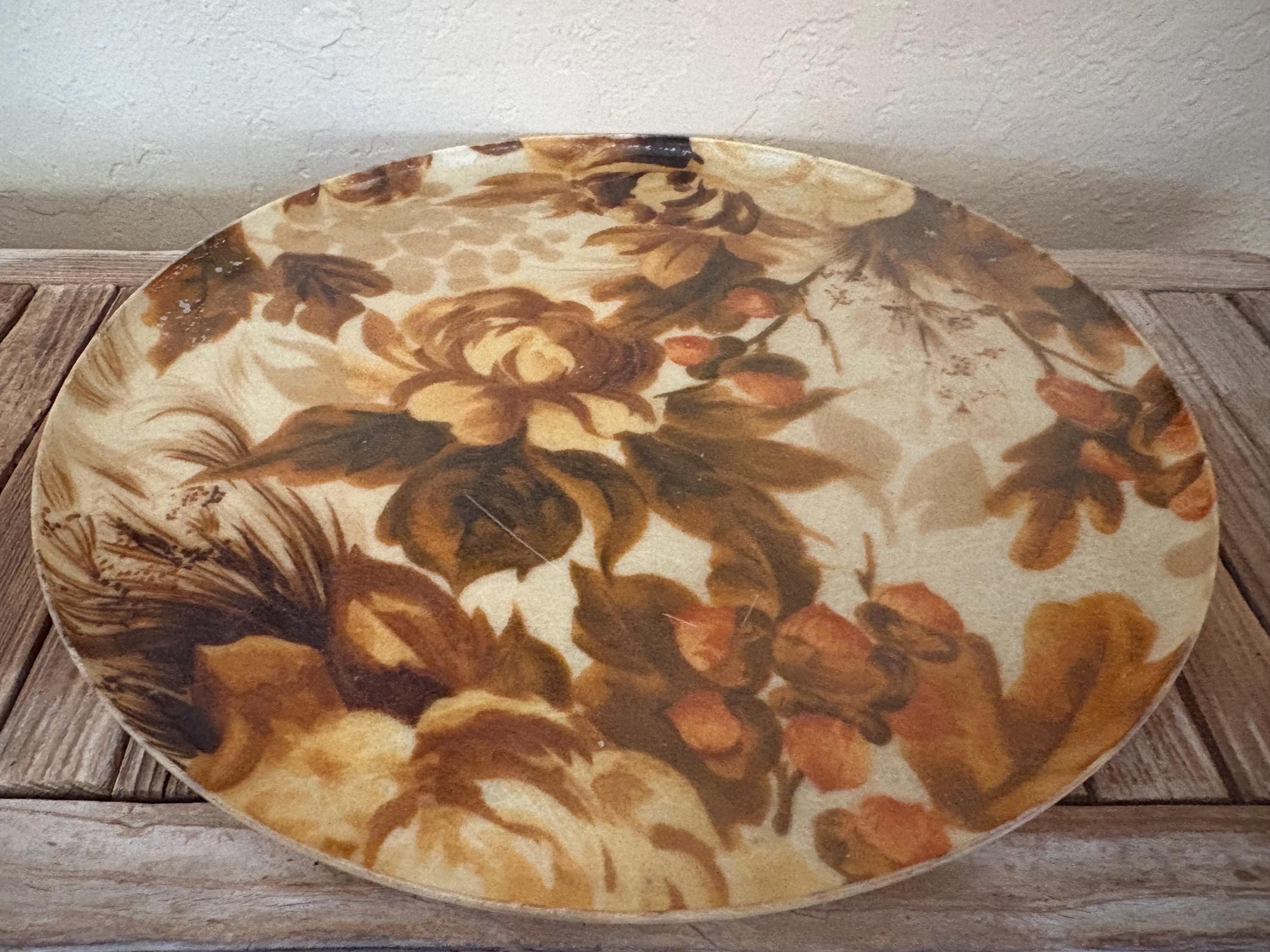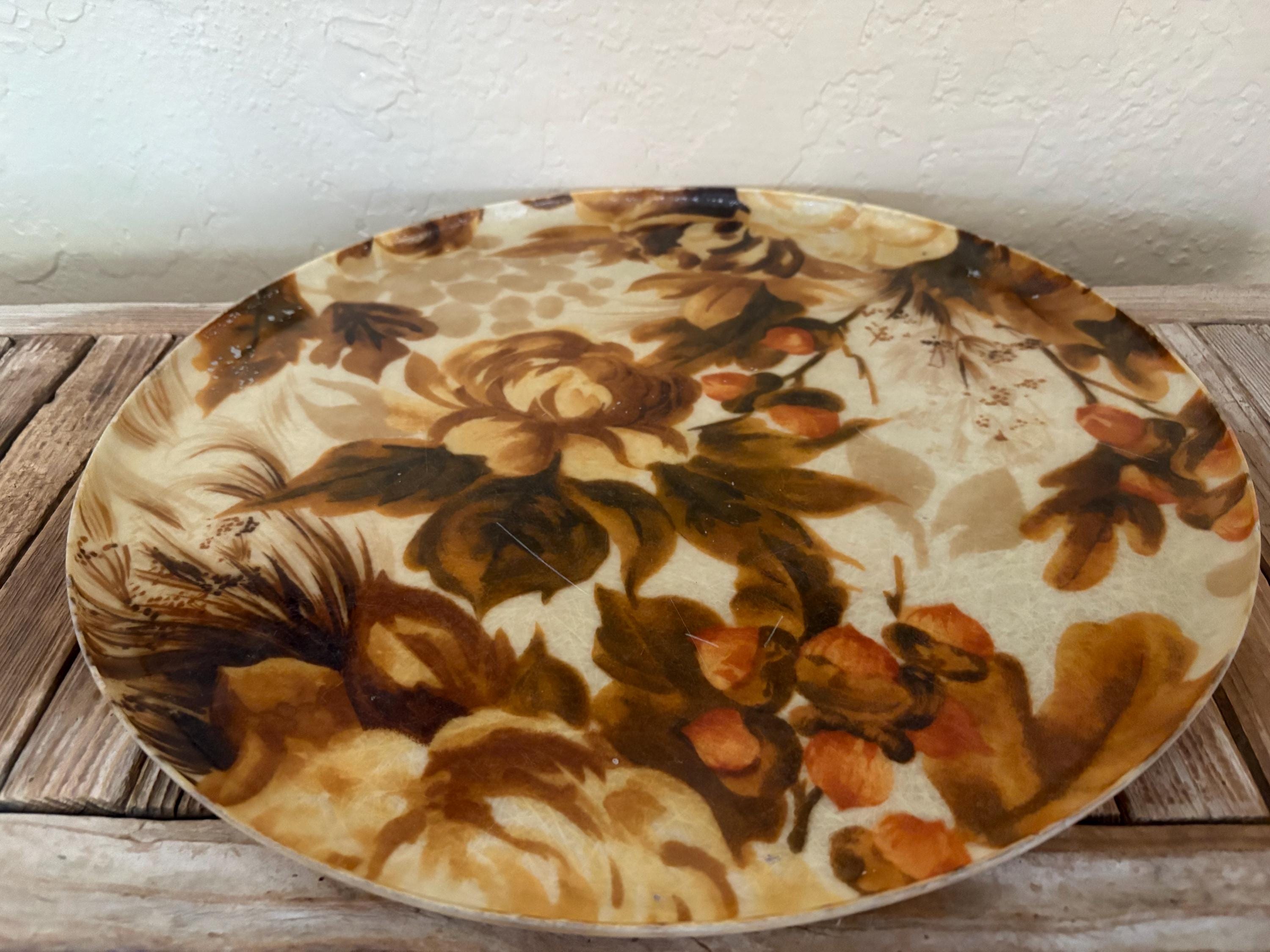 Mid Century Autumn floral fiberglass platter tray. In great used condition, normal wear due to age and use. The piece has surface scrapes and markings to the finish. A beautiful tray to add to your home, the upcoming holidays or as a gift.