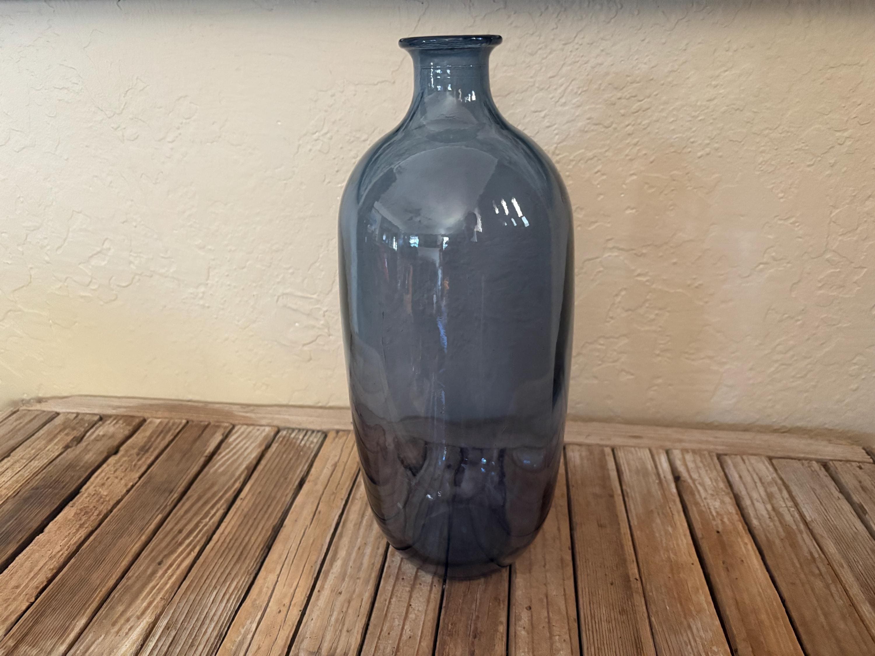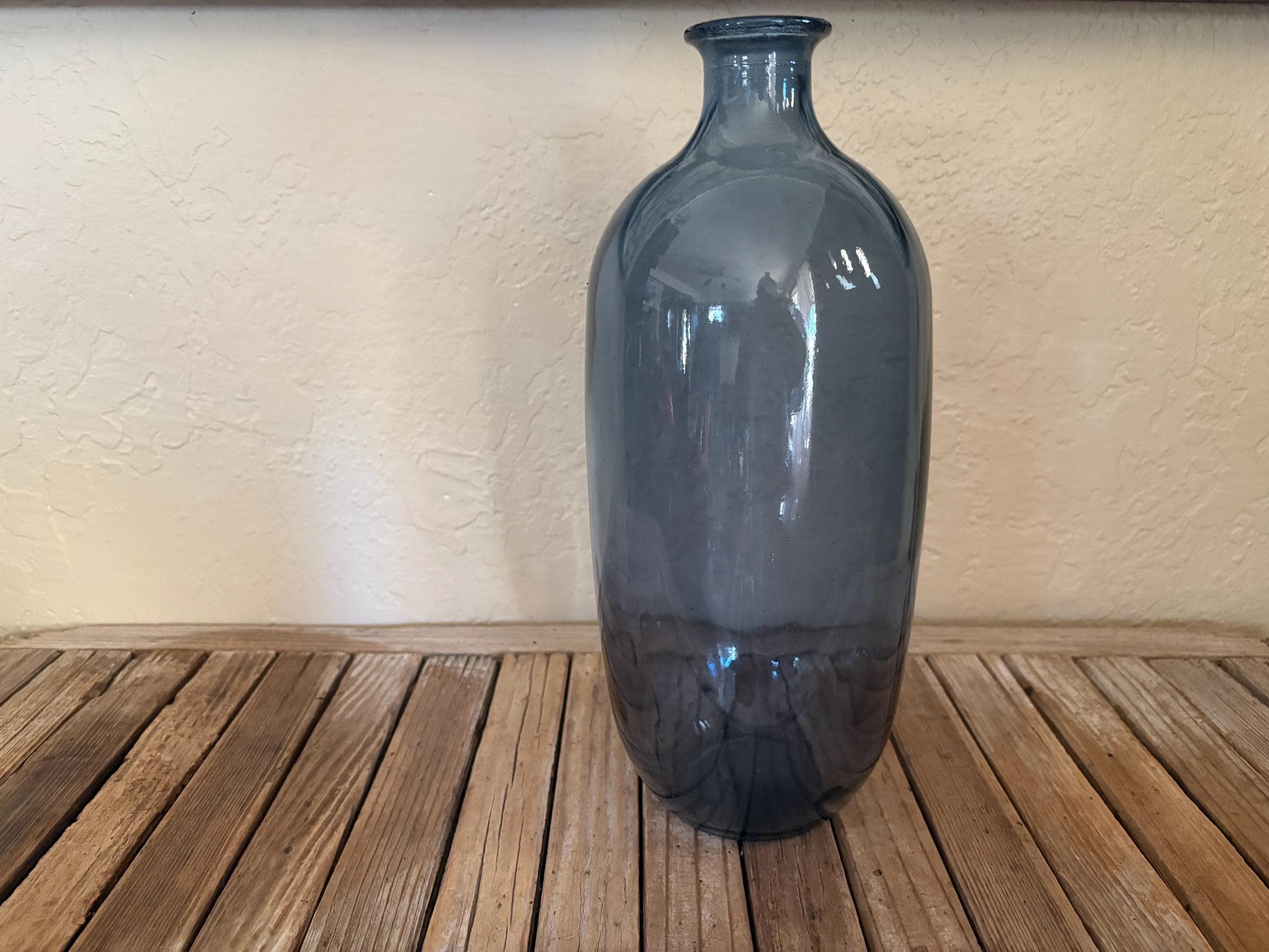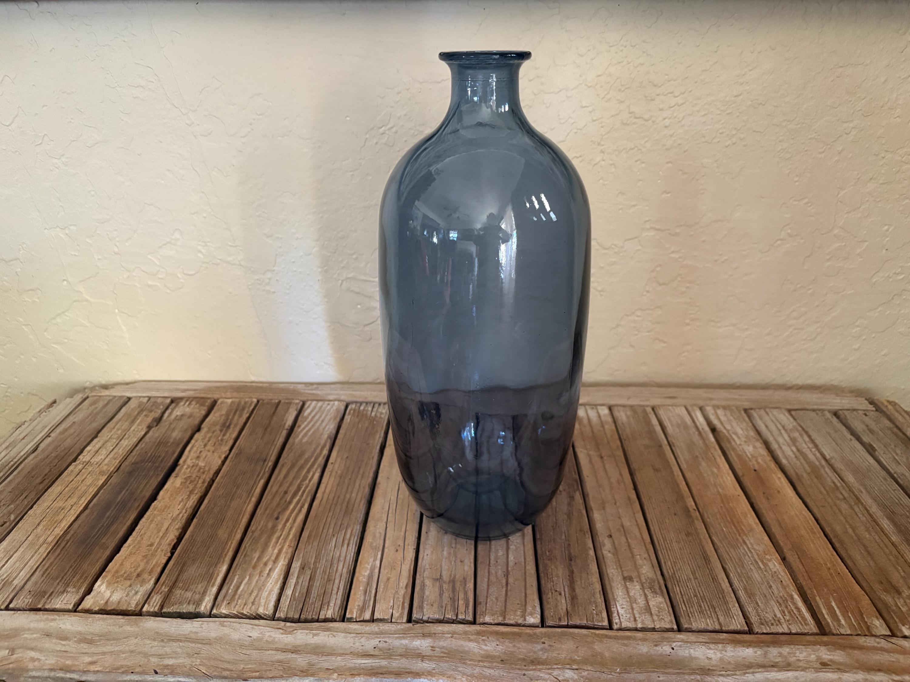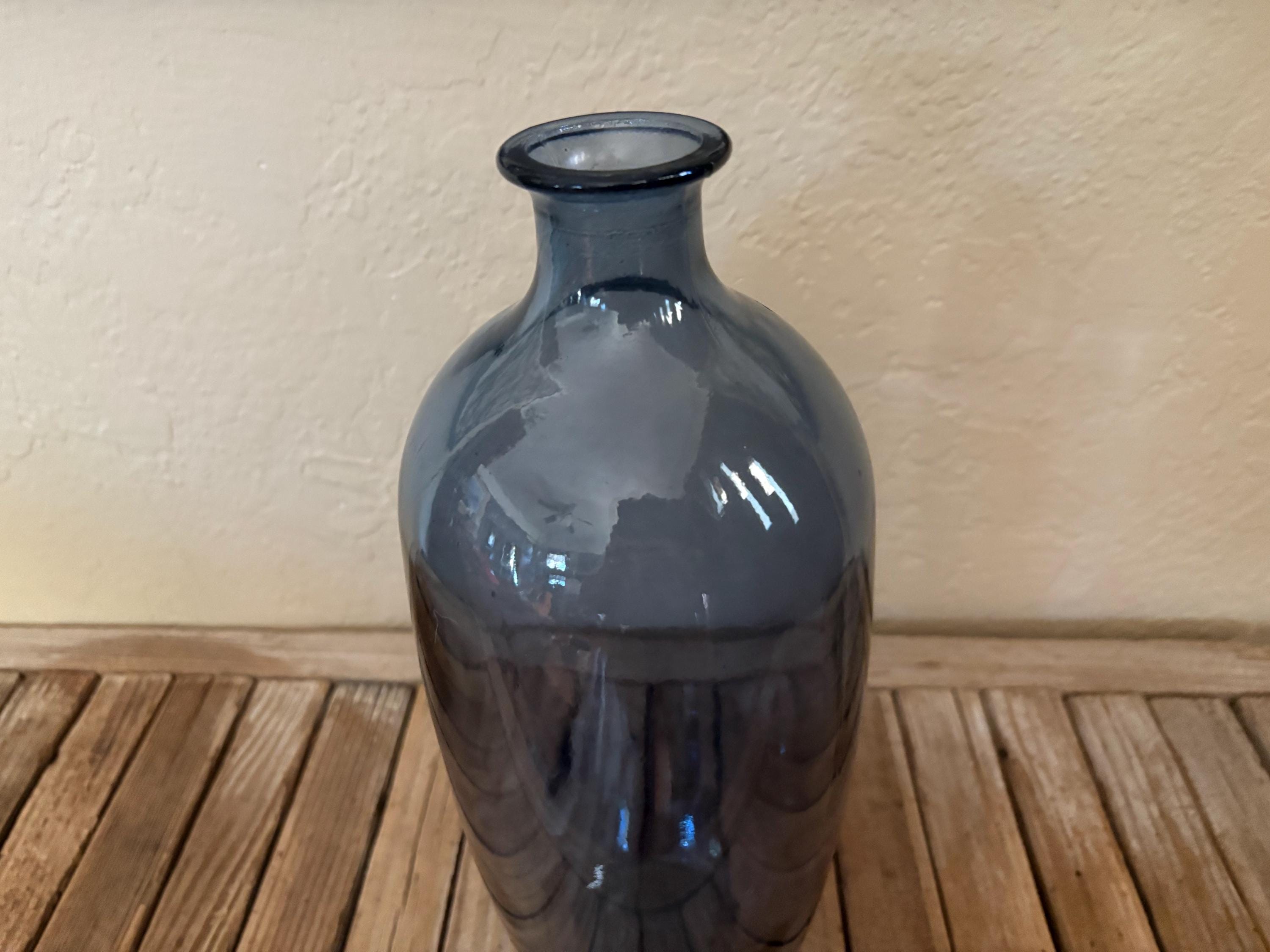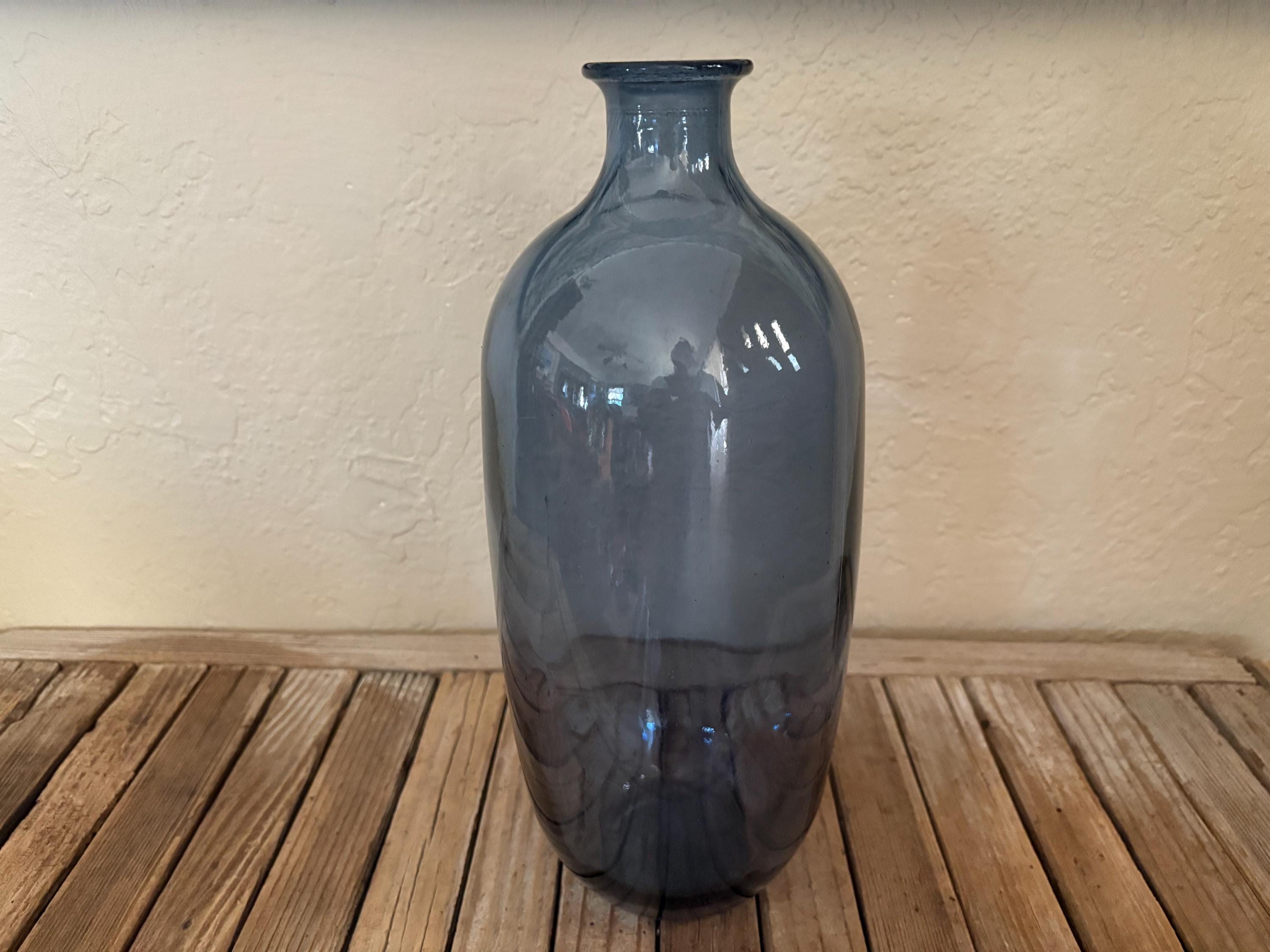 Vintage large smokey blue bottle. In great condition, normal wear due to age and us. The bottle has surface scrapes, markings and discolorations. I believe this is flash painted blue, please see pictures. A cool, unique bottle with great detail to add to your home or collection.