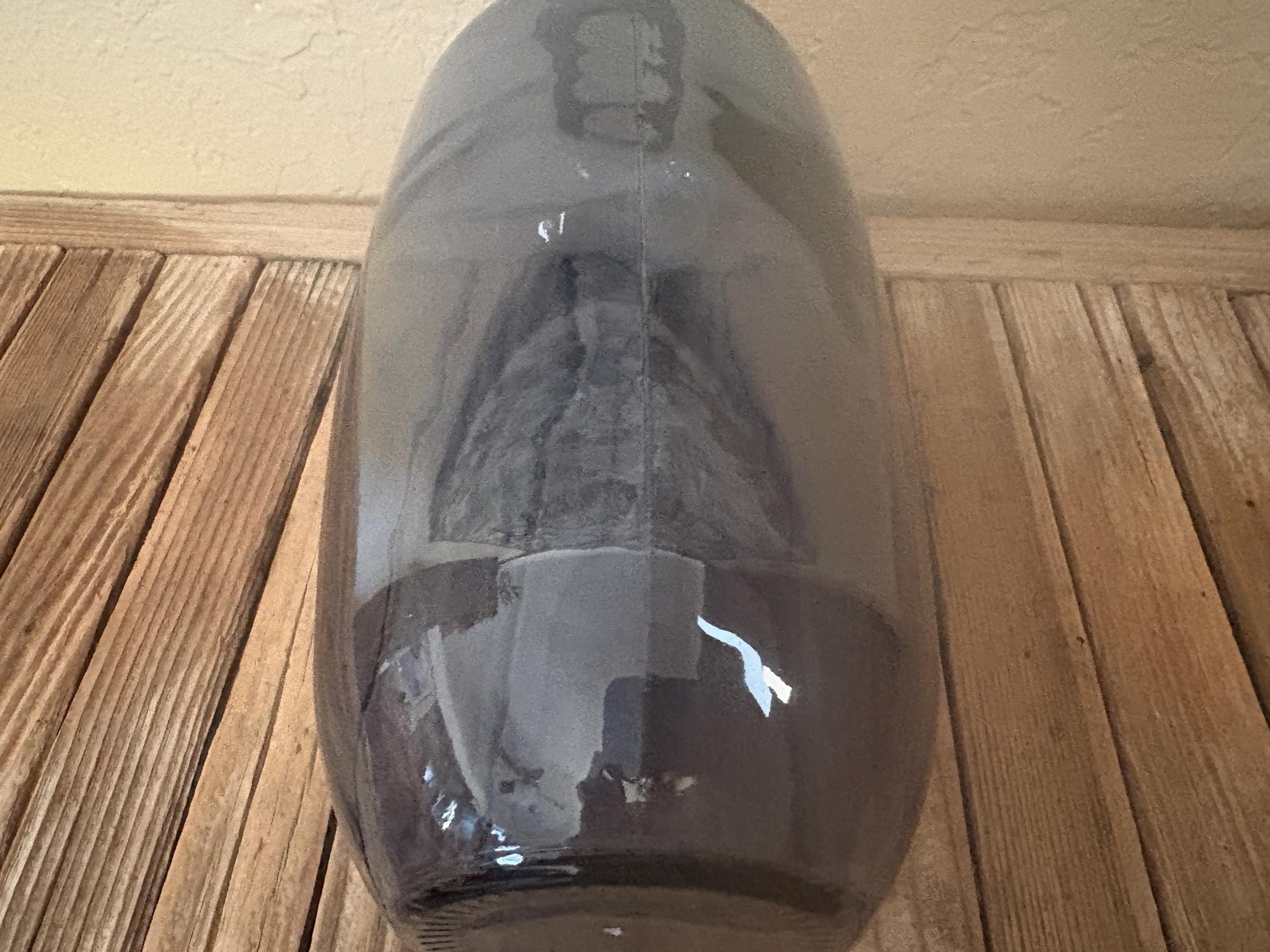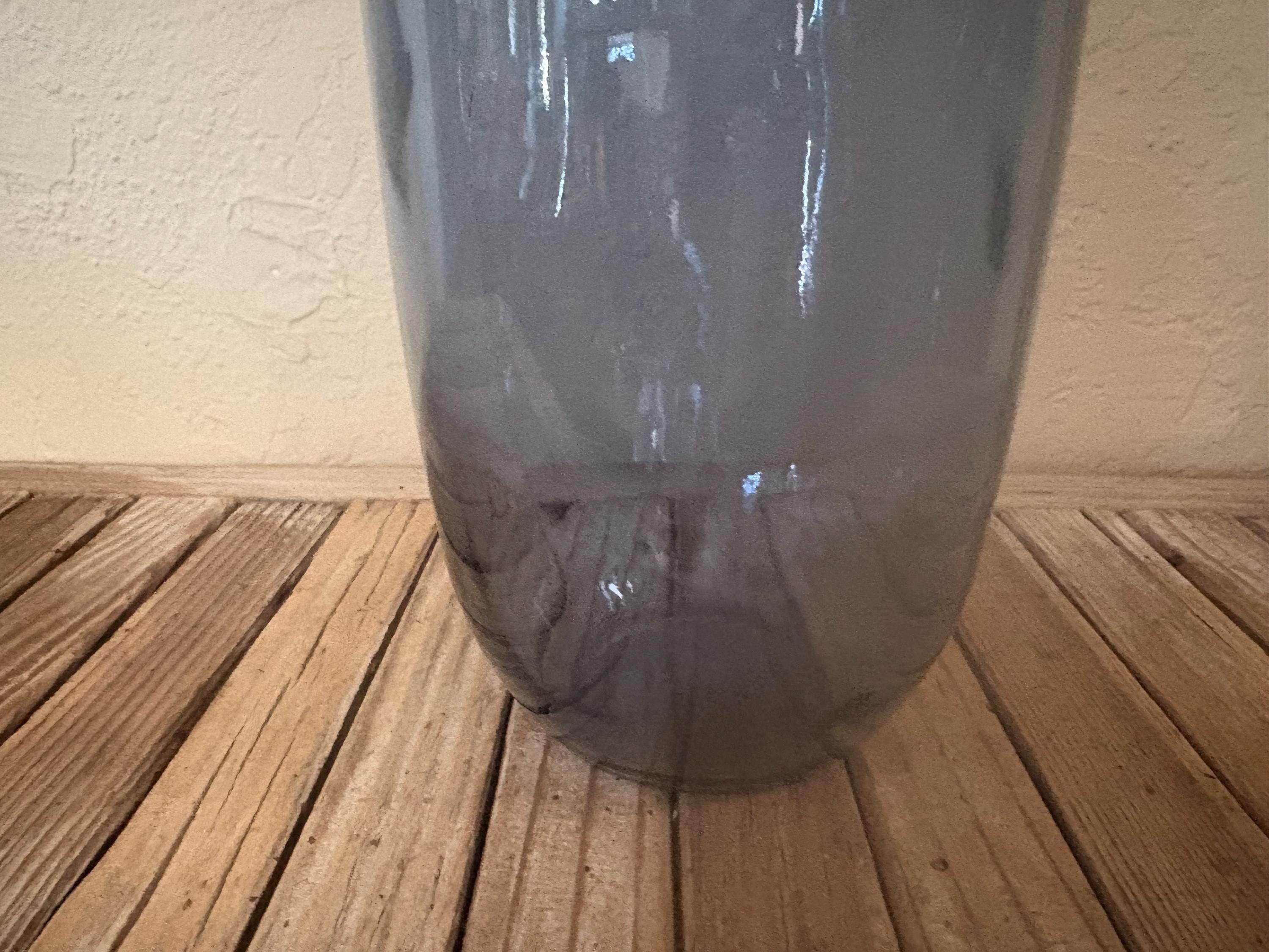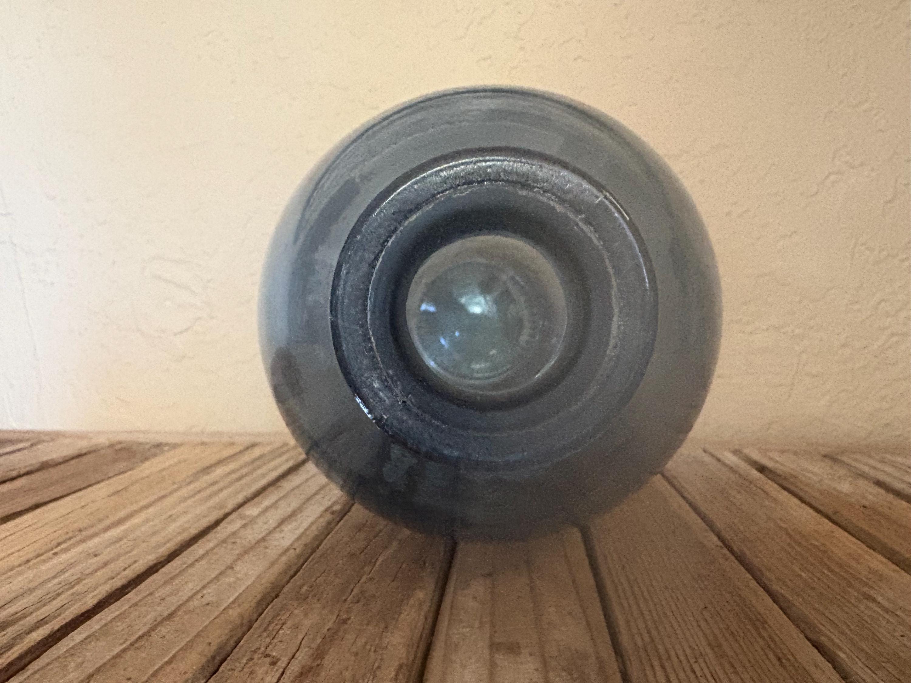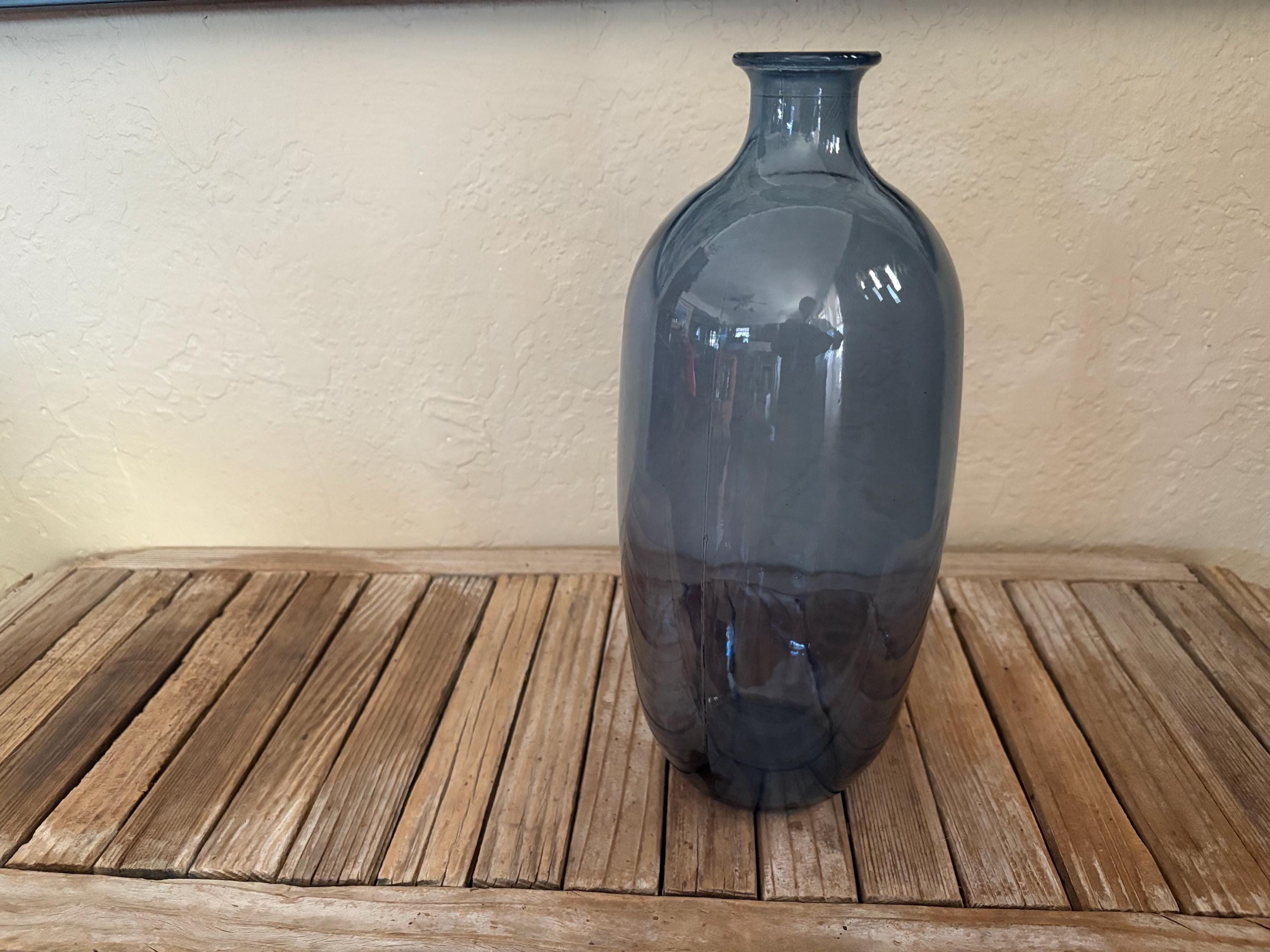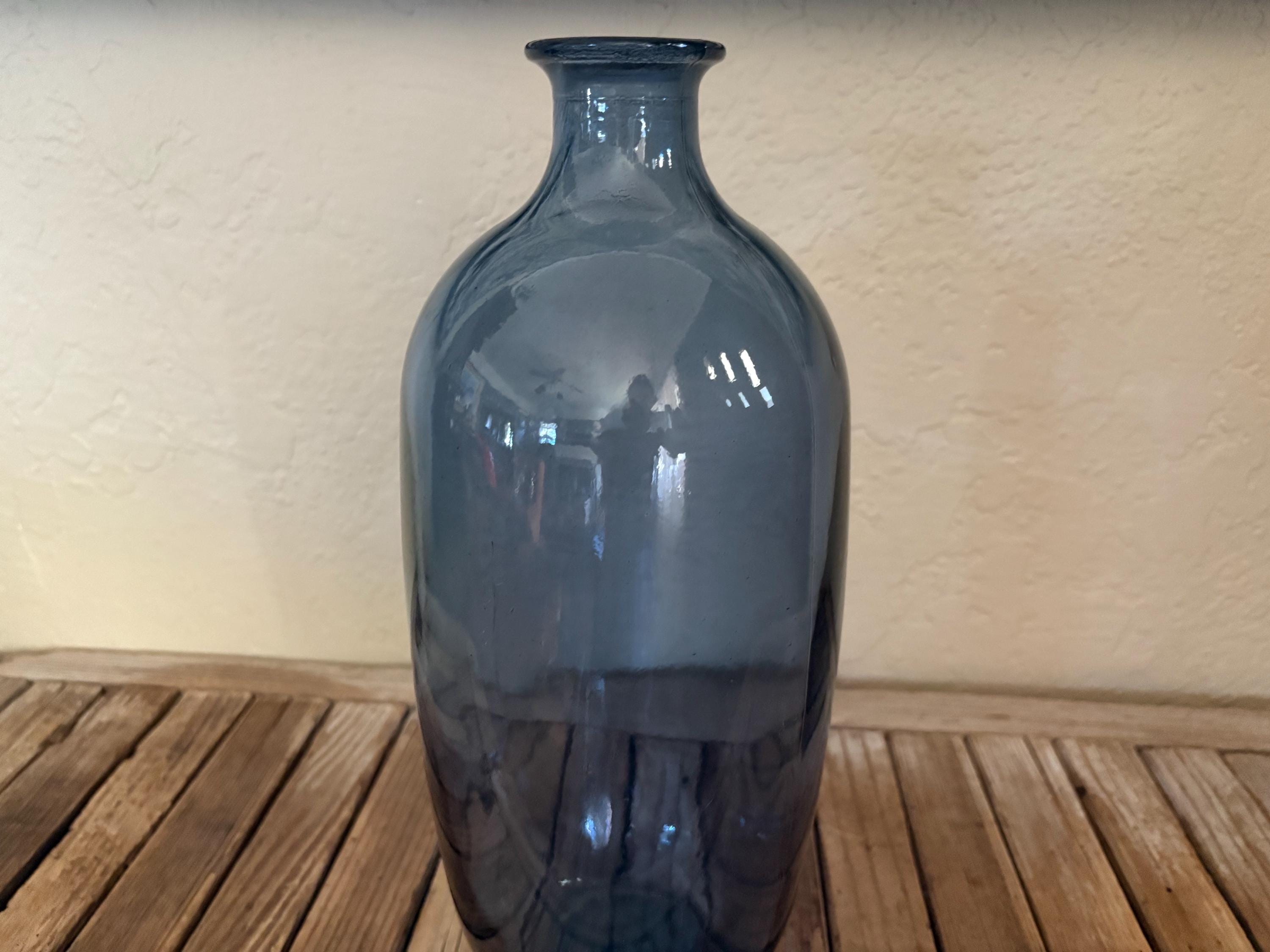 Vintage large smokey blue bottle. In great condition, normal wear due to age and us. The bottle has surface scrapes, markings and discolorations. I believe this is flash painted blue, please see pictures. A cool, unique bottle with great detail to add to your home or collection.