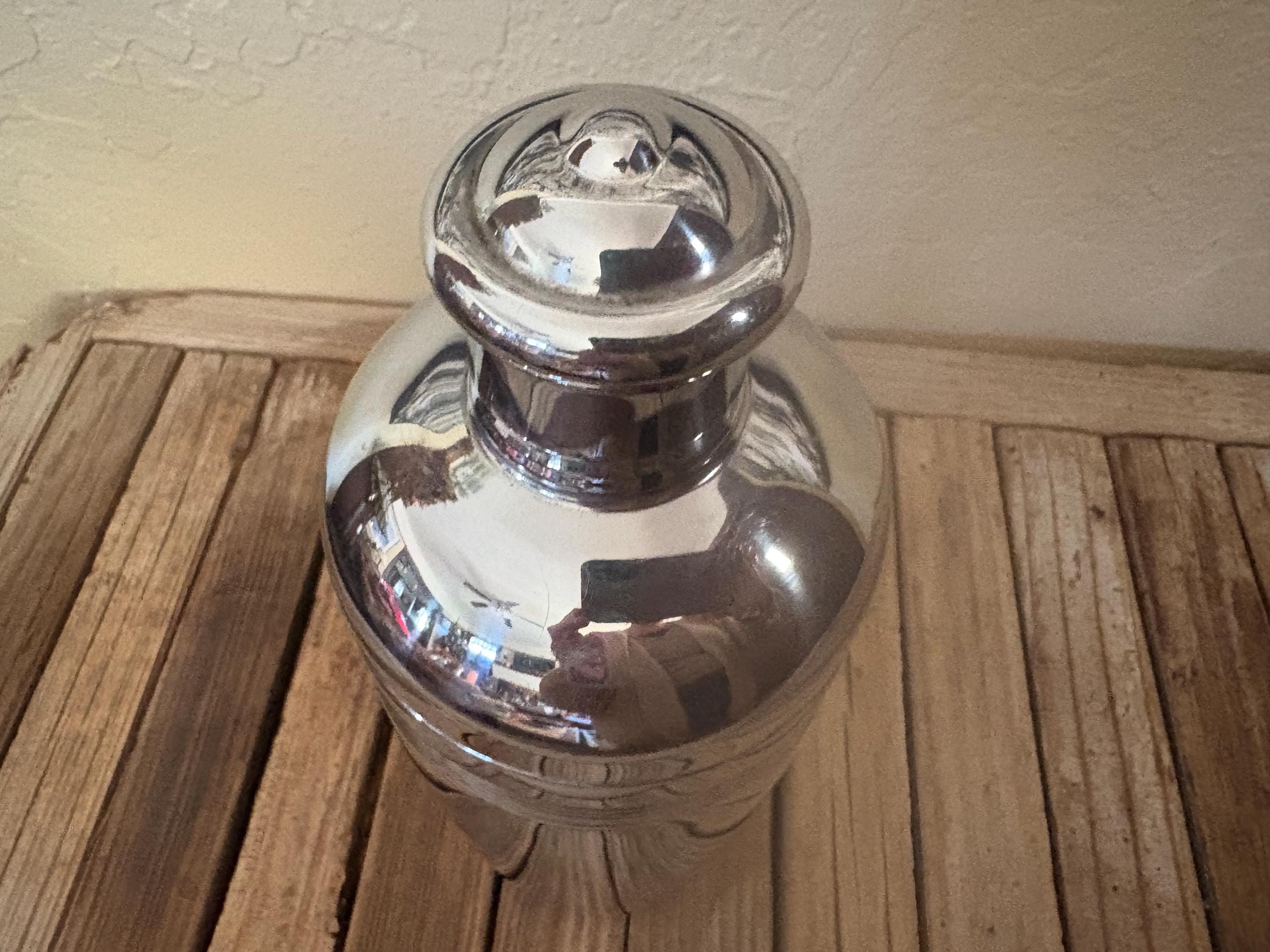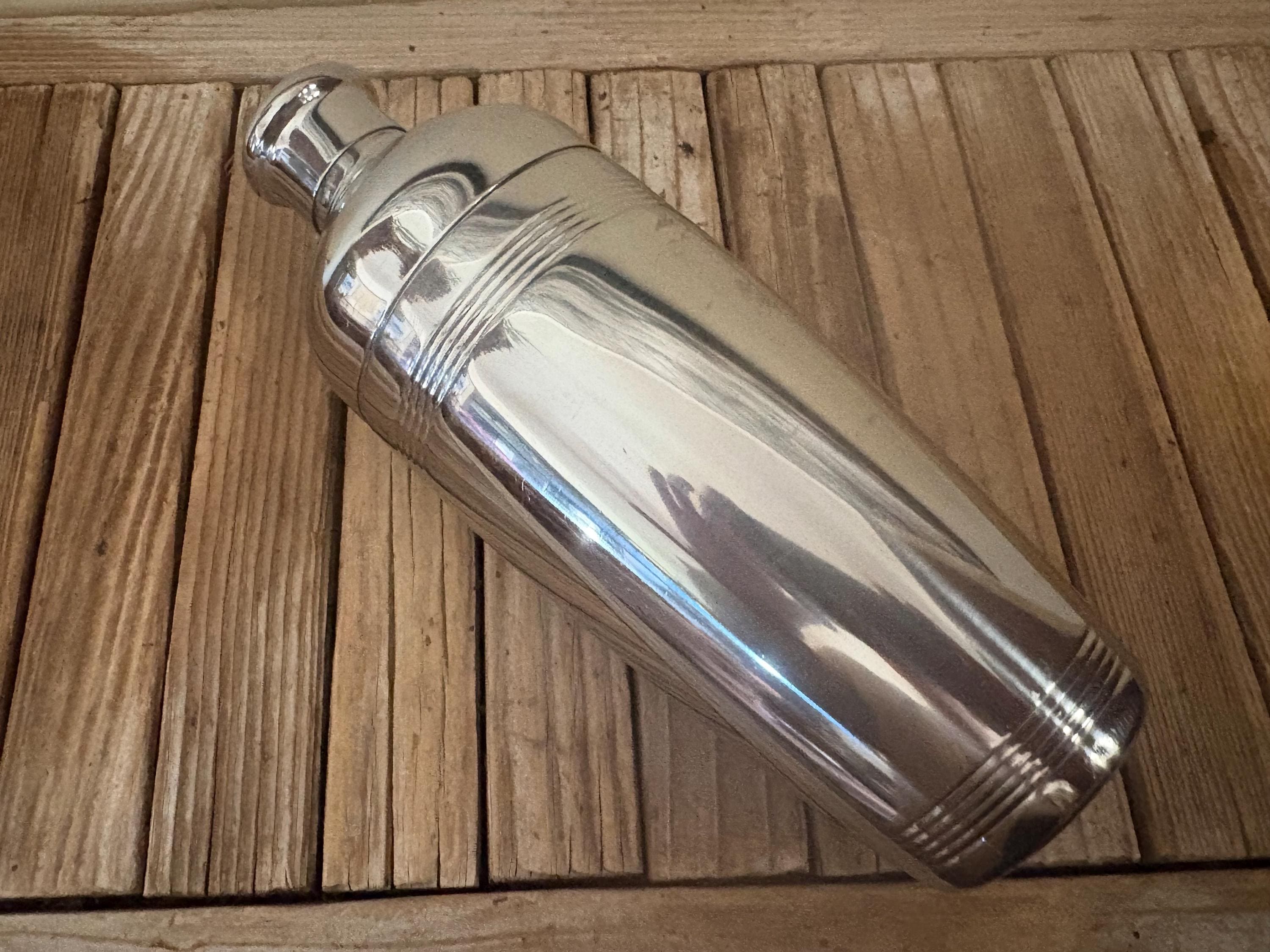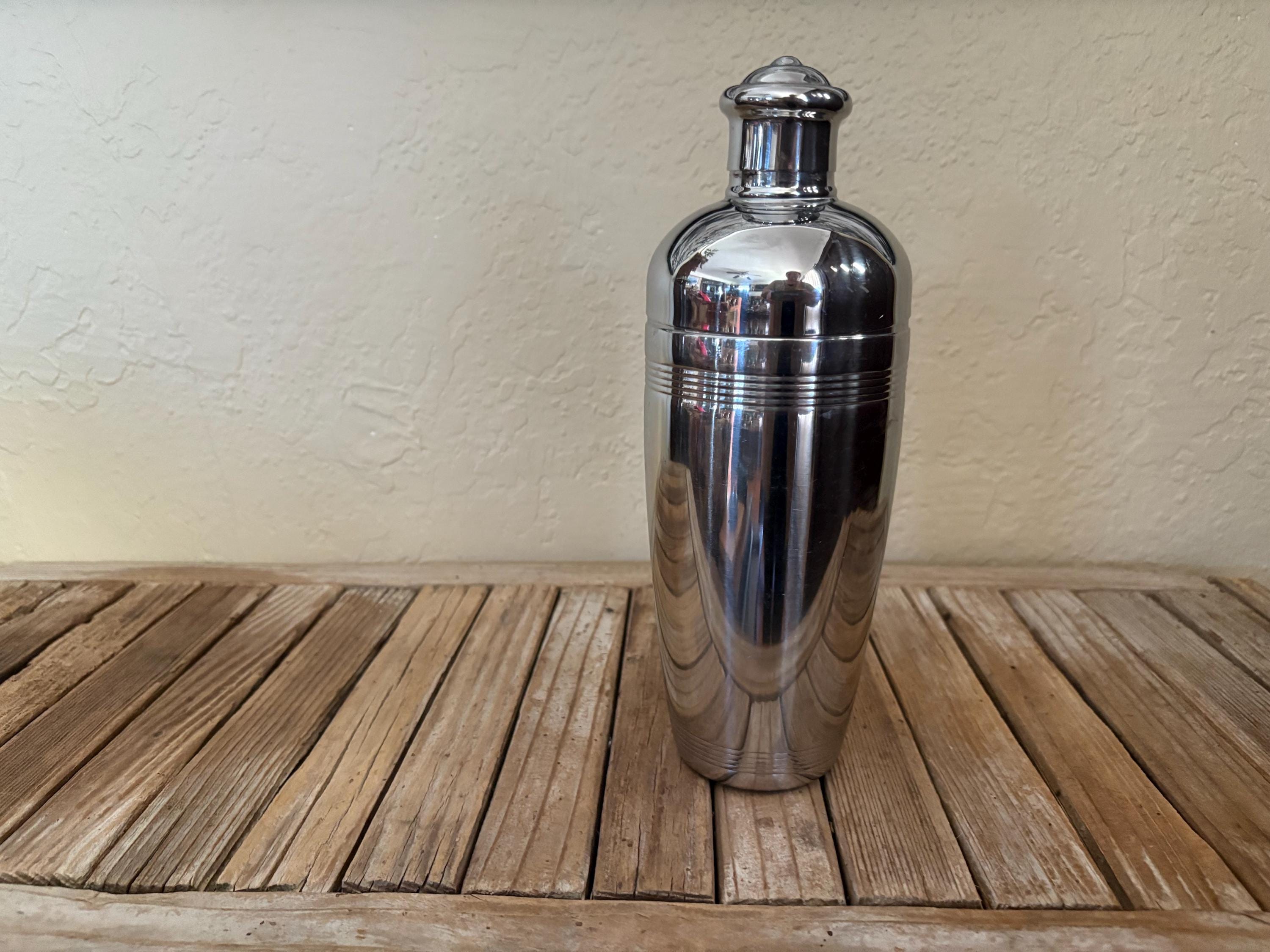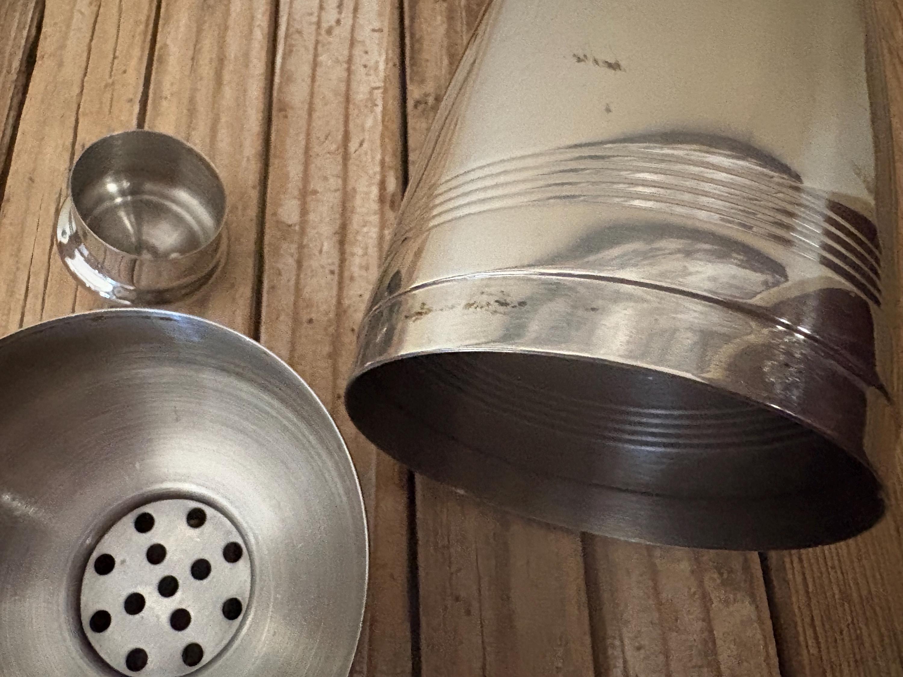 Vintage Hampton Forge 18/10 Stainless cocktail shaker. In good condition, normal wear due to age and use. The shaker has surface scrapes and markings to the finish, along with some slight rust on the inside rim, please see pictures. The lids are very fitted and tight. A beautiful piece to add to your bar for the upcoming holidays.