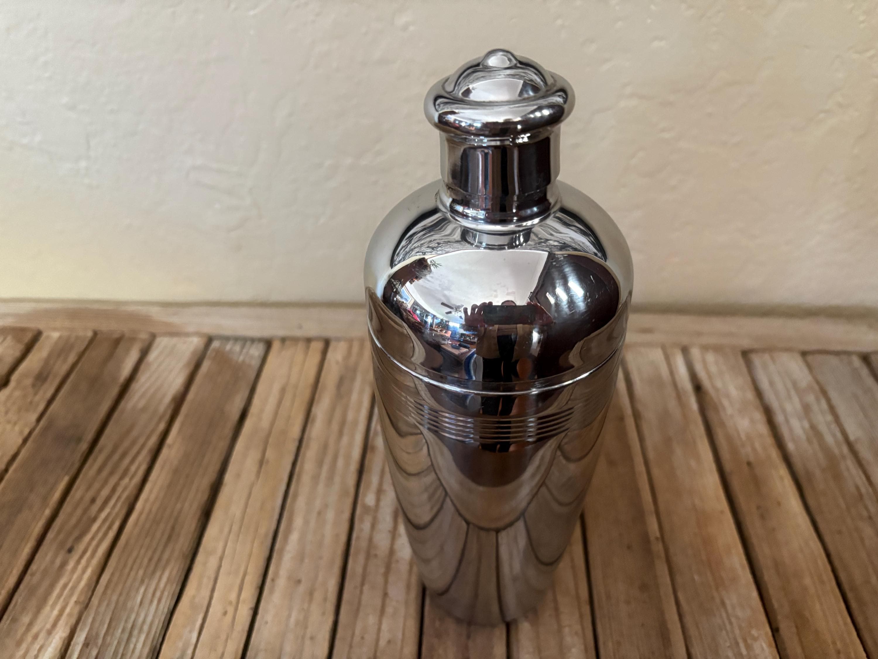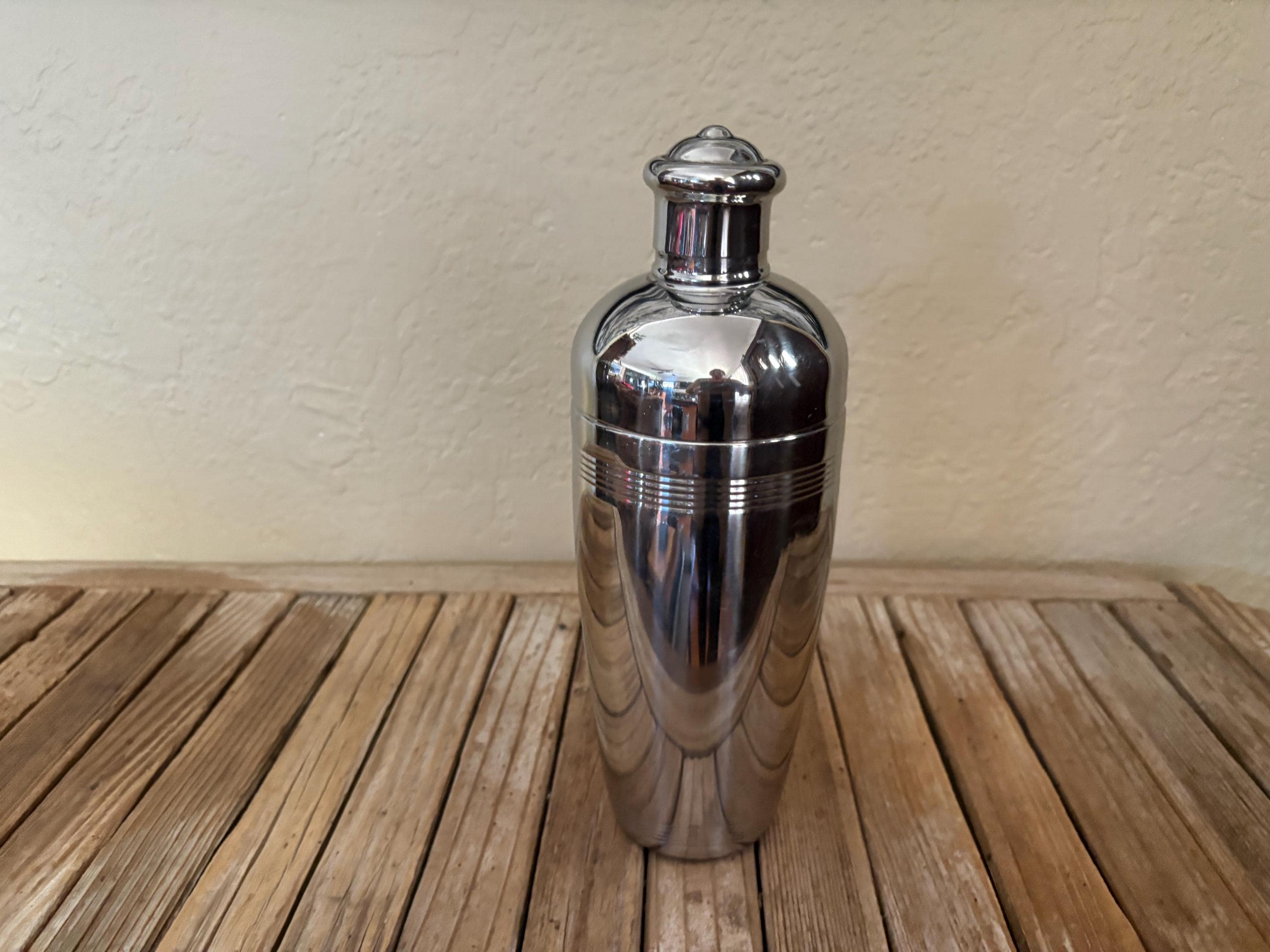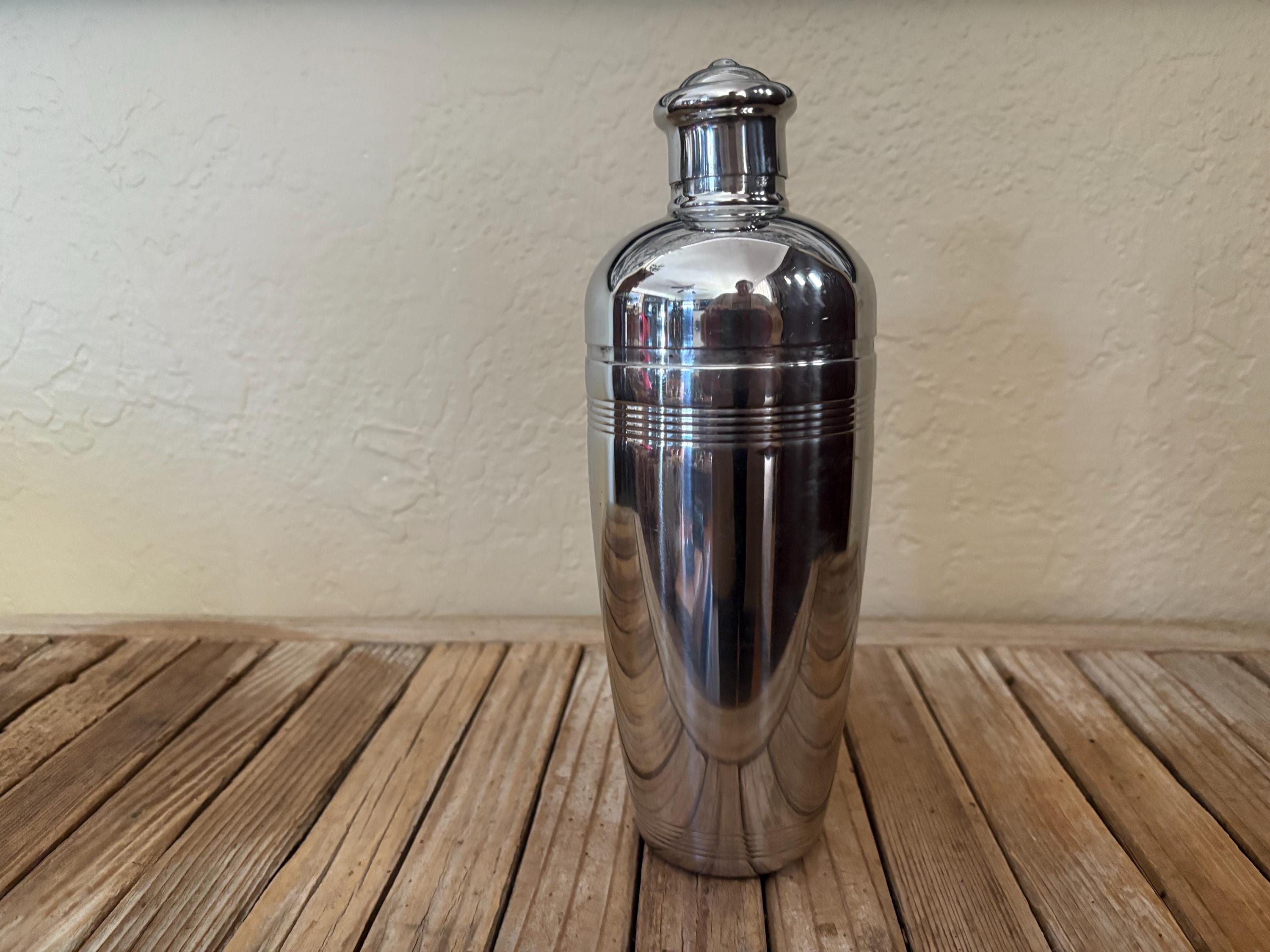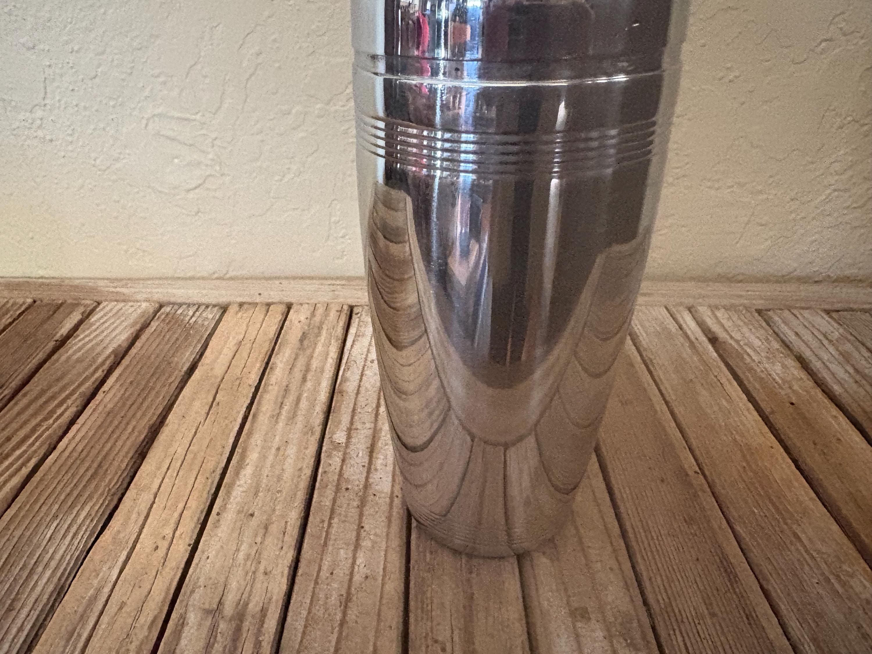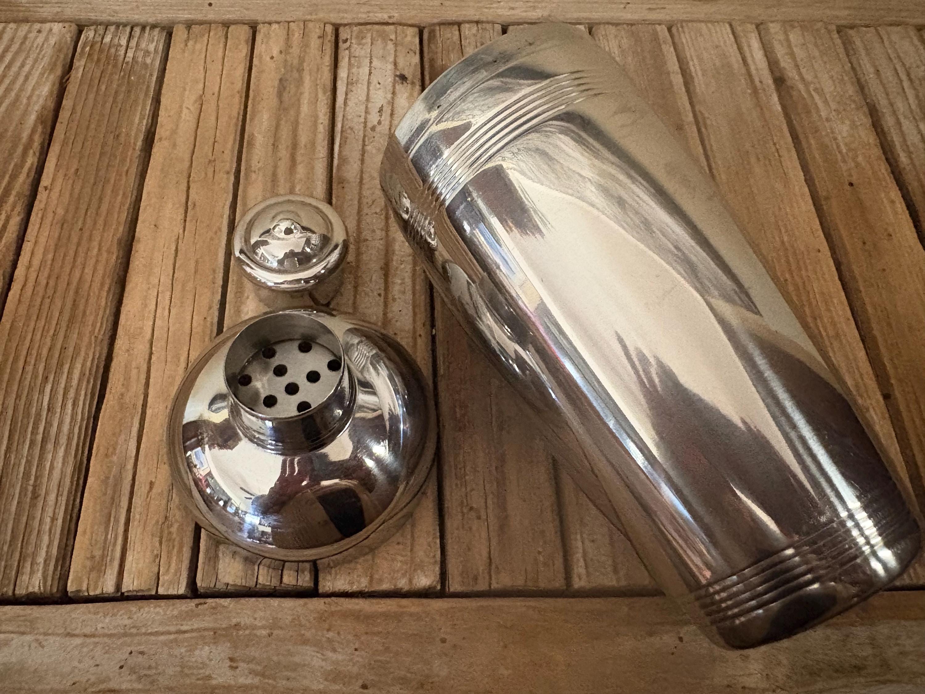 Vintage Hampton Forge 18/10 Stainless cocktail shaker. In good condition, normal wear due to age and use. The shaker has surface scrapes and markings to the finish, along with some slight rust on the inside rim, please see pictures. The lids are very fitted and tight. A beautiful piece to add to your bar for the upcoming holidays.