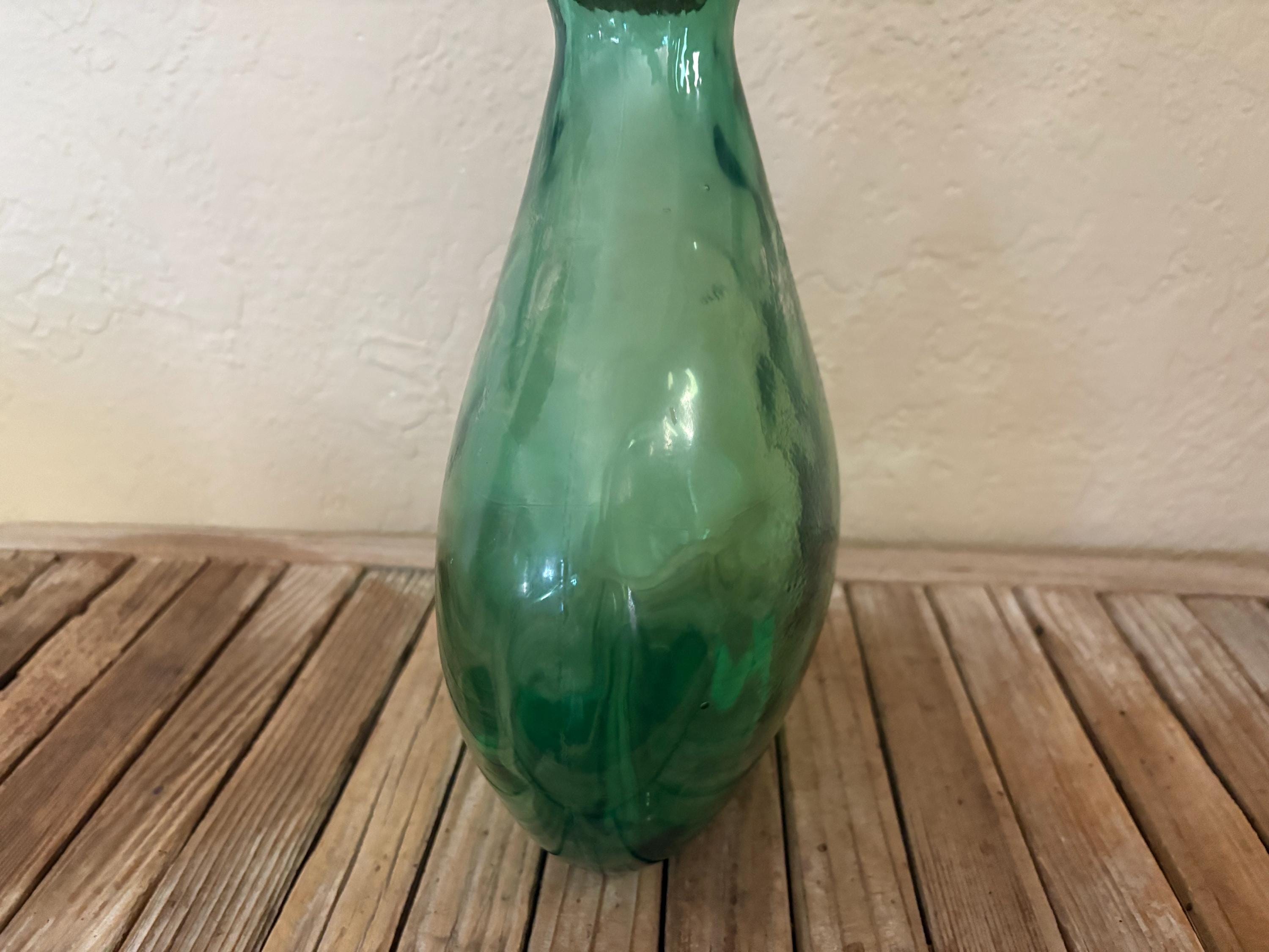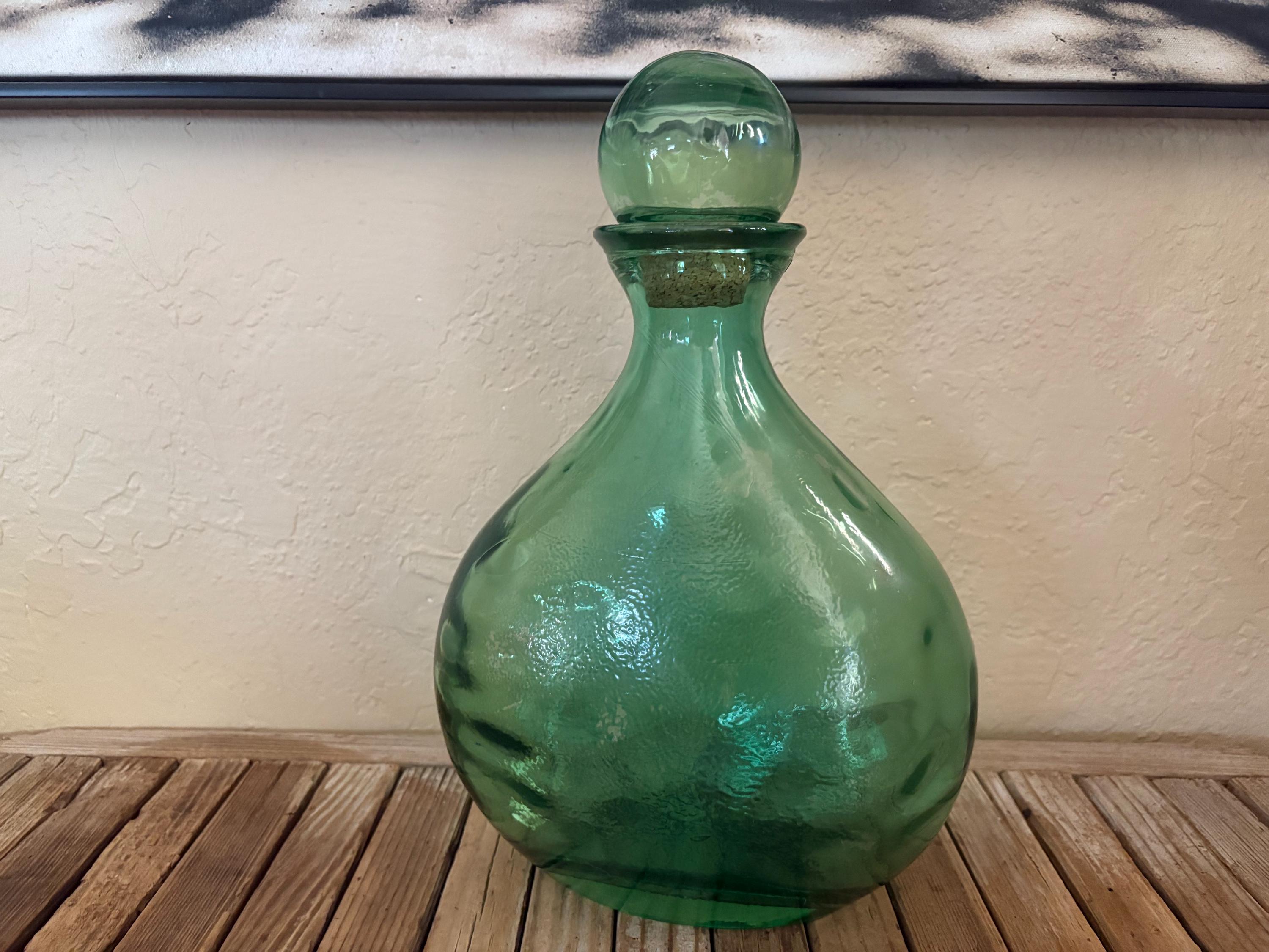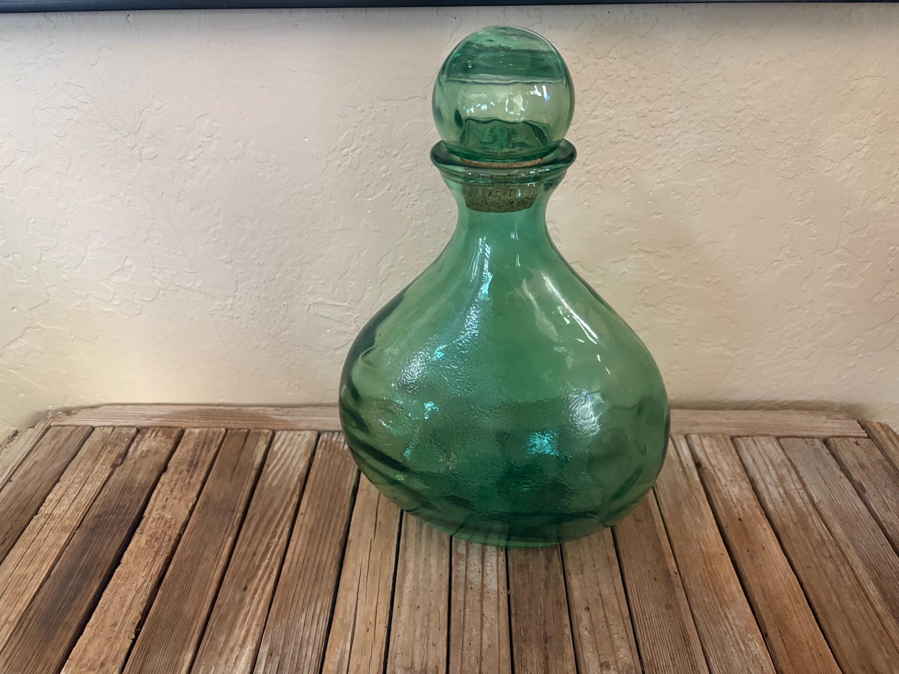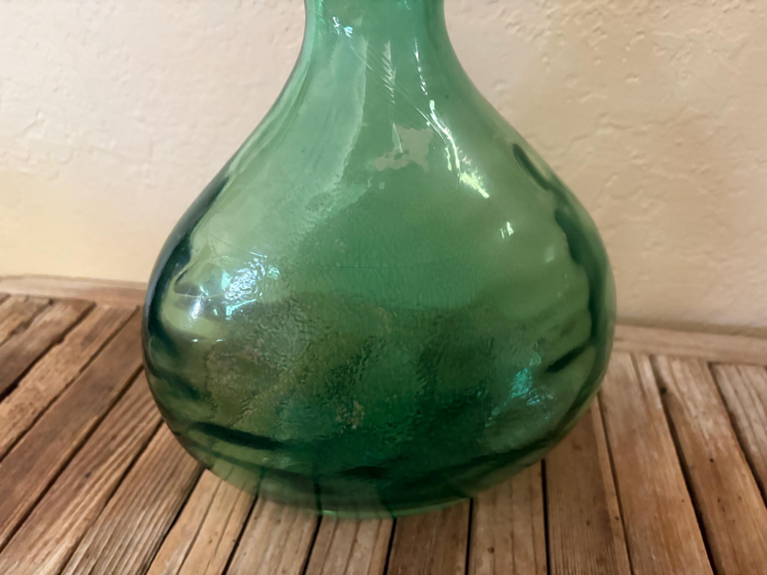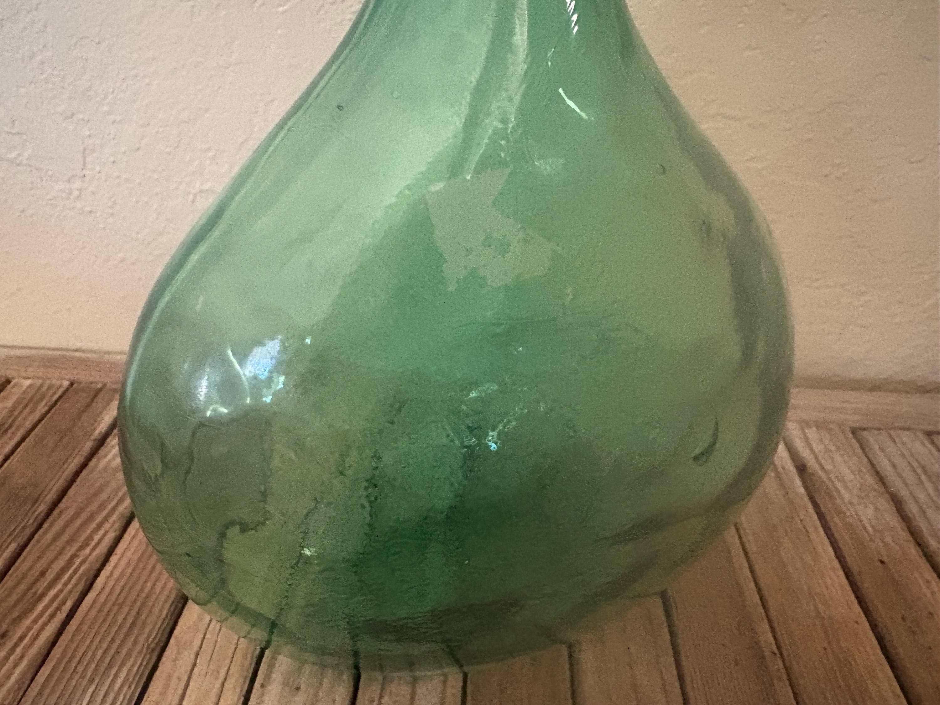 Vintage large green glass bottle. In good condition, normal wear due to age and use. The bottle has surface scrapes and markings, please see pictures. I believe this bottle was flash painted, please see pictures. A cool old bottle to use as display, add to a collection or to use as a oil jar.