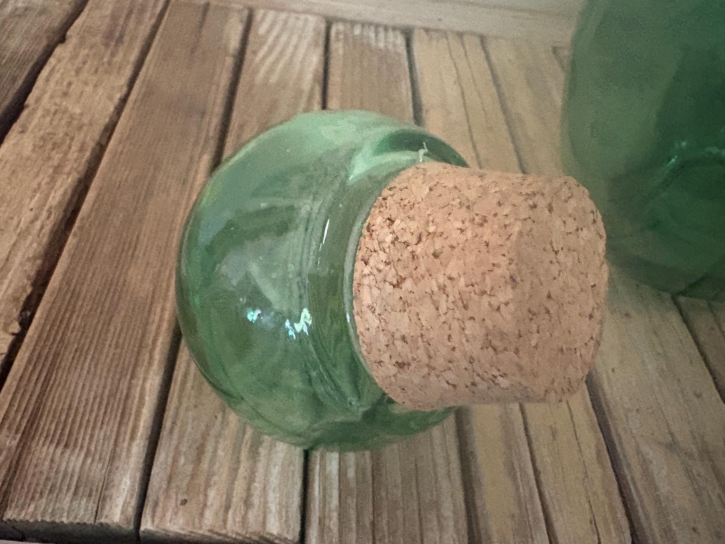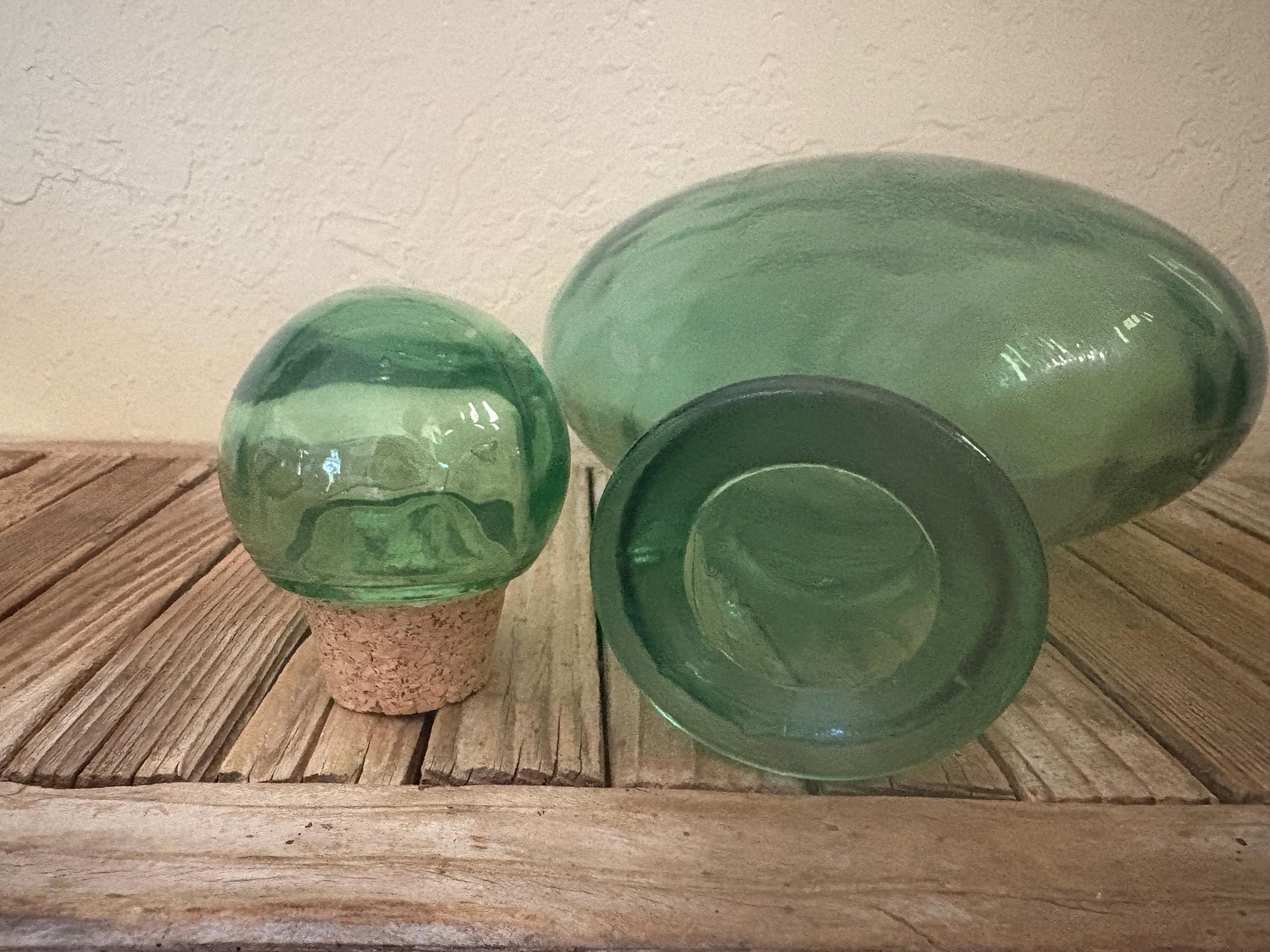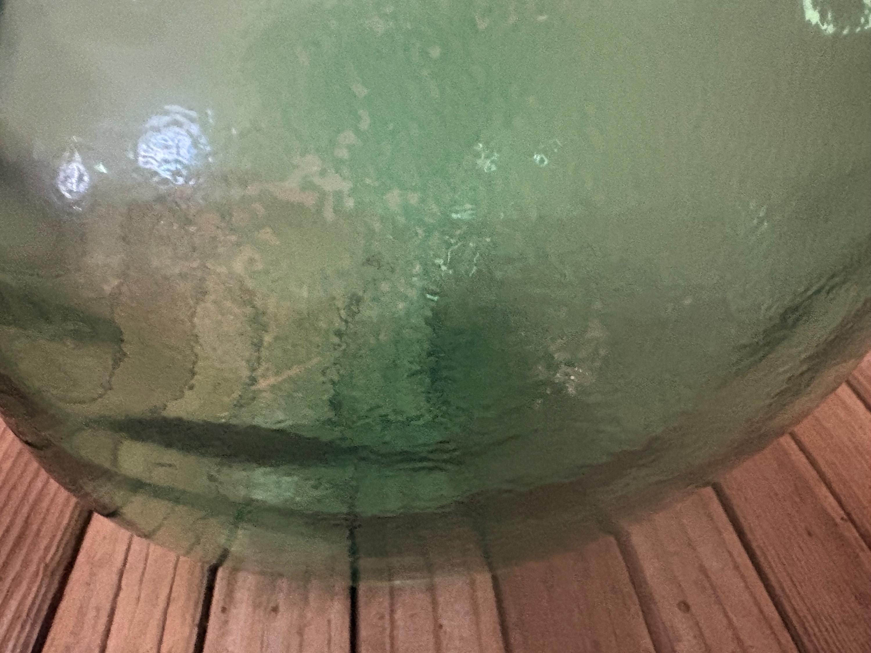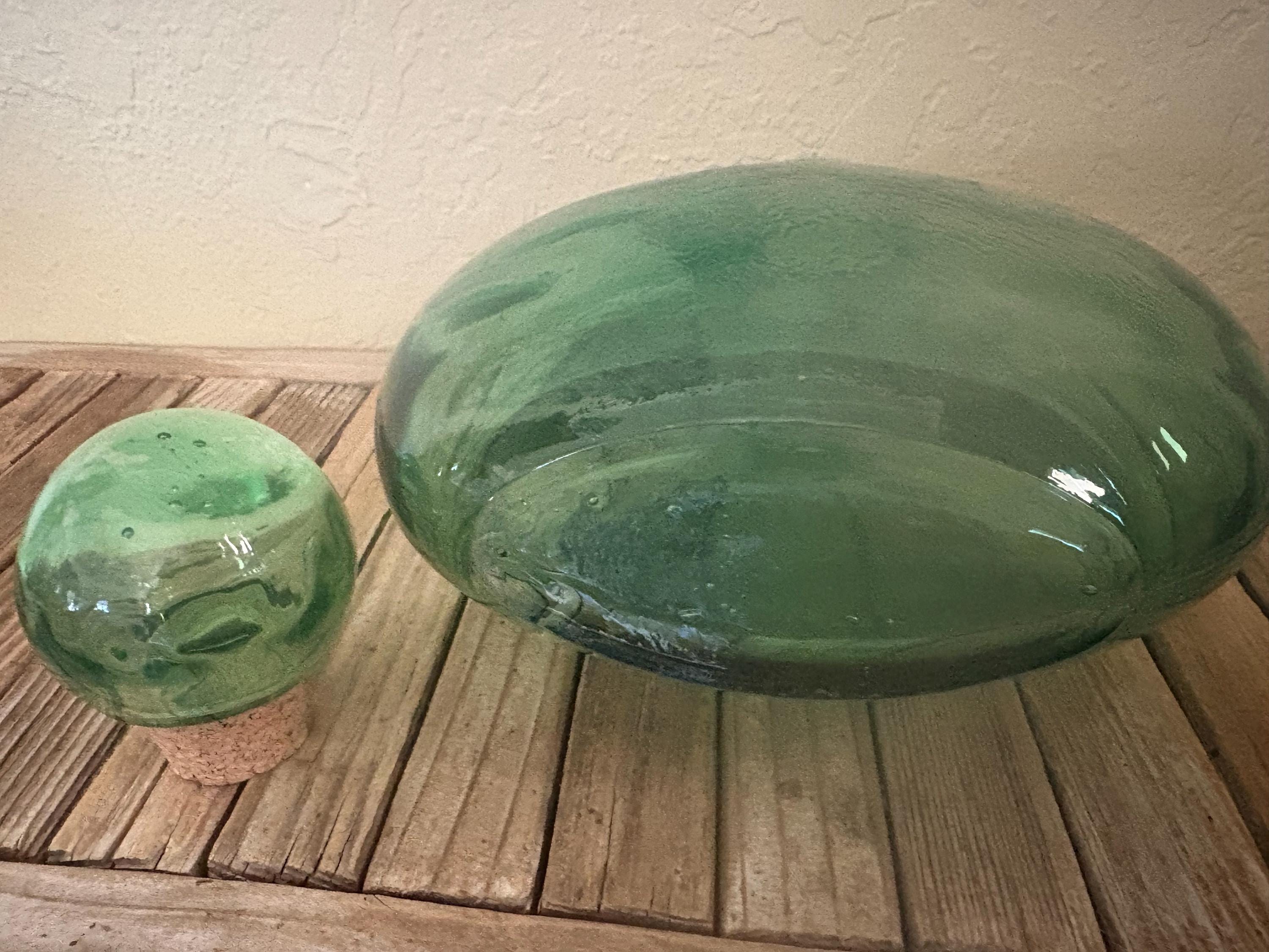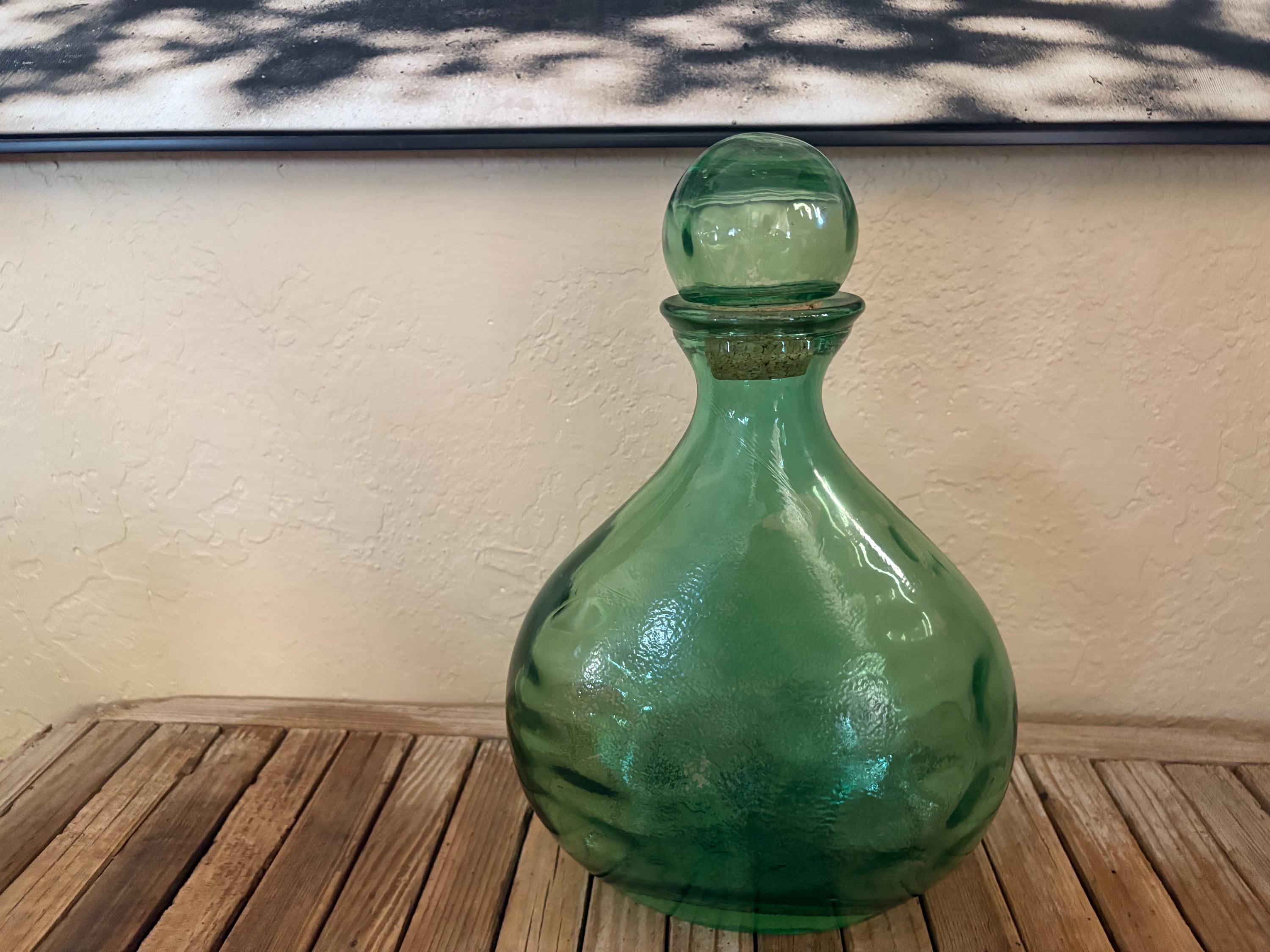 Vintage large green glass bottle. In good condition, normal wear due to age and use. The bottle has surface scrapes and markings, please see pictures. I believe this bottle was flash painted, please see pictures. A cool old bottle to use as display, add to a collection or to use as a oil jar.