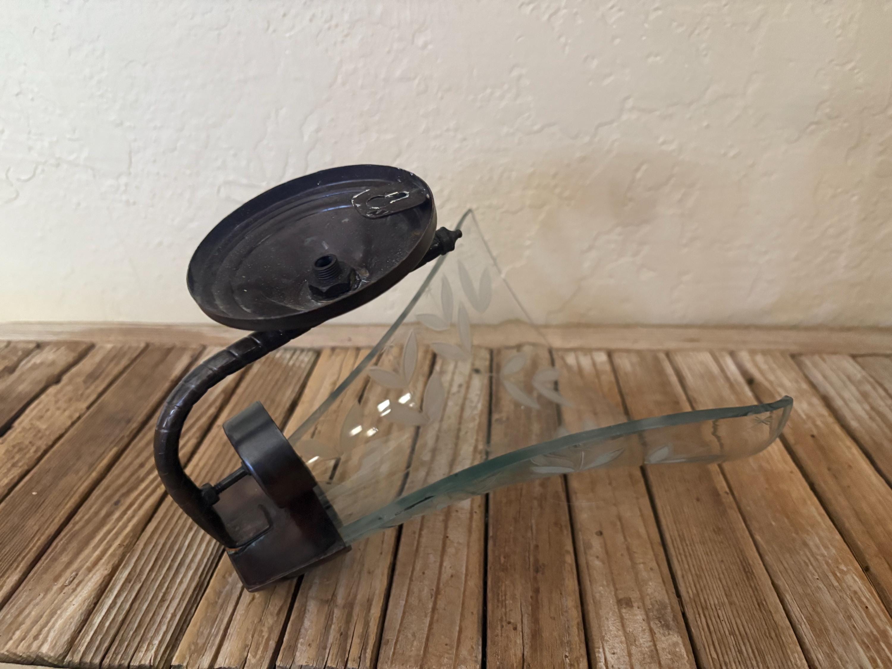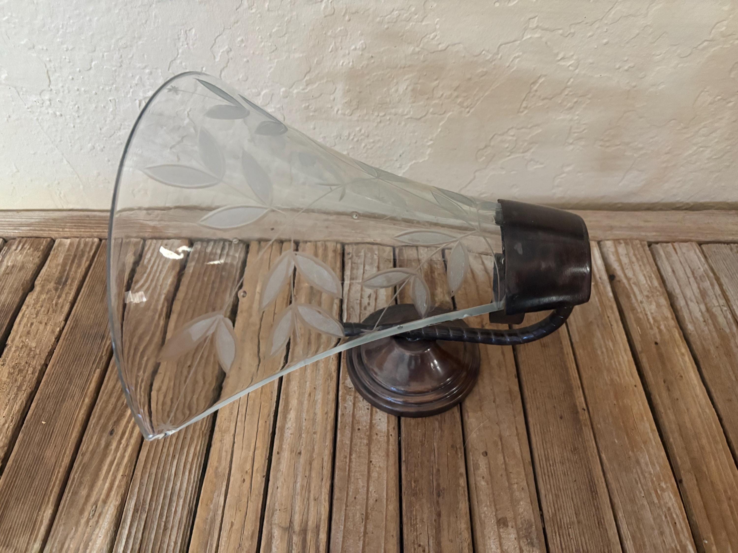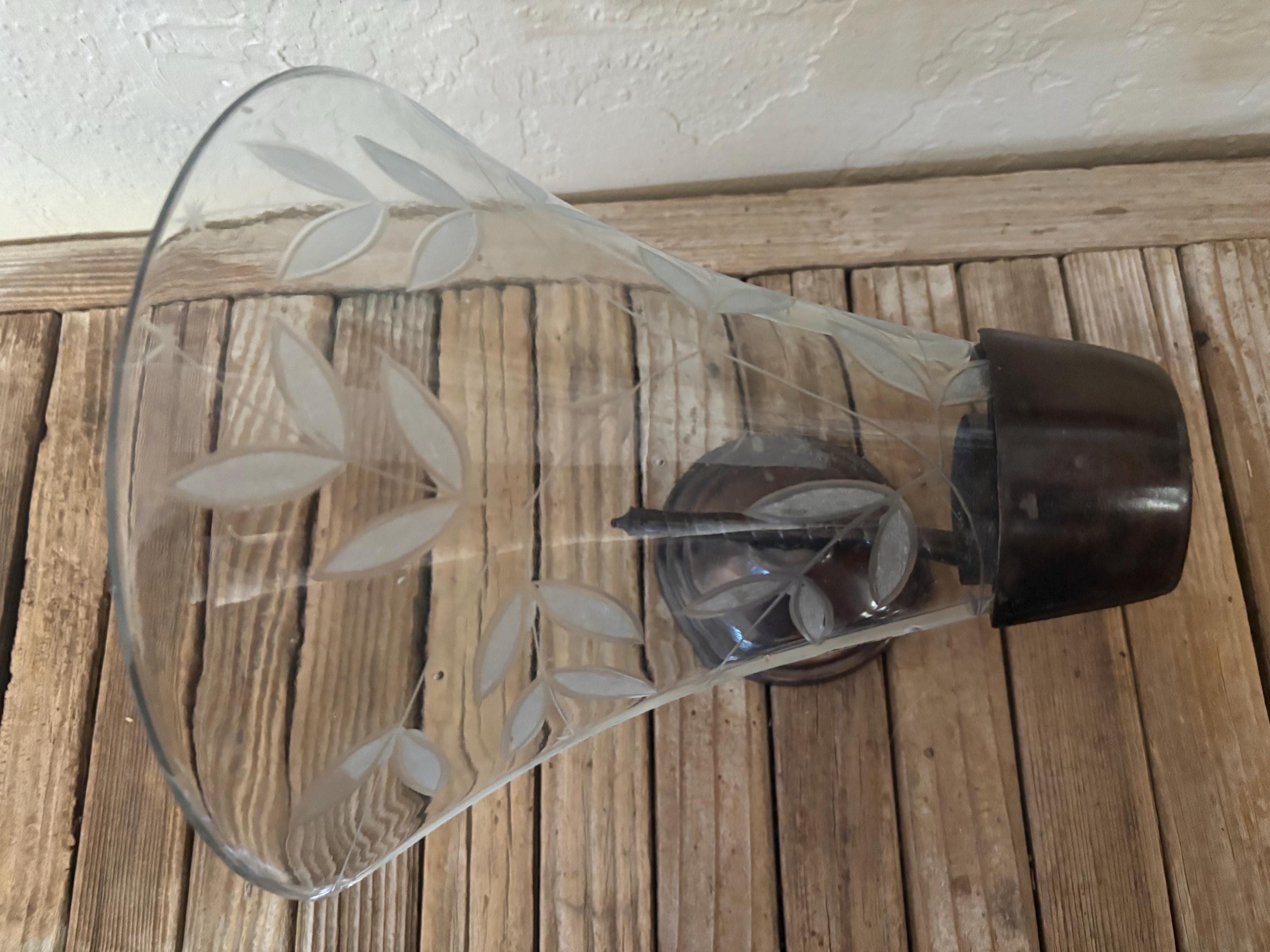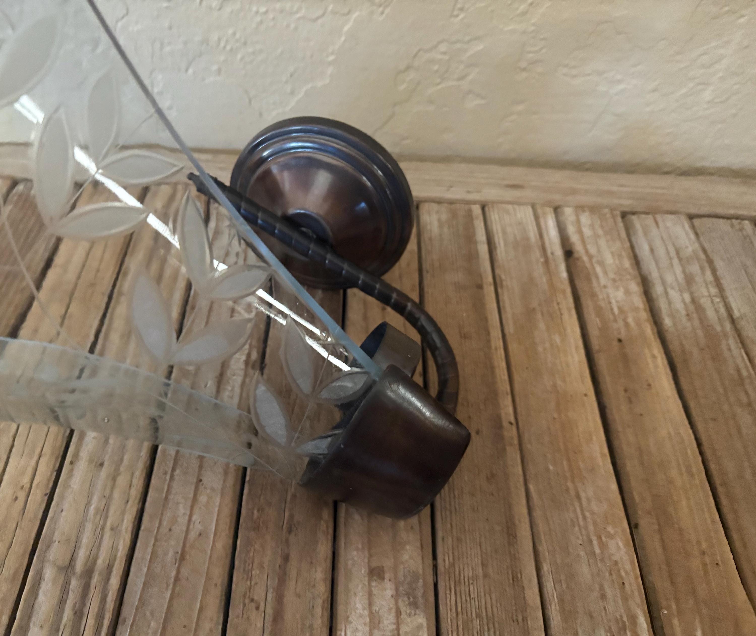 Vintage etched glass and bronze metal wall mount candle fixture. In great vintage condition, normal wear due to age and use. The metal has surface scrapes and markings throughout to the finish, please see picture. A cool piece with great color to add to your home or office.