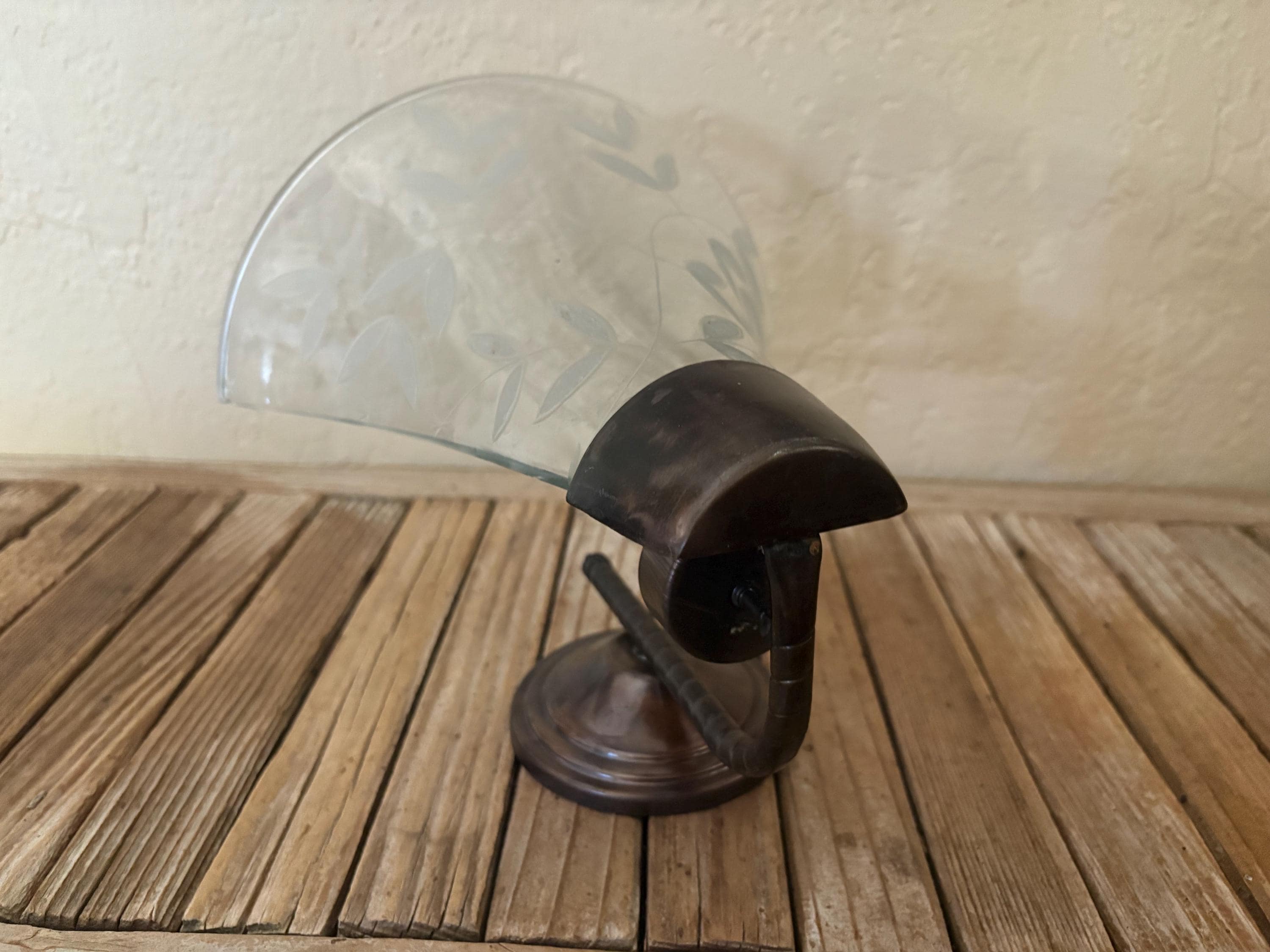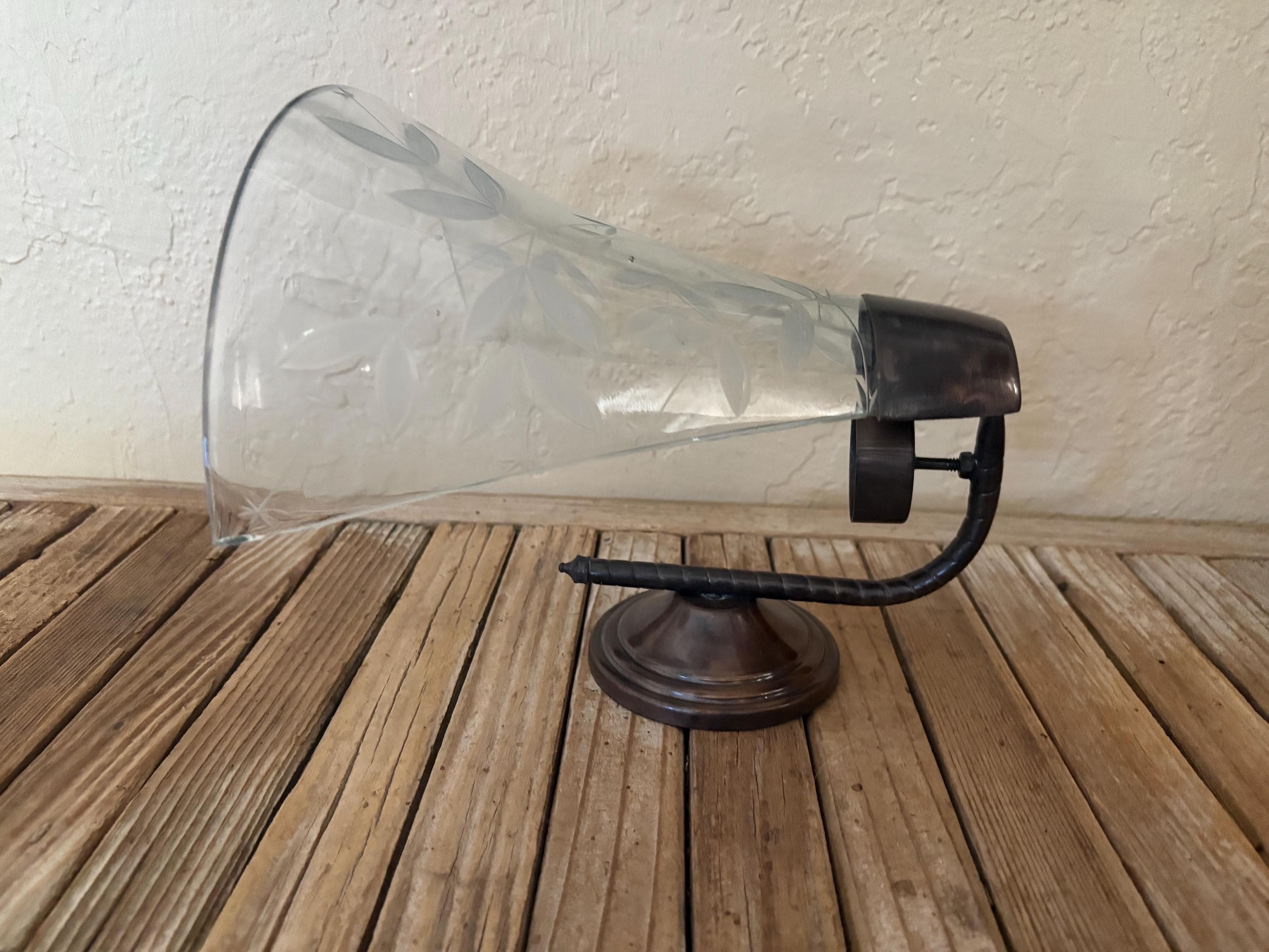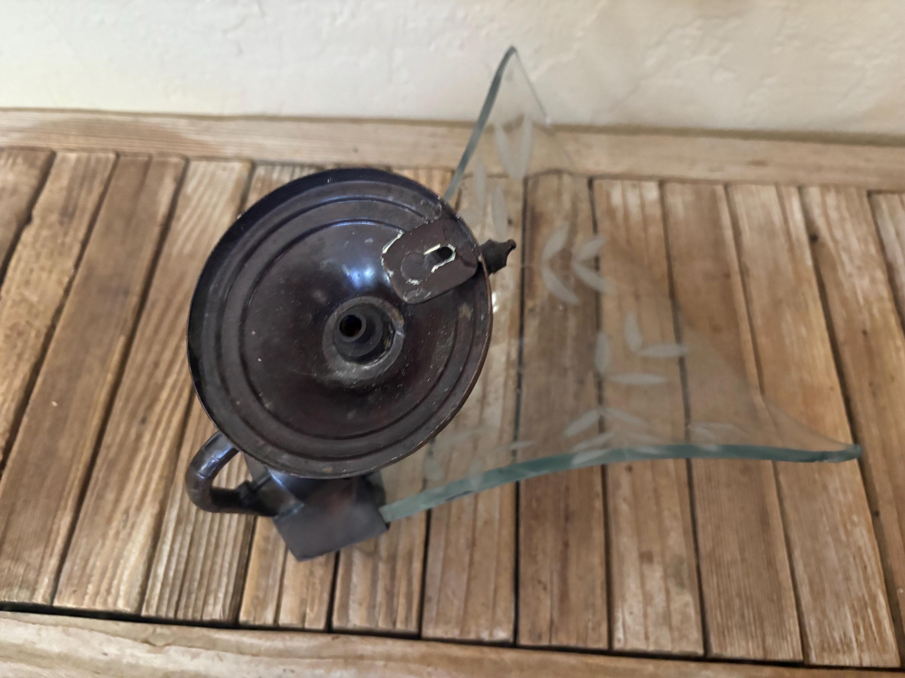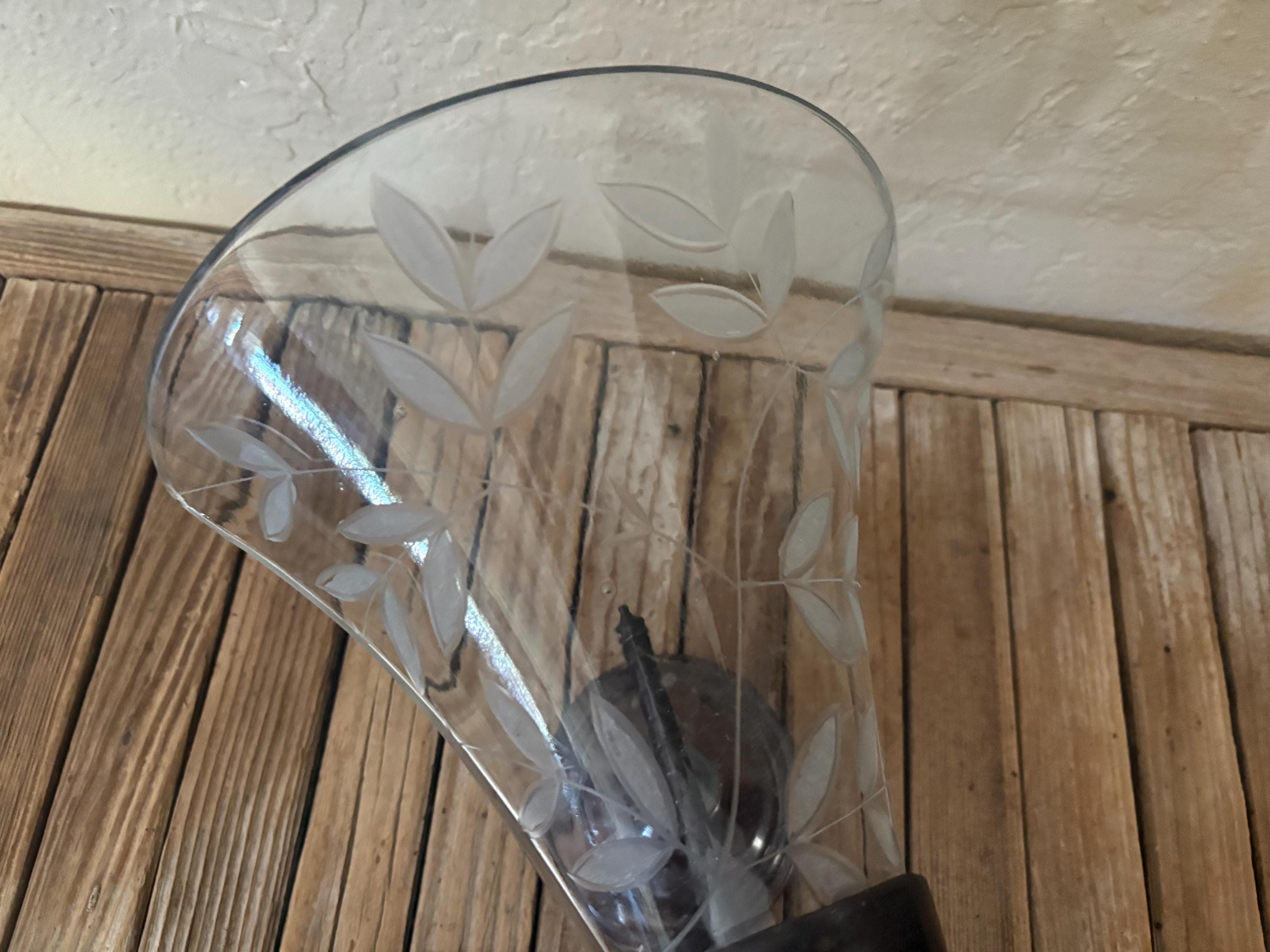 Vintage etched glass and bronze metal wall mount candle fixture. In great vintage condition, normal wear due to age and use. The metal has surface scrapes and markings throughout to the finish, please see picture. A cool piece with great color to add to your home or office.