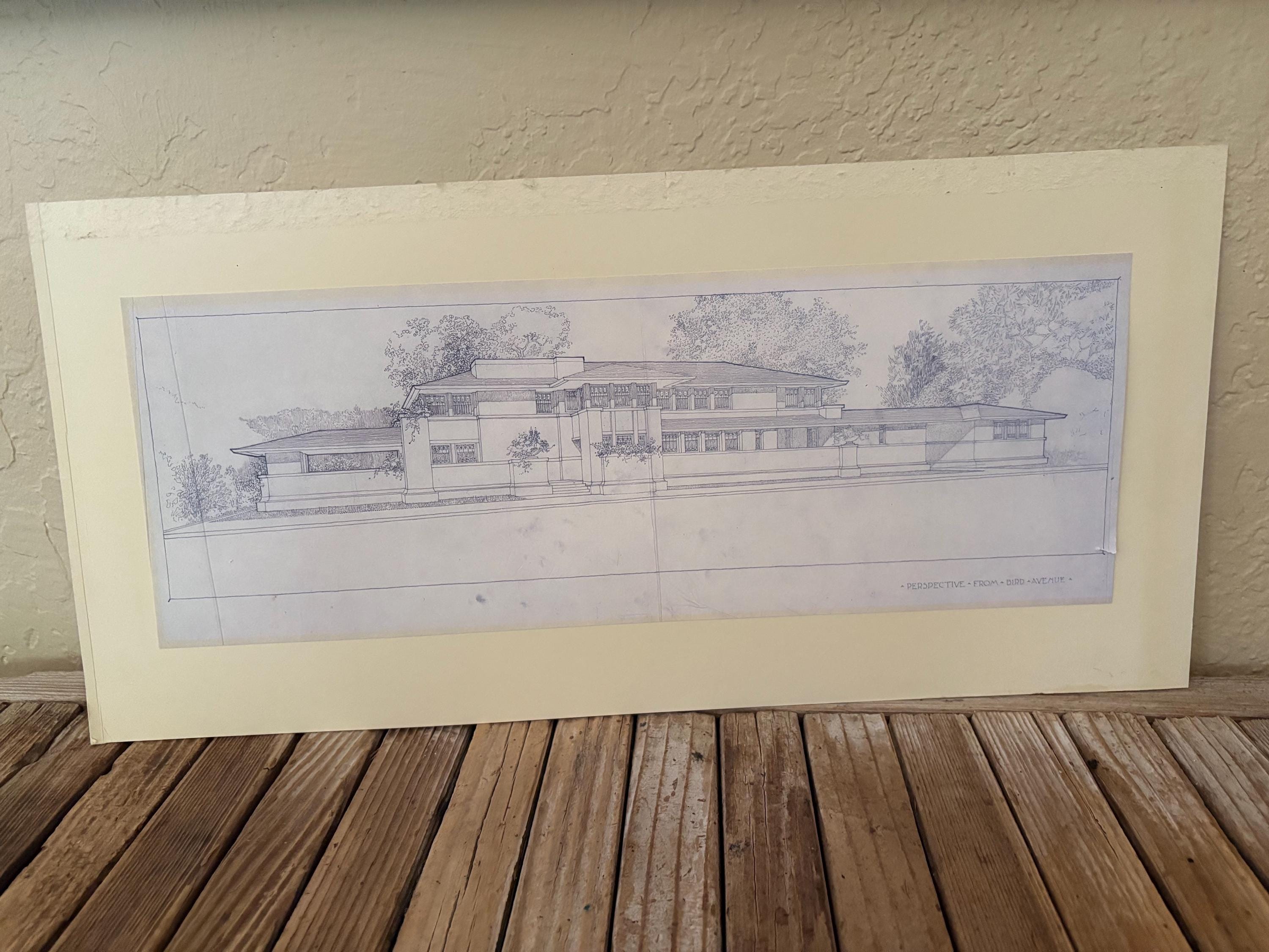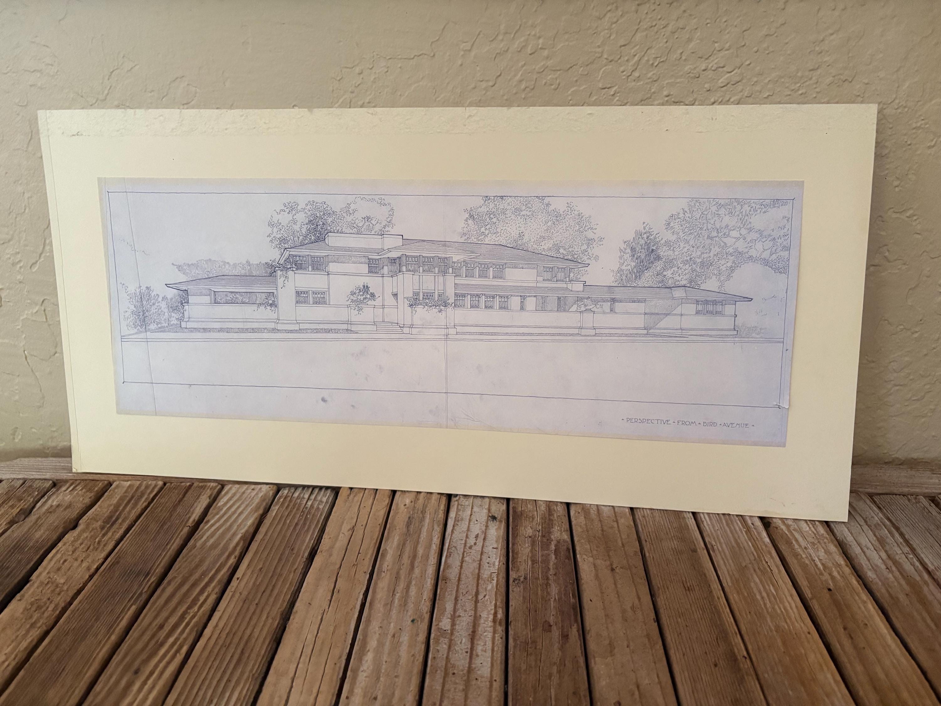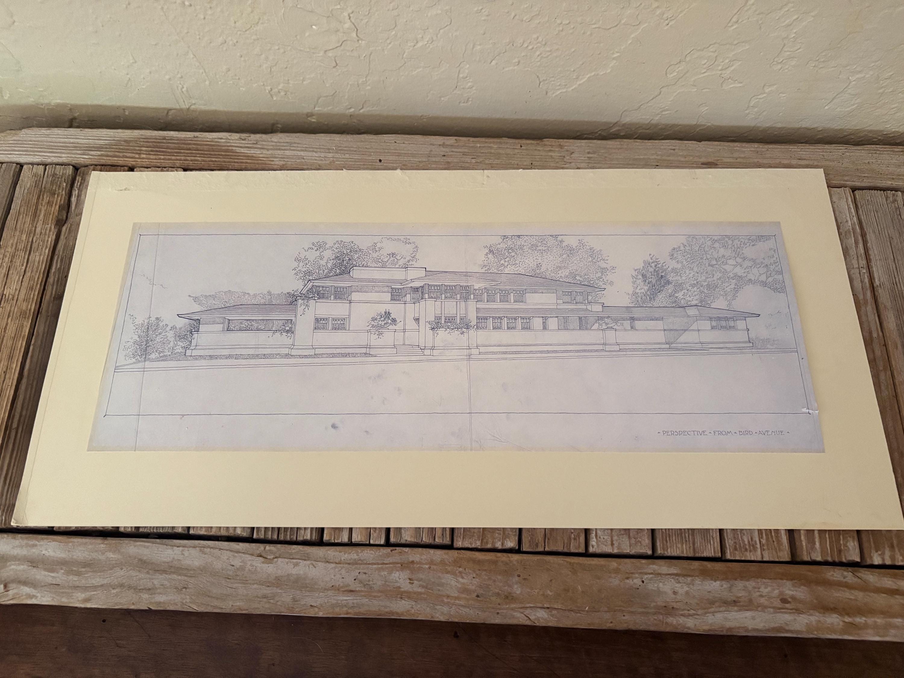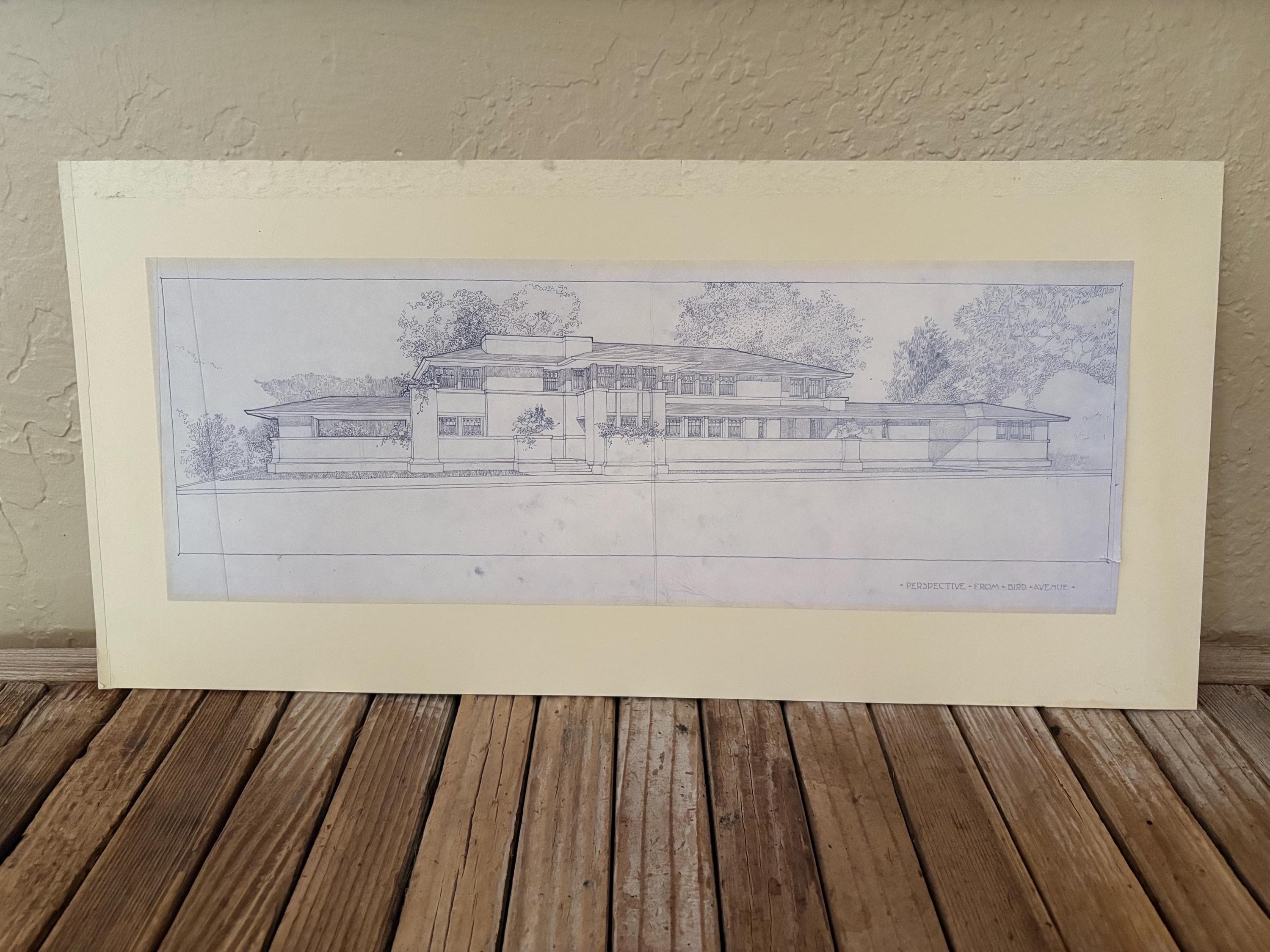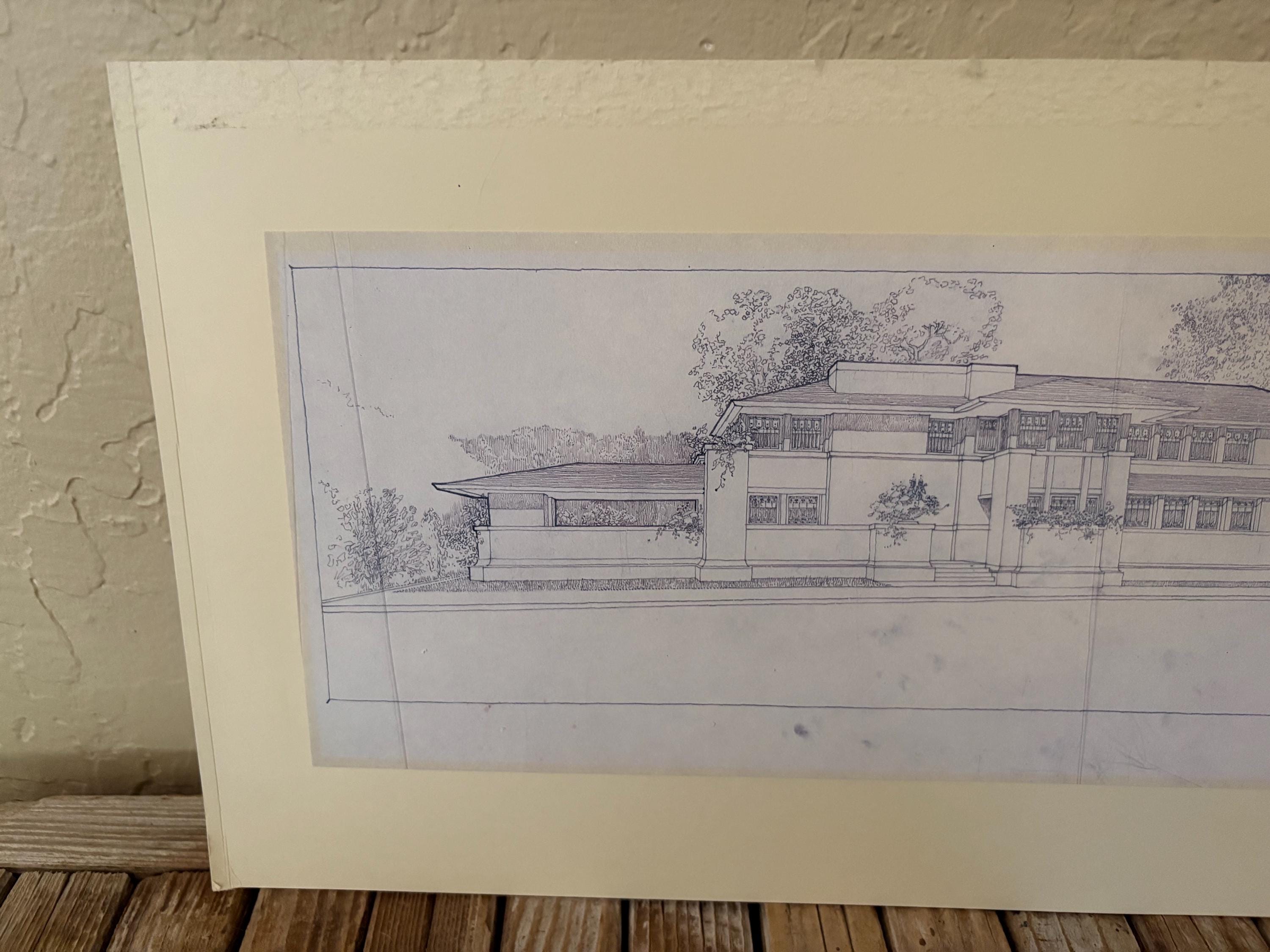 Antique Melvin H. Sykes black and white print. In good, vintage condition, normal wear due to age and use. The piece ihas surface markings. The matting is warped near the base, please see pictures. I believe this is an original architectural rendering, please email me any questions prior to purchase about this piece. A beautiful piece by Frank Lloyd Wright to give it as a gift or add to a collection.