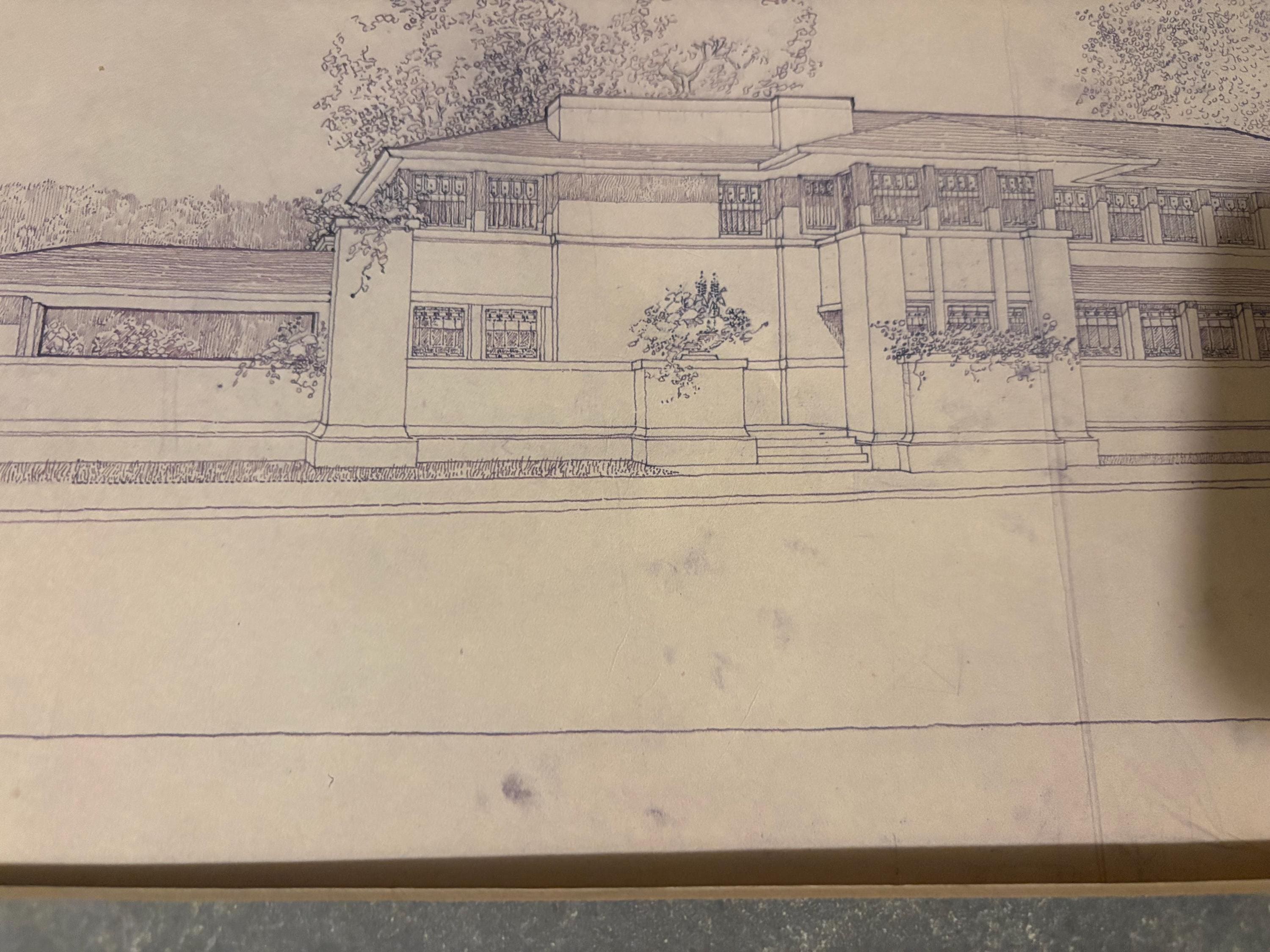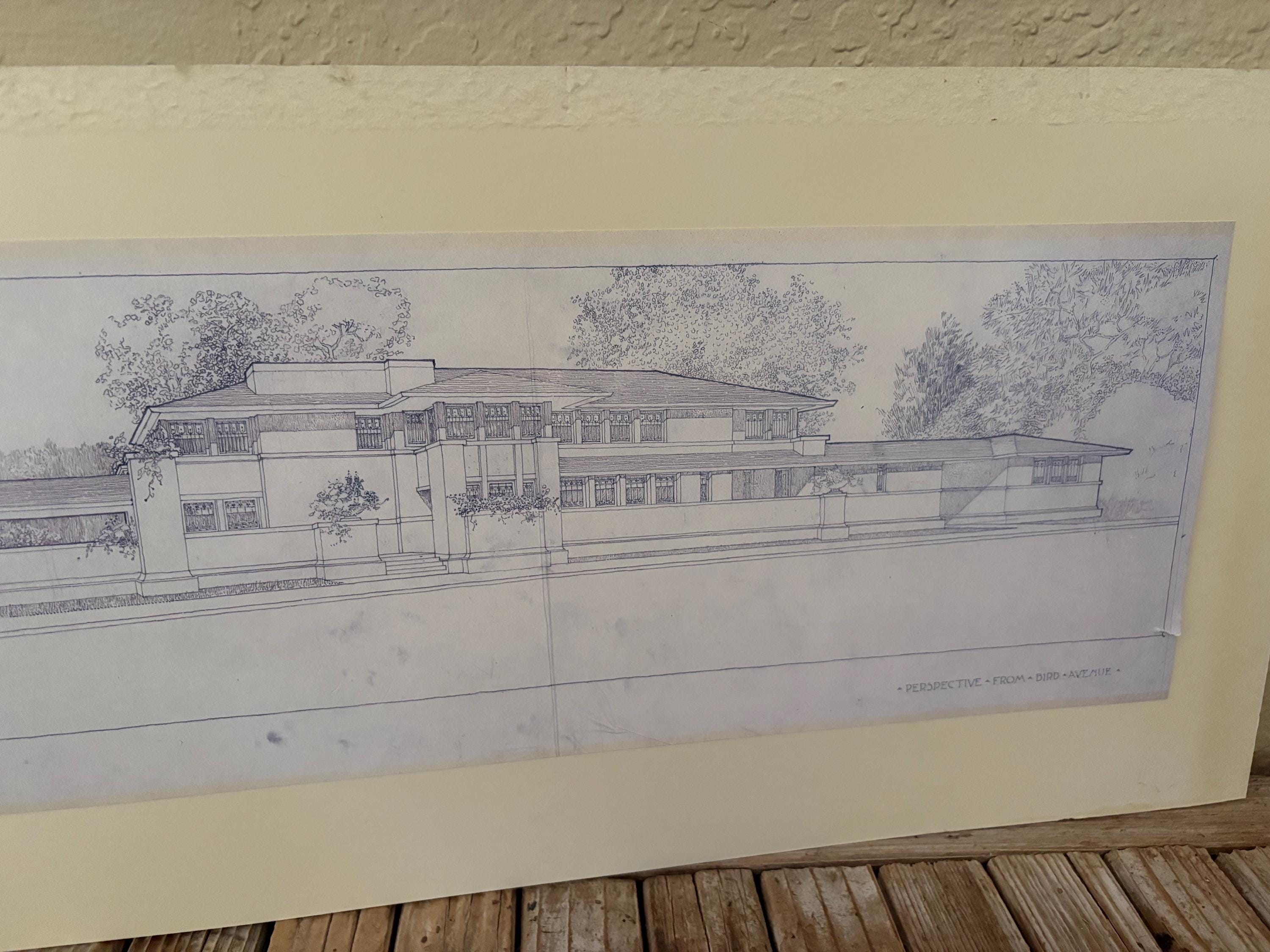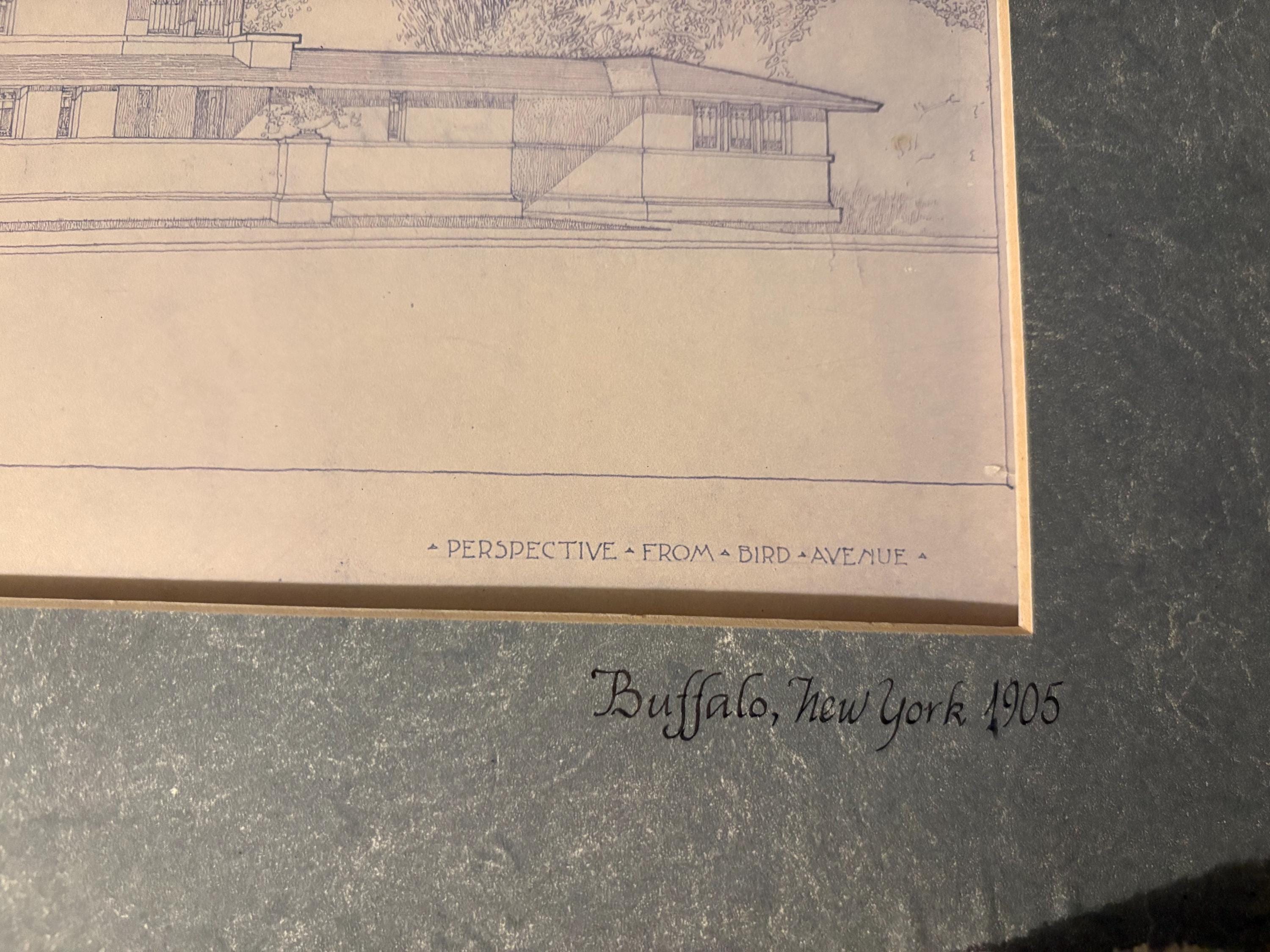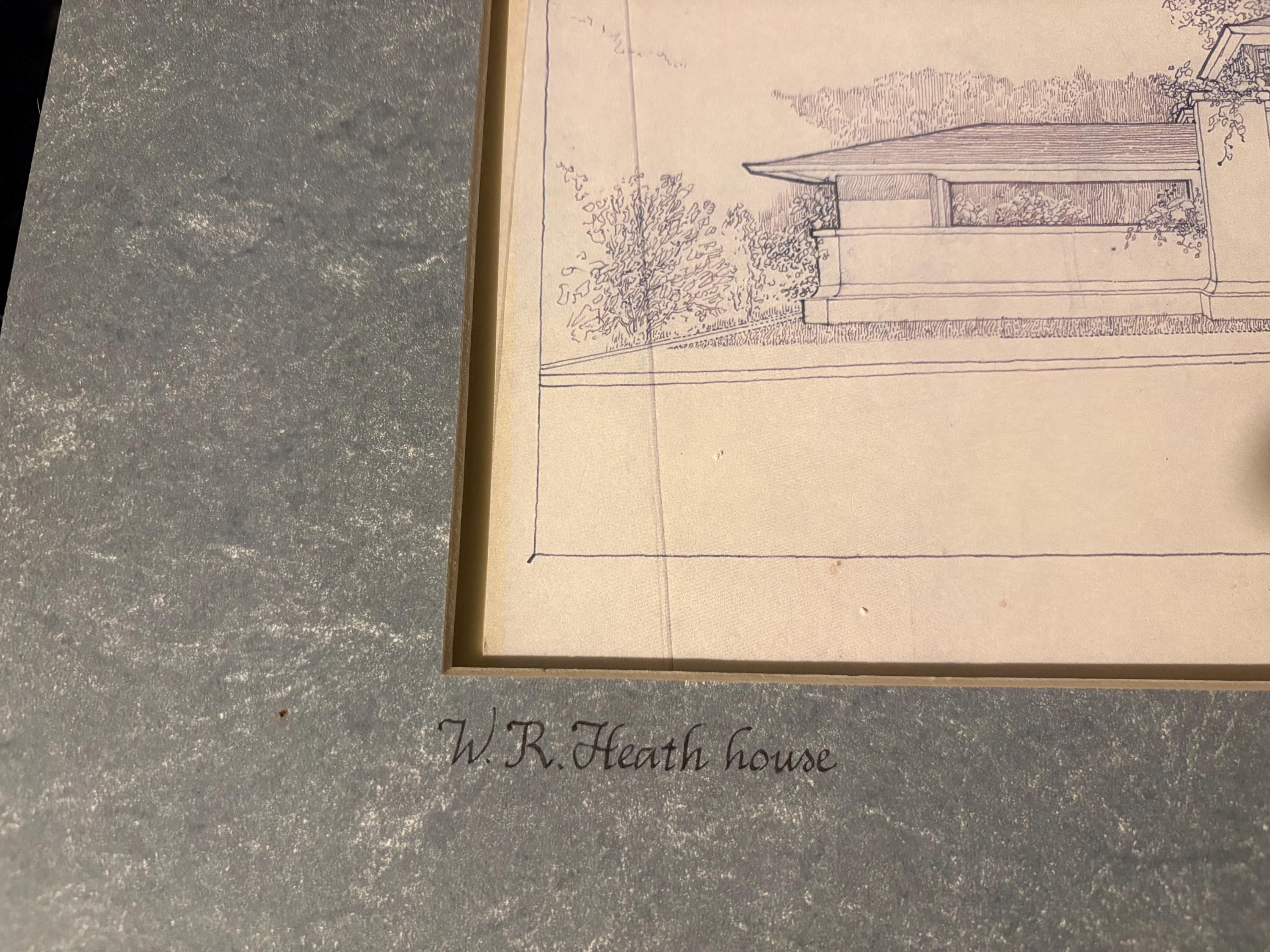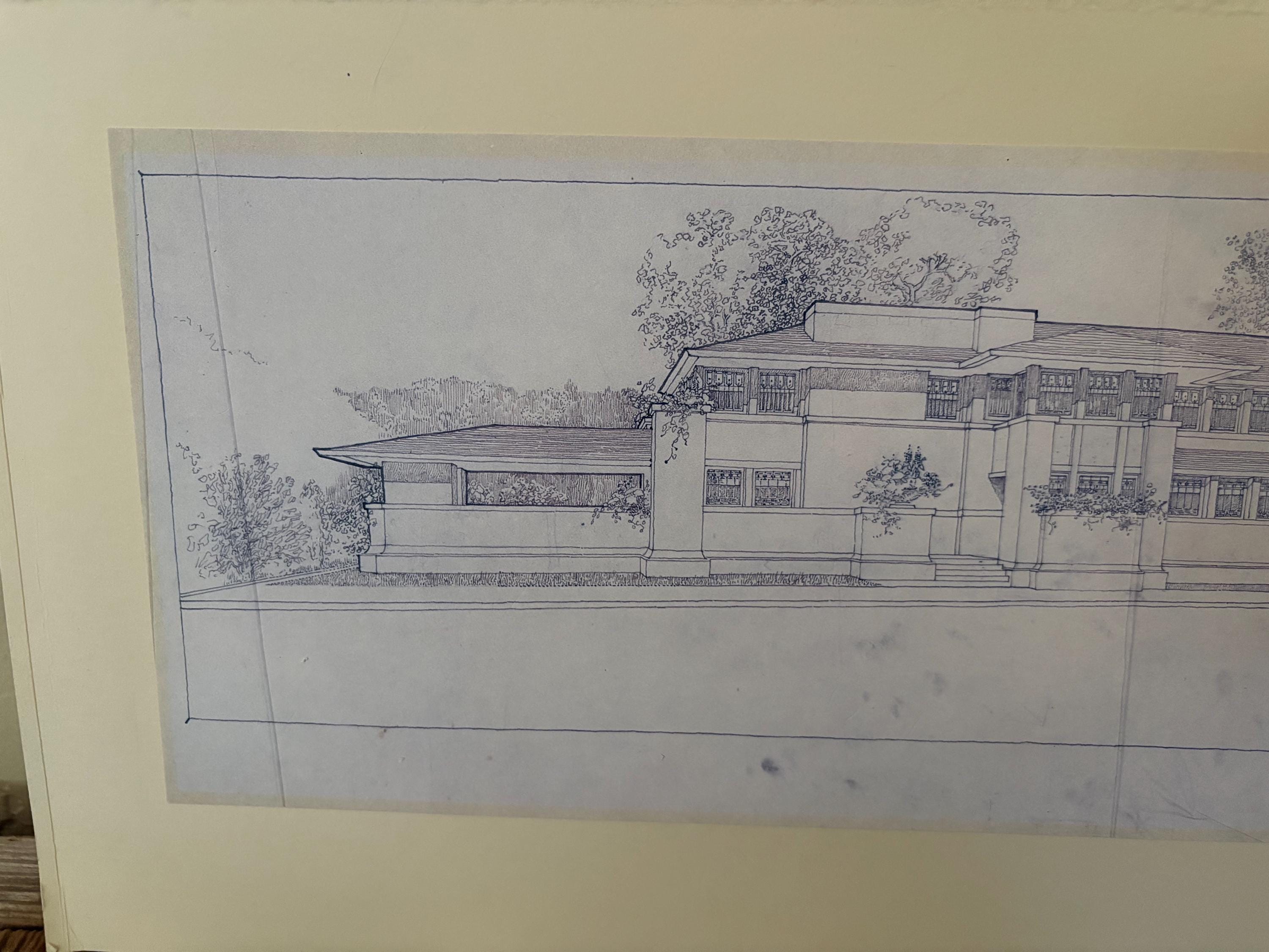 Antique Melvin H. Sykes black and white print. In good, vintage condition, normal wear due to age and use. The piece ihas surface markings. The matting is warped near the base, please see pictures. I believe this is an original architectural rendering, please email me any questions prior to purchase about this piece. A beautiful piece by Frank Lloyd Wright to give it as a gift or add to a collection.