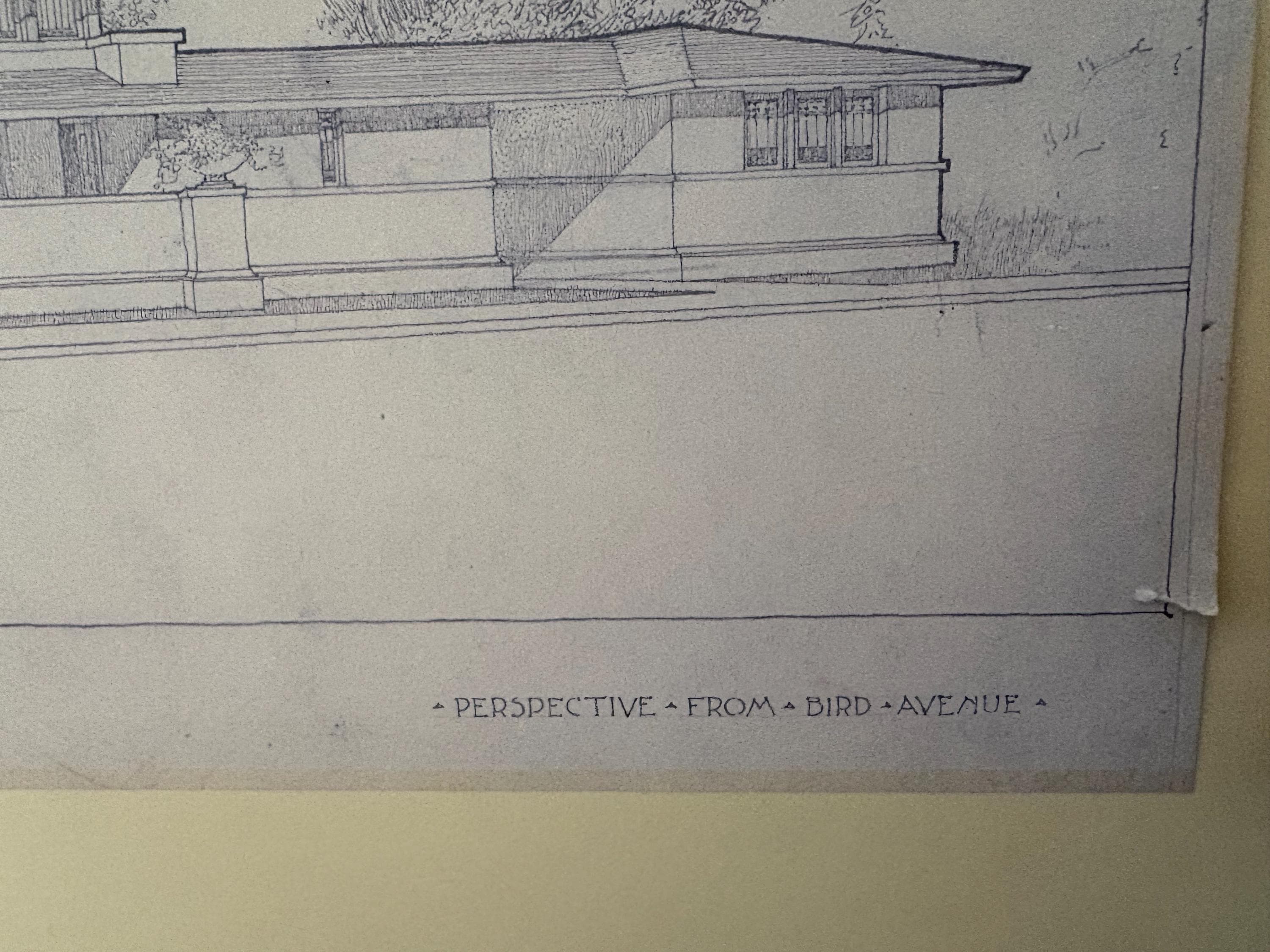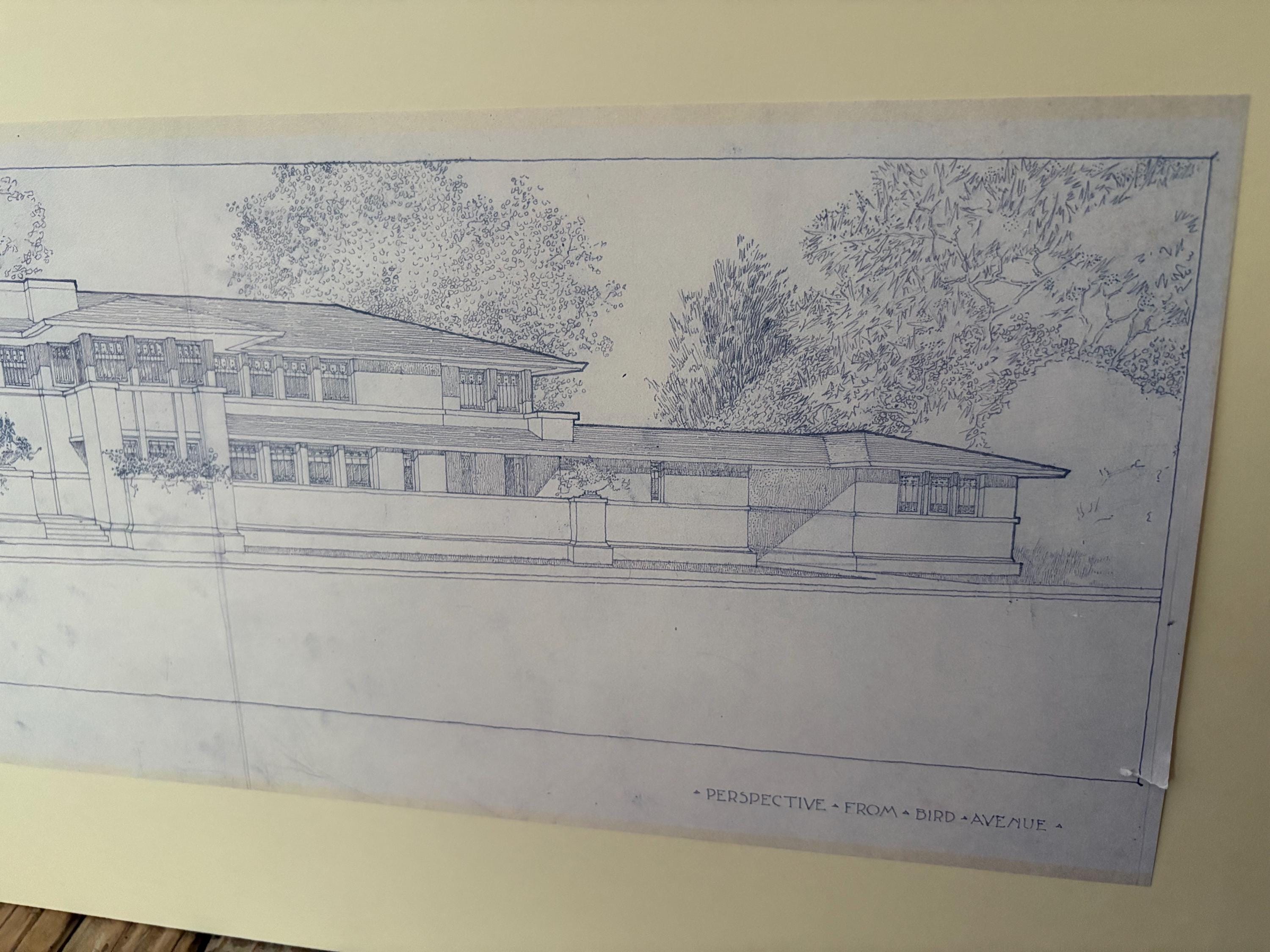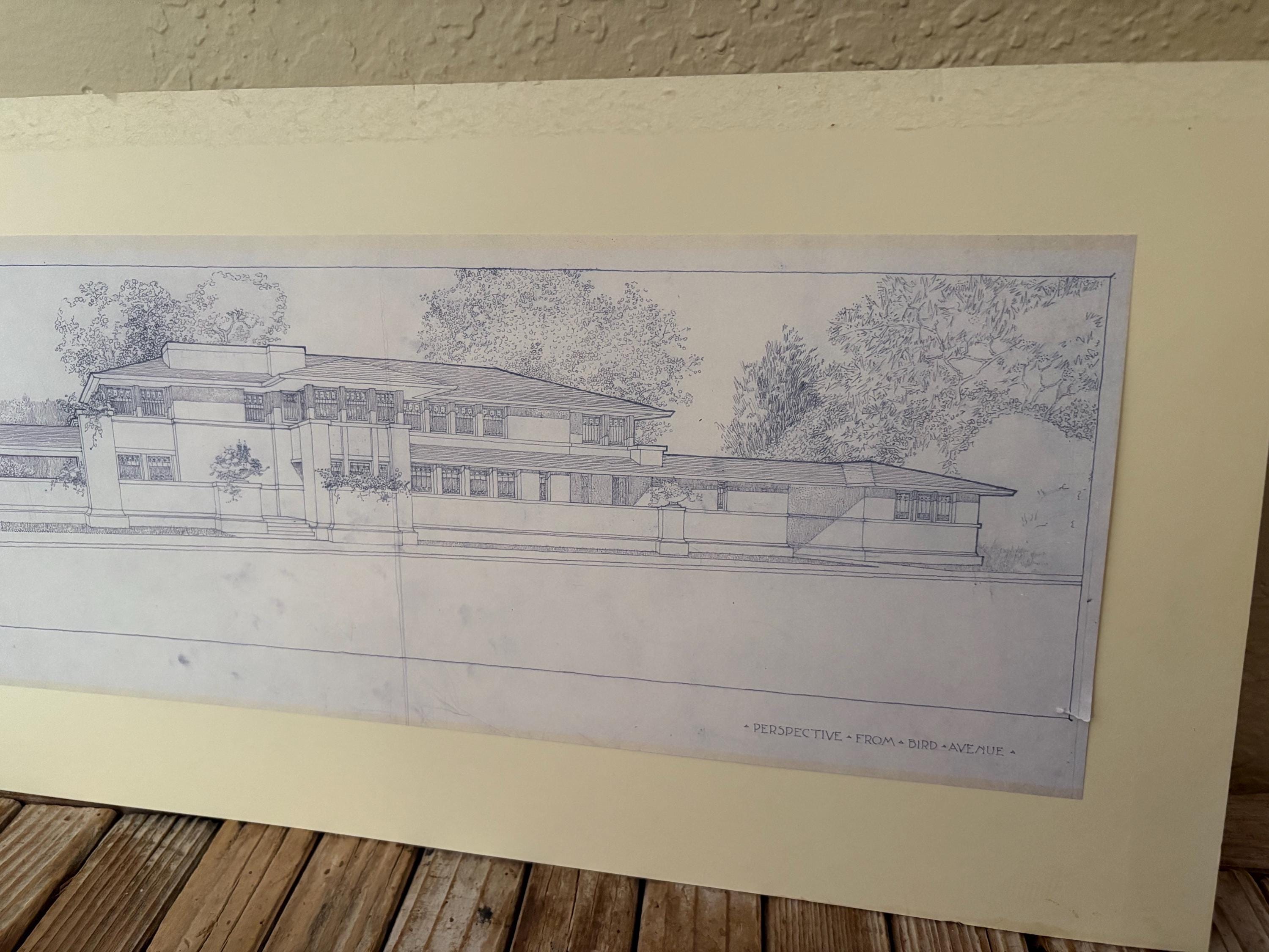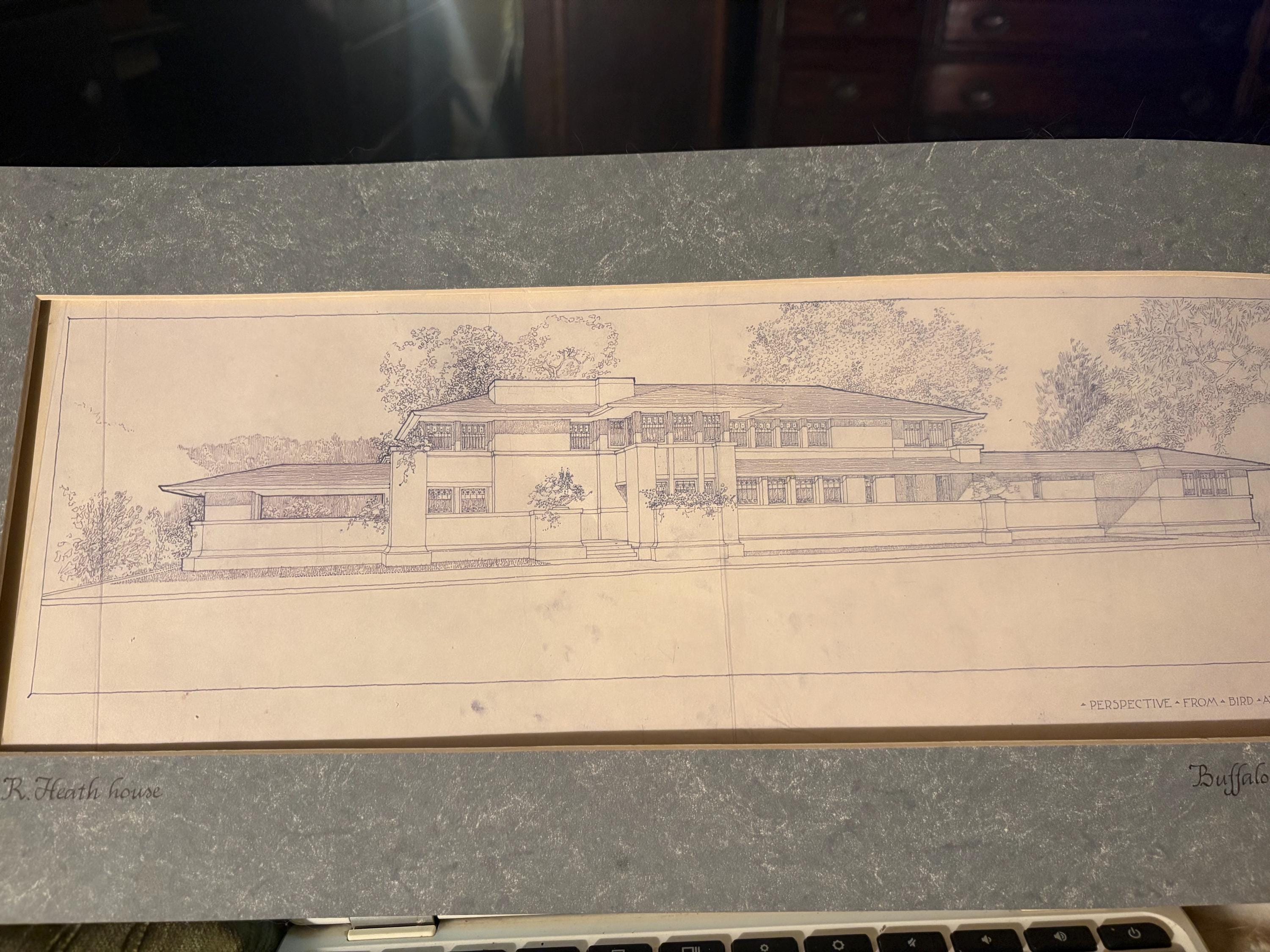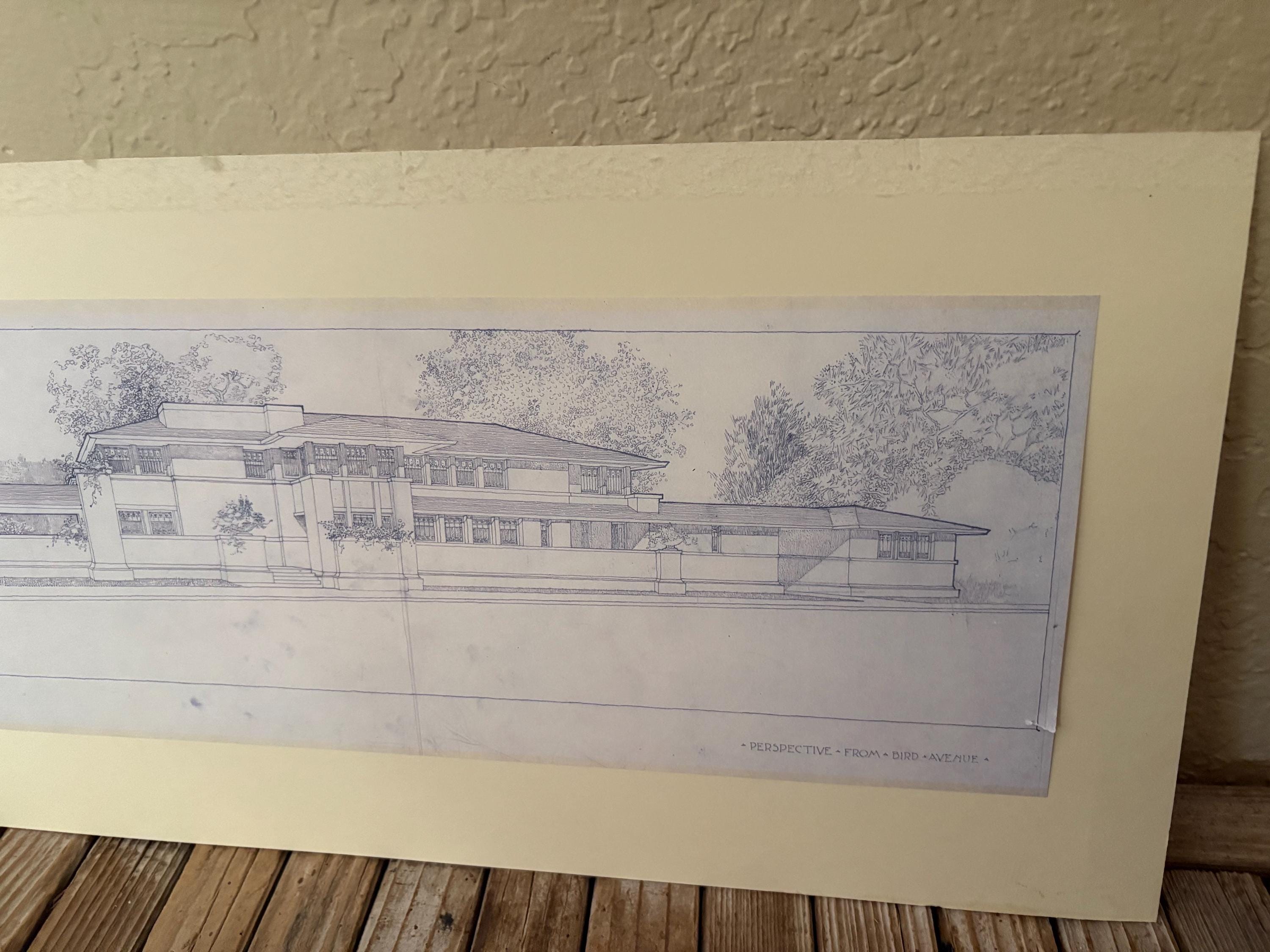 Antique Melvin H. Sykes black and white print. In good, vintage condition, normal wear due to age and use. The piece ihas surface markings. The matting is warped near the base, please see pictures. I believe this is an original architectural rendering, please email me any questions prior to purchase about this piece. A beautiful piece by Frank Lloyd Wright to give it as a gift or add to a collection.