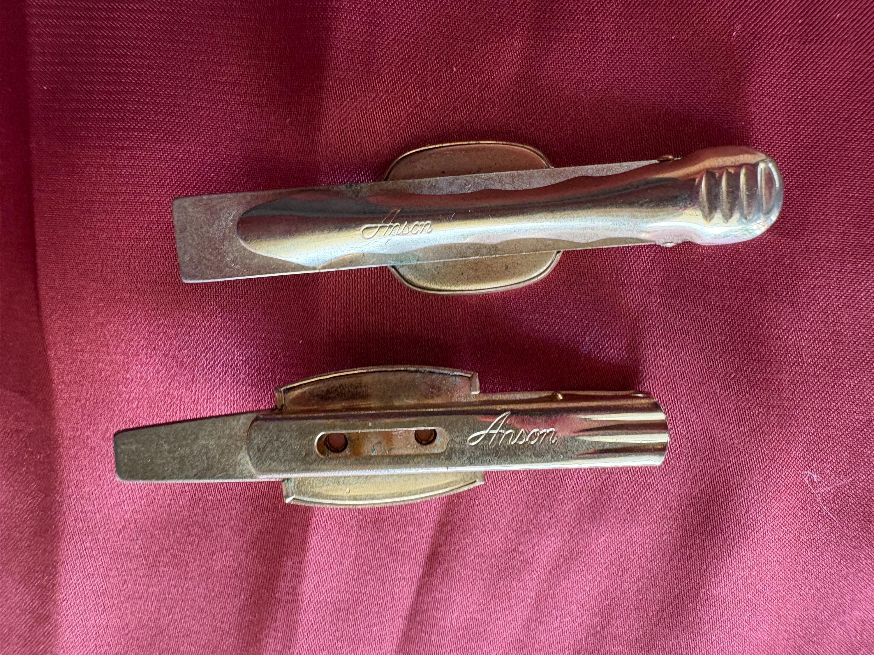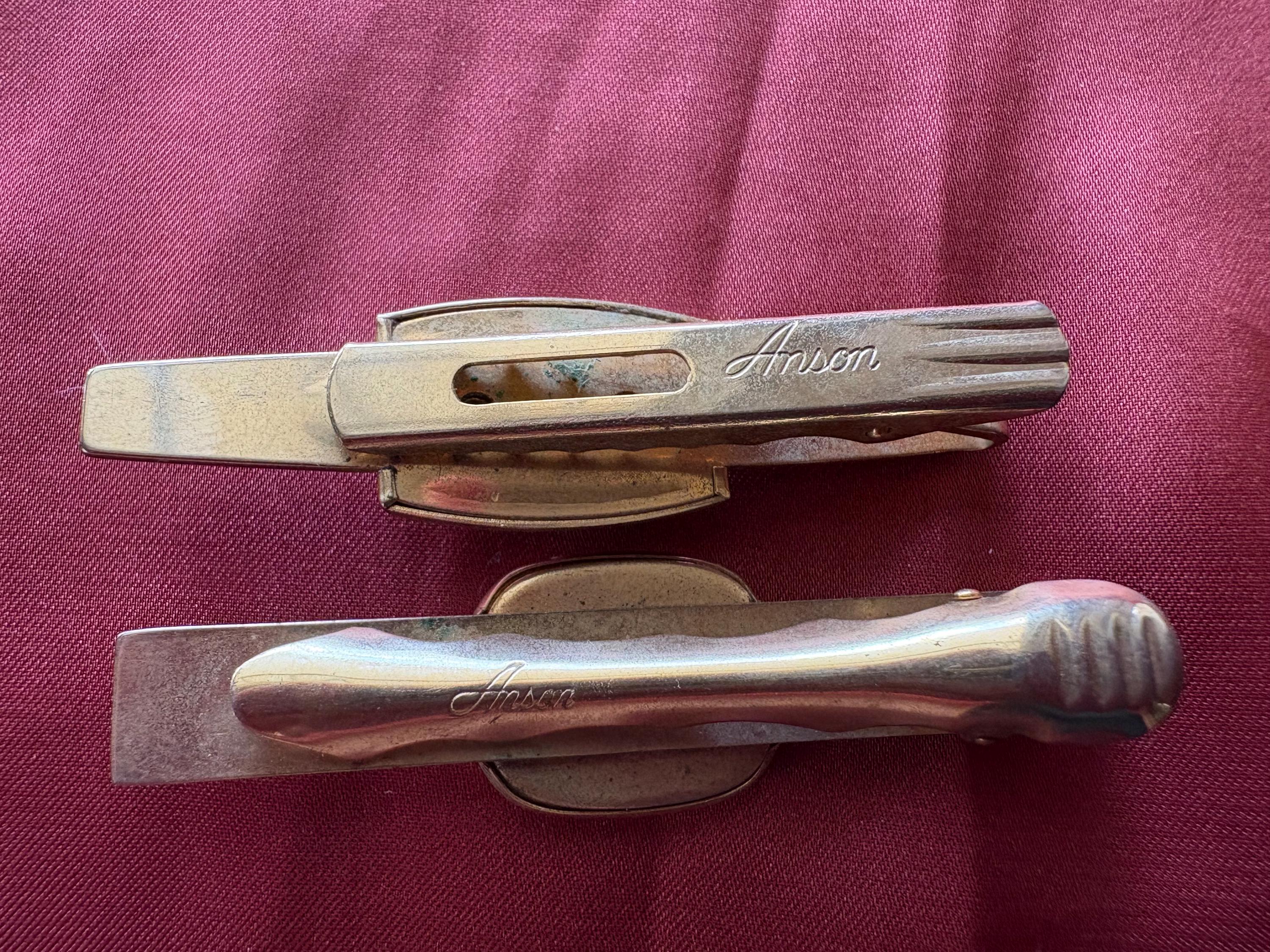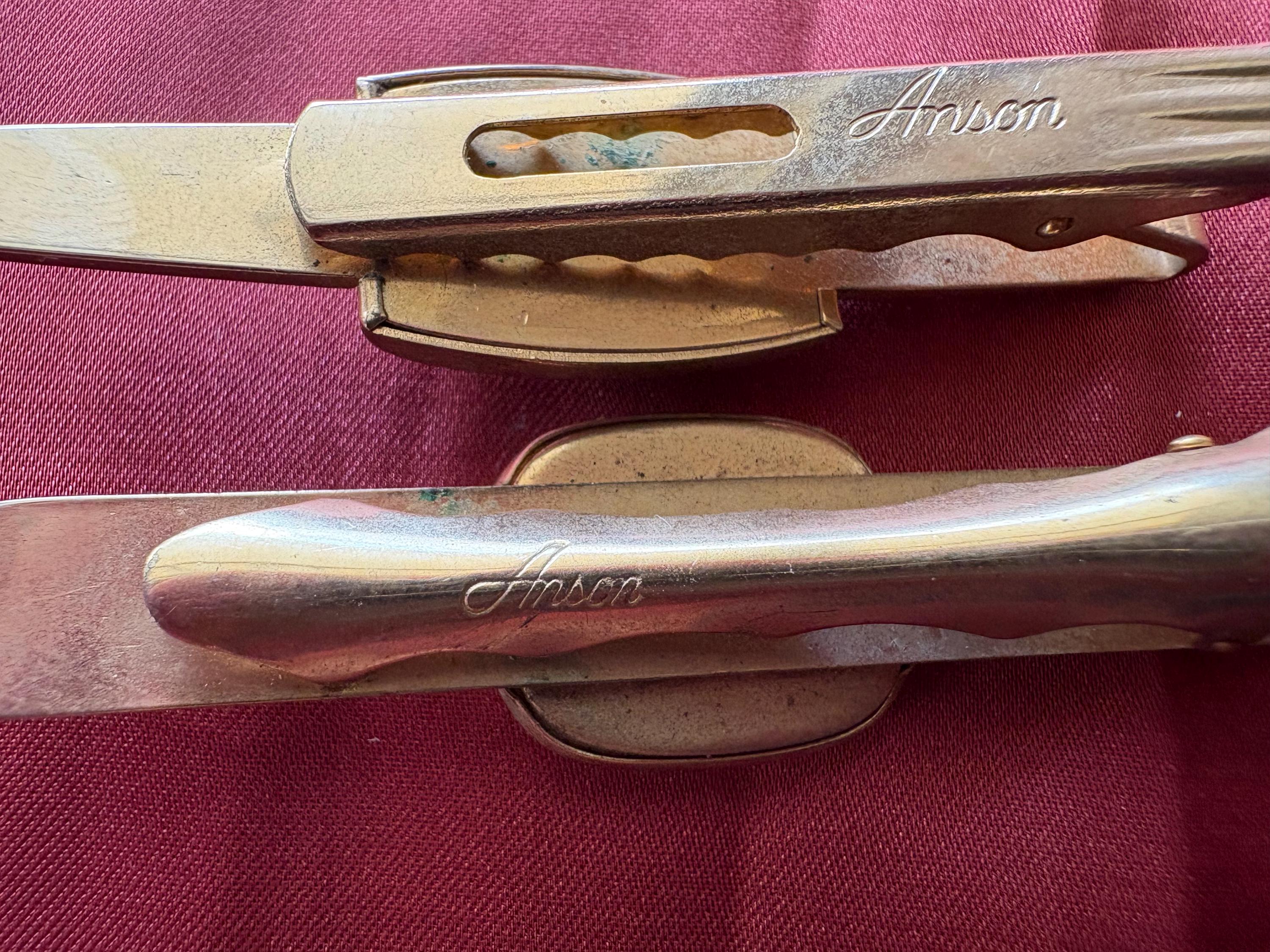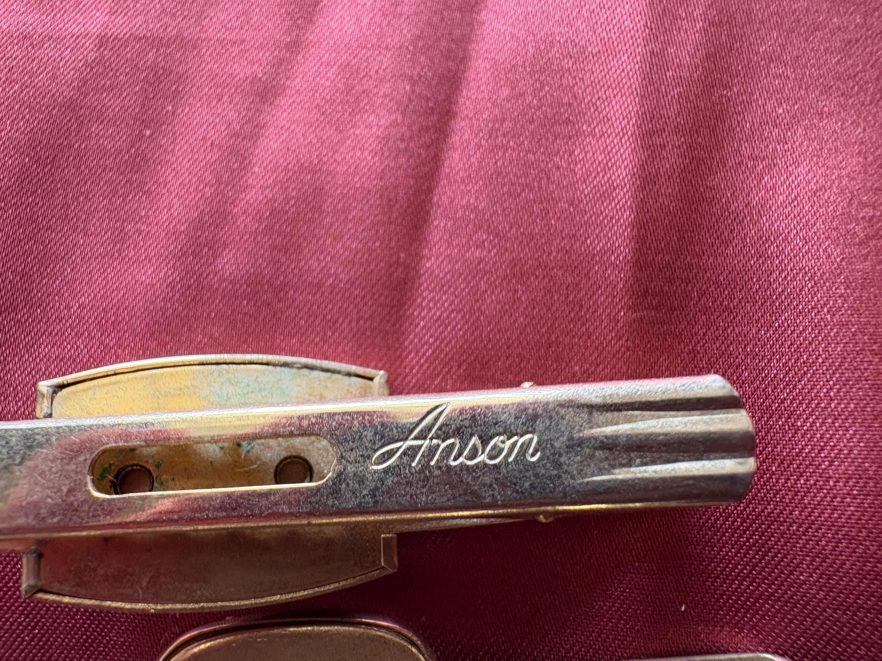 Vintage pair of Anson wide tie clips. In great condition, normal wear due to age and use. The gold metal has some surface imperfections and scrapes, please see pictures. I'm not sure of the materials. A very cool set to add your collection or to give as a gift.