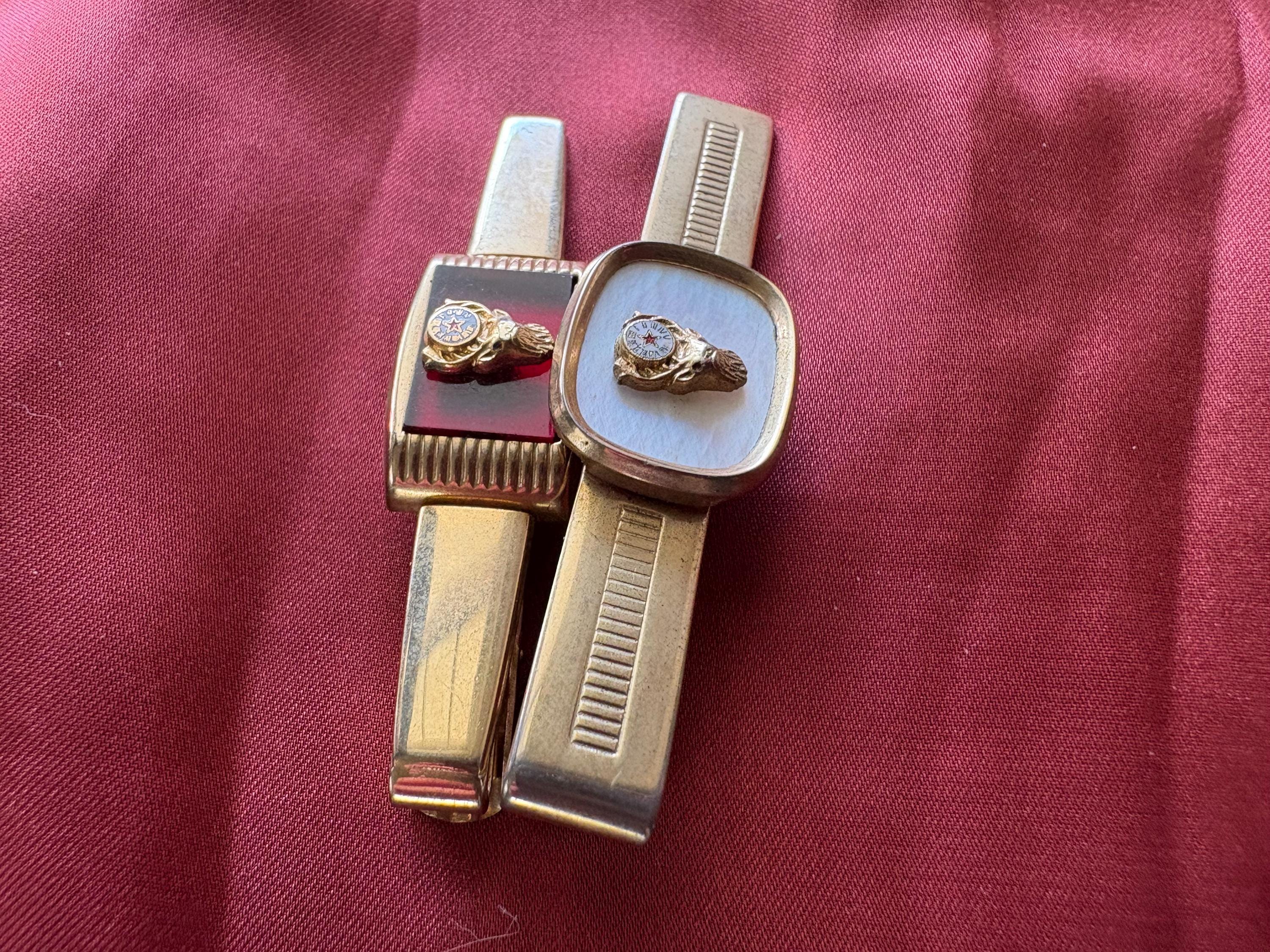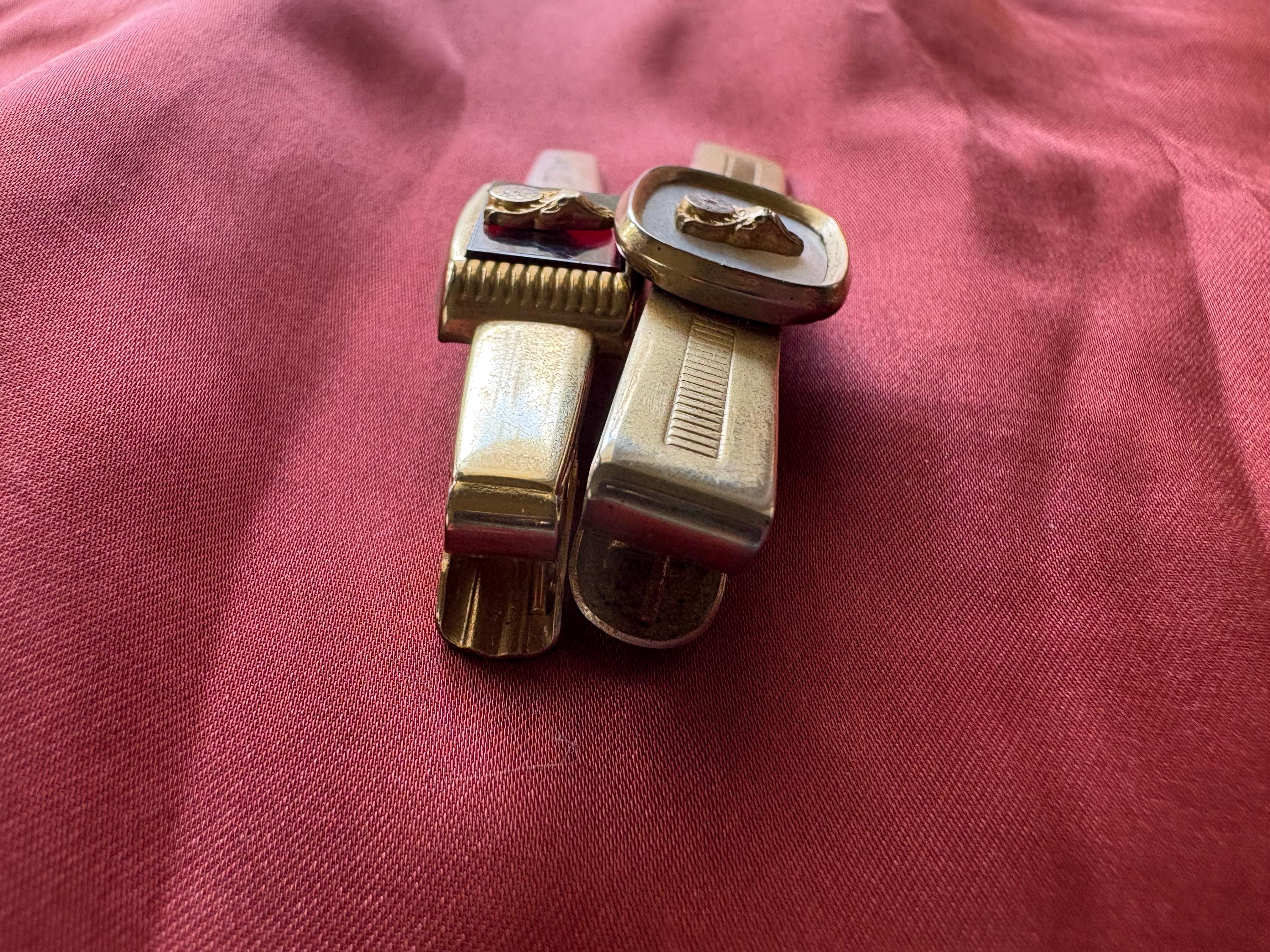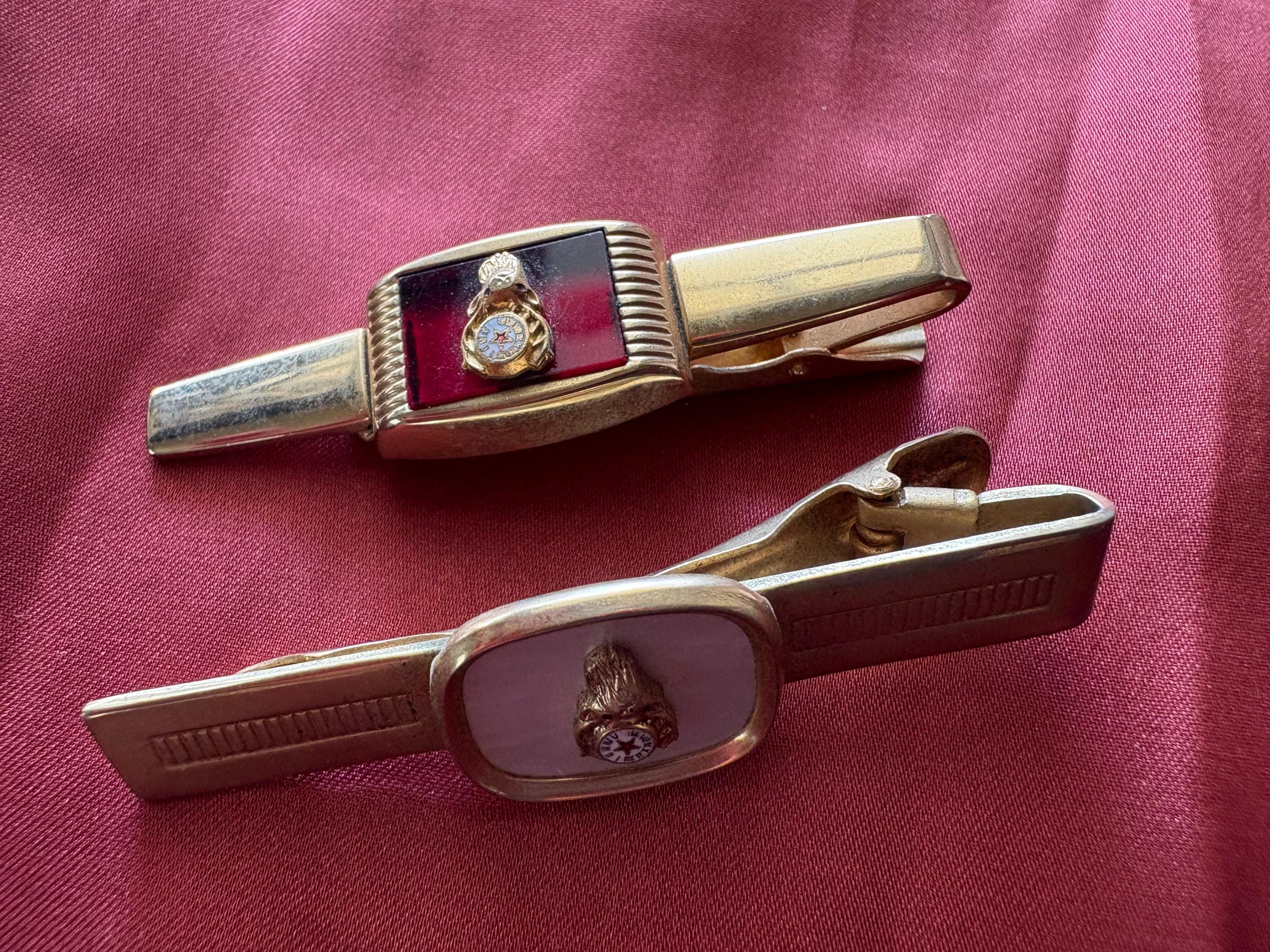 Vintage pair of Anson wide tie clips. In great condition, normal wear due to age and use. The gold metal has some surface imperfections and scrapes, please see pictures. I'm not sure of the materials. A very cool set to add your collection or to give as a gift.