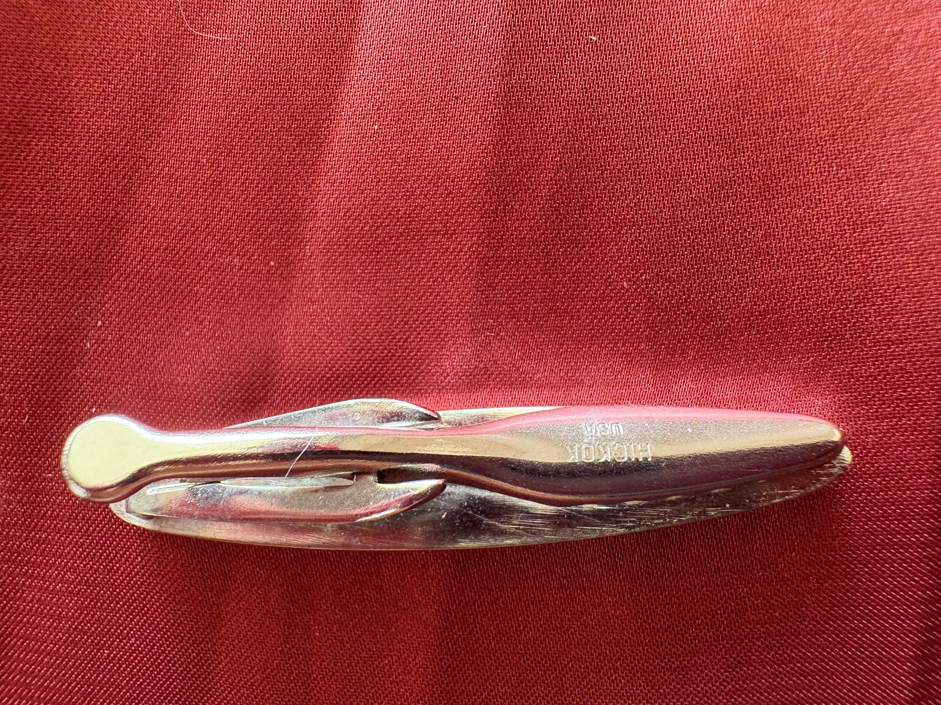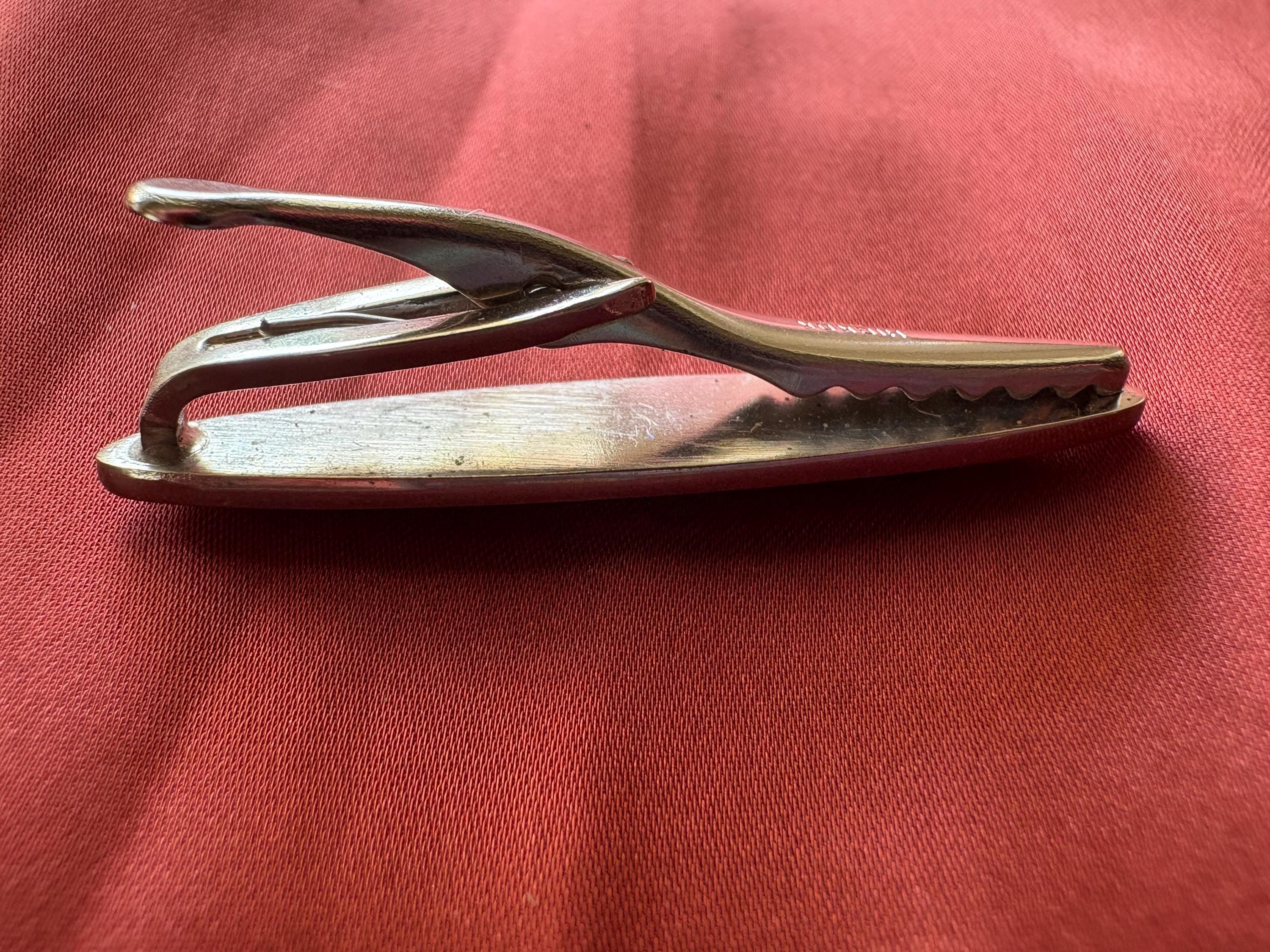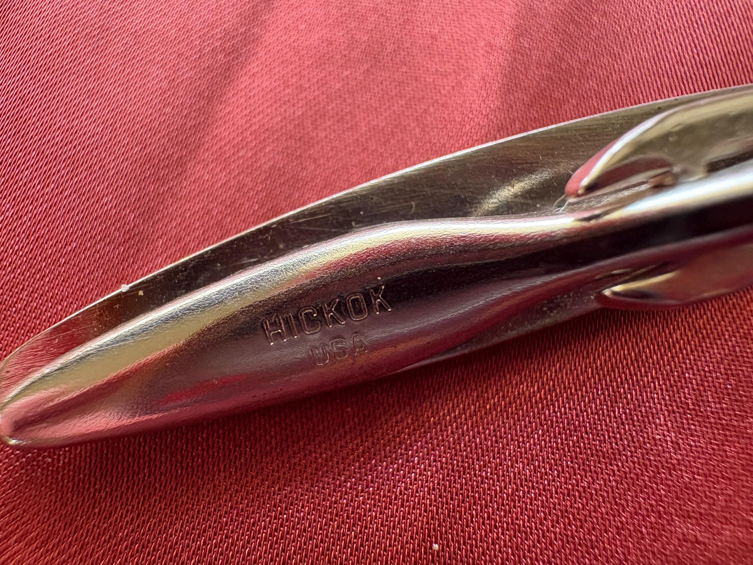 Mid Century silver and gold Hickok tie clip. In great condition, normal wear due to age and use. The metal has some surface imperfections and scrapes, please see pictures. A very cool old piece to add to your collection or give as a gift.