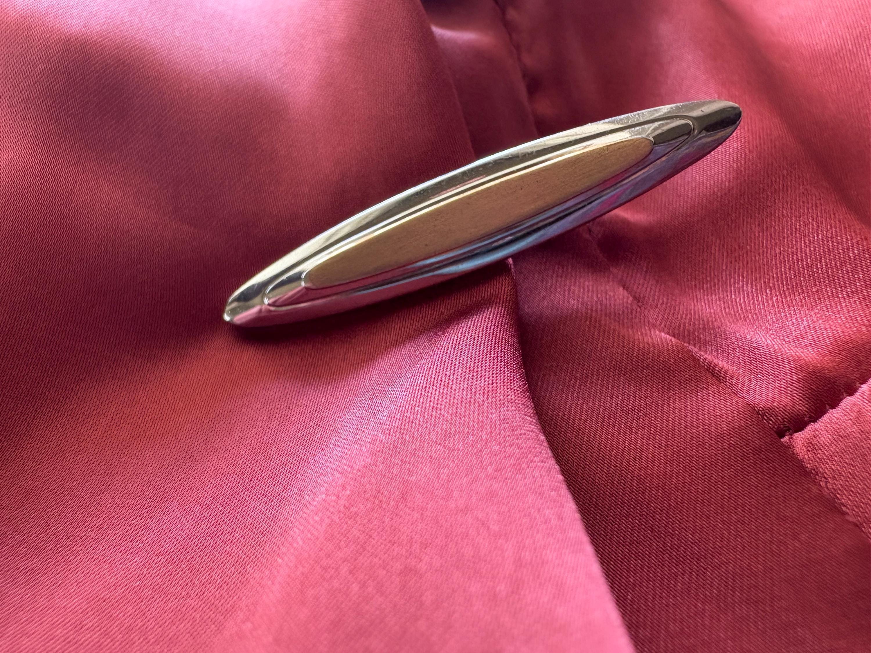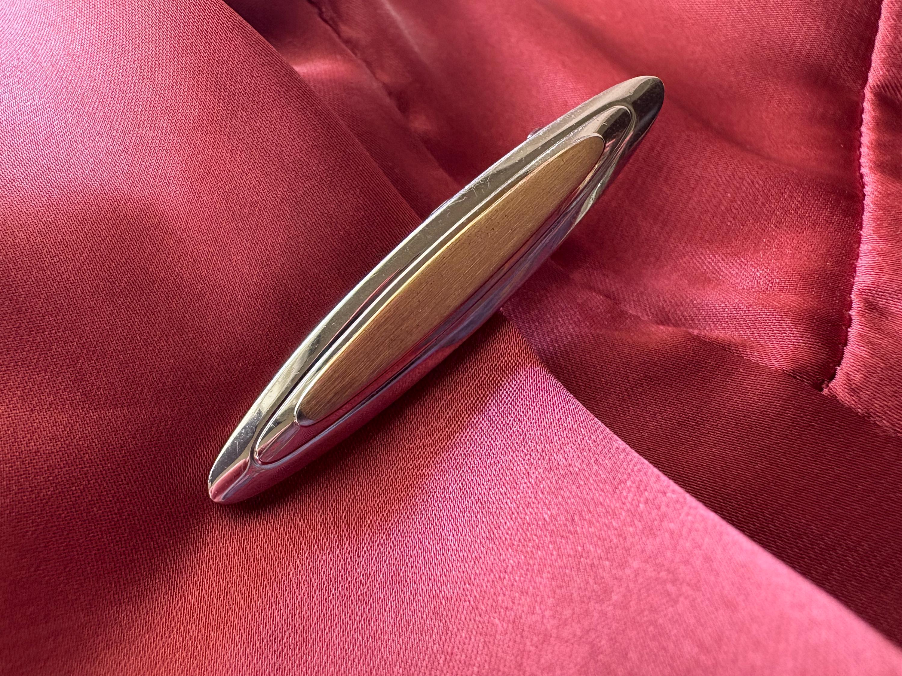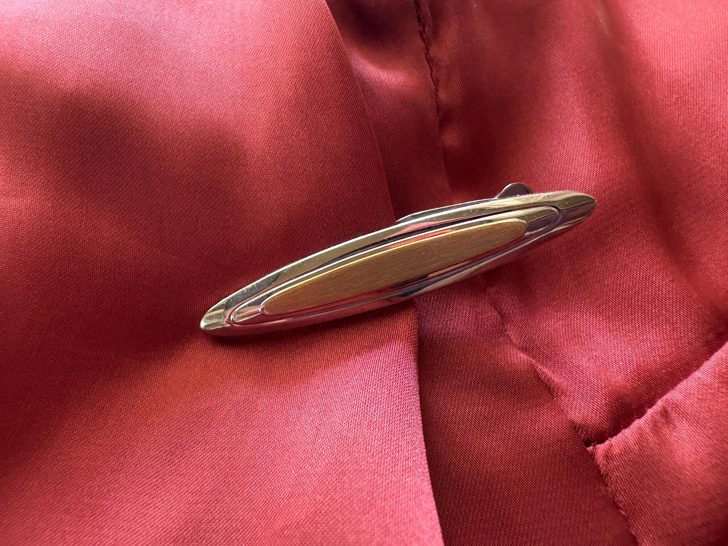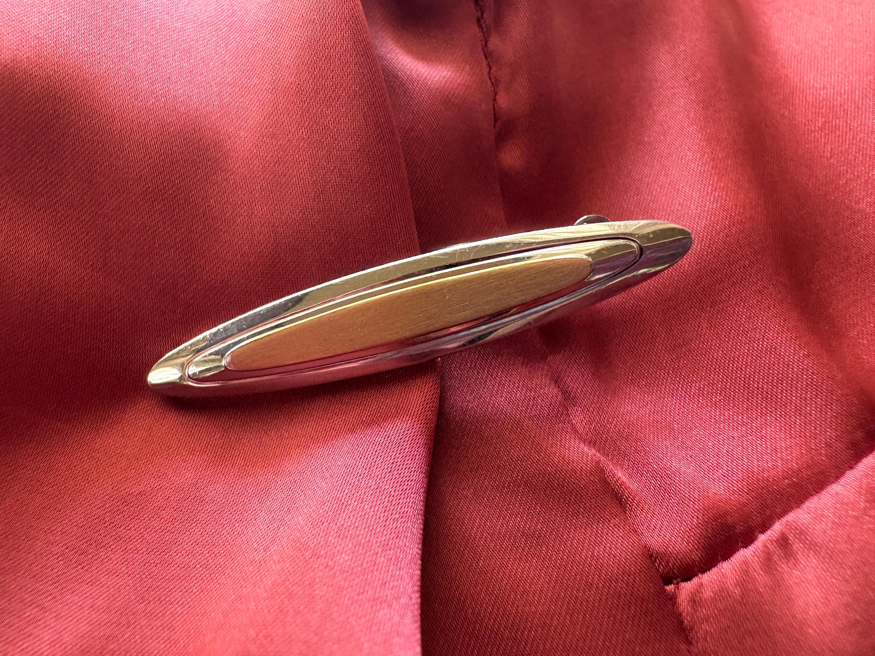 Mid Century silver and gold Hickok tie clip. In great condition, normal wear due to age and use. The metal has some surface imperfections and scrapes, please see pictures. A very cool old piece to add to your collection or give as a gift.