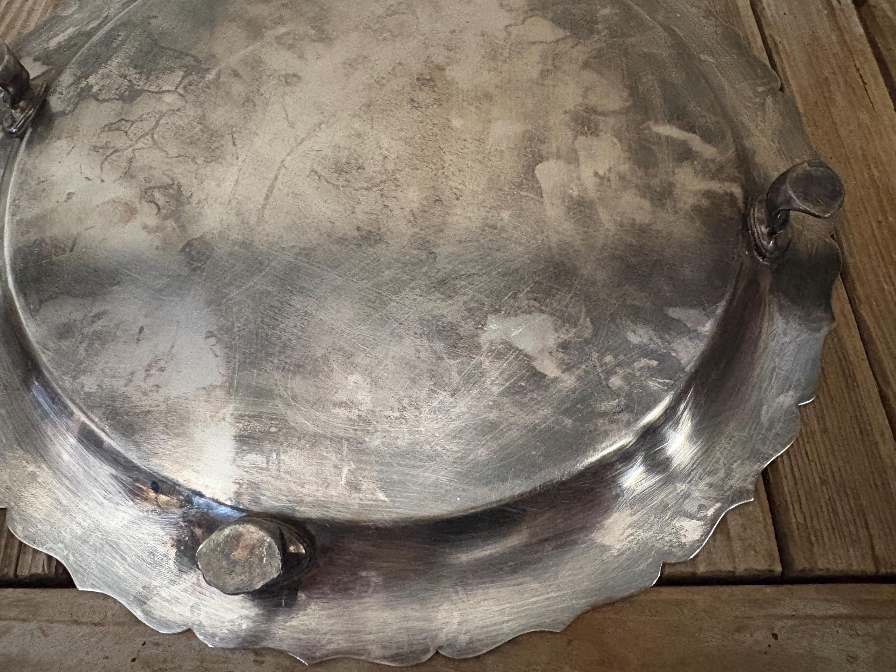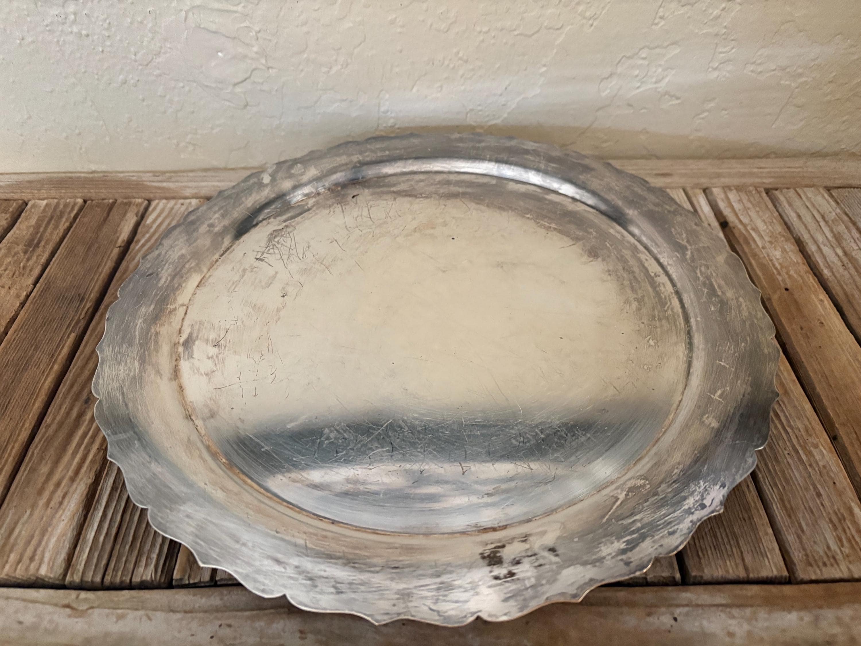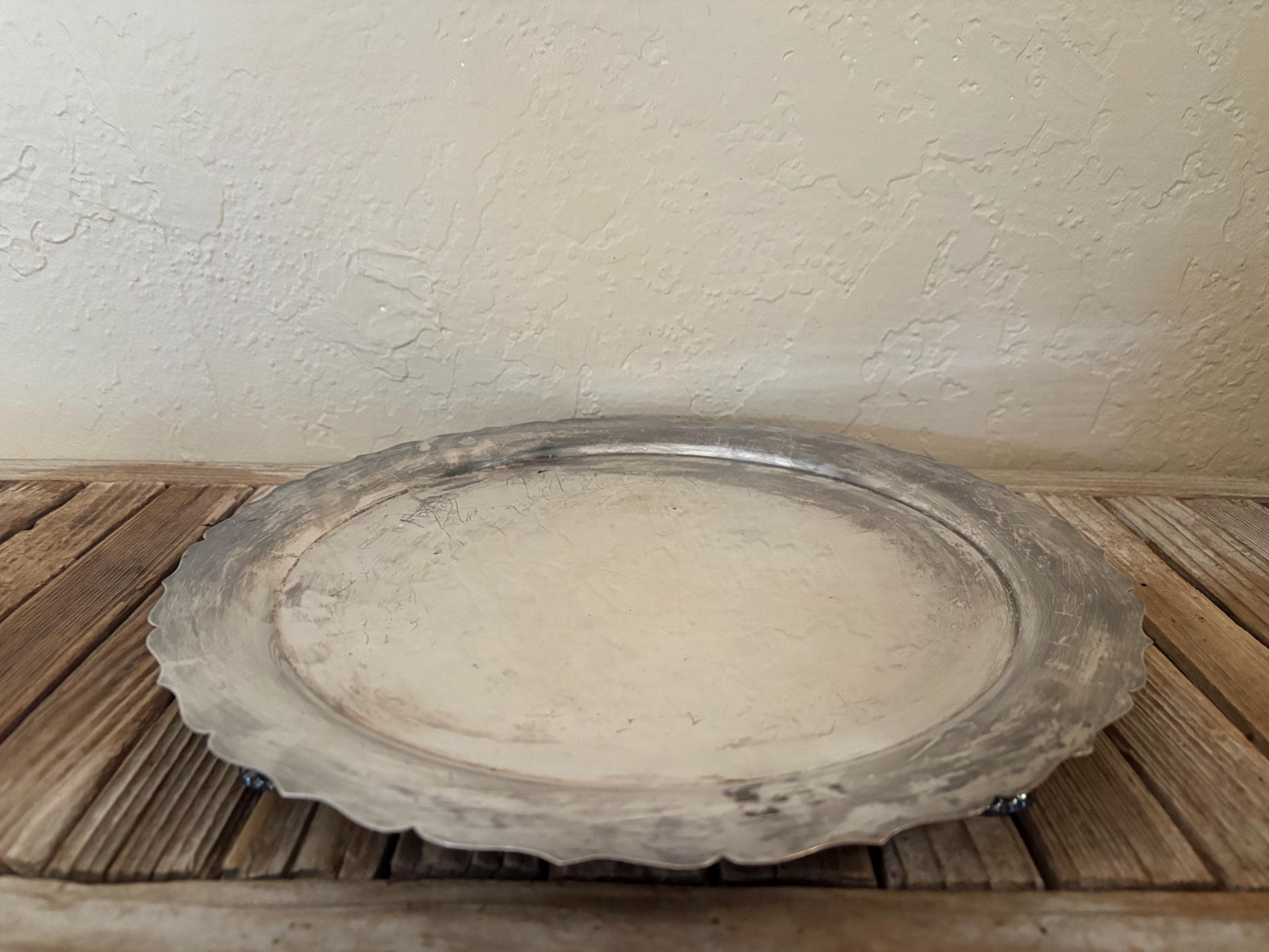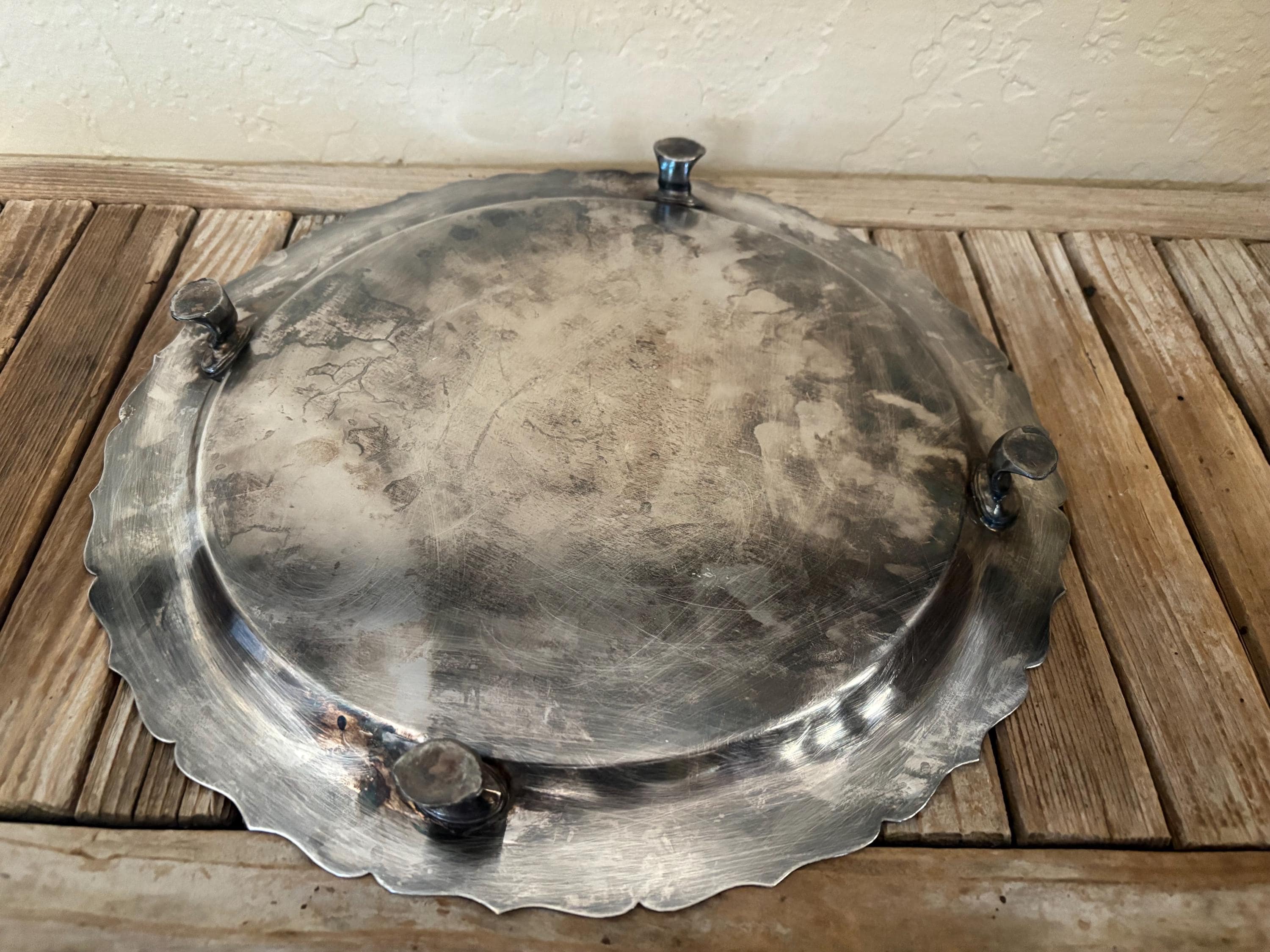 Vintage scalloped Silver Footed Tray. In good vintage condition, normal wear due to age and use. The tray has surface marks, scratches, discolorations and patina, please see pictures. A beautiful tray with beautiful detail to use for an upcoming wedding or for everyday use.