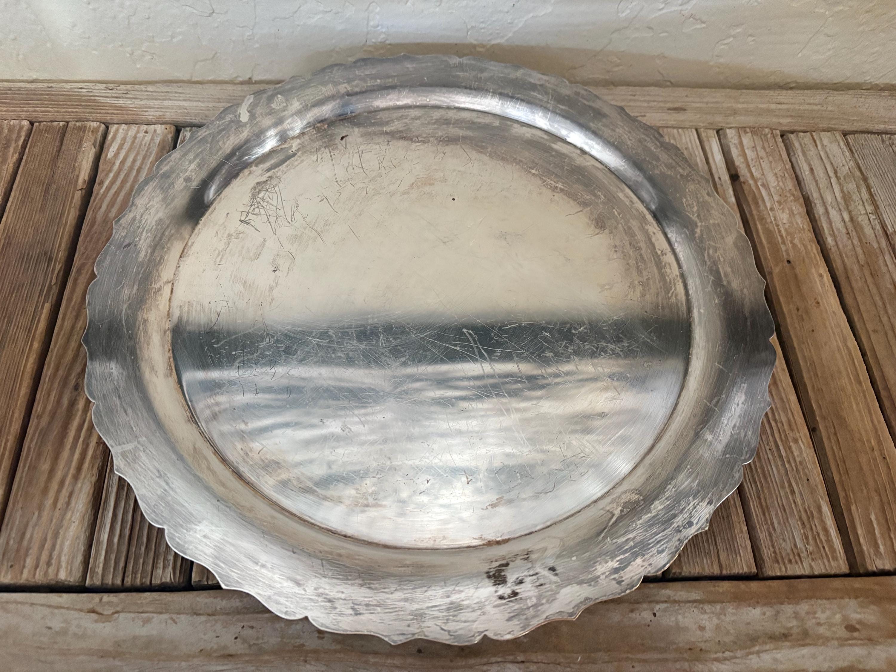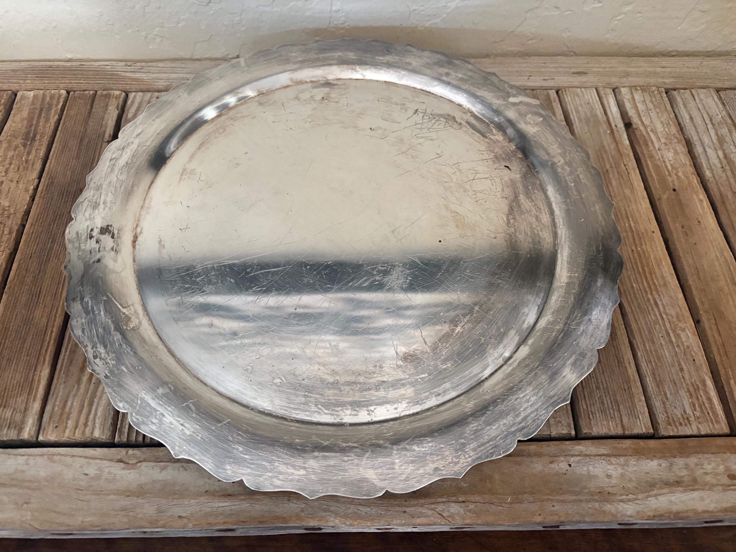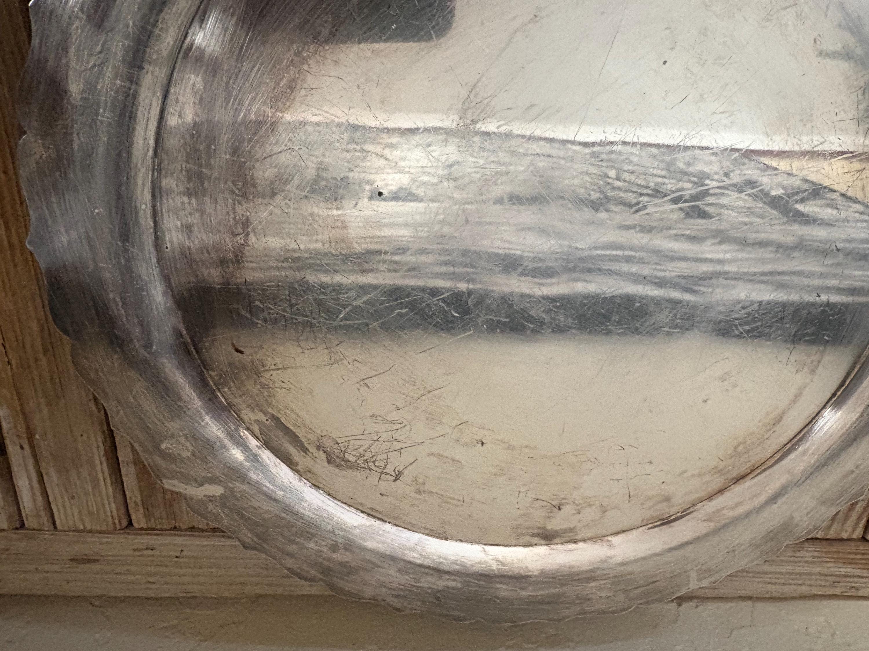 Vintage scalloped Silver Footed Tray. In good vintage condition, normal wear due to age and use. The tray has surface marks, scratches, discolorations and patina, please see pictures. A beautiful tray with beautiful detail to use for an upcoming wedding or for everyday use.