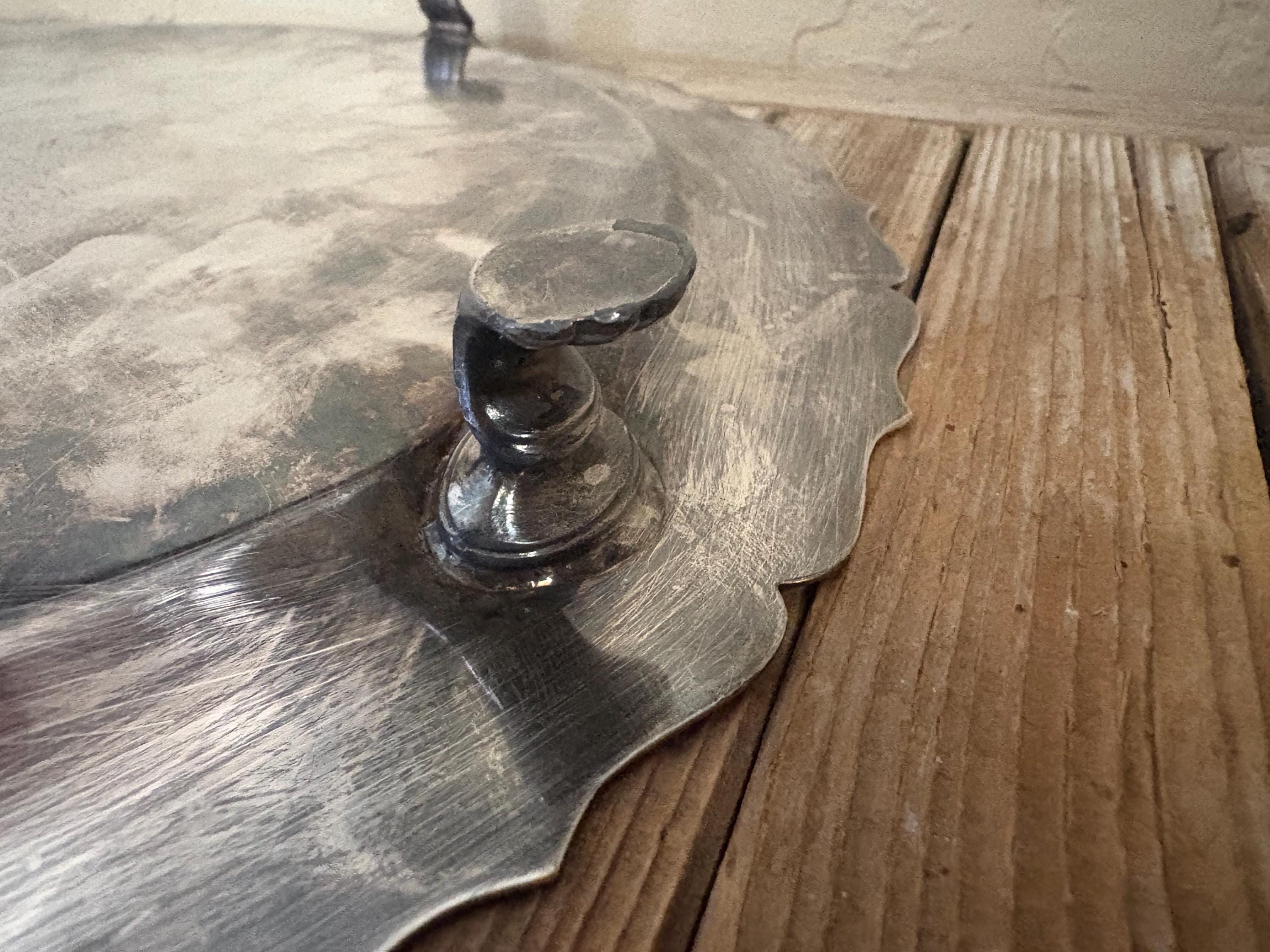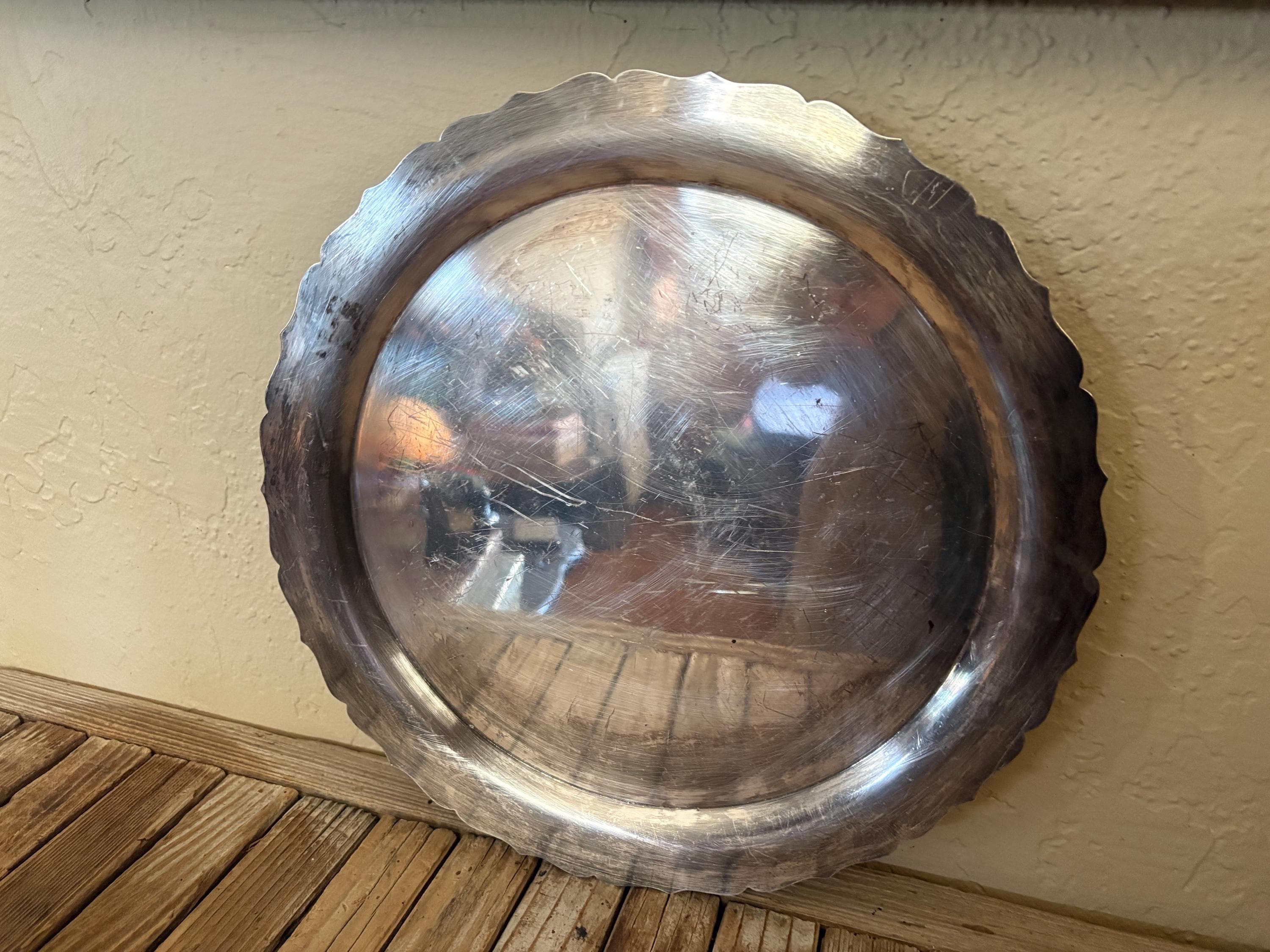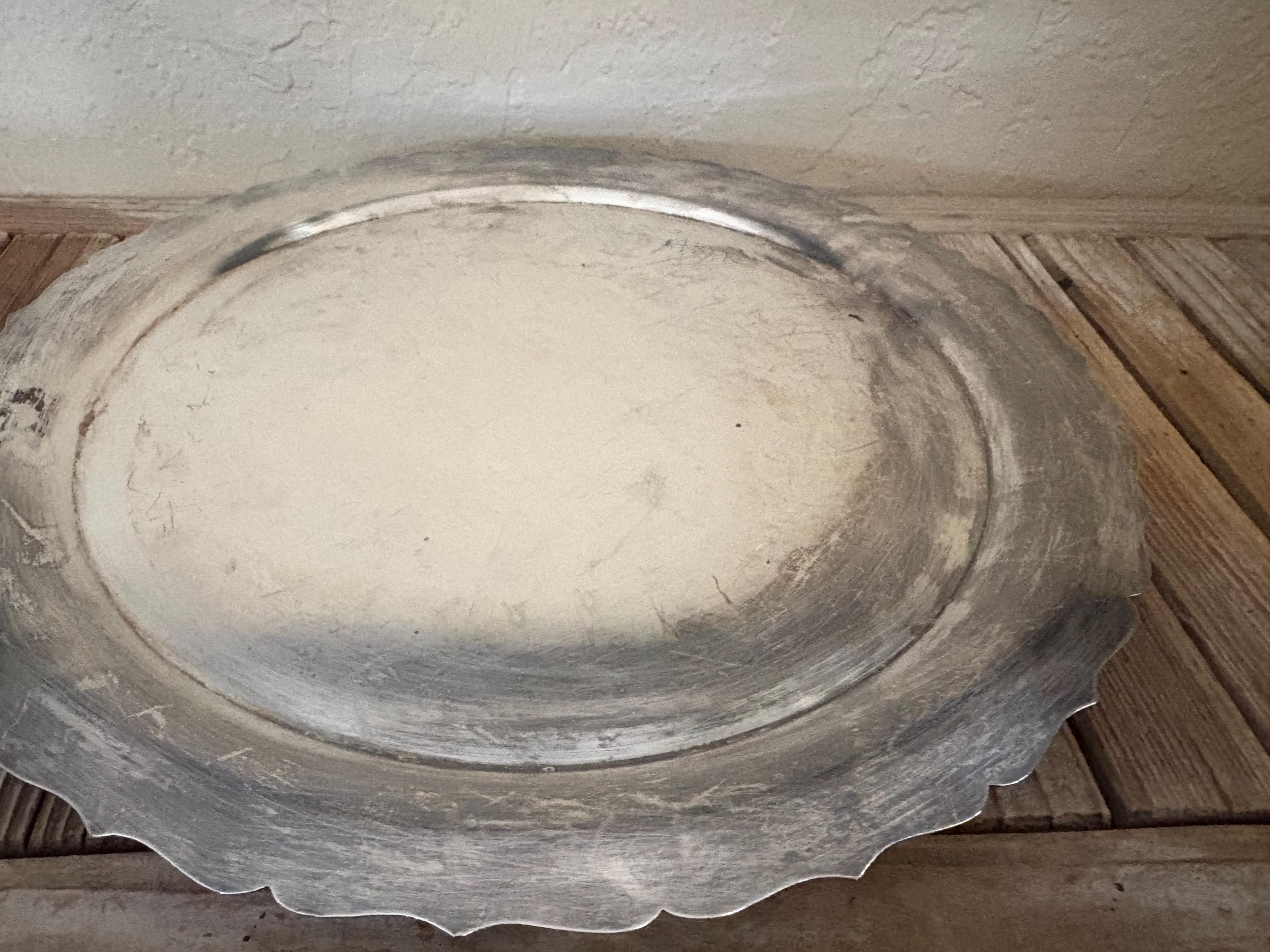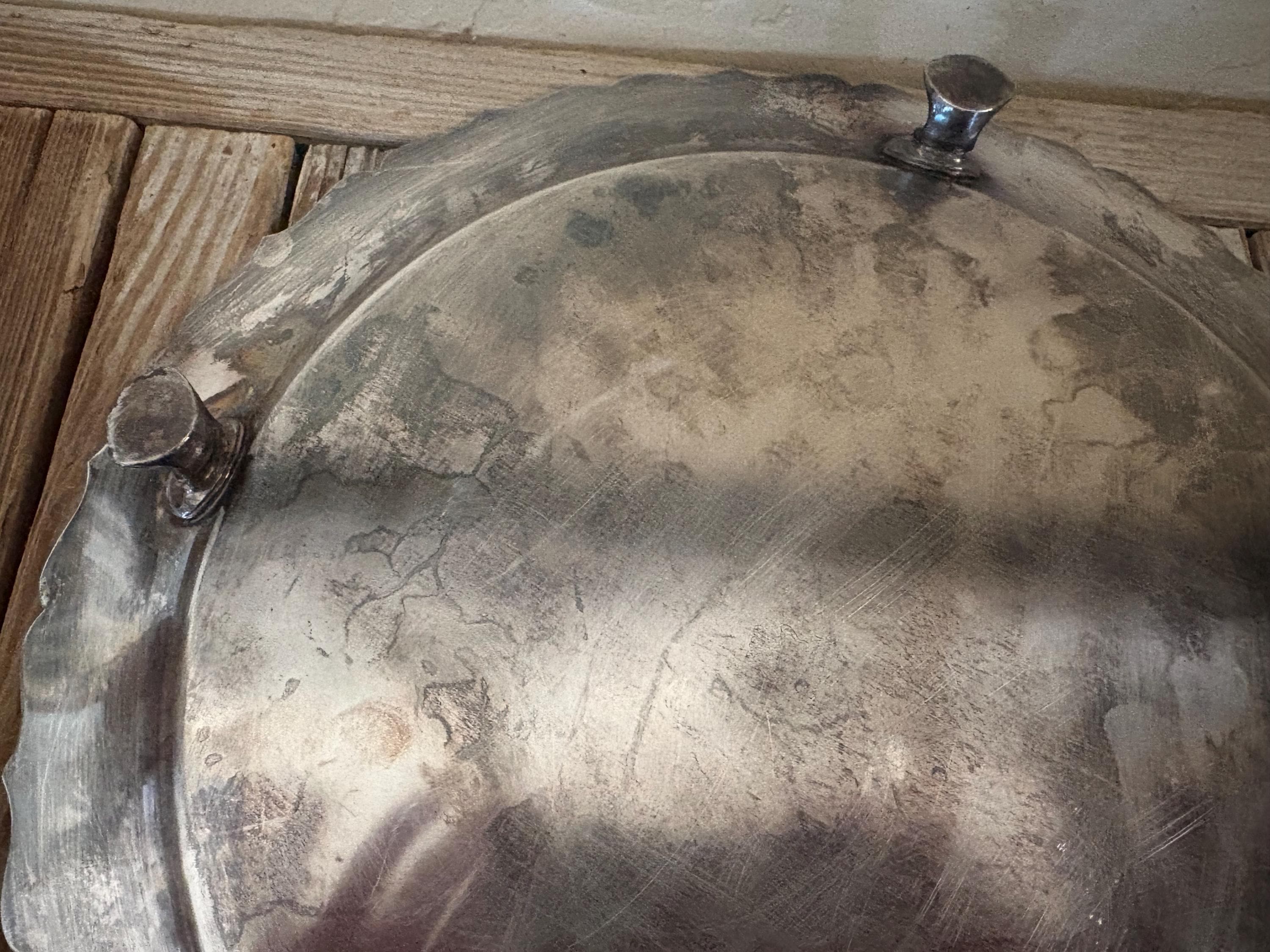 Vintage scalloped Silver Footed Tray. In good vintage condition, normal wear due to age and use. The tray has surface marks, scratches, discolorations and patina, please see pictures. A beautiful tray with beautiful detail to use for an upcoming wedding or for everyday use.