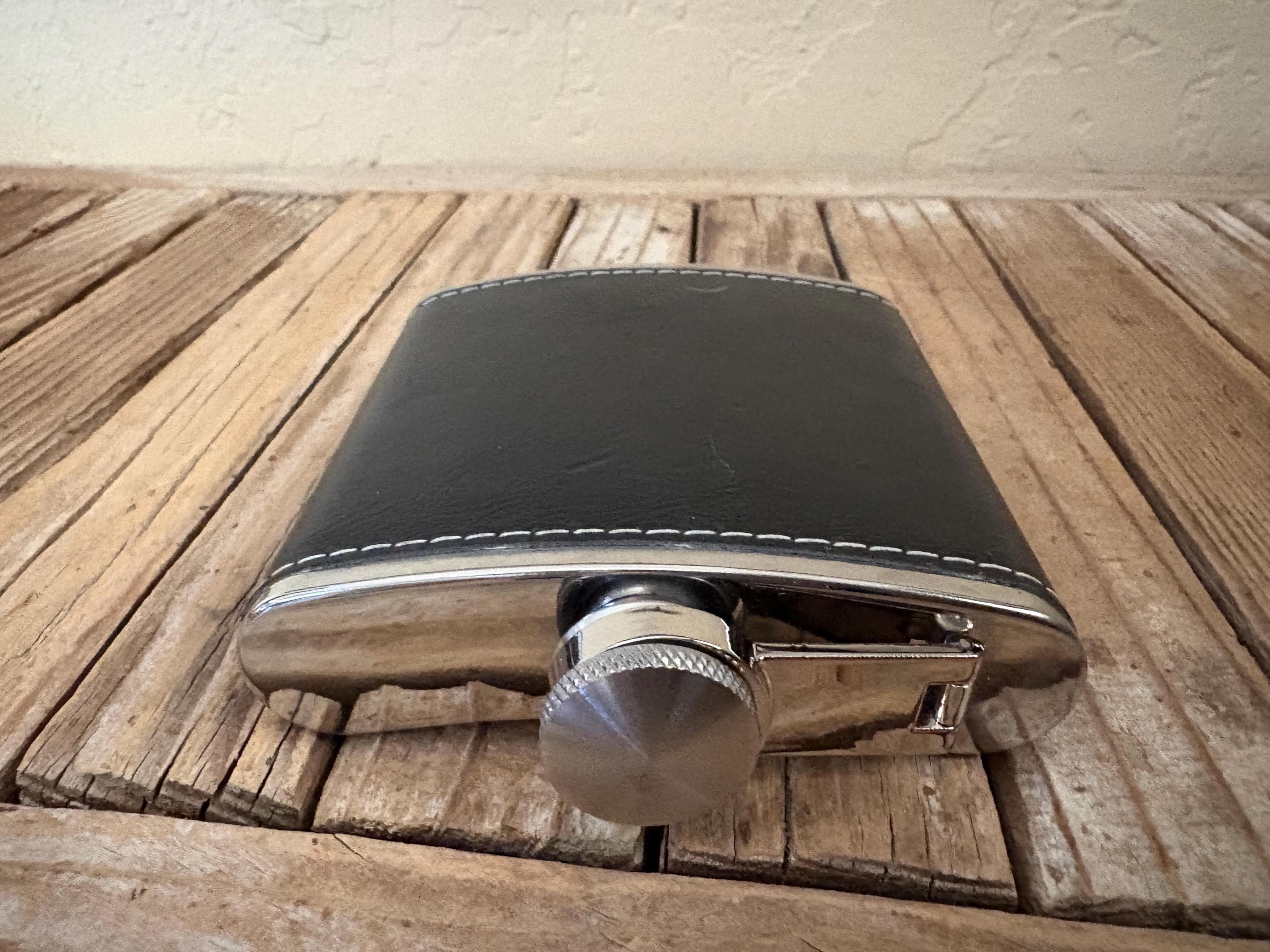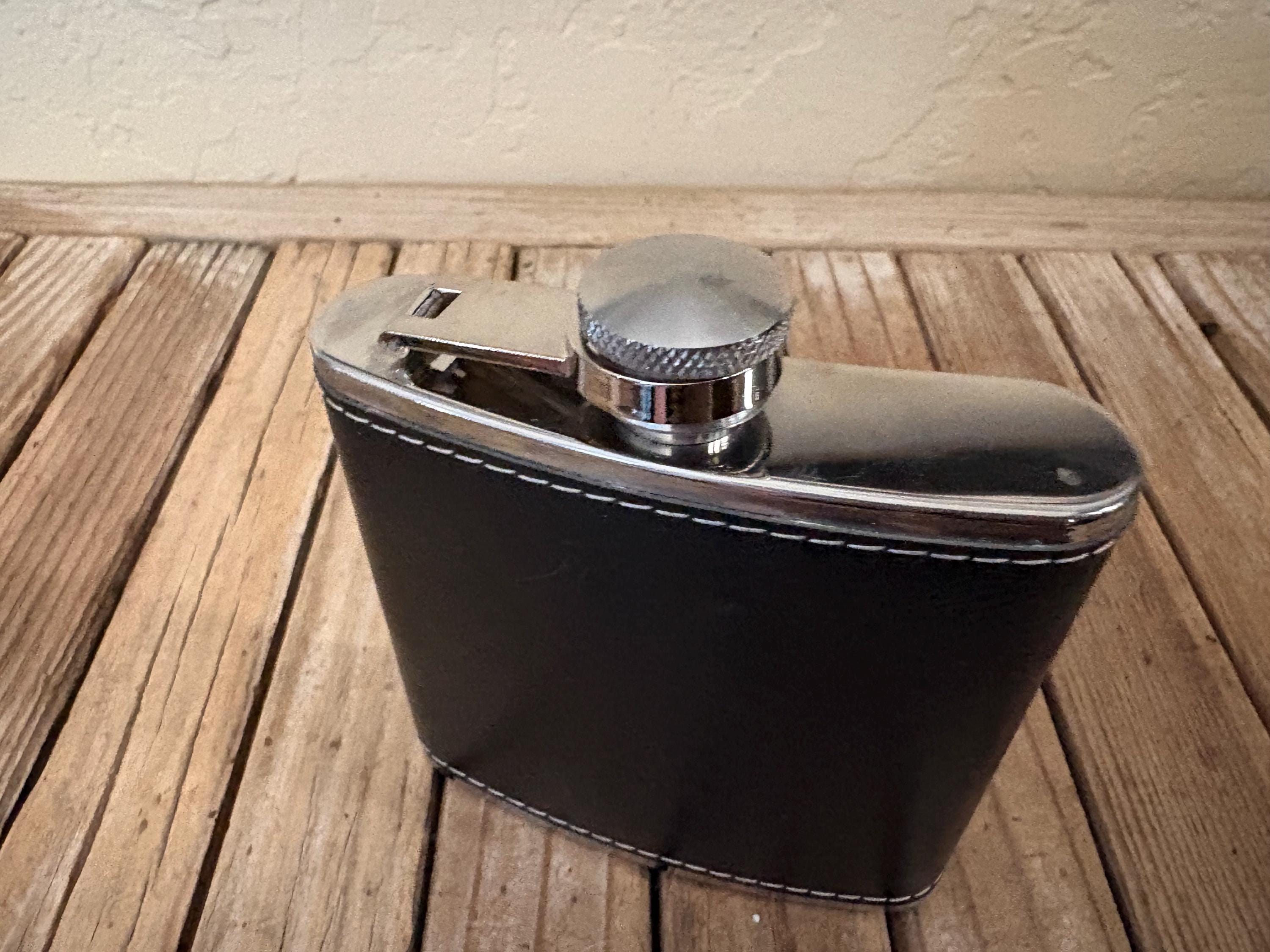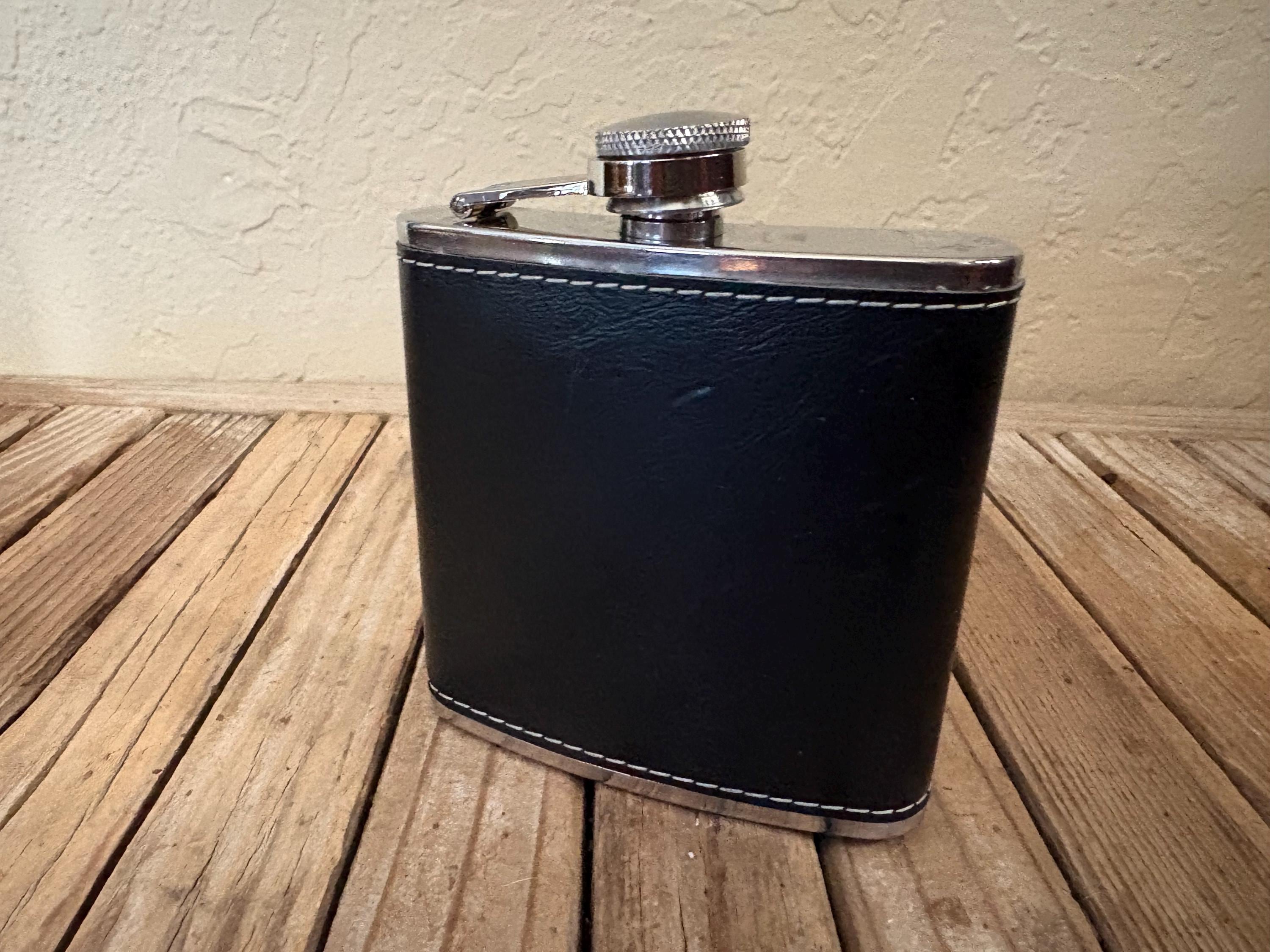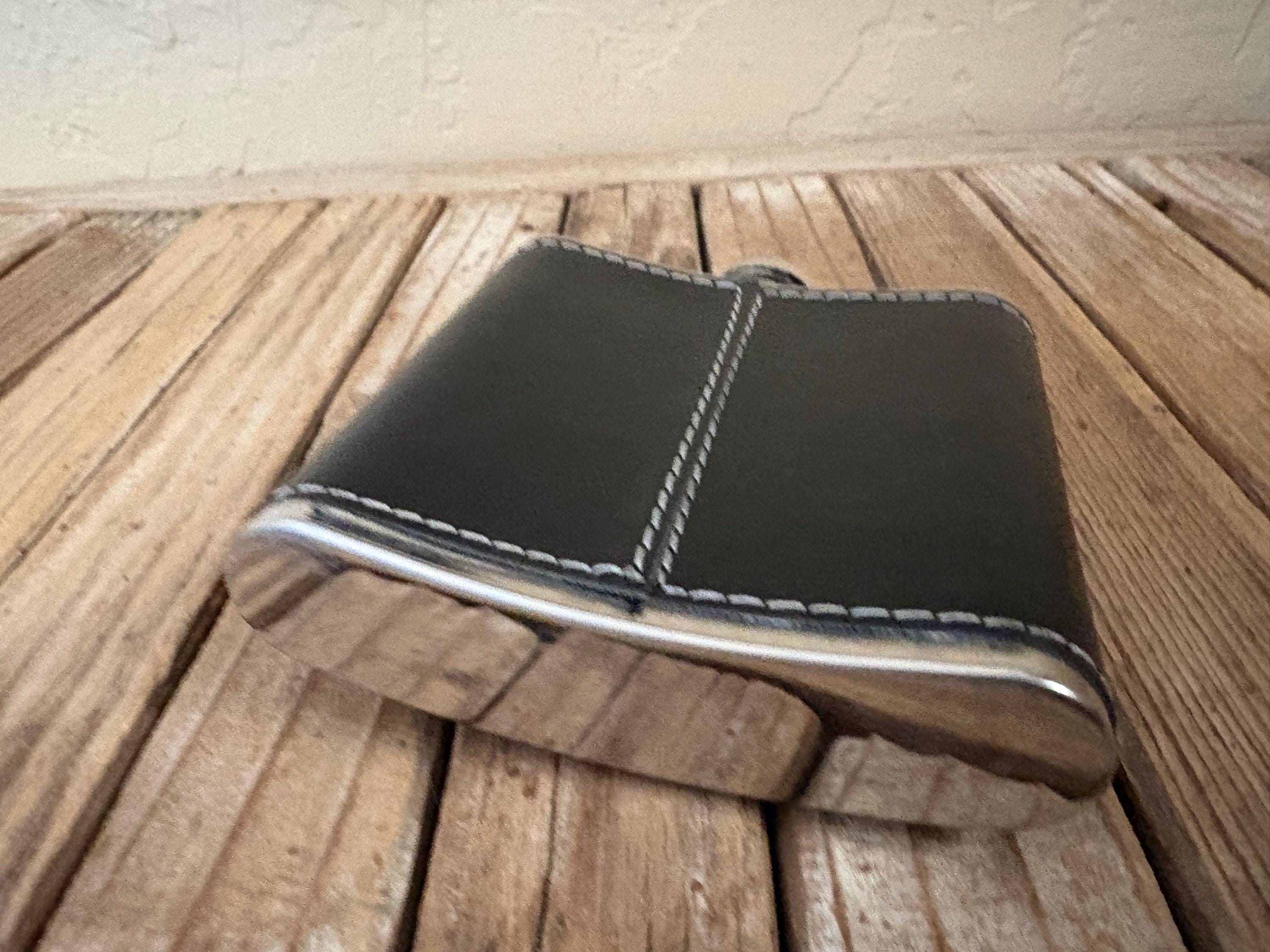 Vintage black leather and silver metal flask. In great vintage condition, normal wear due to age use. The leather has surface scrapes and markings, please see pictures. A great, unique piece to keep for yourself or to give as a gift.