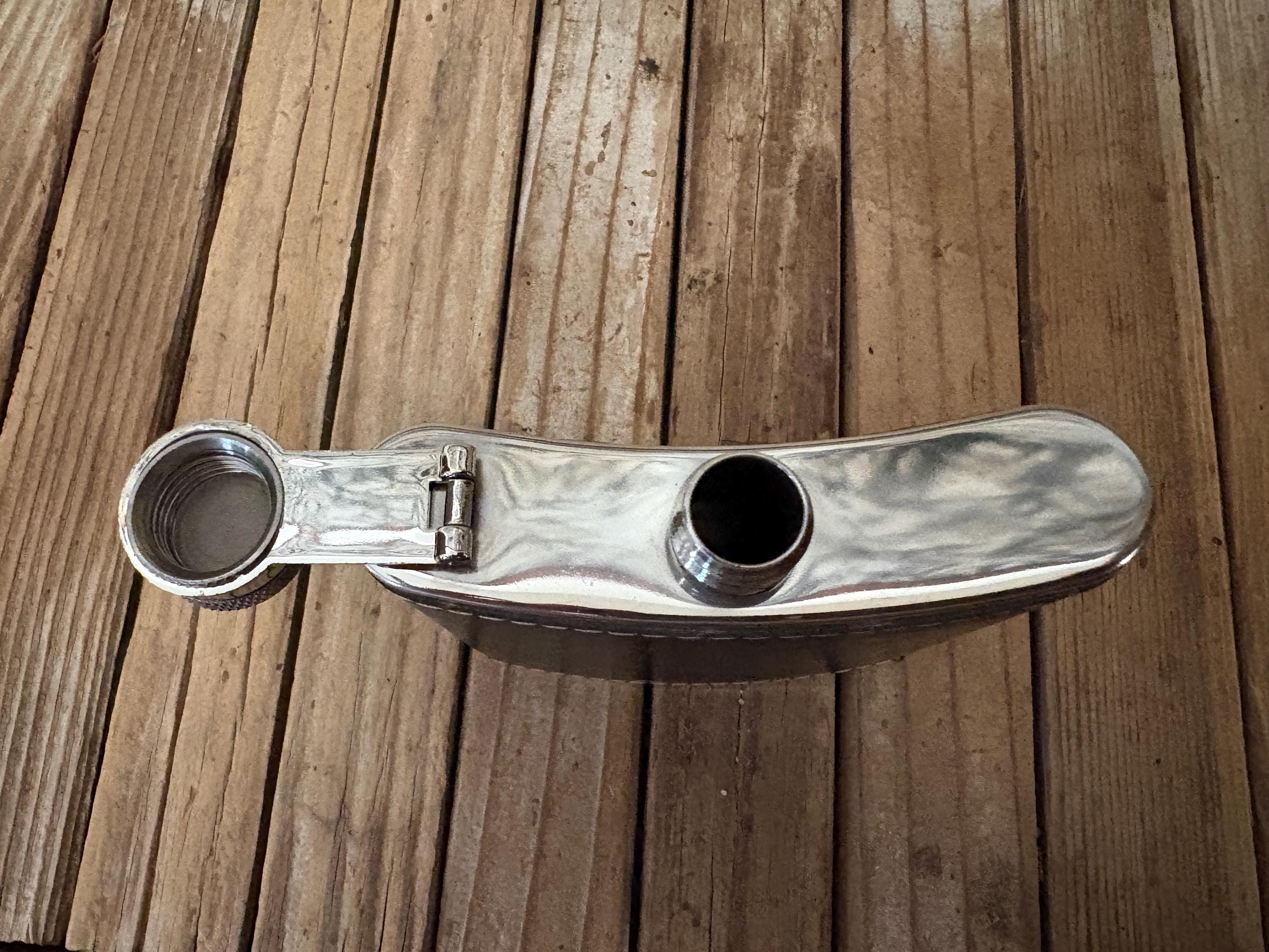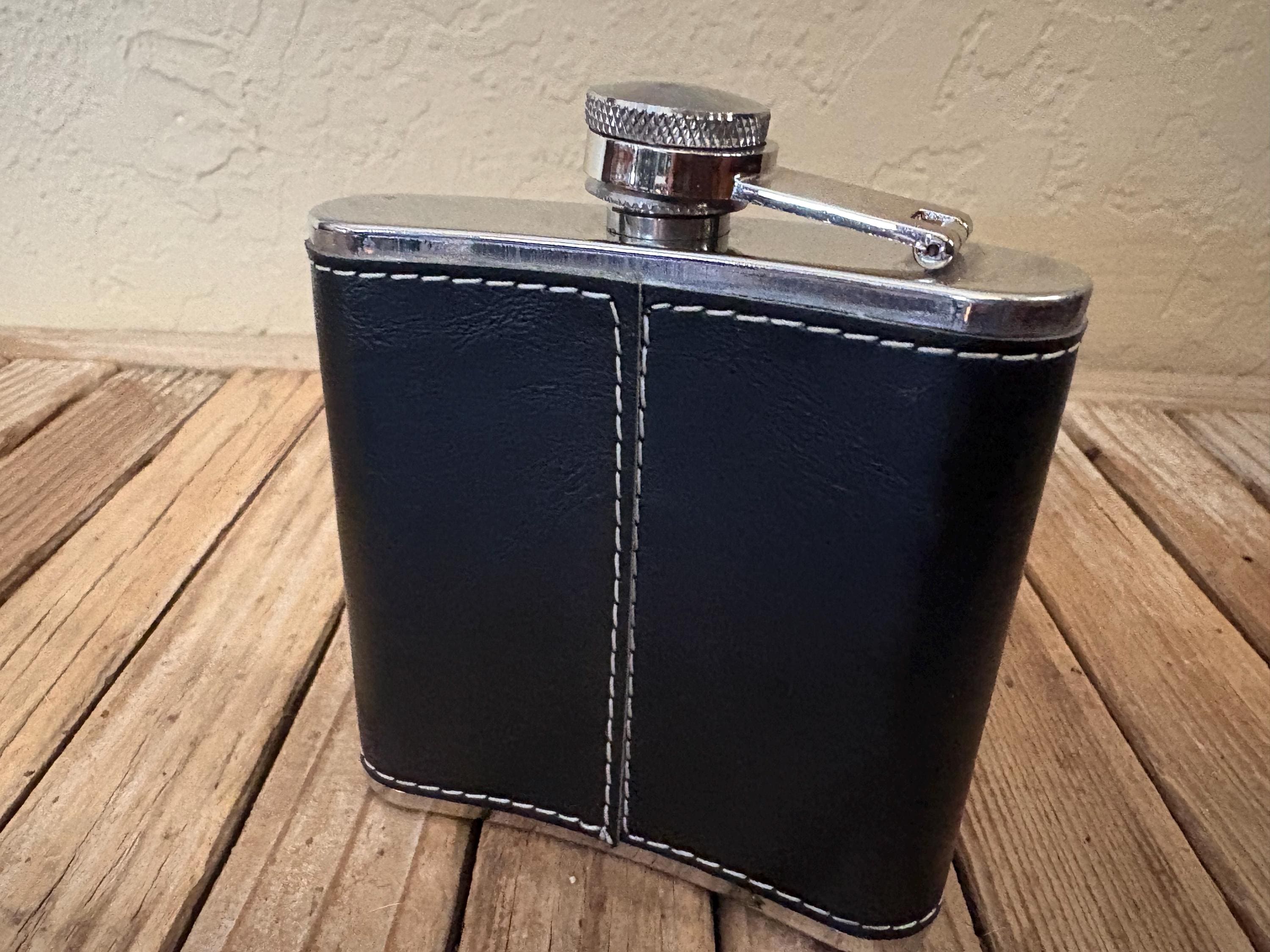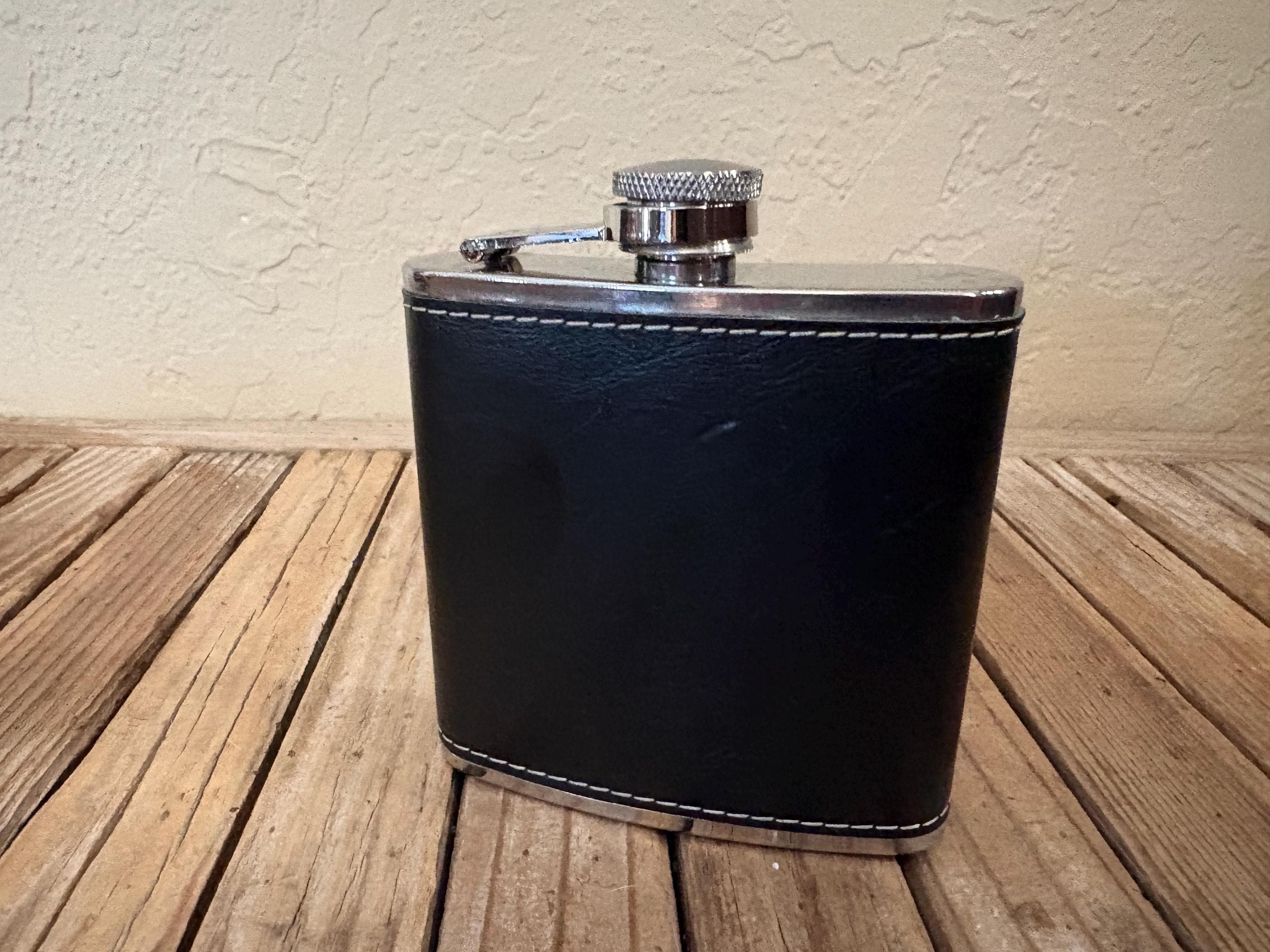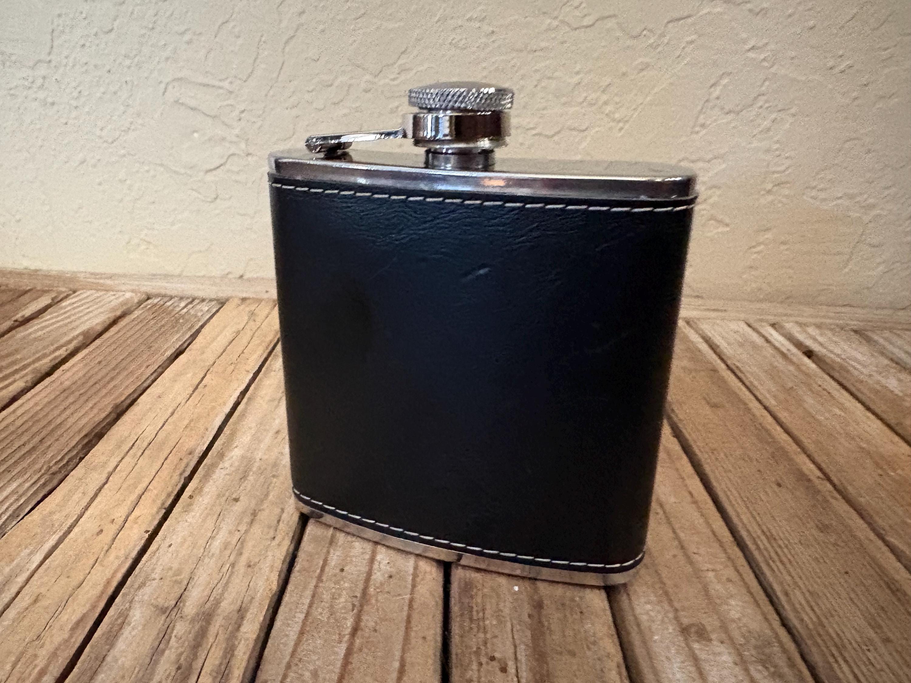 Vintage black leather and silver metal flask. In great vintage condition, normal wear due to age use. The leather has surface scrapes and markings, please see pictures. A great, unique piece to keep for yourself or to give as a gift.