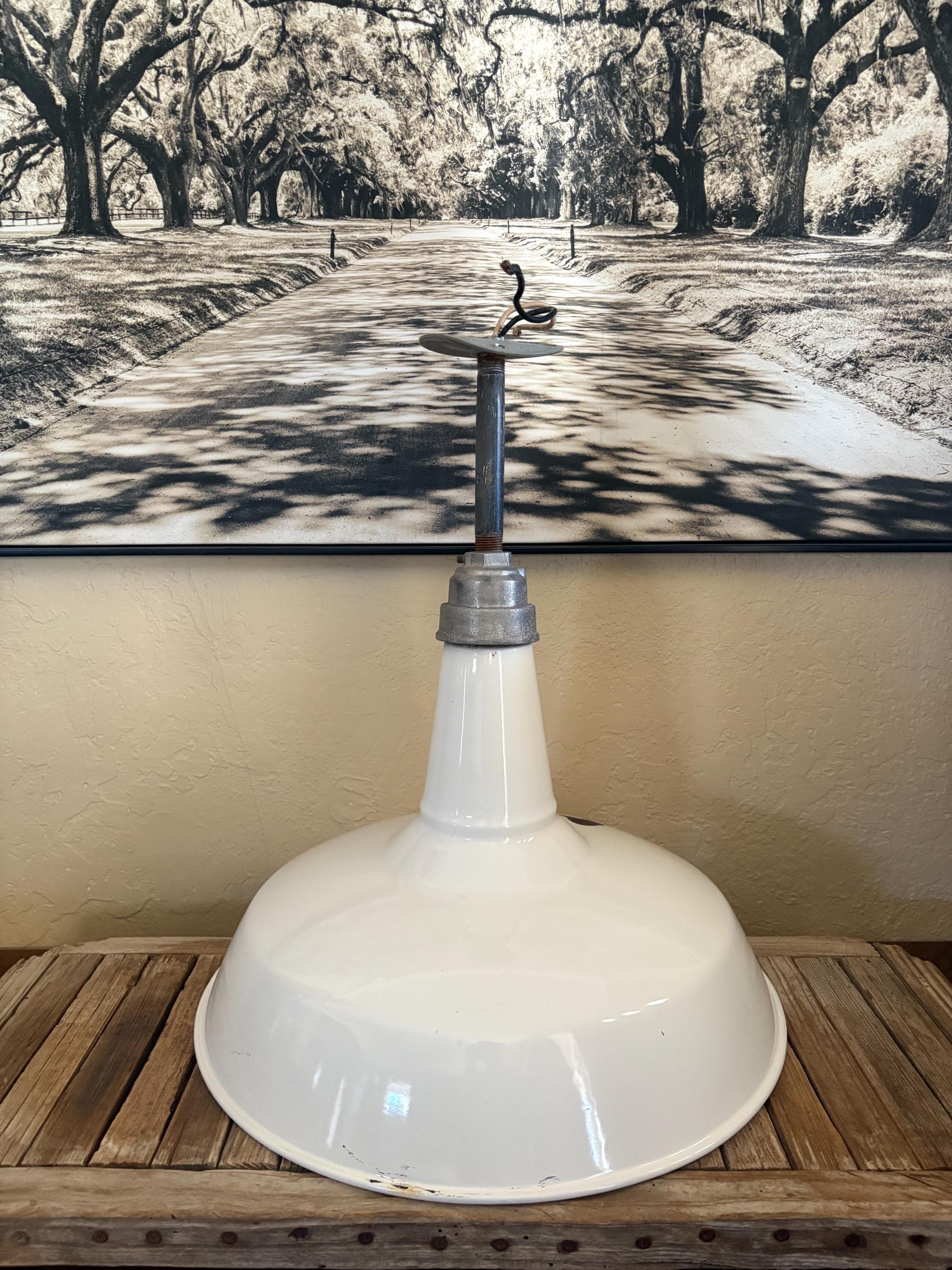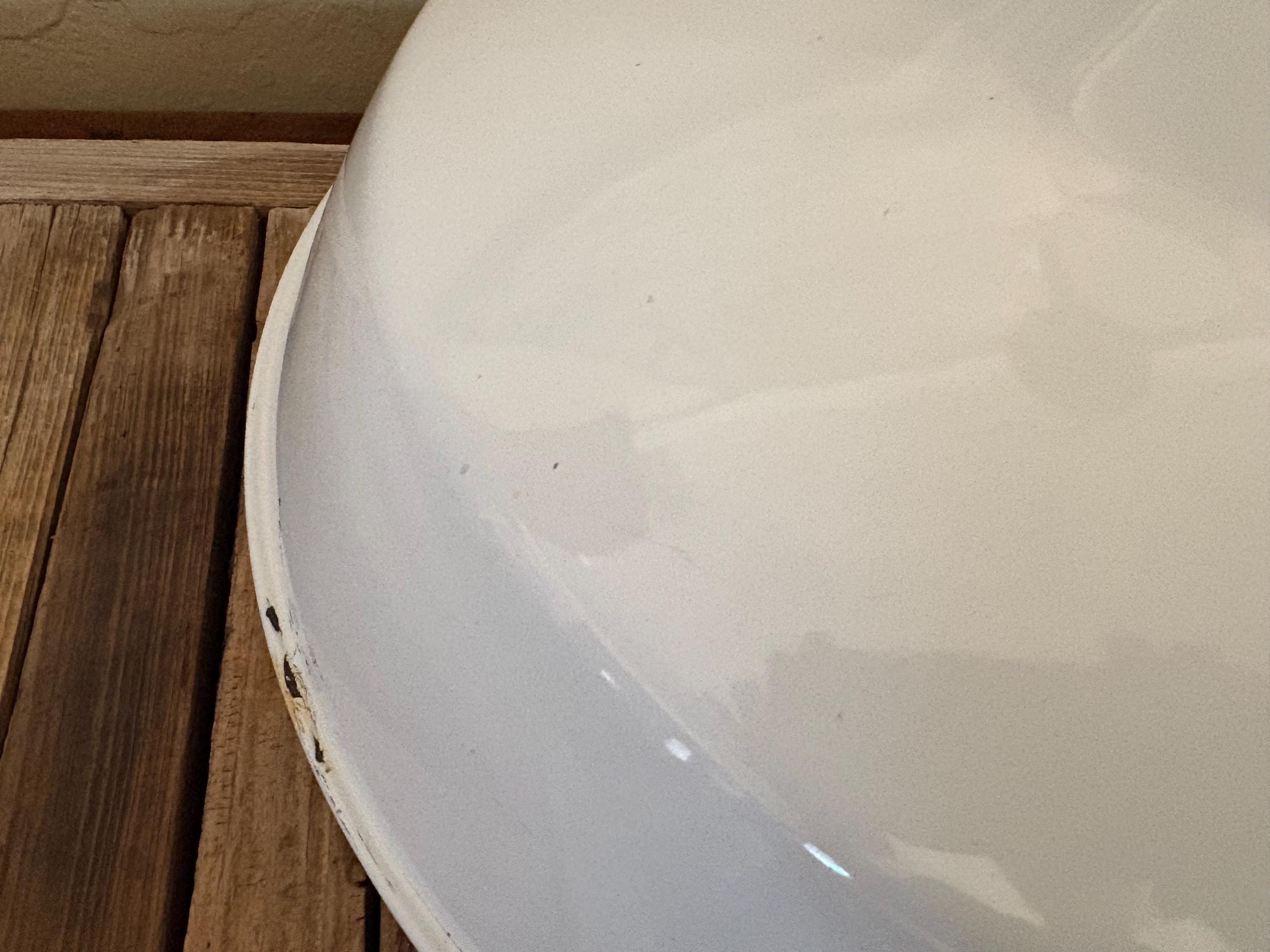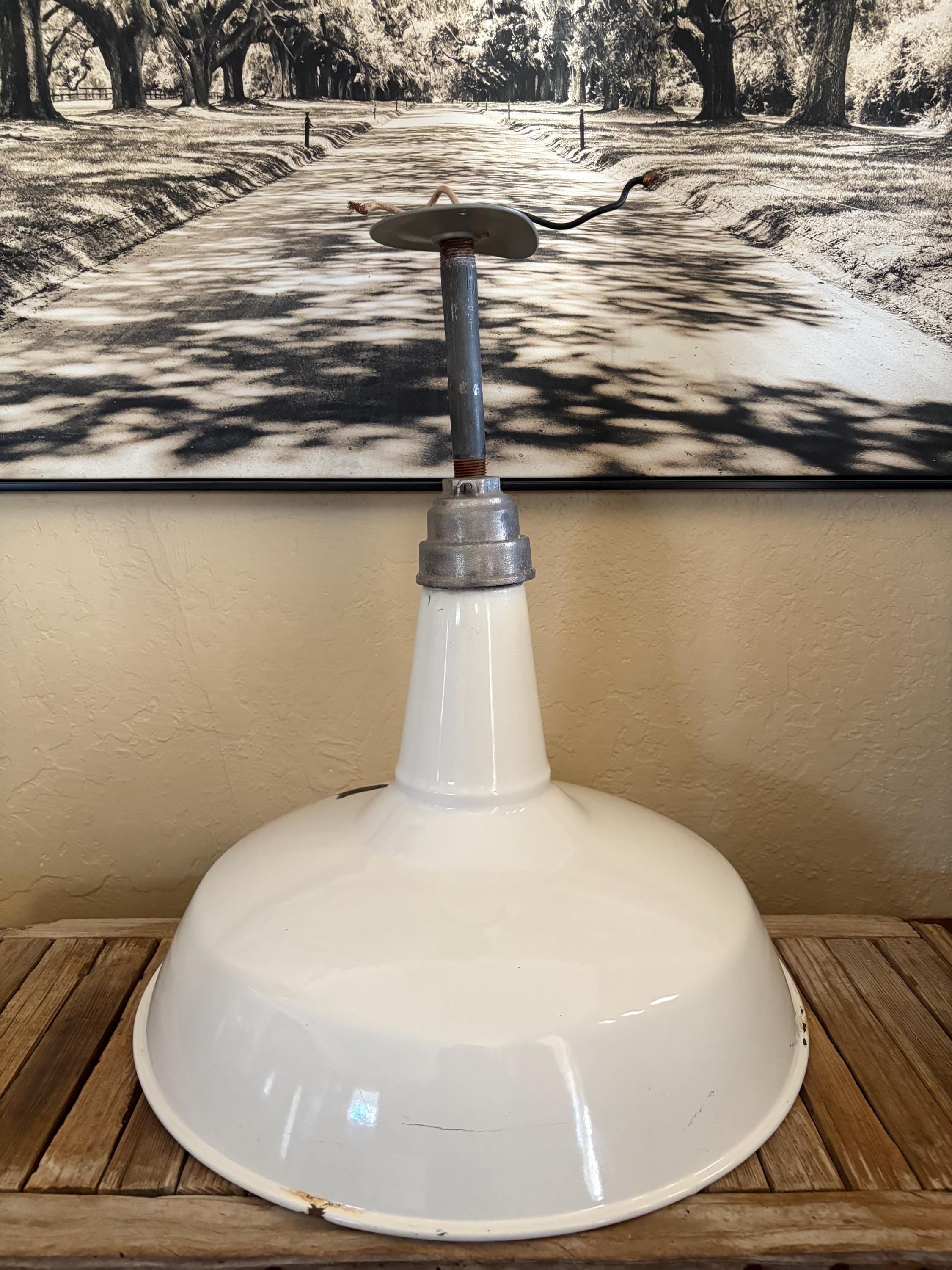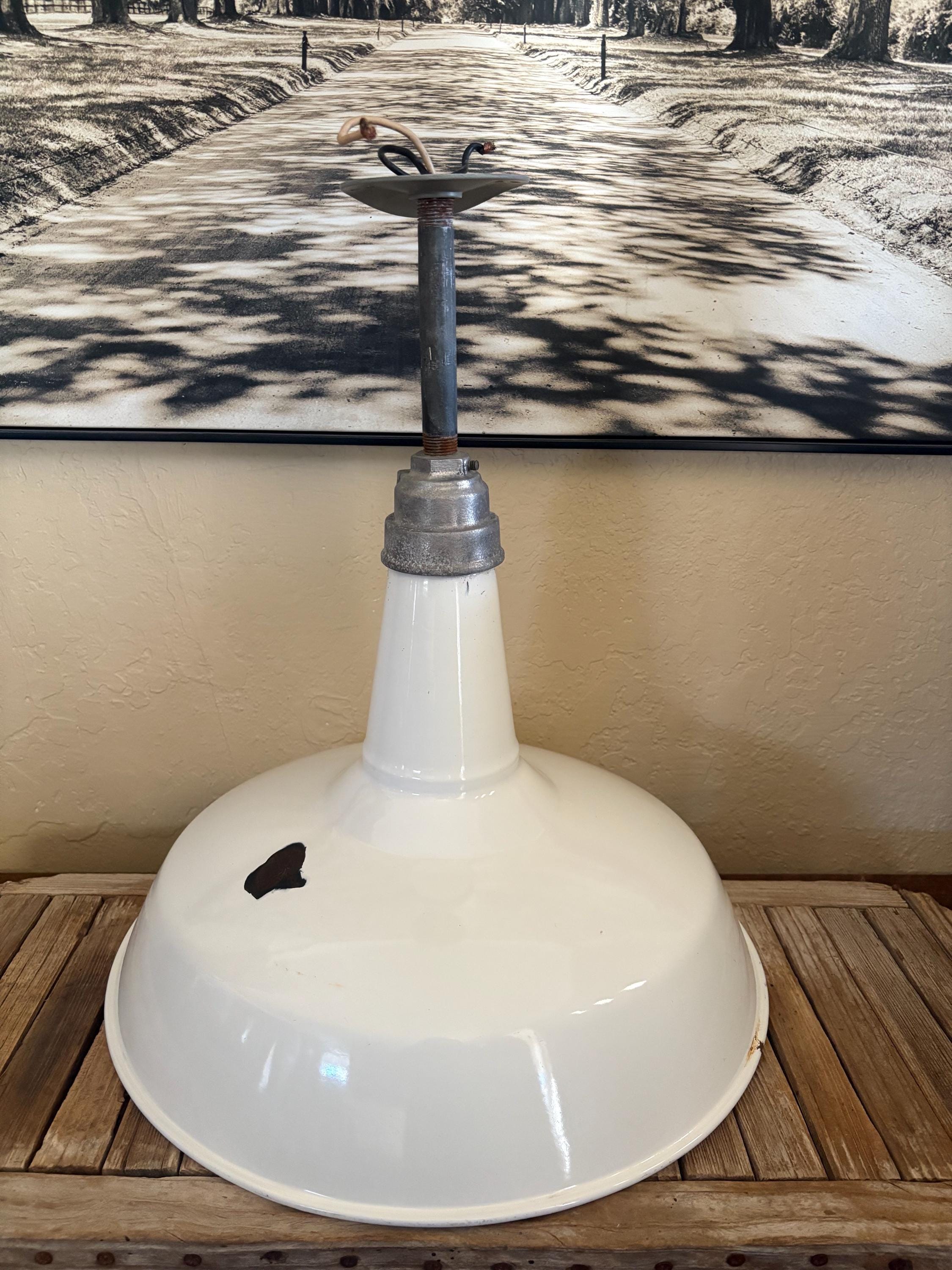 Antique extra large white enamel on metal barn light. In good condition, normal wear due to age and use. The shade has surface scrapes and markings with chips to the enamel, the mount is bent slightly, please see pictures. A great unique large shade with great shape and design.