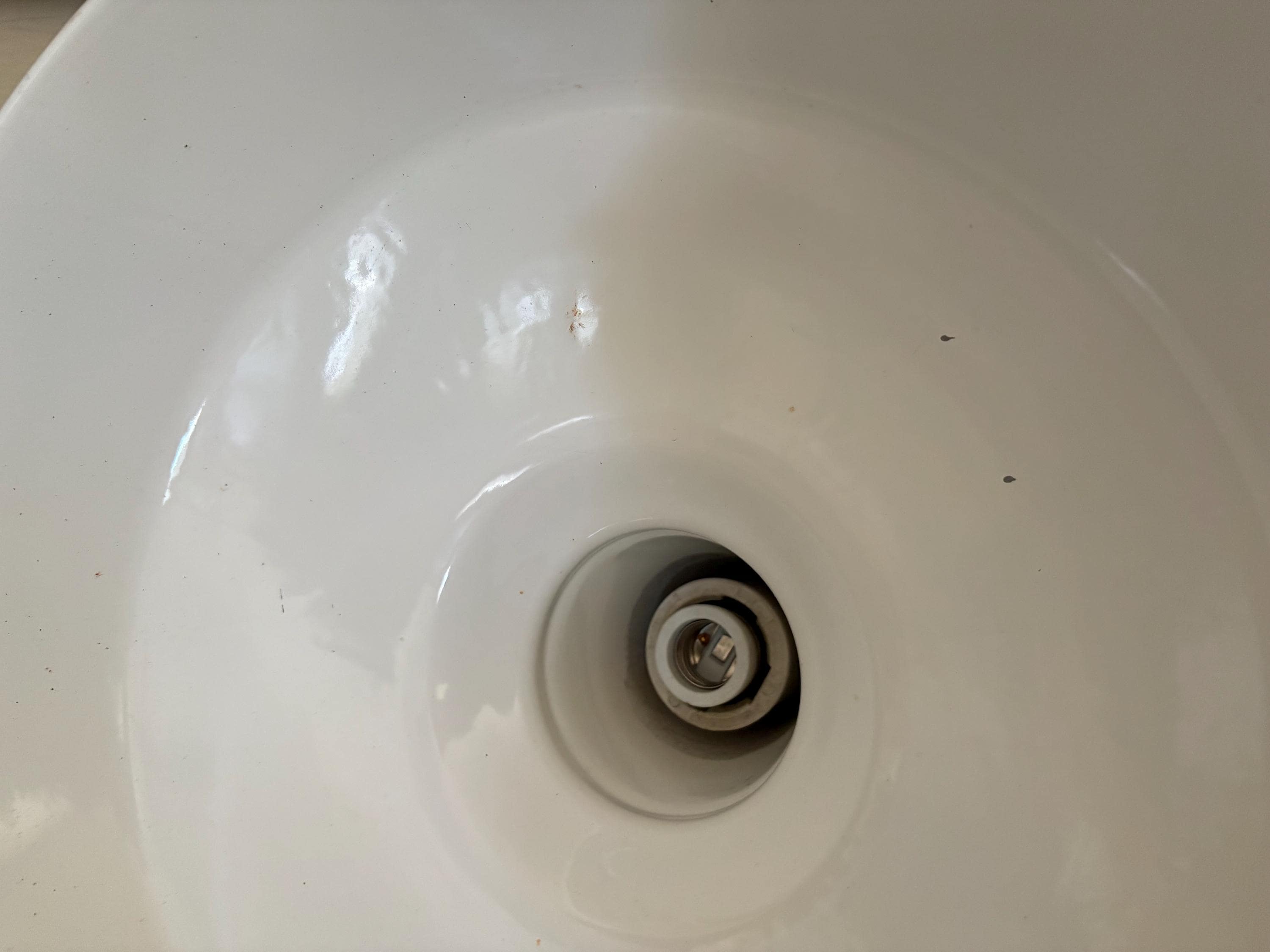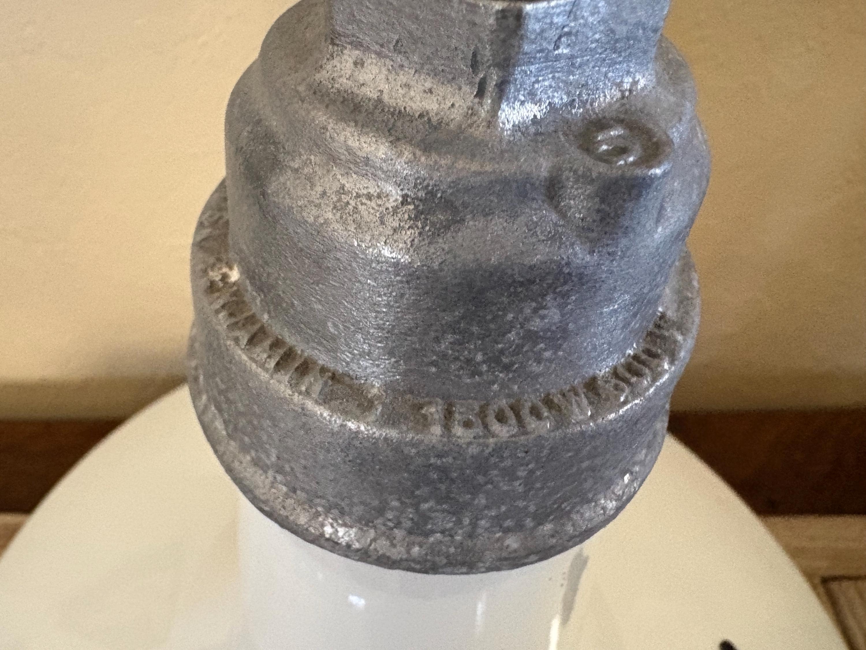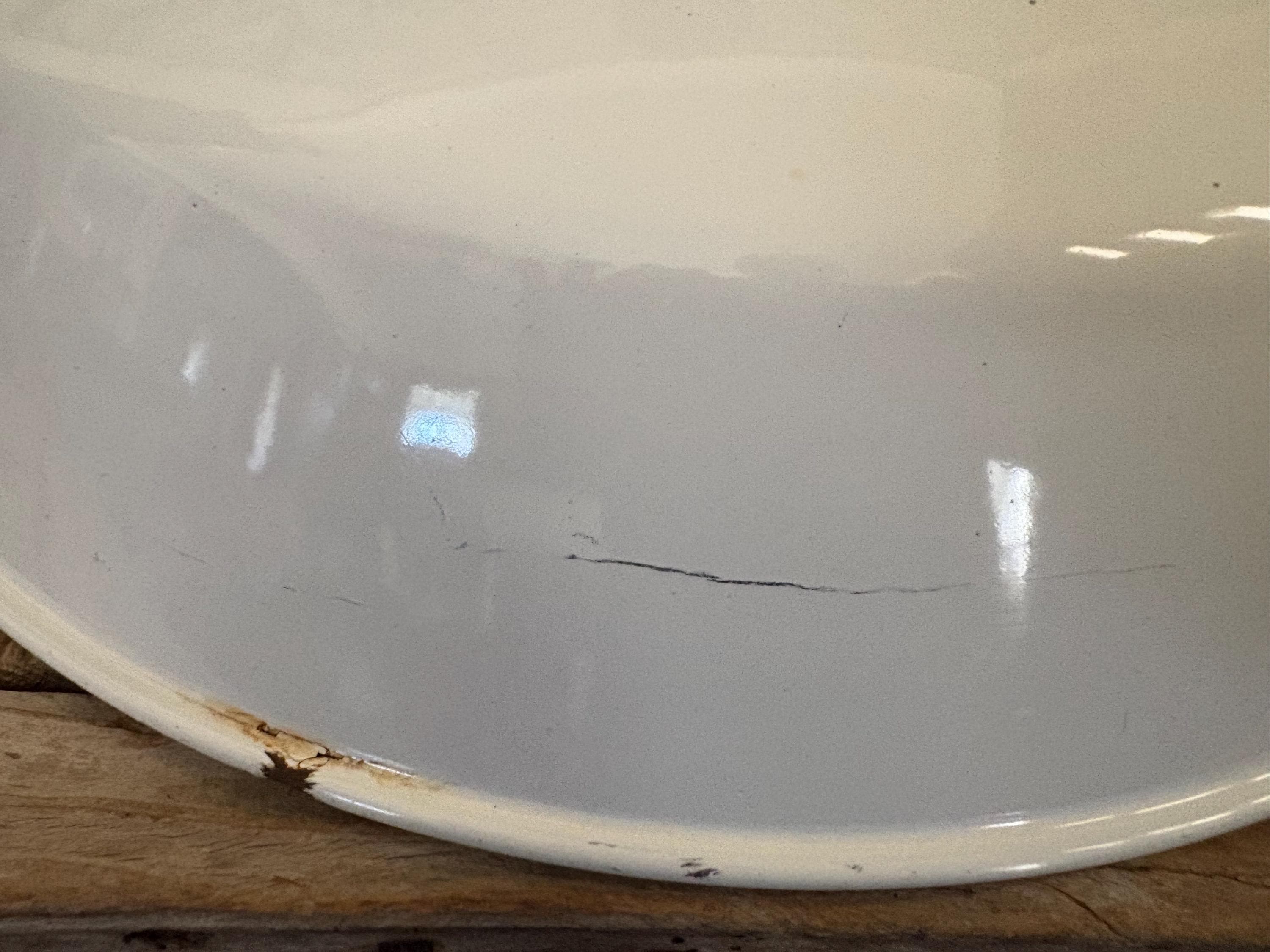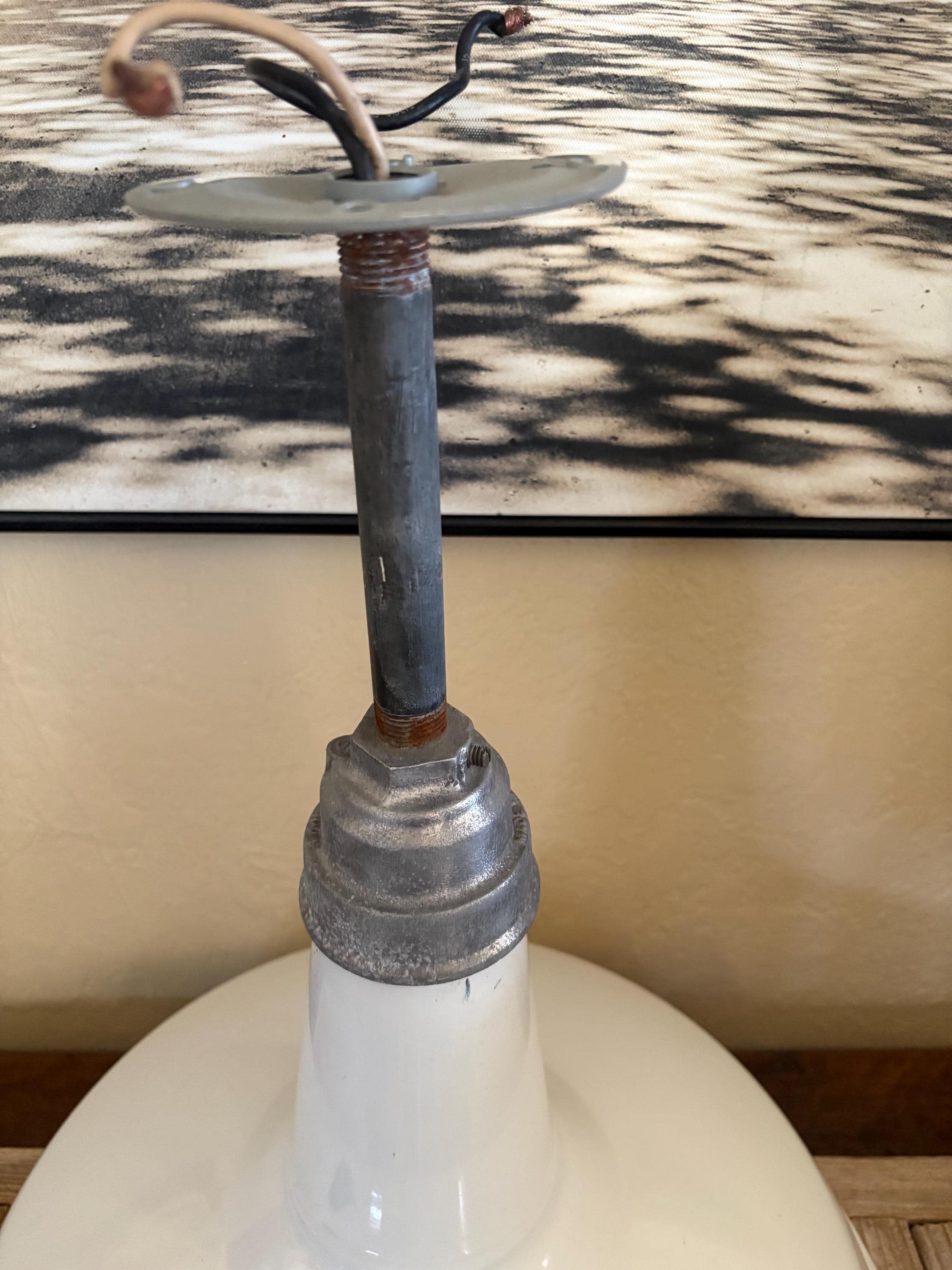 Antique extra large white enamel on metal barn light. In good condition, normal wear due to age and use. The shade has surface scrapes and markings with chips to the enamel, the mount is bent slightly, please see pictures. A great unique large shade with great shape and design.