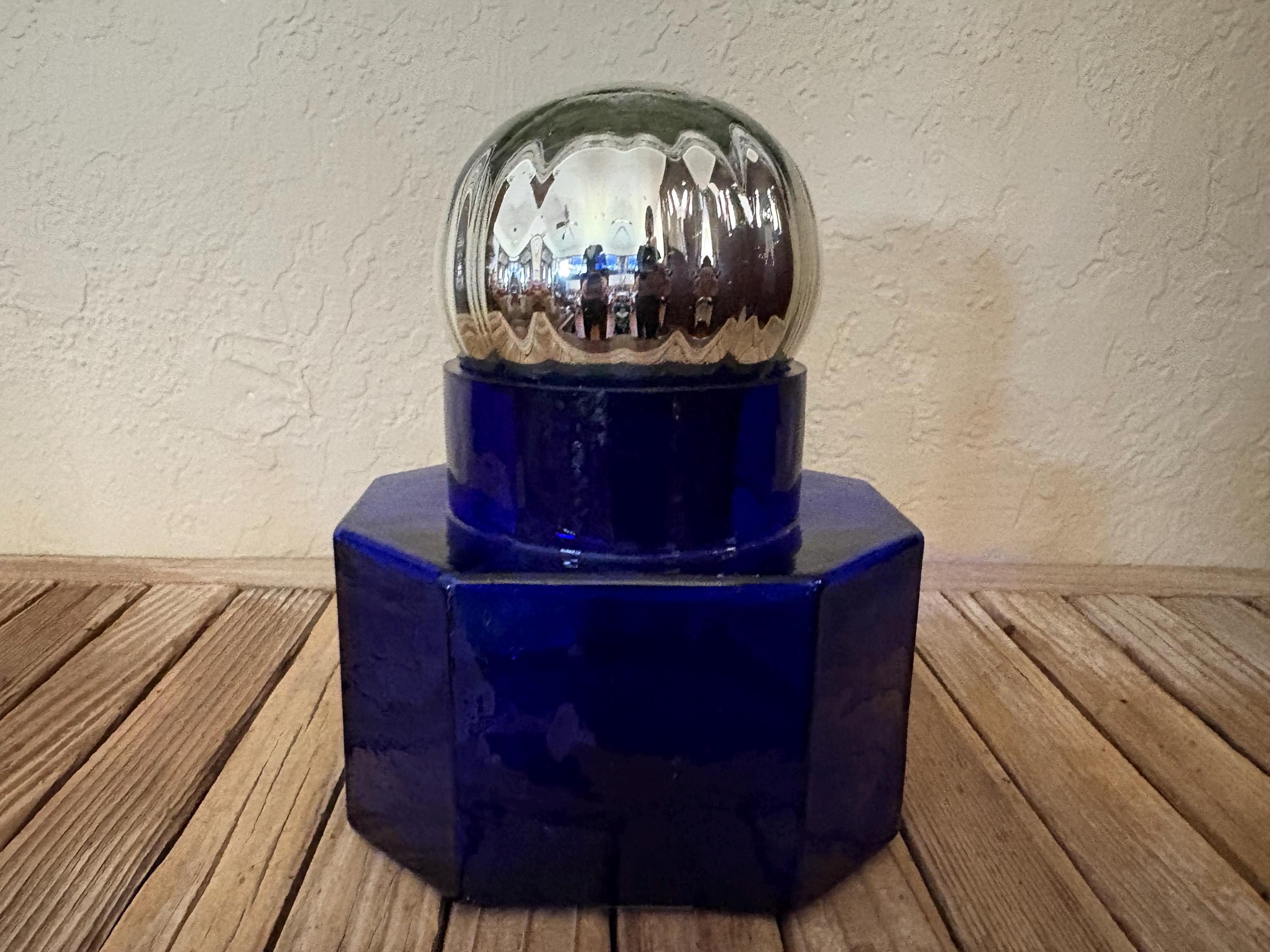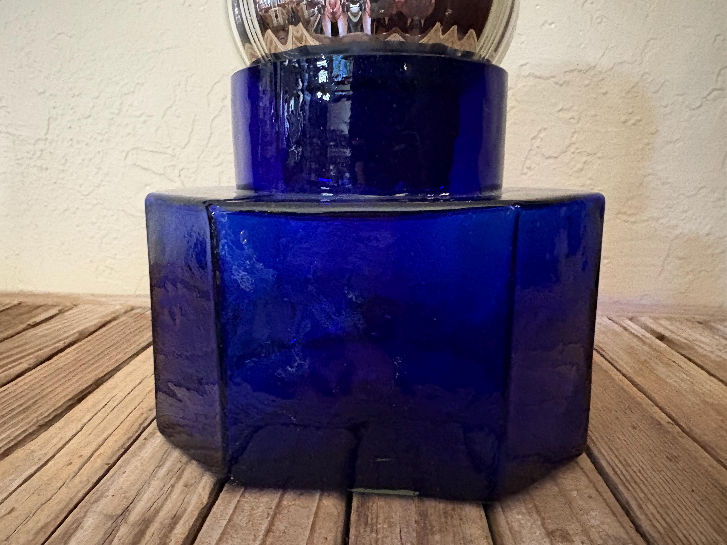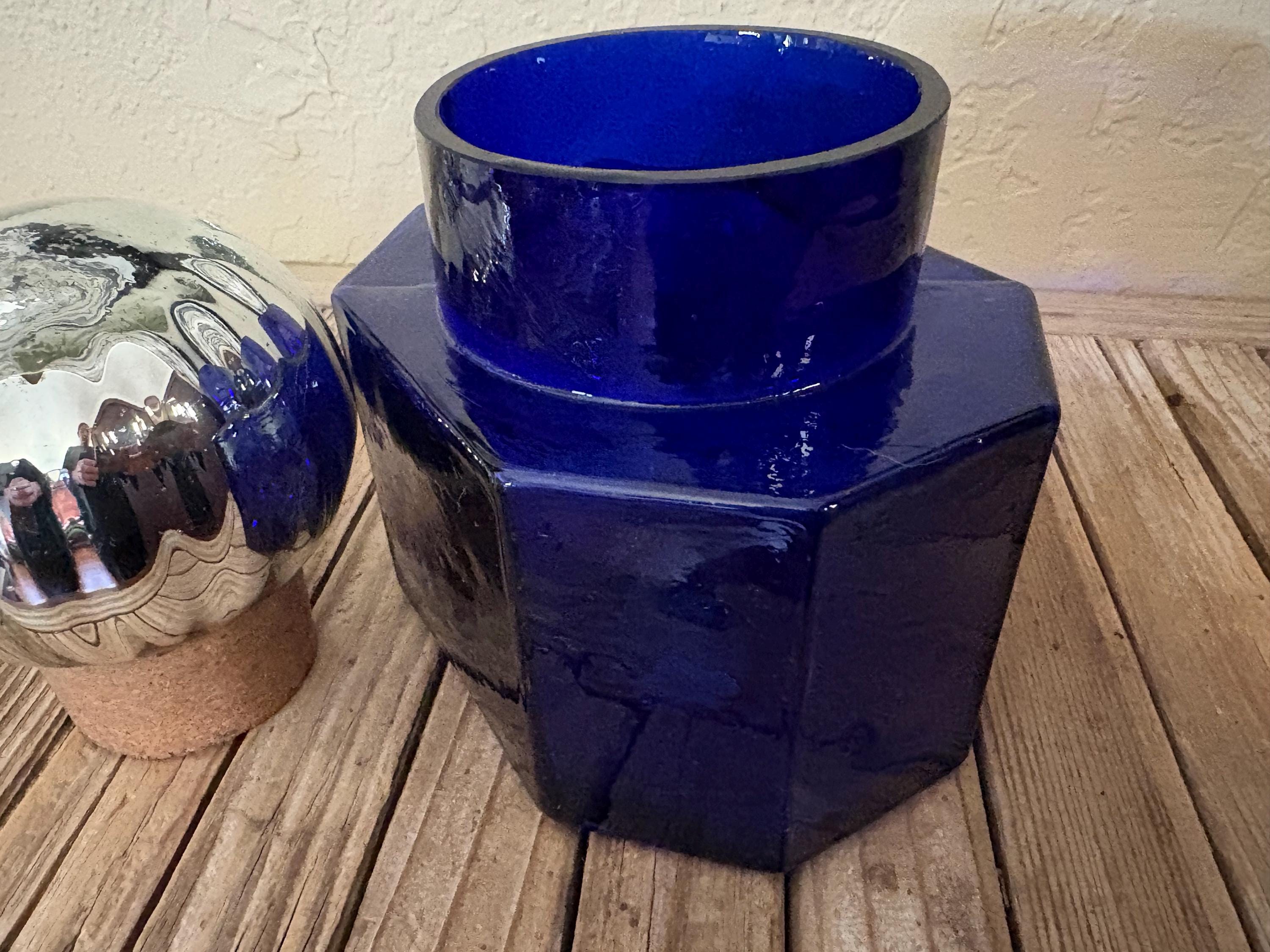 Vintage polygon cobalt blue bottle with mercury glass stopper. In great condition, normal wear due to age and use. Some slight discoloration on the inside of the bottle, as well as surface scrapes and markings, with no chips or cracks, please see pictures. A cool, unique bottle with great detail to add to your home or collection.