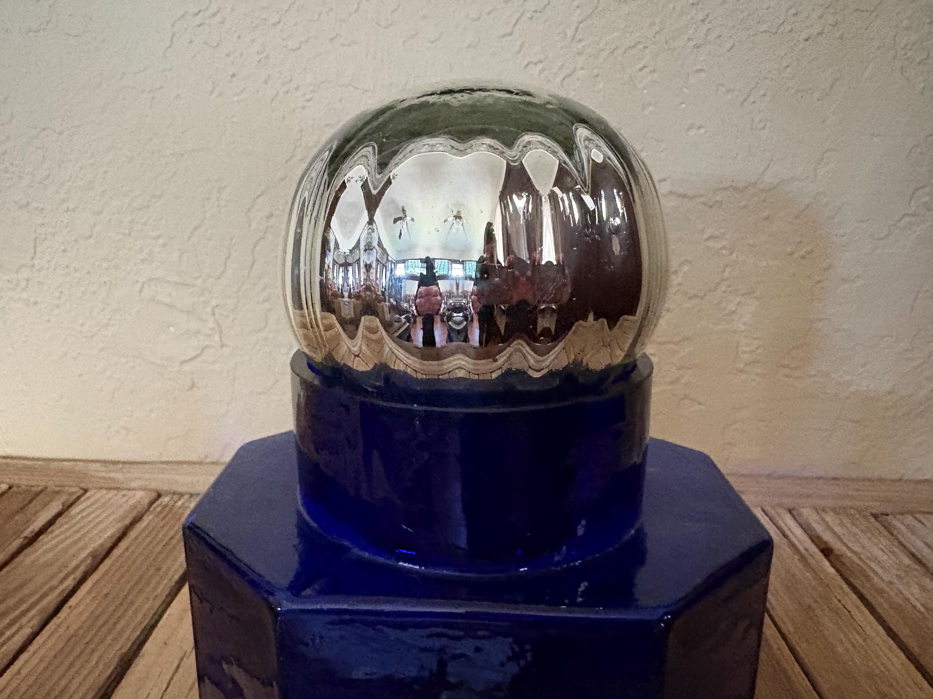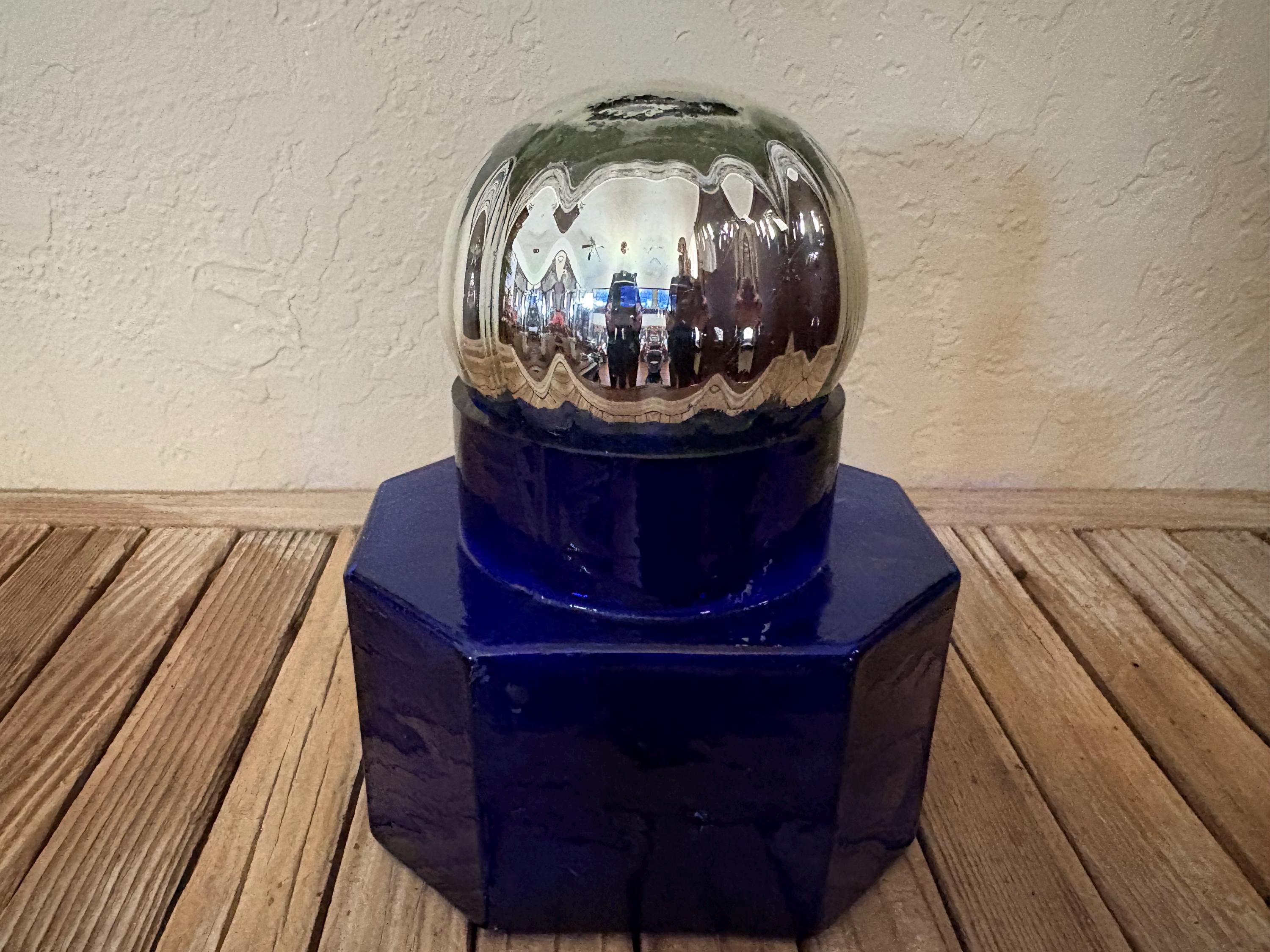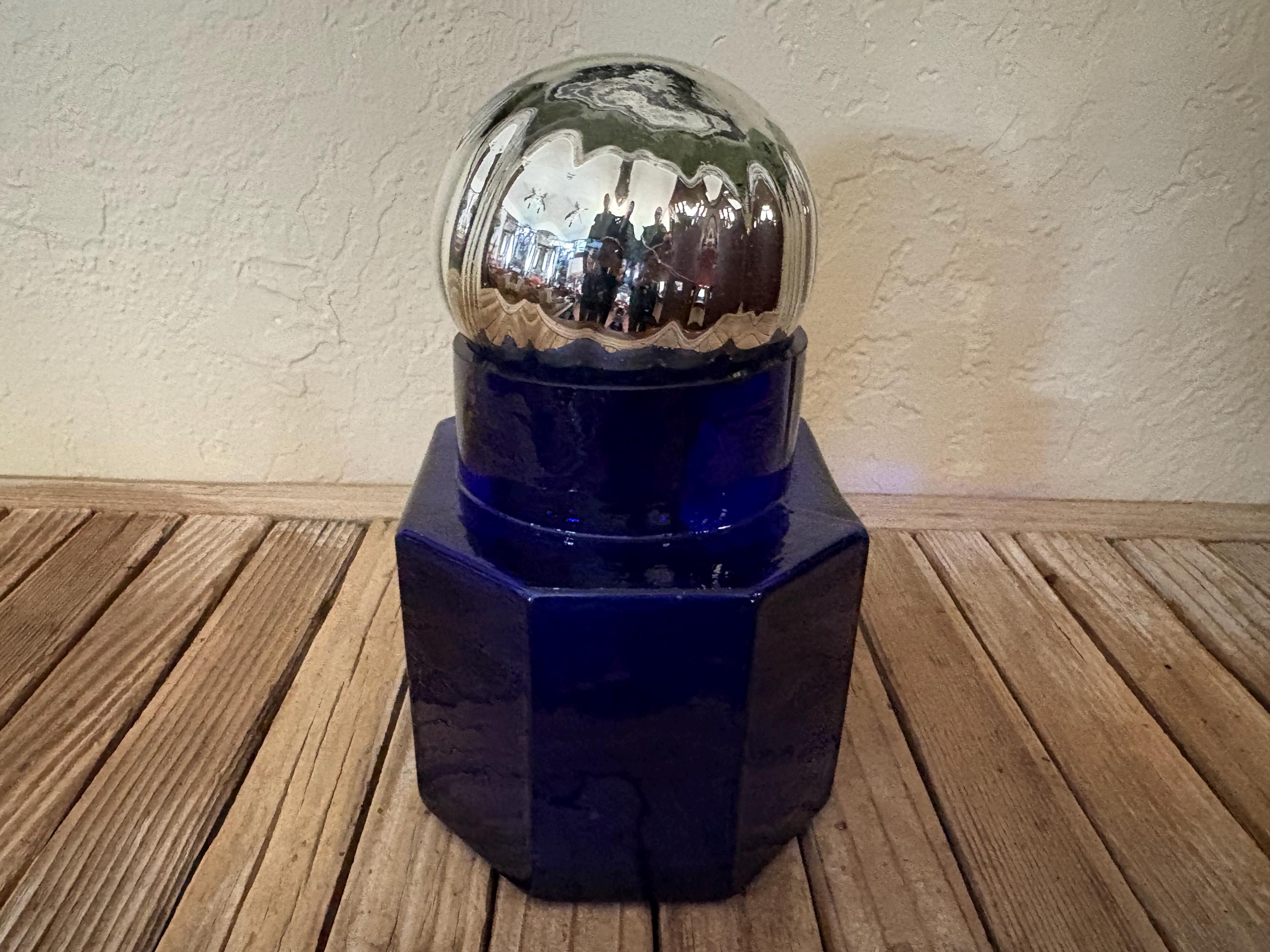 Vintage polygon cobalt blue bottle with mercury glass stopper. In great condition, normal wear due to age and use. Some slight discoloration on the inside of the bottle, as well as surface scrapes and markings, with no chips or cracks, please see pictures. A cool, unique bottle with great detail to add to your home or collection.