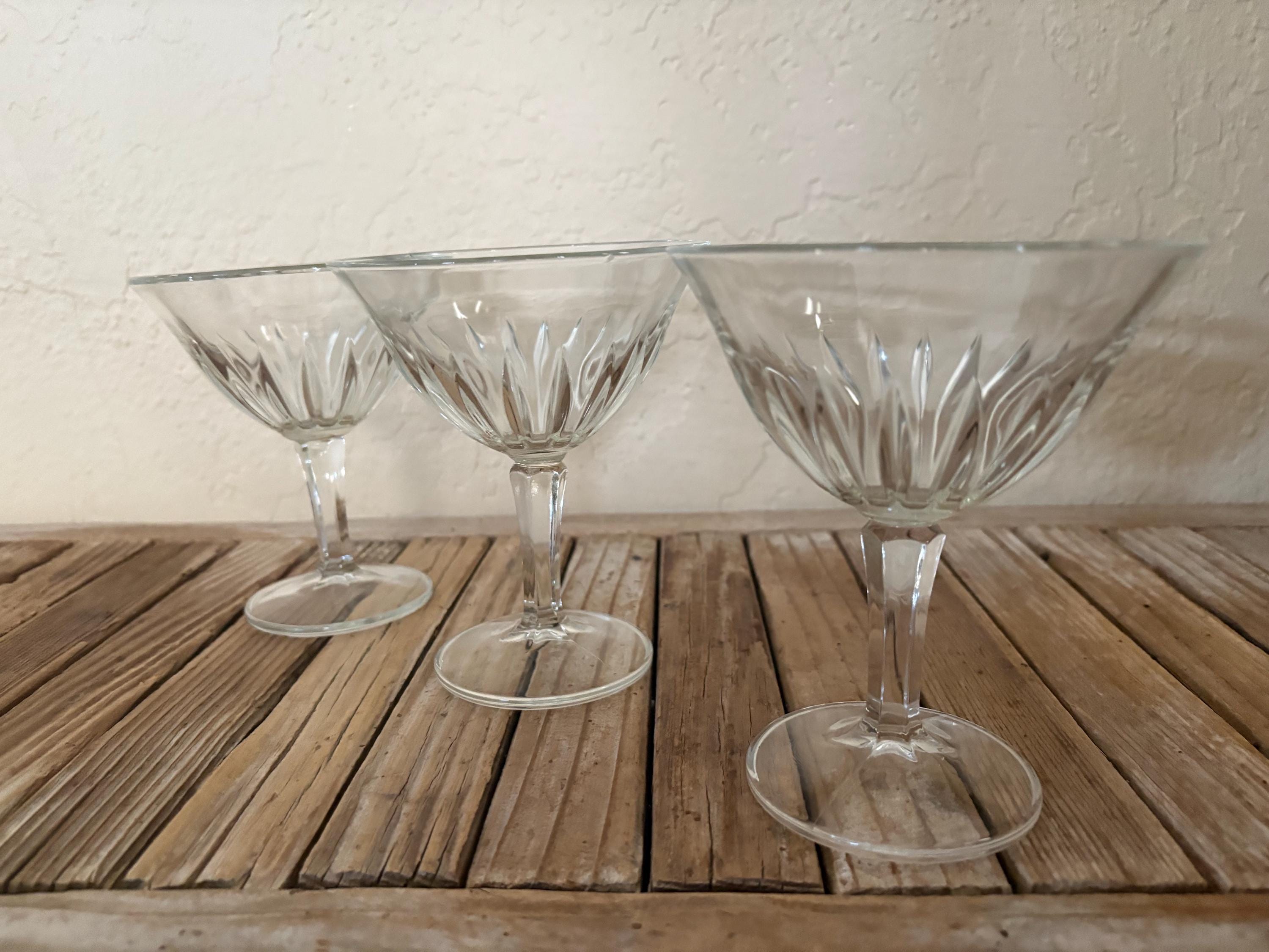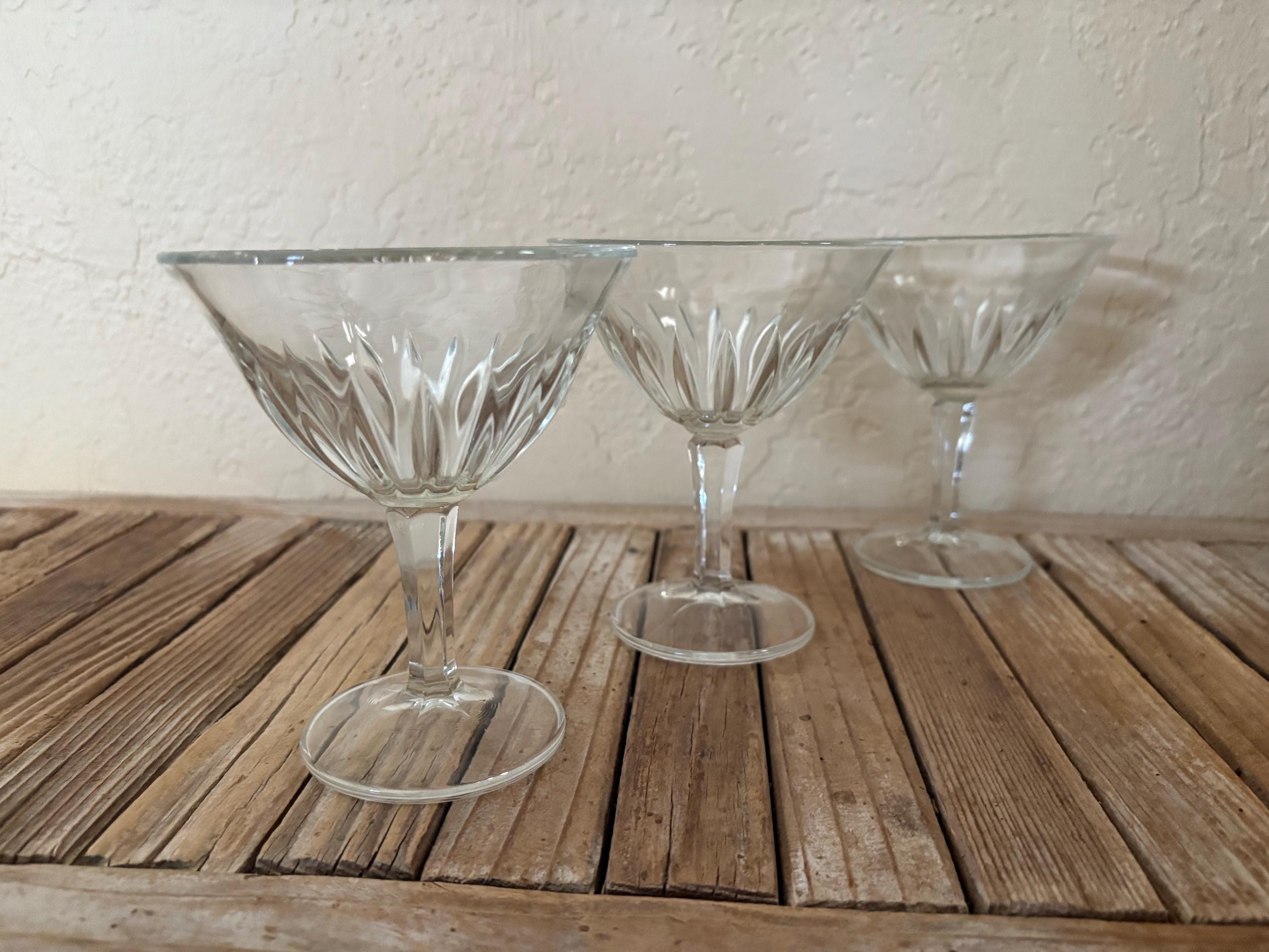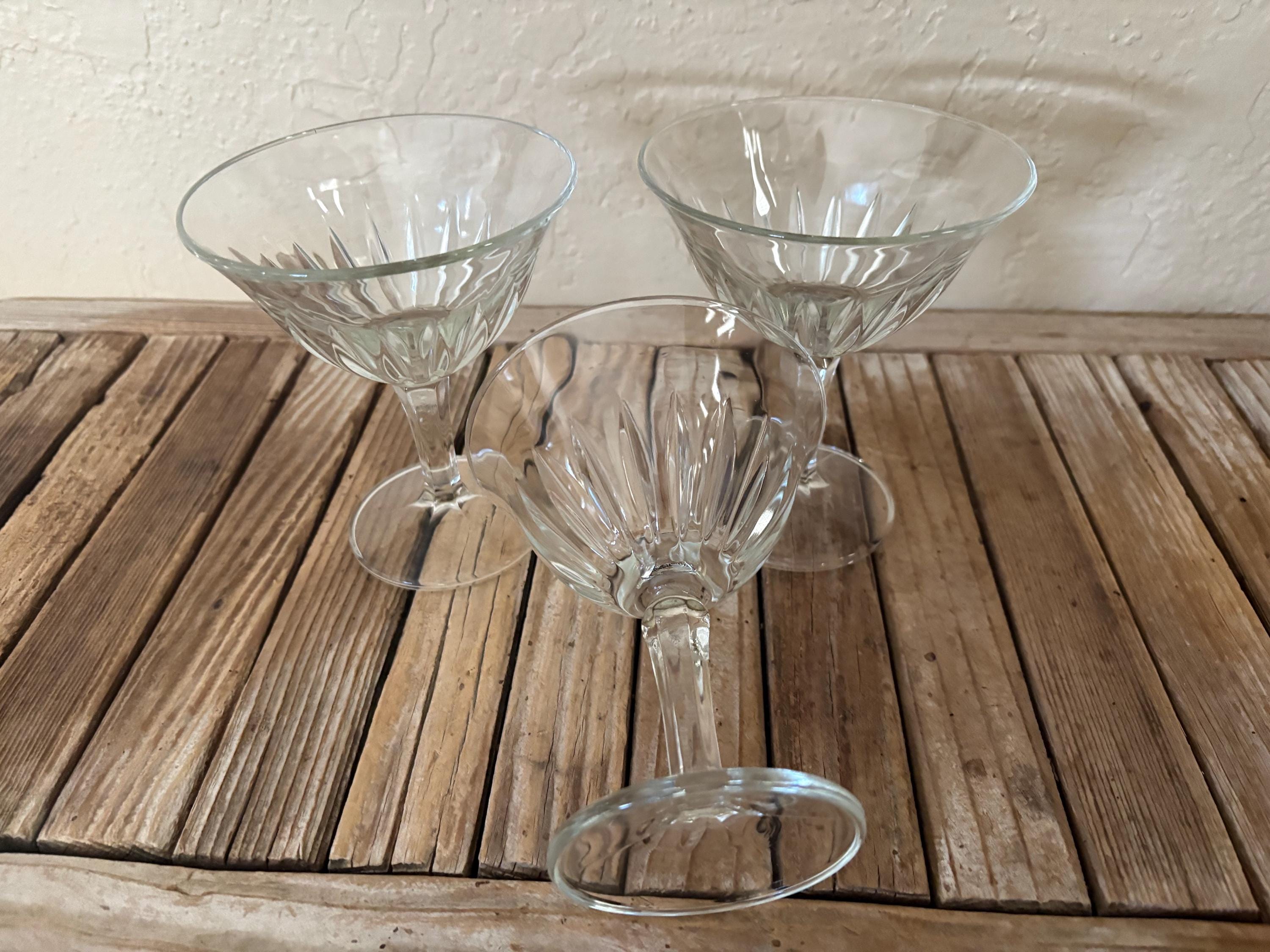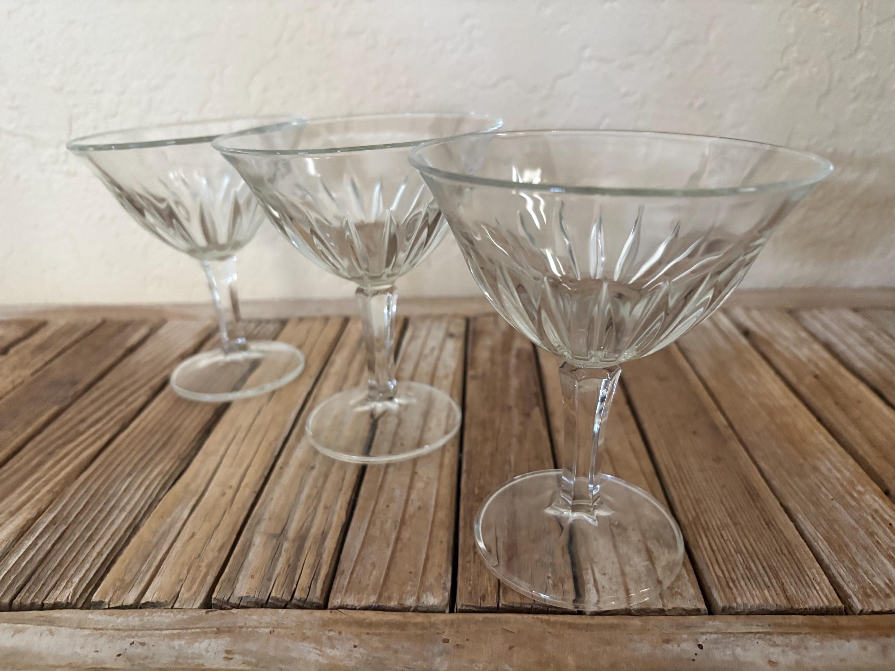 Vintage Italian set of 3 cut glass champagne coupes. In great condition, normal wear due to age and use. The glasses have surface scrapes and markings to the finish, and no chips or cracks, please see pictures. A beautiful set to use for an upcoming party or bar.