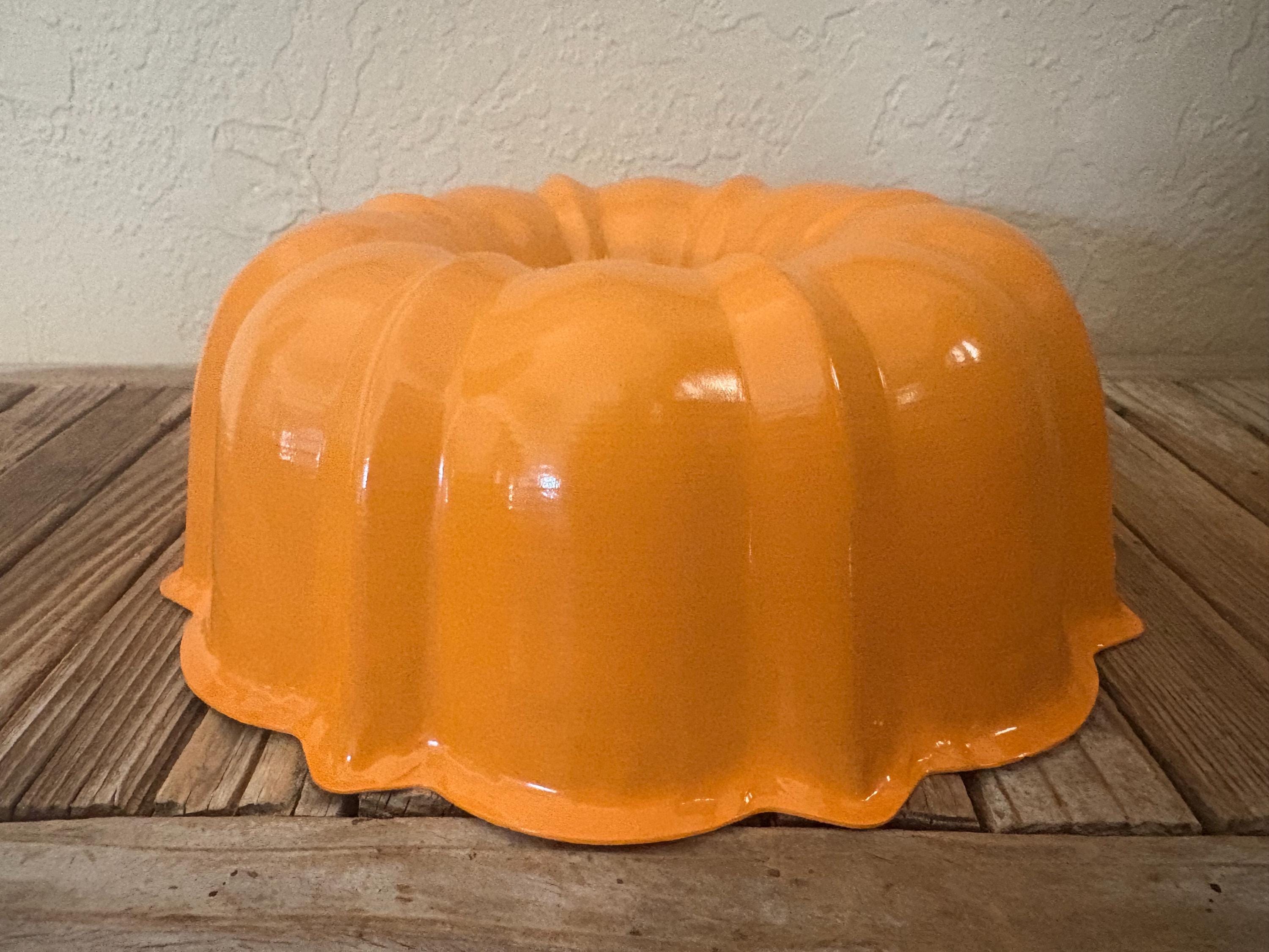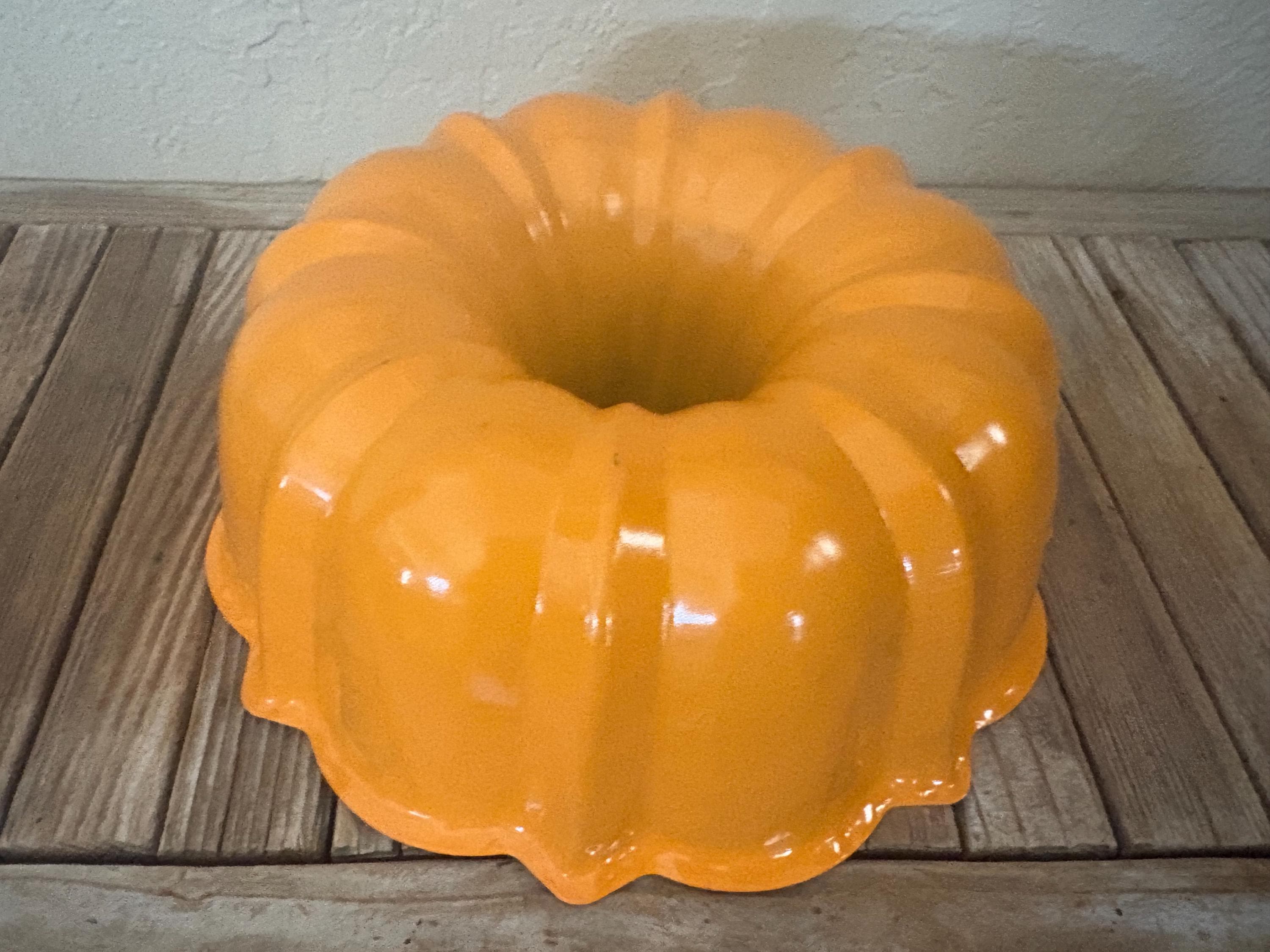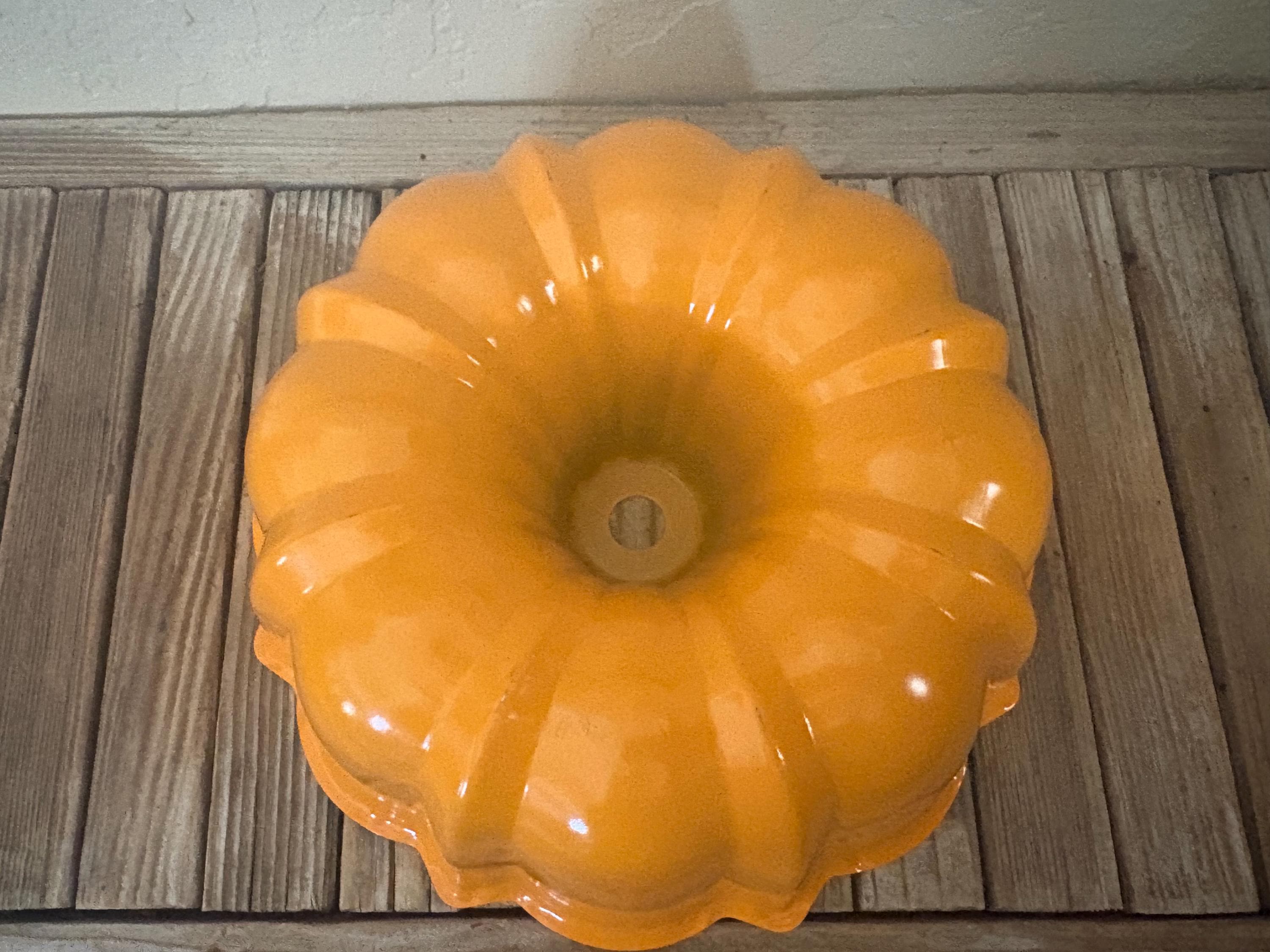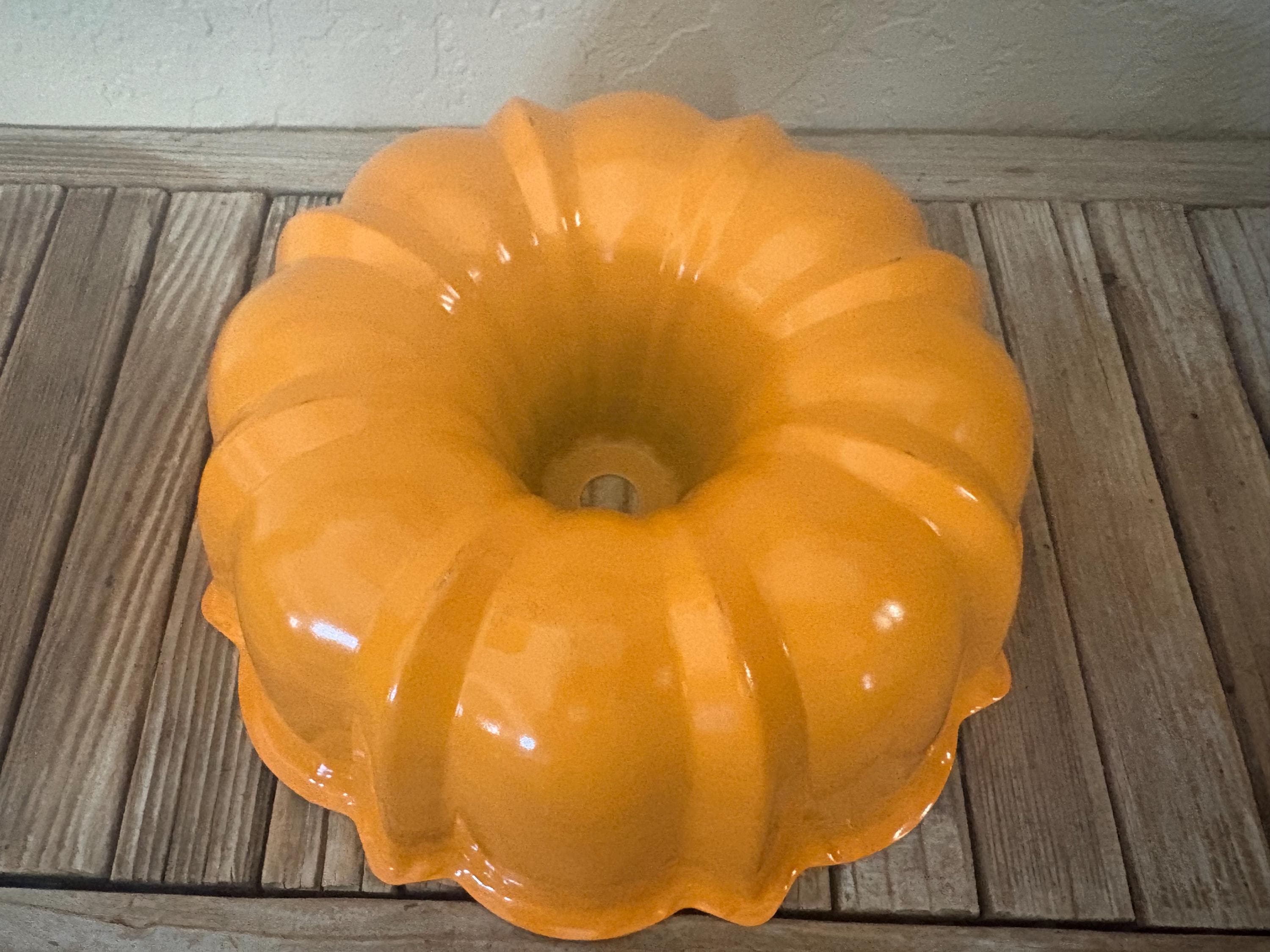 Vintage orange Nordic Ware Bundt pan. In great condition, normal wear due to age and use. The pan does have misc. scrapes to it, please see pictures. A great piece to add to a kitchen or to use to bake with. It could also be used as a unique light fixture.